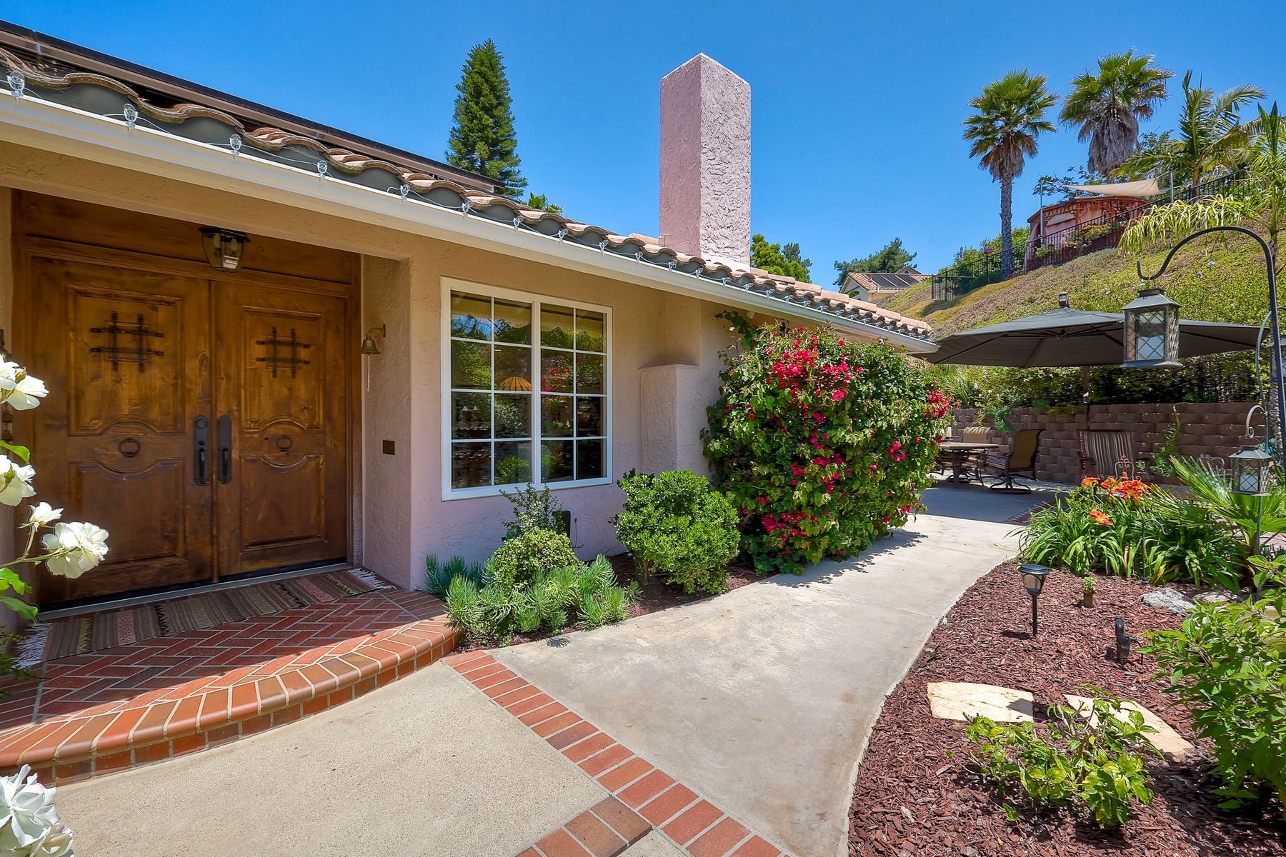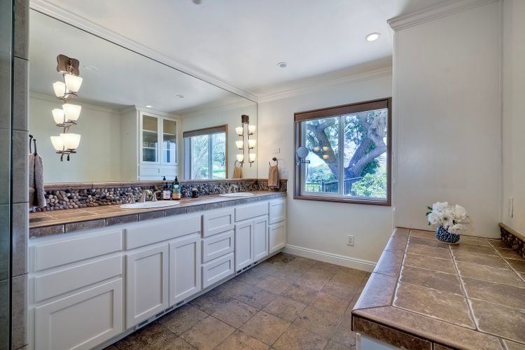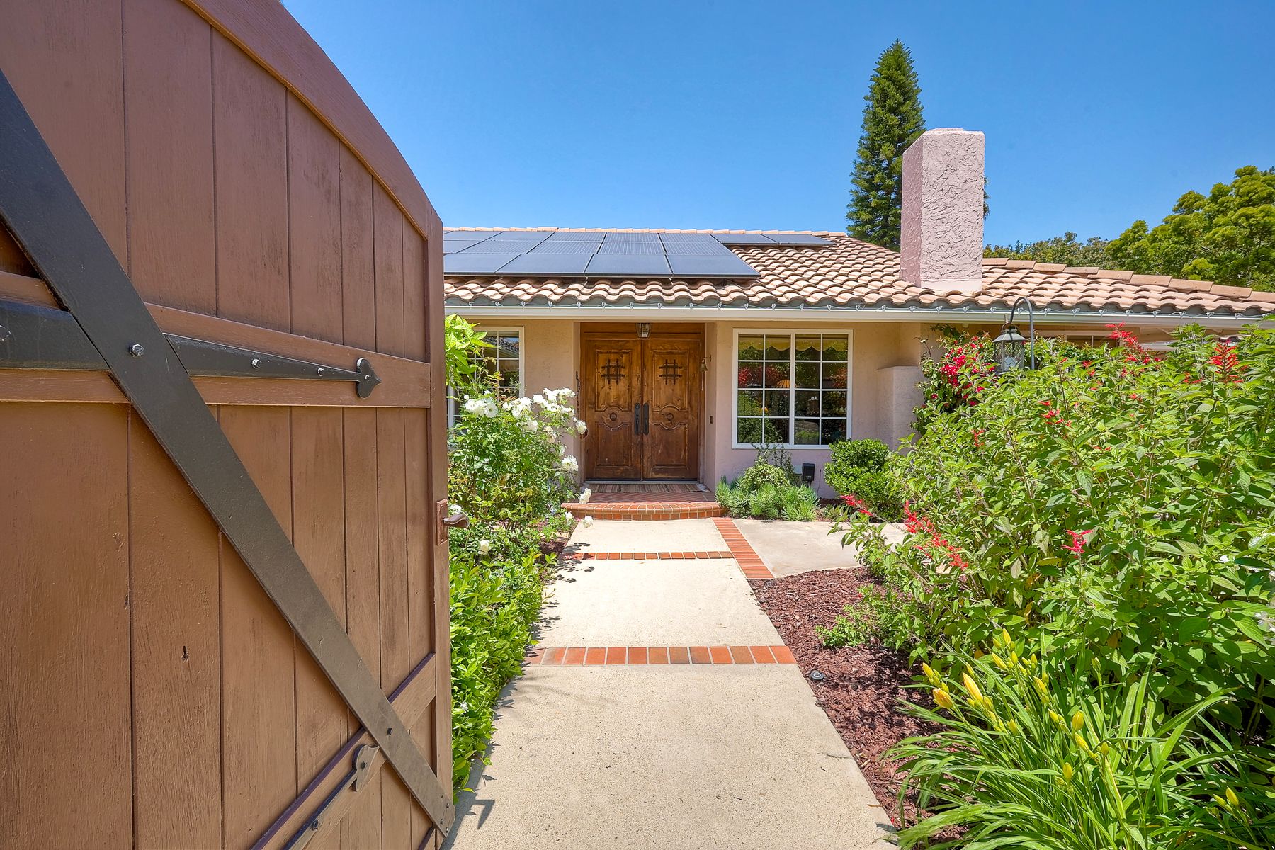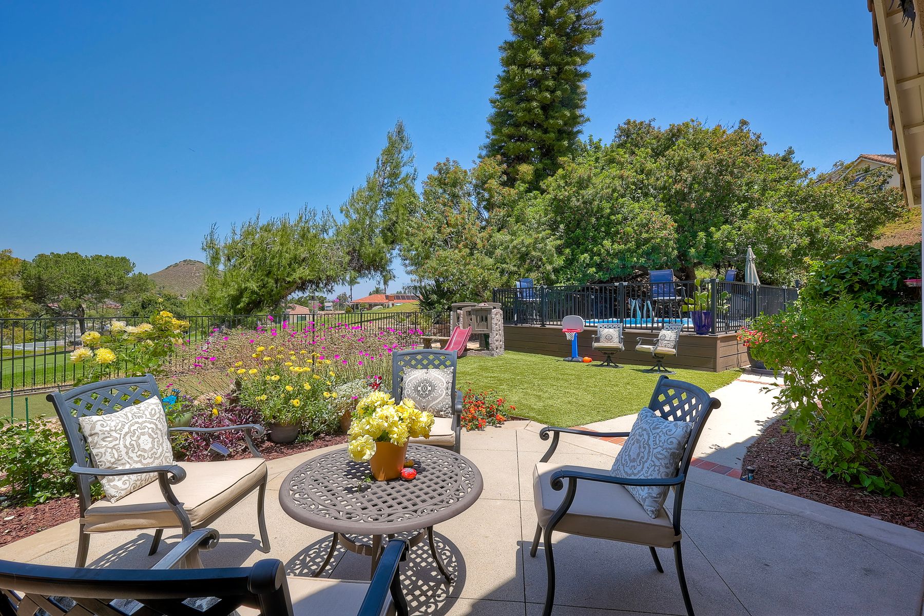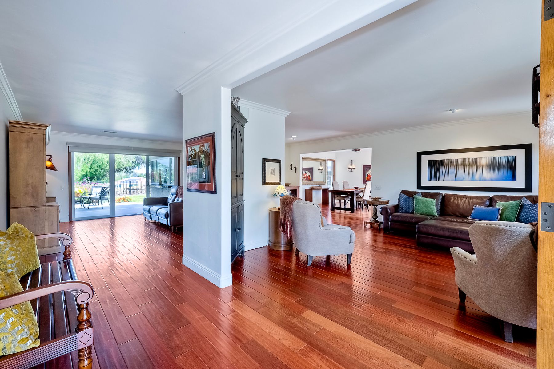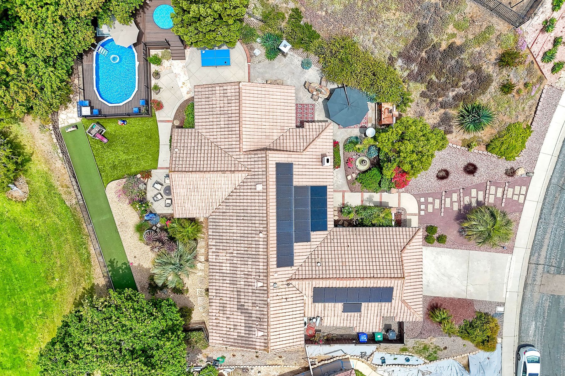 This spectacular 15th Fairway home sits on an elevated .41-acre lot with awesome views! Gorgeous 4-bedroom home w/Brazilian wood flooring throughout. Enter through knotty alder wood double doors, into open living room, dining room and family room. The kitchen overlooks the lush landscaping & golf course views. The front patio has a wood burning or gas logs fireplace, water fountain, custom kitchen BBQ area plus 2 additional patios including a saltwater pool with custom built Timber Tech Composite decking & separate spa! Newly painted throughout the interior, knotty alder wood interior doors, old world texturing on ceilings and walls & separate laundry room. The primary bedroom enjoys a customized oversized shower & large, picturesque view window overlooking the course & distant mountains. Seller owned solar system. Mature drought resistant landscaping and Electrostatic whole house air cleaner. Located in the Highly Rated Poway Unified School District. No Monthly HOA & No Mello Roos.