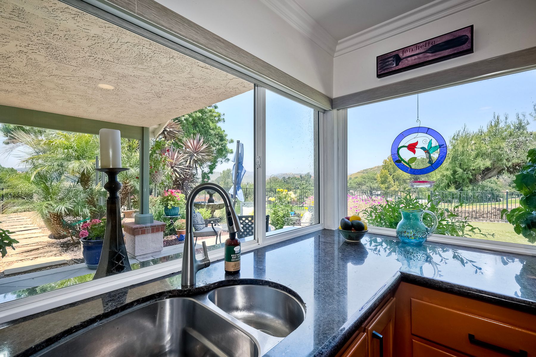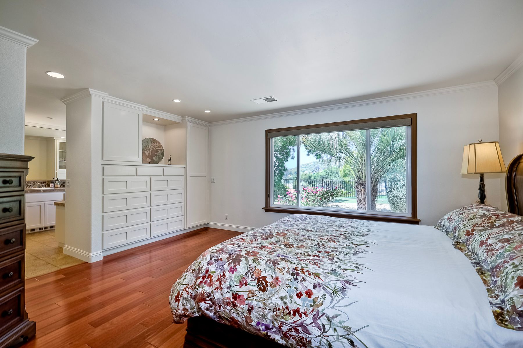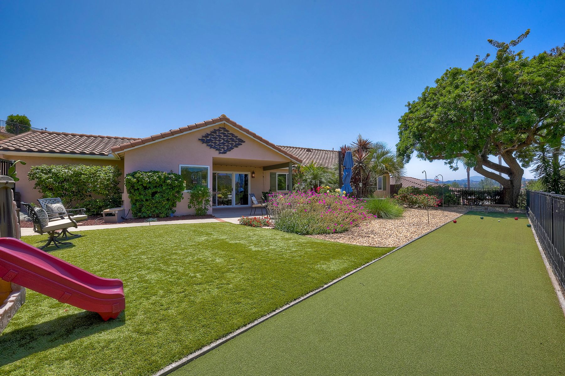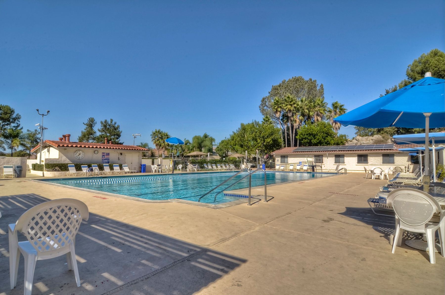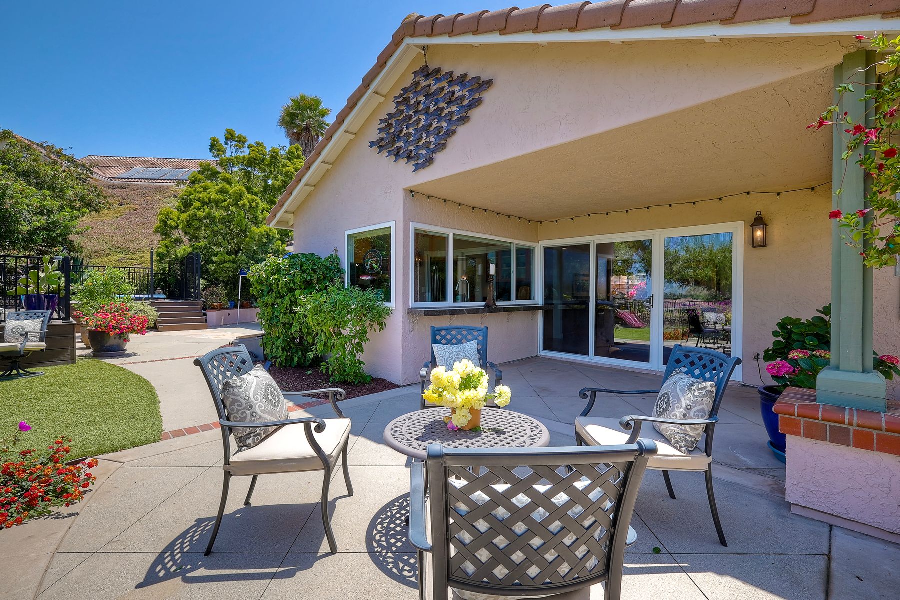 This spectacular 15th Fairway home sits on an elevated .41-acre lot with awesome views! Gorgeous 4-bedroom home w/Brazilian wood flooring throughout. Enter through knotty alder wood double doors, into open living room, dining room and family room. The kitchen overlooks the lush landscaping & golf course views. The front patio has a wood burning or gas logs fireplace, water fountain, custom kitchen BBQ area plus 2 additional patios including a saltwater pool with custom built Timber Tech Composite decking & separate spa! Newly painted throughout the interior, knotty alder wood interior doors, old world texturing on ceilings and walls & separate laundry room. The primary bedroom enjoys a customized oversized shower & large, picturesque view window overlooking the course & distant mountains. Seller owned solar system. Mature drought resistant landscaping and Electrostatic whole house air cleaner. Located in the Highly Rated Poway Unified School District. No Monthly HOA & No Mello Roos.