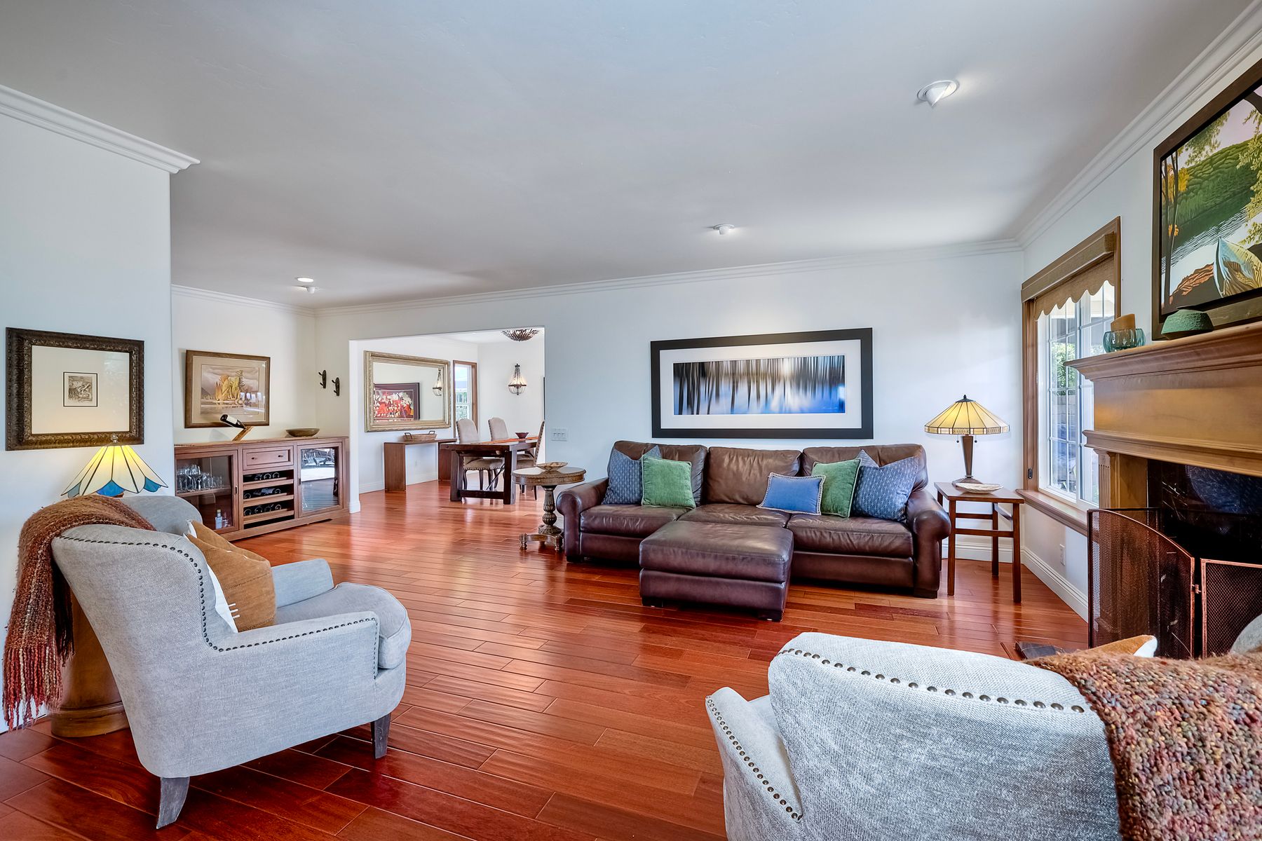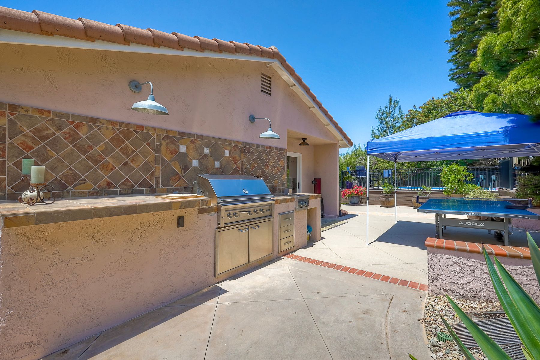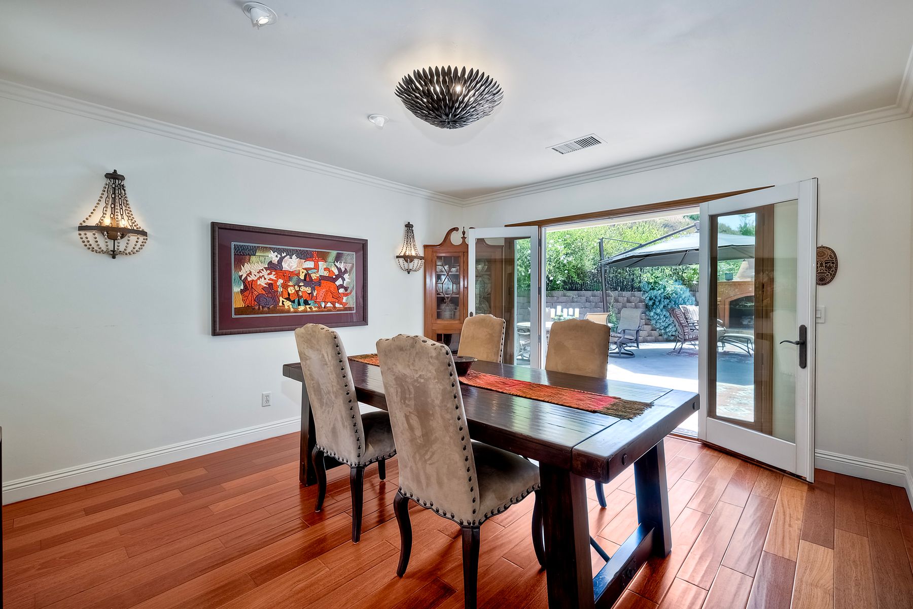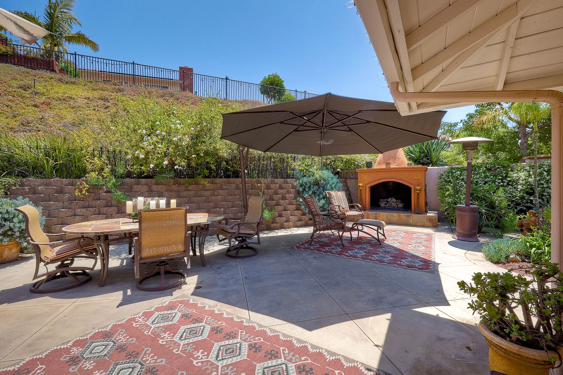 This spectacular 15th Fairway home sits on an elevated .41-acre lot with awesome views! Gorgeous 4-bedroom home w/Brazilian wood flooring throughout. Enter through knotty alder wood double doors, into open living room, dining room and family room. The kitchen overlooks the lush landscaping & golf course views. The front patio has a wood burning or gas logs fireplace, water fountain, custom kitchen BBQ area plus 2 additional patios including a saltwater pool with custom built Timber Tech Composite decking & separate spa! Newly painted throughout the interior, knotty alder wood interior doors, old world texturing on ceilings and walls & separate laundry room. The primary bedroom enjoys a customized oversized shower & large, picturesque view window overlooking the course & distant mountains. Seller owned solar system. Mature drought resistant landscaping and Electrostatic whole house air cleaner. Located in the Highly Rated Poway Unified School District. No Monthly HOA & No Mello Roos.