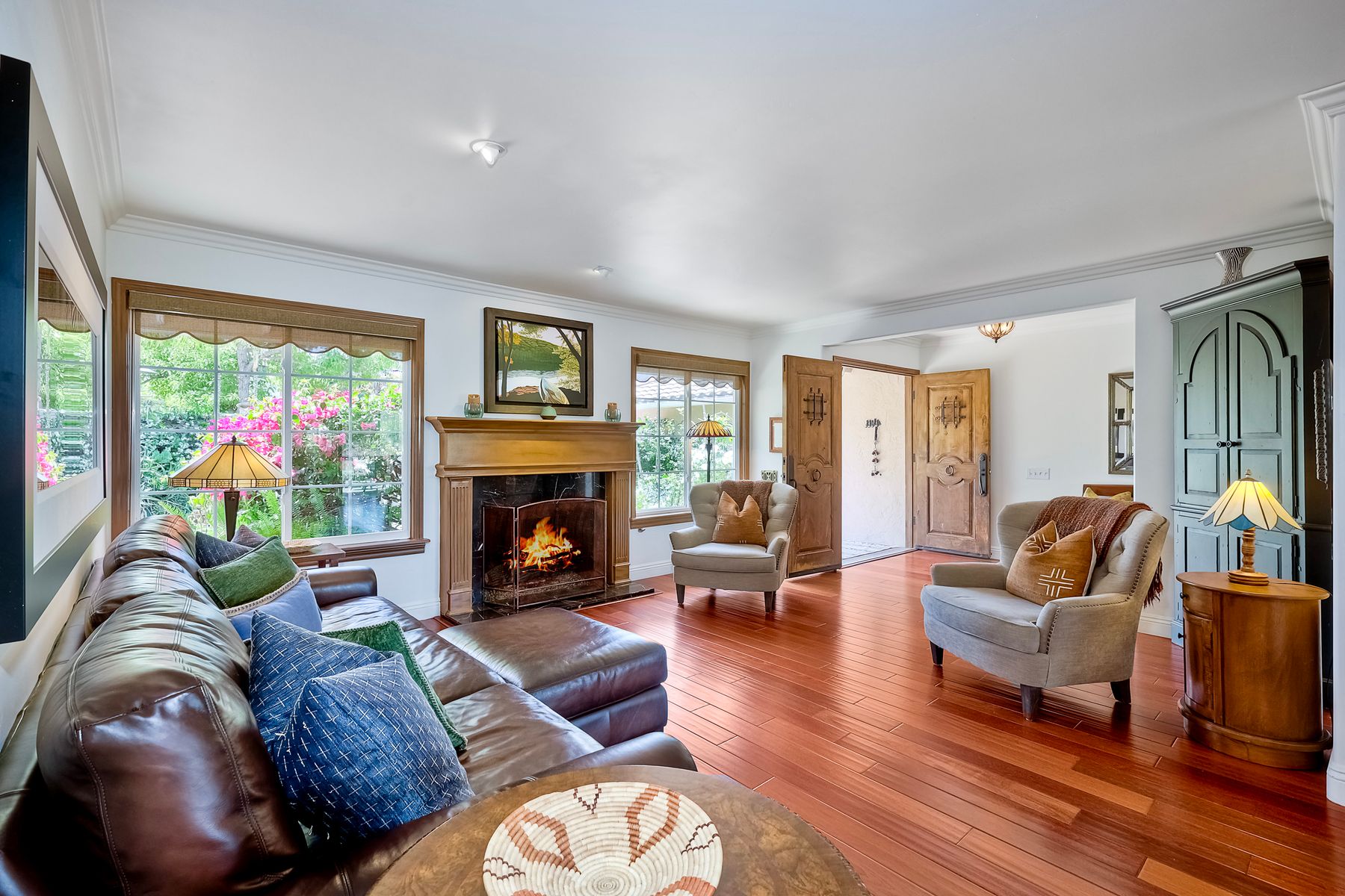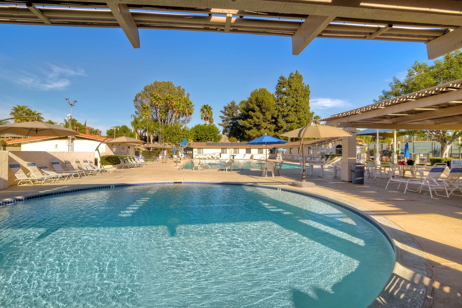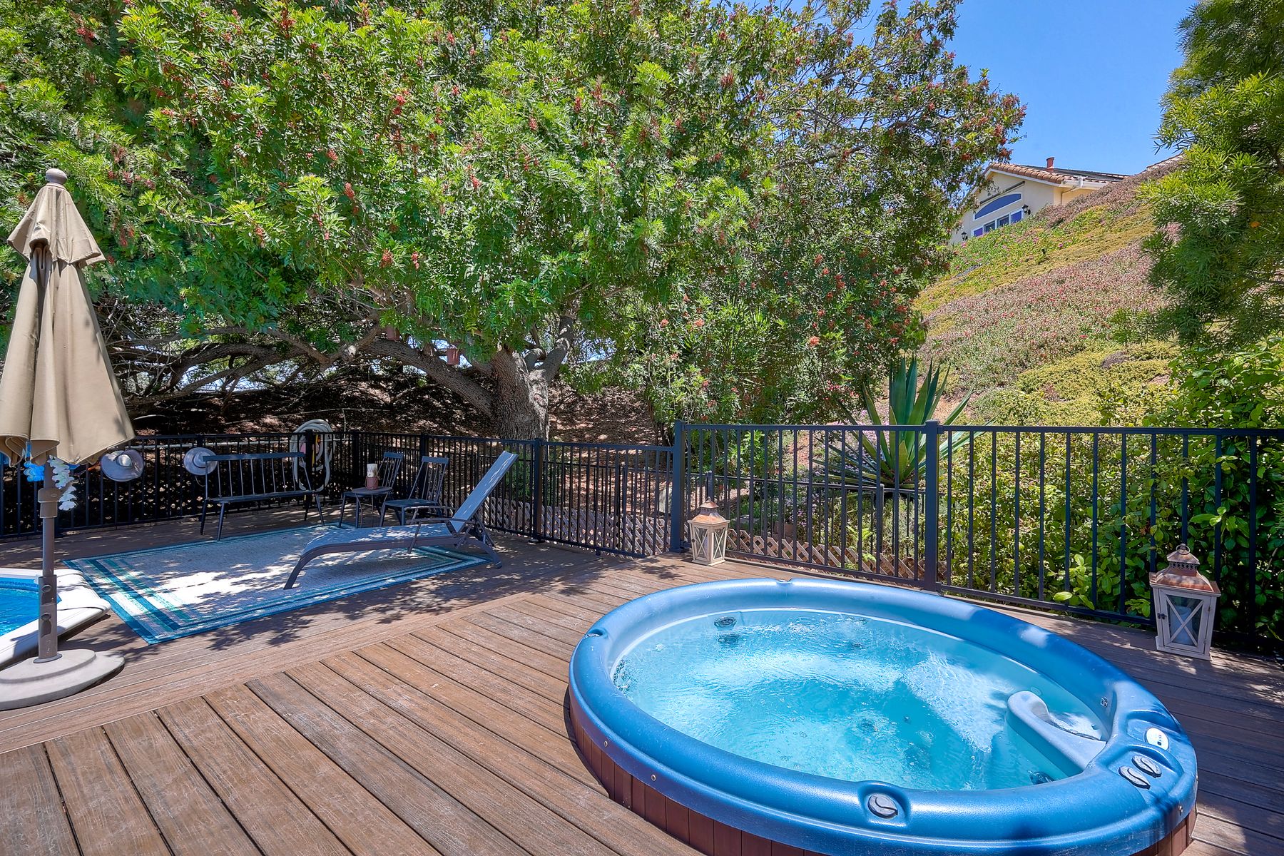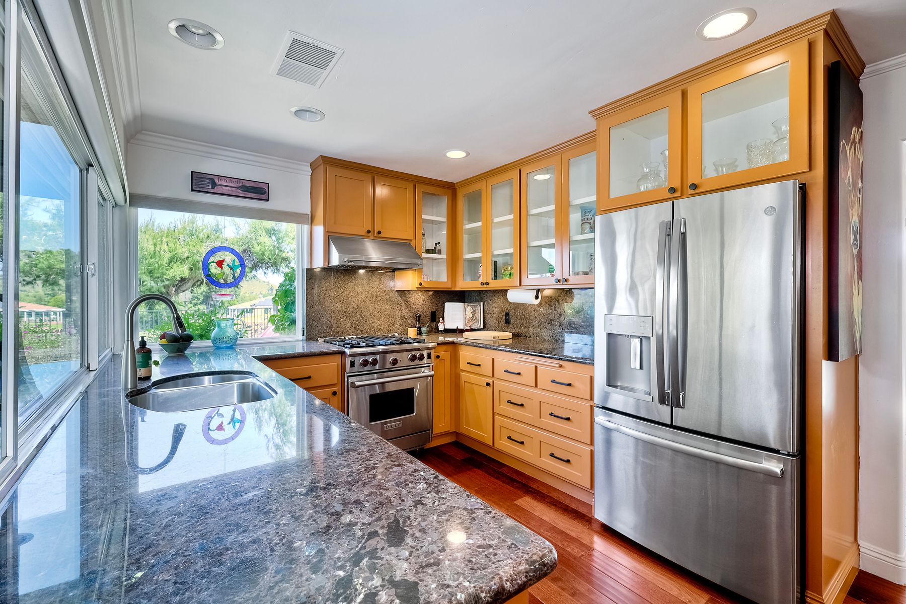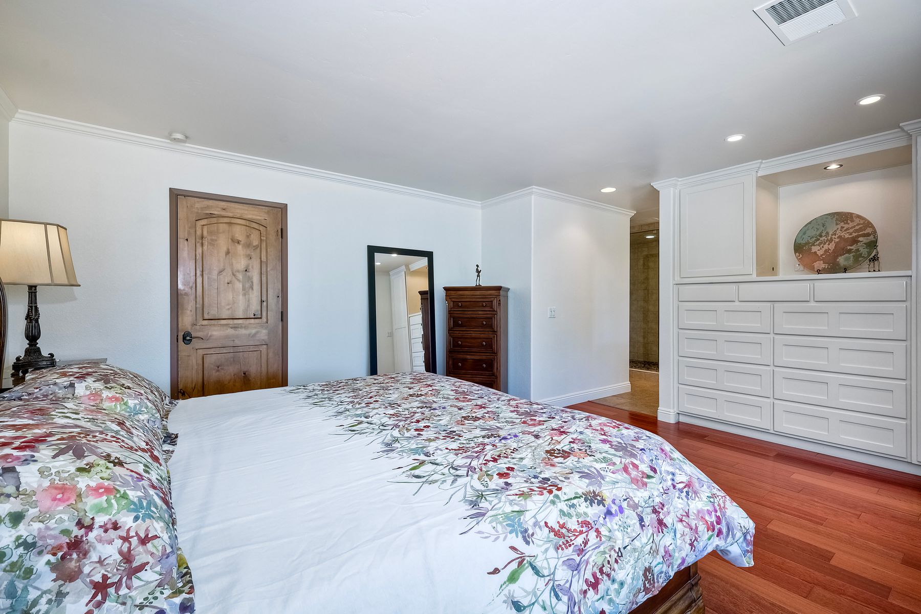 This spectacular 15th Fairway home sits on an elevated .41-acre lot with awesome views! Gorgeous 4-bedroom home w/Brazilian wood flooring throughout. Enter through knotty alder wood double doors, into open living room, dining room and family room. The kitchen overlooks the lush landscaping & golf course views. The front patio has a wood burning or gas logs fireplace, water fountain, custom kitchen BBQ area plus 2 additional patios including a saltwater pool with custom built Timber Tech Composite decking & separate spa! Newly painted throughout the interior, knotty alder wood interior doors, old world texturing on ceilings and walls & separate laundry room. The primary bedroom enjoys a customized oversized shower & large, picturesque view window overlooking the course & distant mountains. Seller owned solar system. Mature drought resistant landscaping and Electrostatic whole house air cleaner. Located in the Highly Rated Poway Unified School District. No Monthly HOA & No Mello Roos.