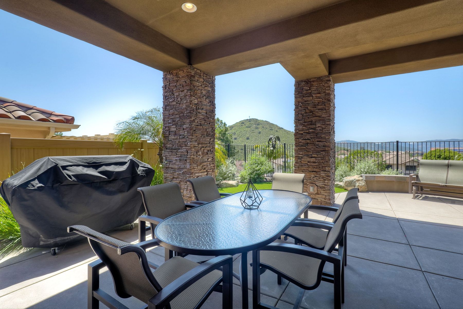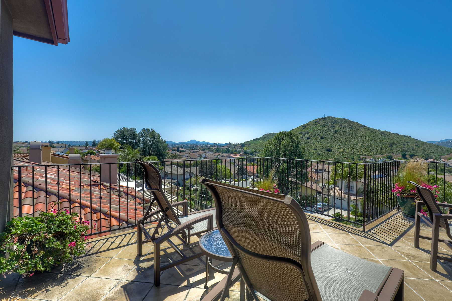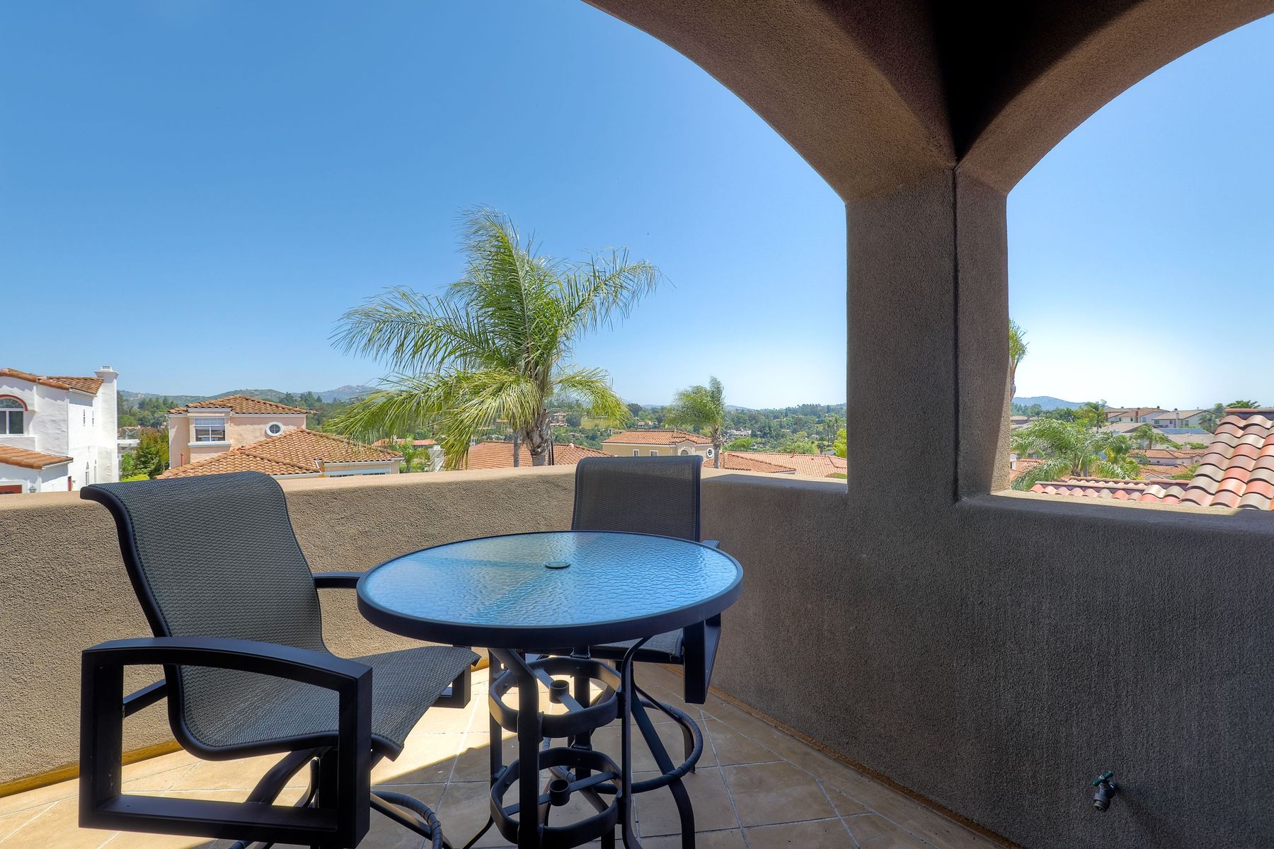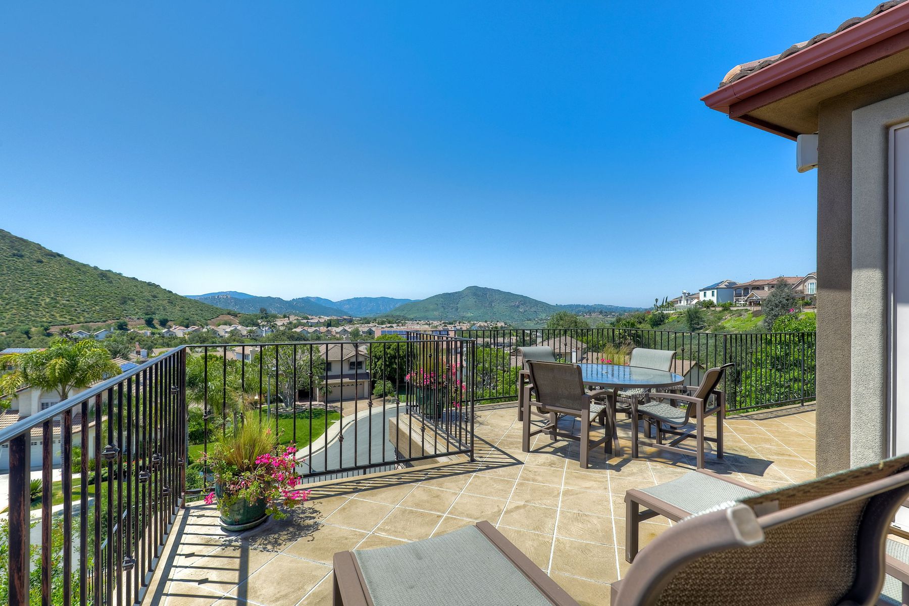 This elegant Montelena home welcomes you through a dramatic archway into a flawless combination of tall ceilings, wood floors, lovely finishes, rich warm colors and stunning views. To your right is a spacious office/senior suite/teenagers room with attached bathroom offering extra large shower for wheelchair/walker access if needed, custom tile, cabinets and large walk in closet. The adjacent family room/dining room/kitchen area is the heart of the home with open sightlines to panoramic views. See Supp The gourmet kitchen includes stainless steel appliances, double ovens, granite countertops, beautiful cabinetry, an island with seating for 4, pendant lighting and a separate bar with wine refrigerator. The butler's pantry extra storage and nearby laundry room make everyday function or entertaining a pleasure. A dramatic staircase to the second floor is illuminated by a skylight and multiple windows. The master suite is a true retreat with tall ceilings, a cozy fireplace and sliding glass doors to a balcony large enough for both dining and lounging while soaking in the mountain views. The master bath is beautifully appointed with lovely tile and stone work, a oversized walk in shower, double vanity, lots of storage and a walk in closet that's able to accommodate any wardrobe. A shared bathroom for the two spacious bedrooms both with large windows, large closets and one with access to a private patio with views of western hills complete the second floor. The backyard is the perfect balance of stone and concrete design, low maintenance plantings and artificial turf. The covered patio is a dining pleasure with surround sound, recessed lighting, piped in gas for barbecue, outdoor fan and lots of room for a table and chairs. A spiral staircase to the master suite balcony offers easy access to the backyard and above ground spa with views of Battle Mountain. Conversation areas complete this relaxing outdoor oasis. Amazing Location! In the award winning Poway Unified School District and close to restaurants, shopping and freeway access.