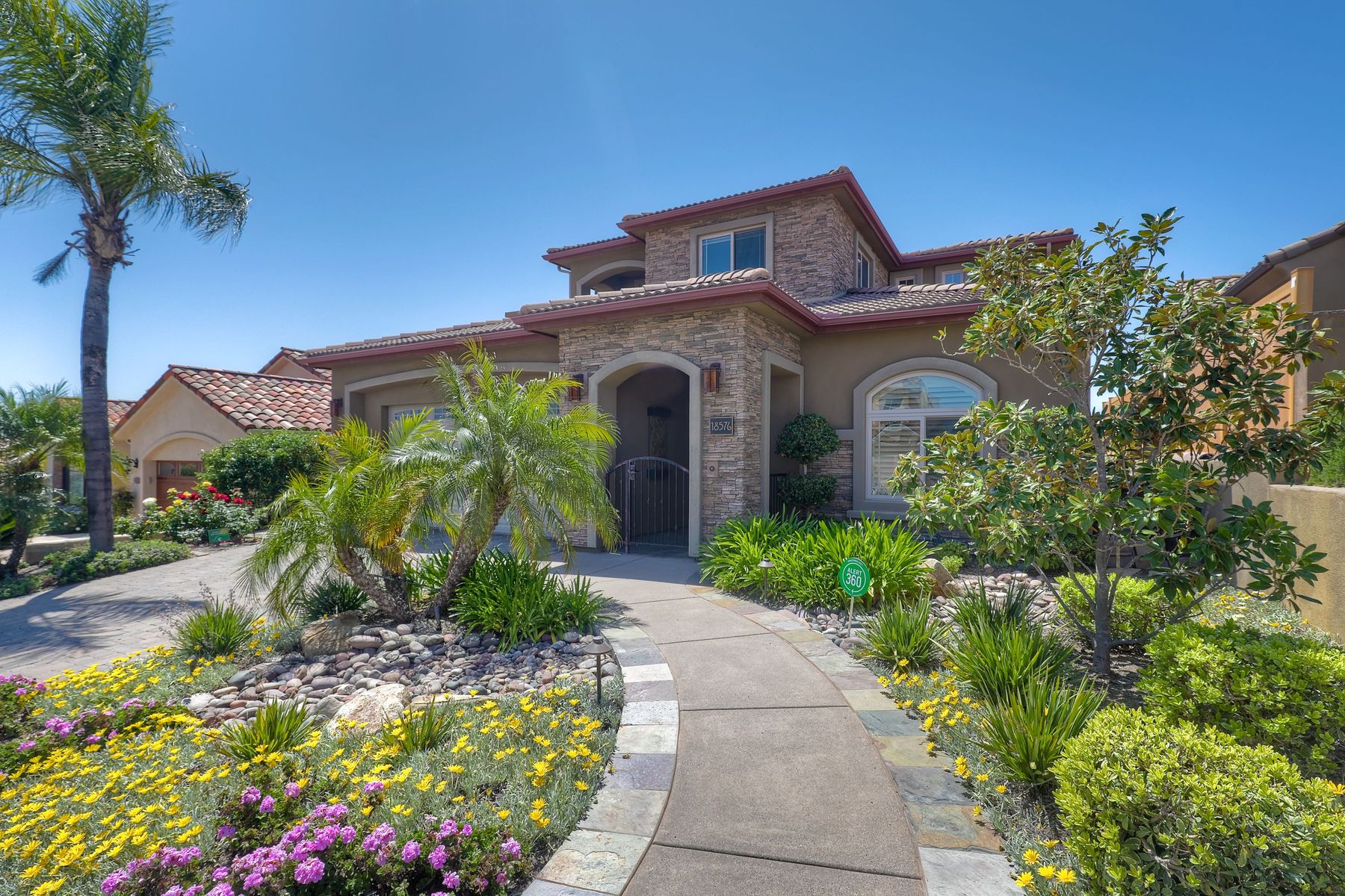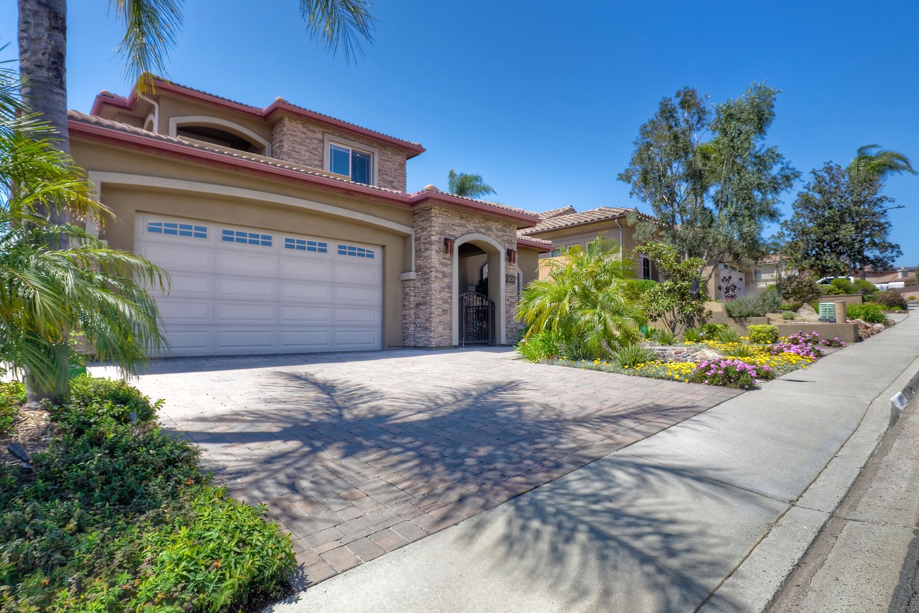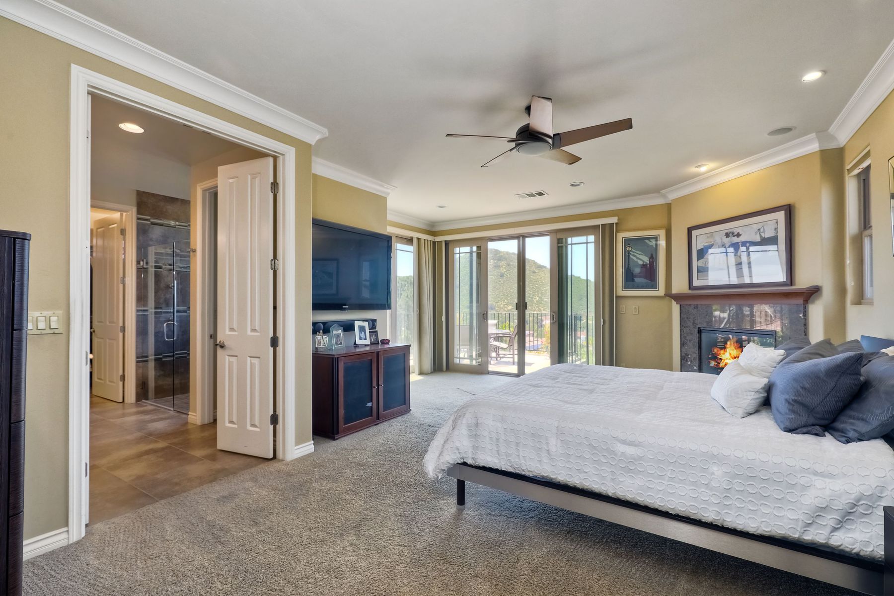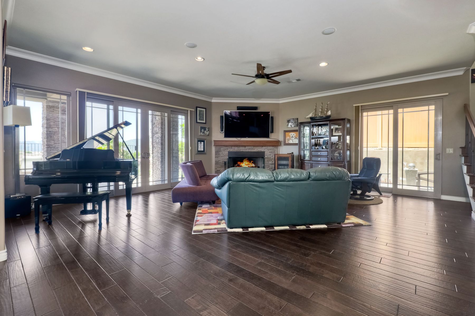 This elegant Montelena home welcomes you through a dramatic archway into a flawless combination of tall ceilings, wood floors, lovely finishes, rich warm colors and stunning views. To your right is a spacious office/senior suite/teenagers room with attached bathroom offering extra large shower for wheelchair/walker access if needed, custom tile, cabinets and large walk in closet. The adjacent family room/dining room/kitchen area is the heart of the home with open sightlines to panoramic views. See Supp The gourmet kitchen includes stainless steel appliances, double ovens, granite countertops, beautiful cabinetry, an island with seating for 4, pendant lighting and a separate bar with wine refrigerator. The butler's pantry extra storage and nearby laundry room make everyday function or entertaining a pleasure. A dramatic staircase to the second floor is illuminated by a skylight and multiple windows. The master suite is a true retreat with tall ceilings, a cozy fireplace and sliding glass doors to a balcony large enough for both dining and lounging while soaking in the mountain views. The master bath is beautifully appointed with lovely tile and stone work, a oversized walk in shower, double vanity, lots of storage and a walk in closet that's able to accommodate any wardrobe. A shared bathroom for the two spacious bedrooms both with large windows, large closets and one with access to a private patio with views of western hills complete the second floor. The backyard is the perfect balance of stone and concrete design, low maintenance plantings and artificial turf. The covered patio is a dining pleasure with surround sound, recessed lighting, piped in gas for barbecue, outdoor fan and lots of room for a table and chairs. A spiral staircase to the master suite balcony offers easy access to the backyard and above ground spa with views of Battle Mountain. Conversation areas complete this relaxing outdoor oasis. Amazing Location! In the award winning Poway Unified School District and close to restaurants, shopping and freeway access.