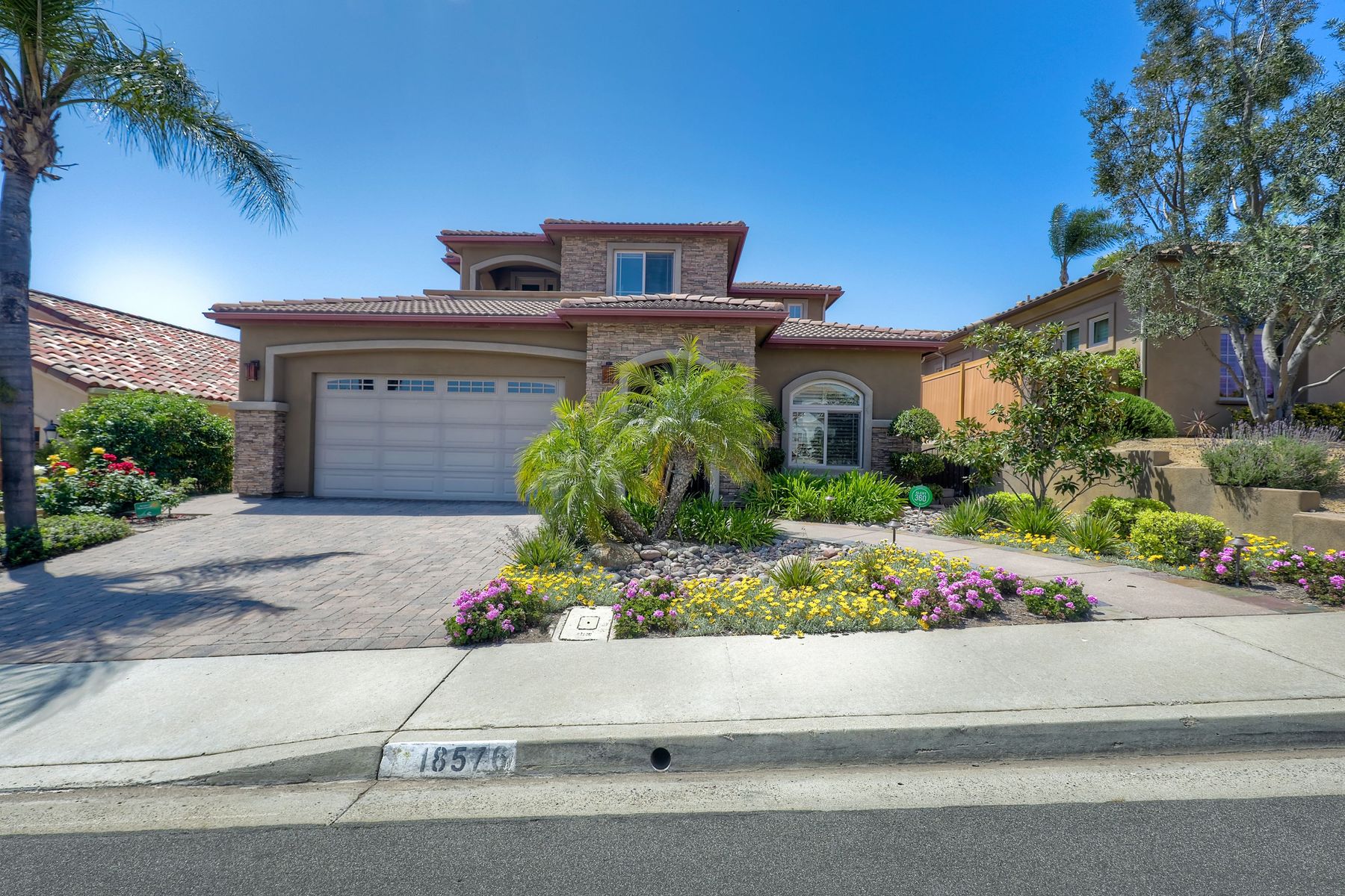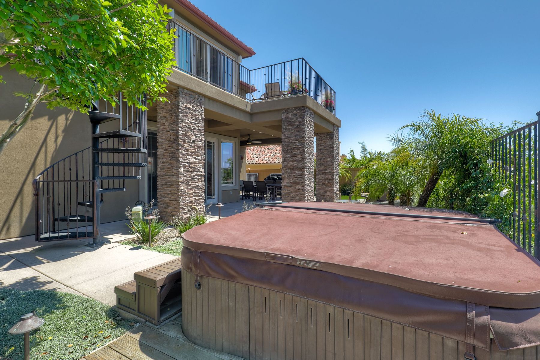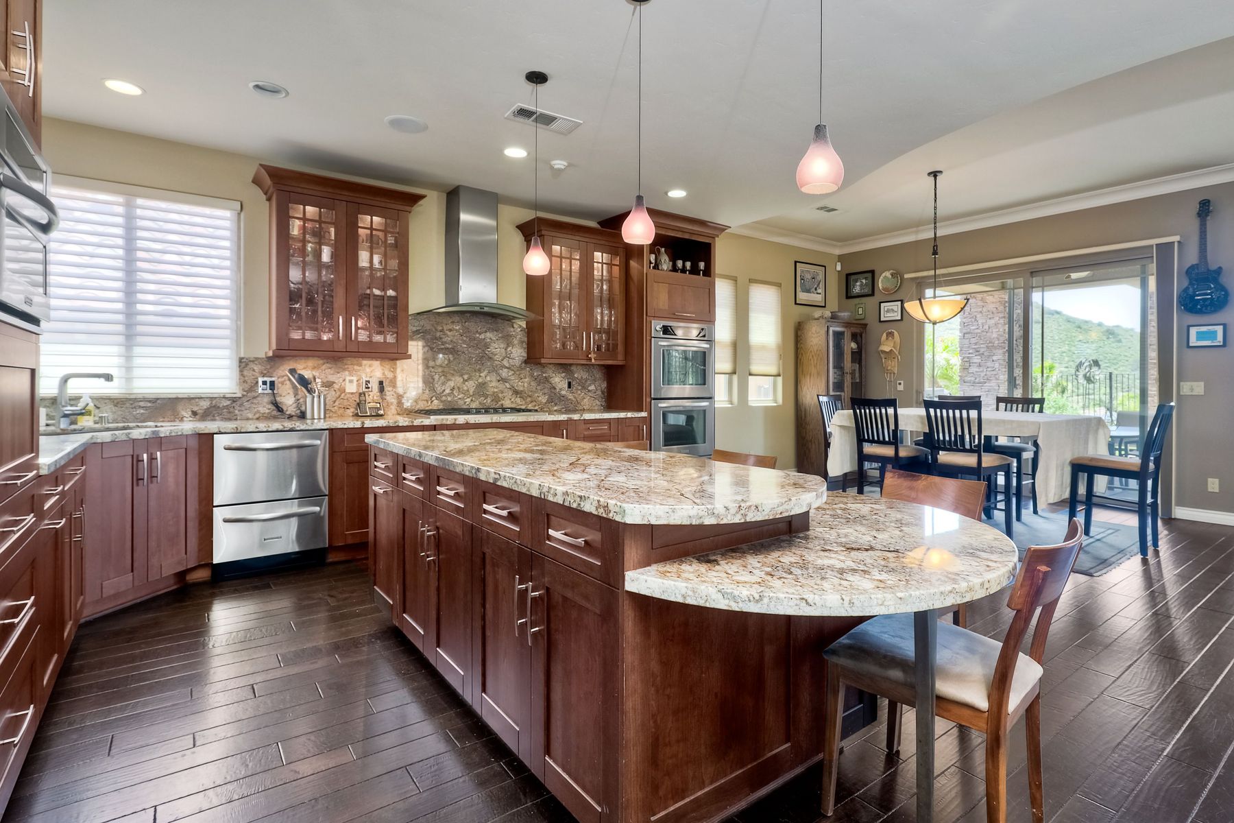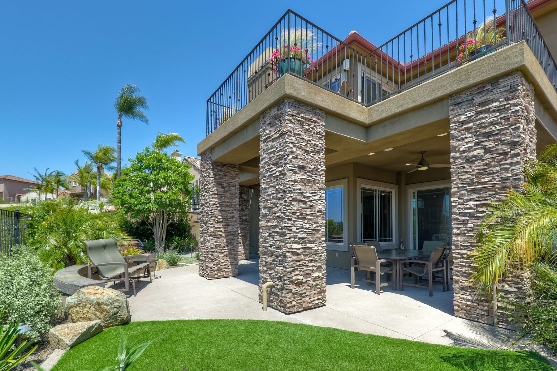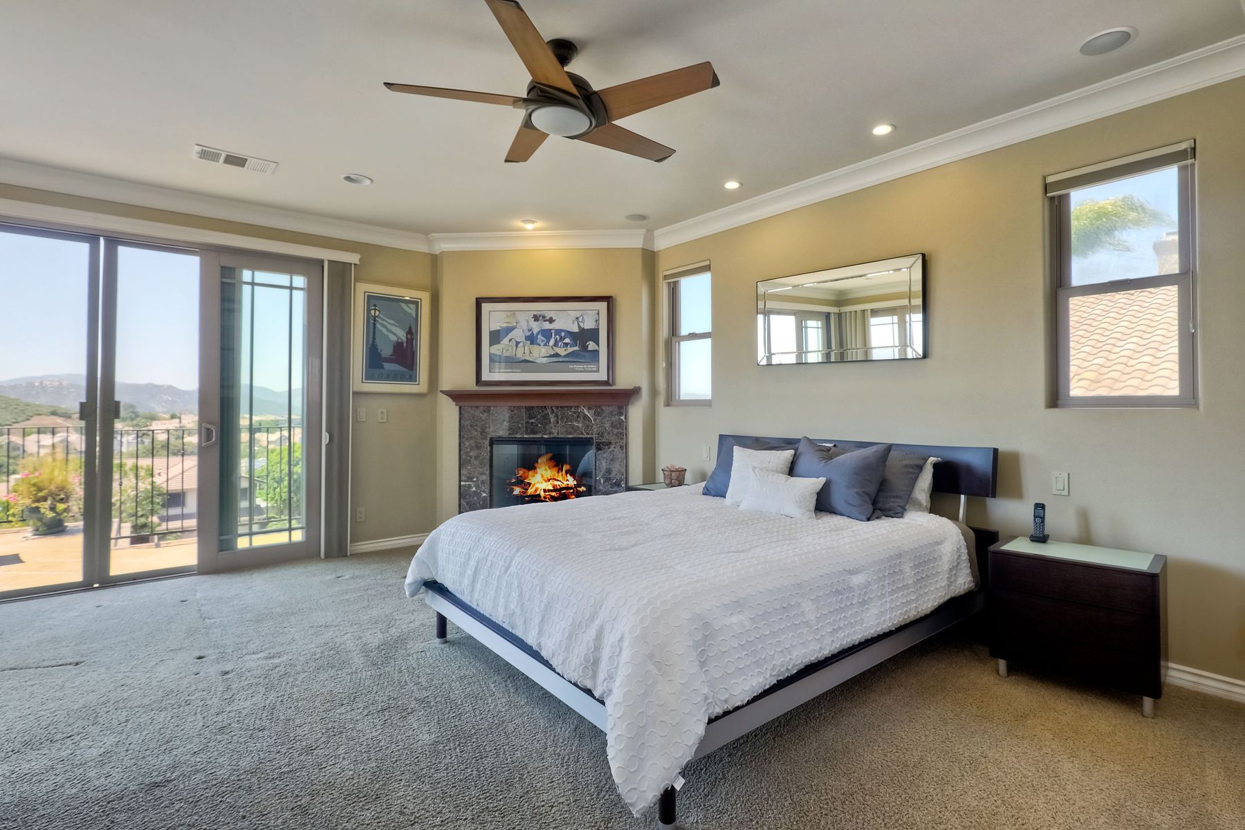 This elegant Montelena home welcomes you through a dramatic archway into a flawless combination of tall ceilings, wood floors, lovely finishes, rich warm colors and stunning views. To your right is a spacious office/senior suite/teenagers room with attached bathroom offering extra large shower for wheelchair/walker access if needed, custom tile, cabinets and large walk in closet. The adjacent family room/dining room/kitchen area is the heart of the home with open sightlines to panoramic views. See Supp The gourmet kitchen includes stainless steel appliances, double ovens, granite countertops, beautiful cabinetry, an island with seating for 4, pendant lighting and a separate bar with wine refrigerator. The butler's pantry extra storage and nearby laundry room make everyday function or entertaining a pleasure. A dramatic staircase to the second floor is illuminated by a skylight and multiple windows. The master suite is a true retreat with tall ceilings, a cozy fireplace and sliding glass doors to a balcony large enough for both dining and lounging while soaking in the mountain views. The master bath is beautifully appointed with lovely tile and stone work, a oversized walk in shower, double vanity, lots of storage and a walk in closet that's able to accommodate any wardrobe. A shared bathroom for the two spacious bedrooms both with large windows, large closets and one with access to a private patio with views of western hills complete the second floor. The backyard is the perfect balance of stone and concrete design, low maintenance plantings and artificial turf. The covered patio is a dining pleasure with surround sound, recessed lighting, piped in gas for barbecue, outdoor fan and lots of room for a table and chairs. A spiral staircase to the master suite balcony offers easy access to the backyard and above ground spa with views of Battle Mountain. Conversation areas complete this relaxing outdoor oasis. Amazing Location! In the award winning Poway Unified School District and close to restaurants, shopping and freeway access.