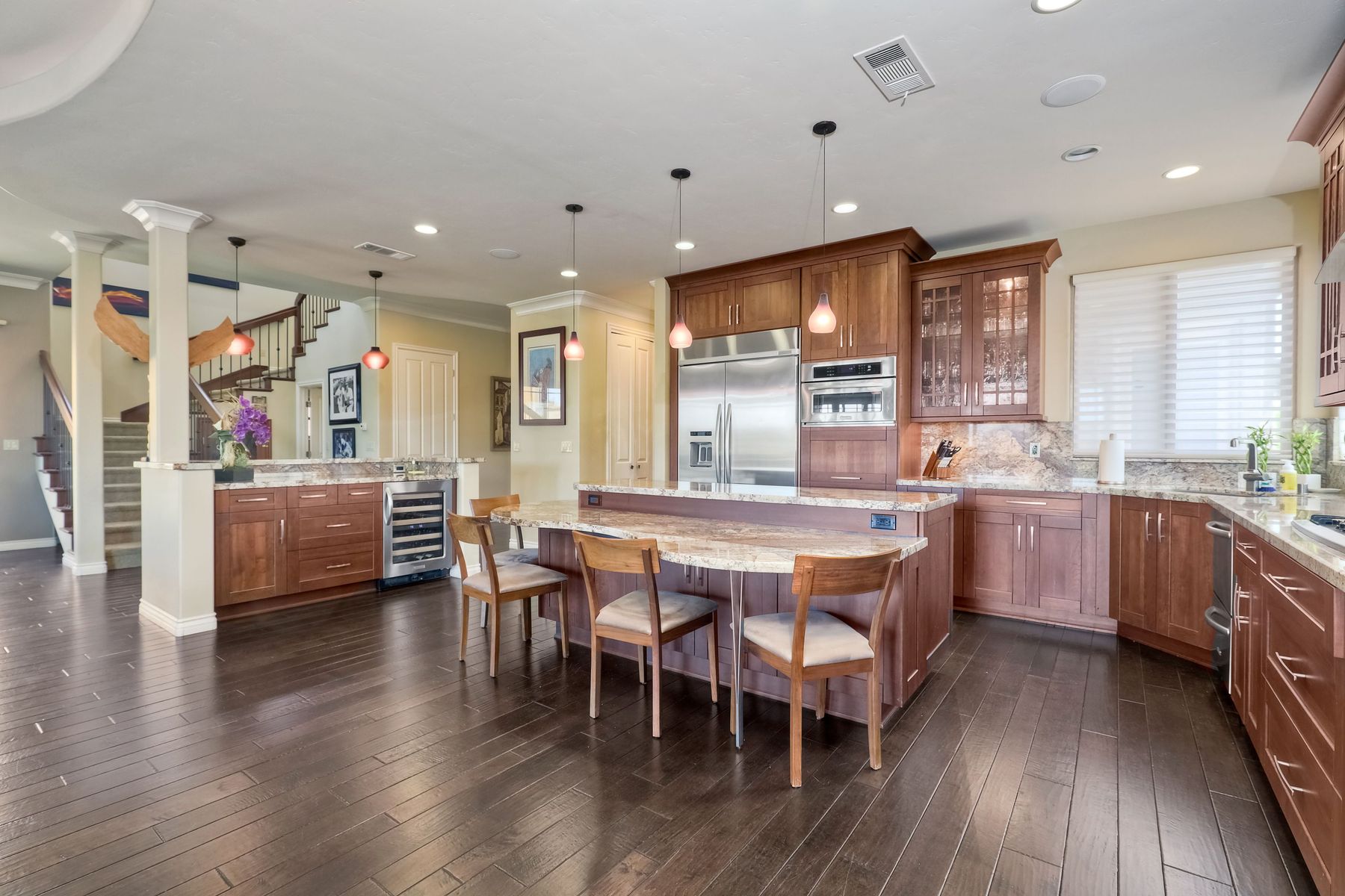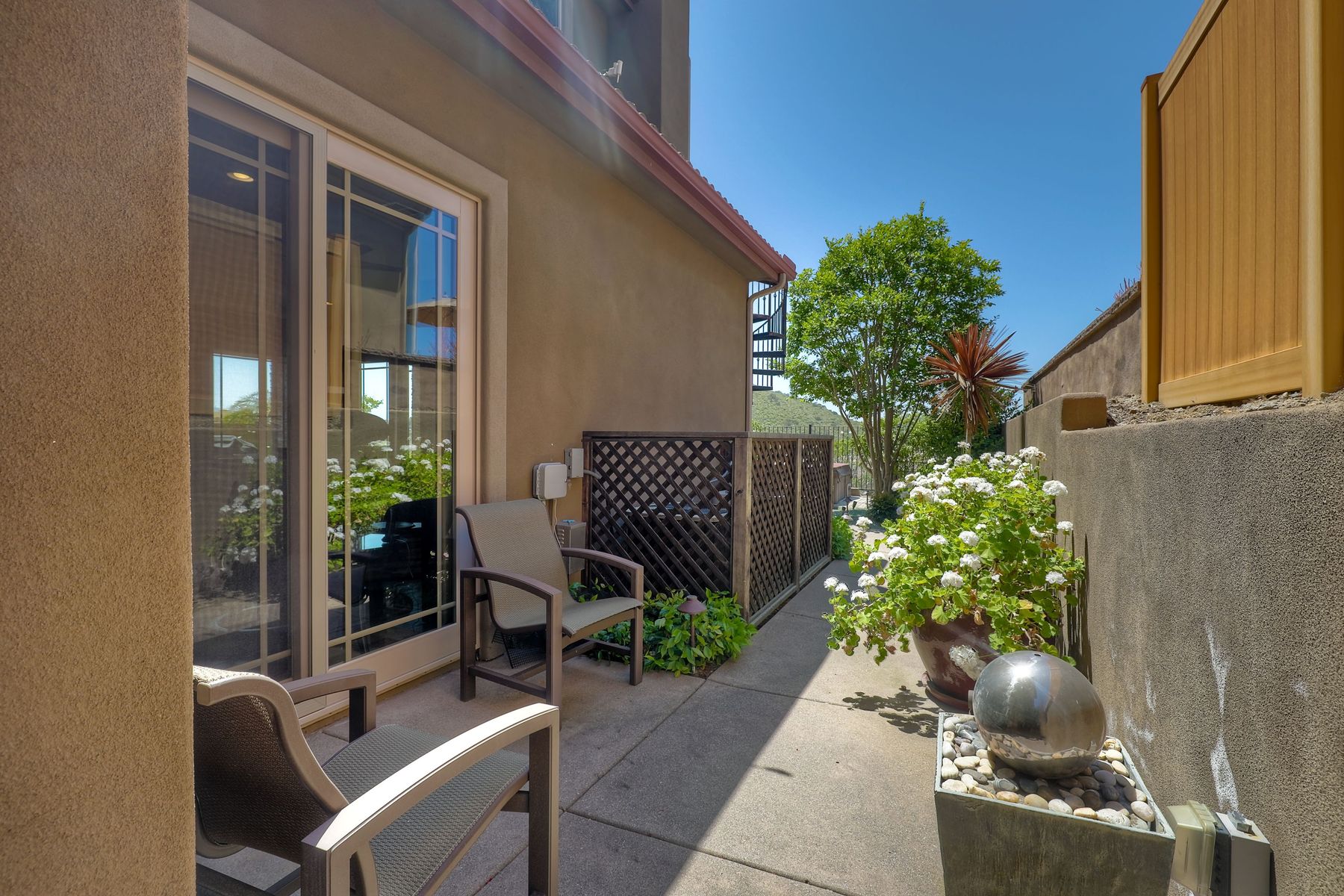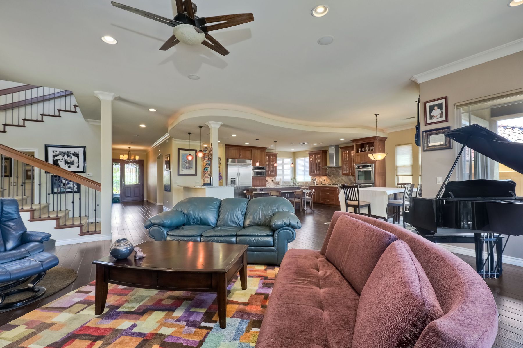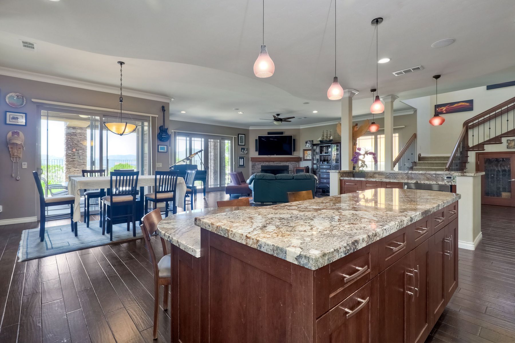 This elegant Montelena home welcomes you through a dramatic archway into a flawless combination of tall ceilings, wood floors, lovely finishes, rich warm colors and stunning views. To your right is a spacious office/senior suite/teenagers room with attached bathroom offering extra large shower for wheelchair/walker access if needed, custom tile, cabinets and large walk in closet. The adjacent family room/dining room/kitchen area is the heart of the home with open sightlines to panoramic views. See Supp The gourmet kitchen includes stainless steel appliances, double ovens, granite countertops, beautiful cabinetry, an island with seating for 4, pendant lighting and a separate bar with wine refrigerator. The butler's pantry extra storage and nearby laundry room make everyday function or entertaining a pleasure. A dramatic staircase to the second floor is illuminated by a skylight and multiple windows. The master suite is a true retreat with tall ceilings, a cozy fireplace and sliding glass doors to a balcony large enough for both dining and lounging while soaking in the mountain views. The master bath is beautifully appointed with lovely tile and stone work, a oversized walk in shower, double vanity, lots of storage and a walk in closet that's able to accommodate any wardrobe. A shared bathroom for the two spacious bedrooms both with large windows, large closets and one with access to a private patio with views of western hills complete the second floor. The backyard is the perfect balance of stone and concrete design, low maintenance plantings and artificial turf. The covered patio is a dining pleasure with surround sound, recessed lighting, piped in gas for barbecue, outdoor fan and lots of room for a table and chairs. A spiral staircase to the master suite balcony offers easy access to the backyard and above ground spa with views of Battle Mountain. Conversation areas complete this relaxing outdoor oasis. Amazing Location! In the award winning Poway Unified School District and close to restaurants, shopping and freeway access.