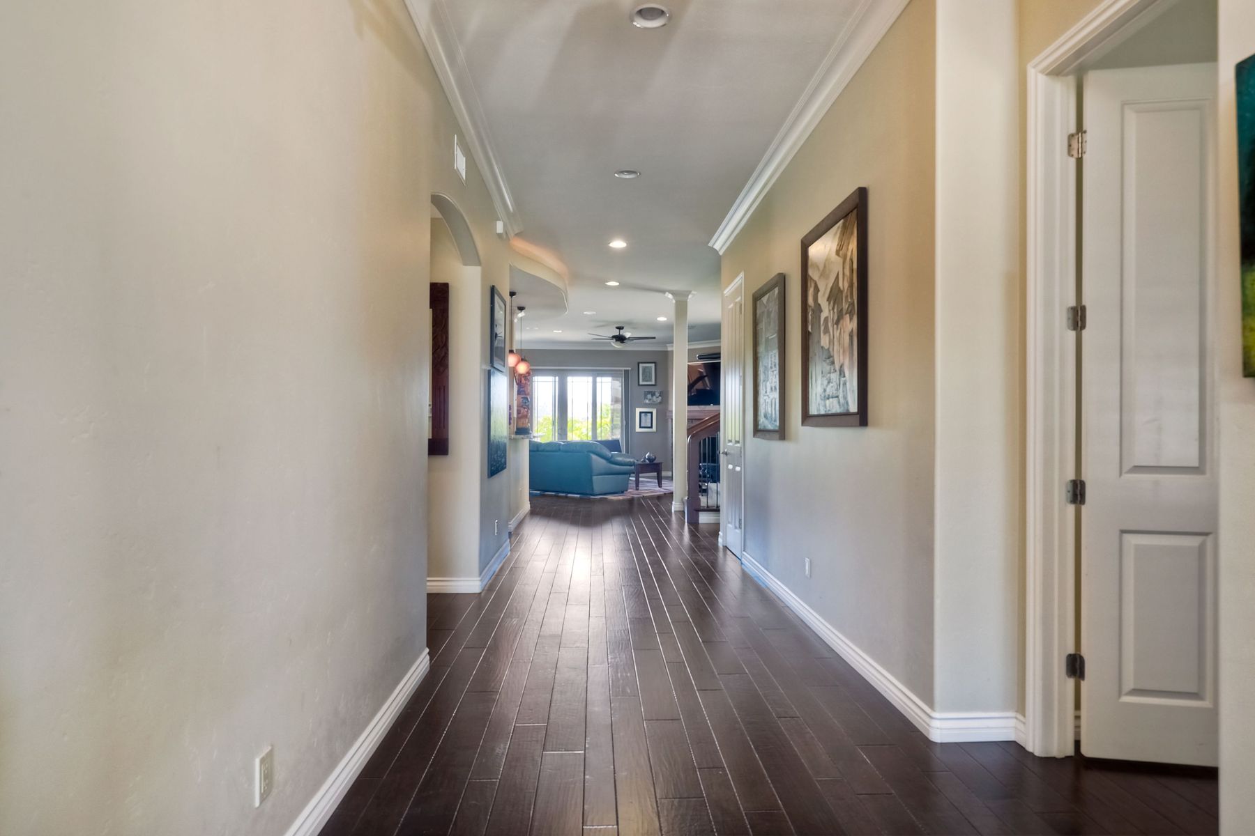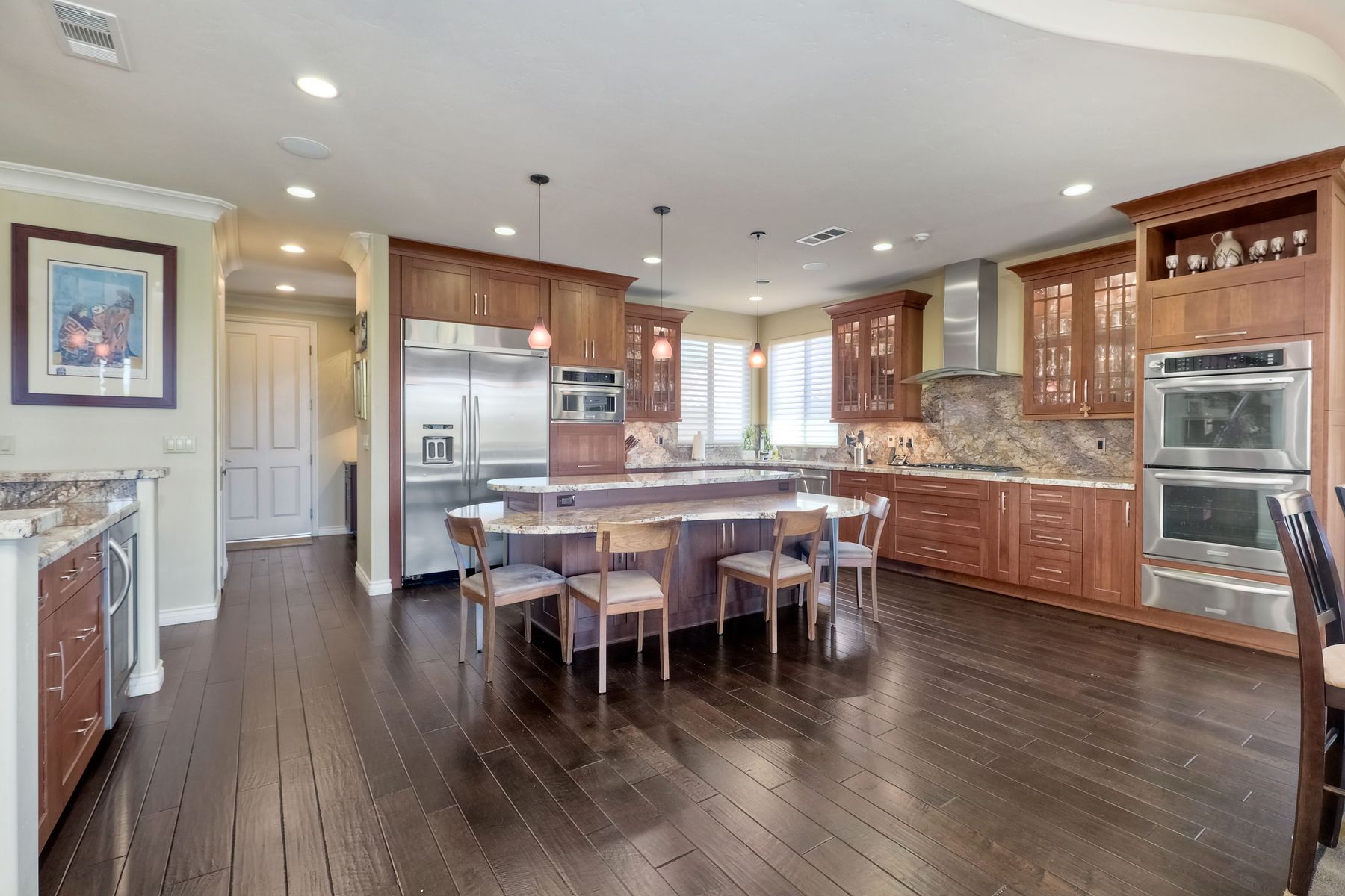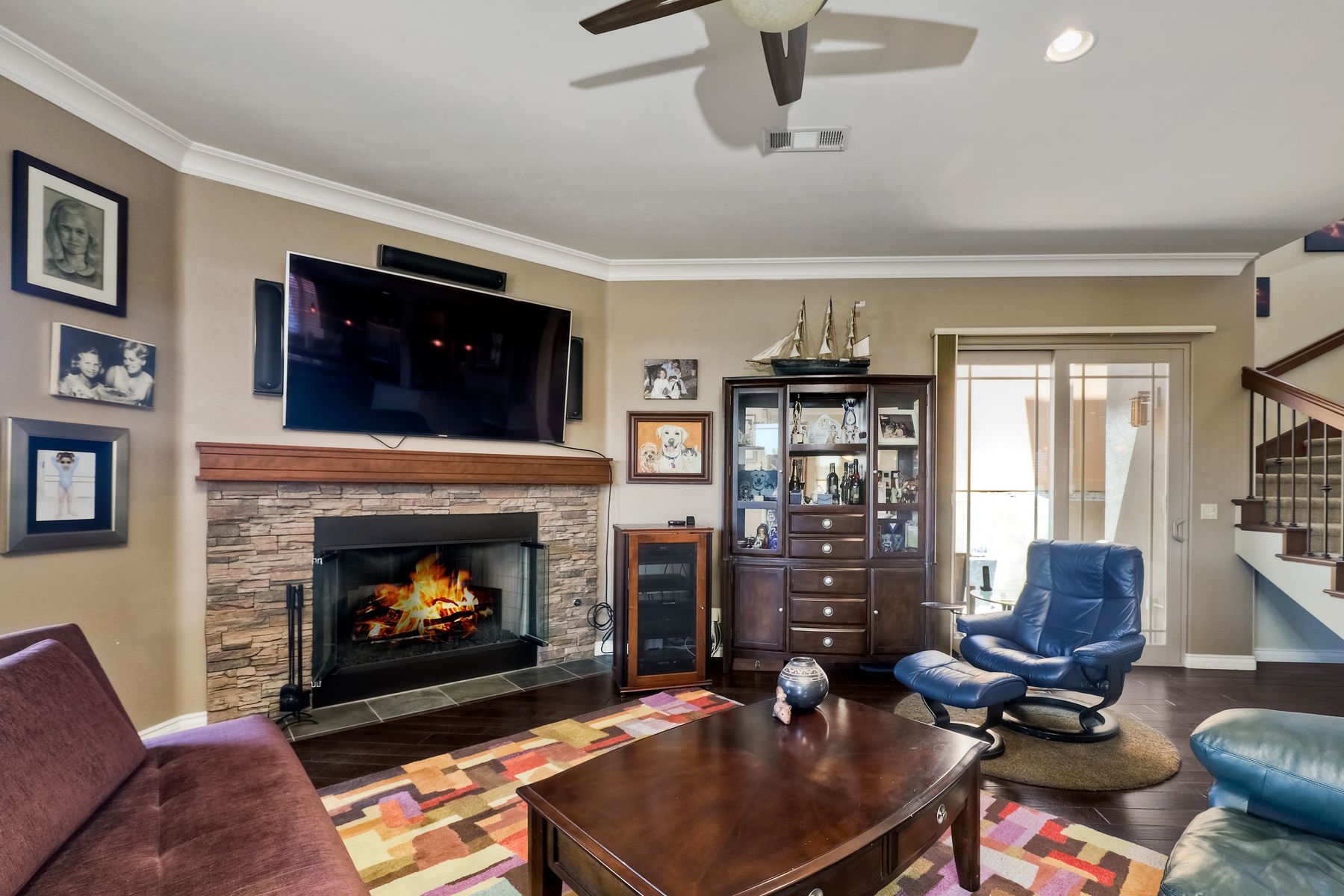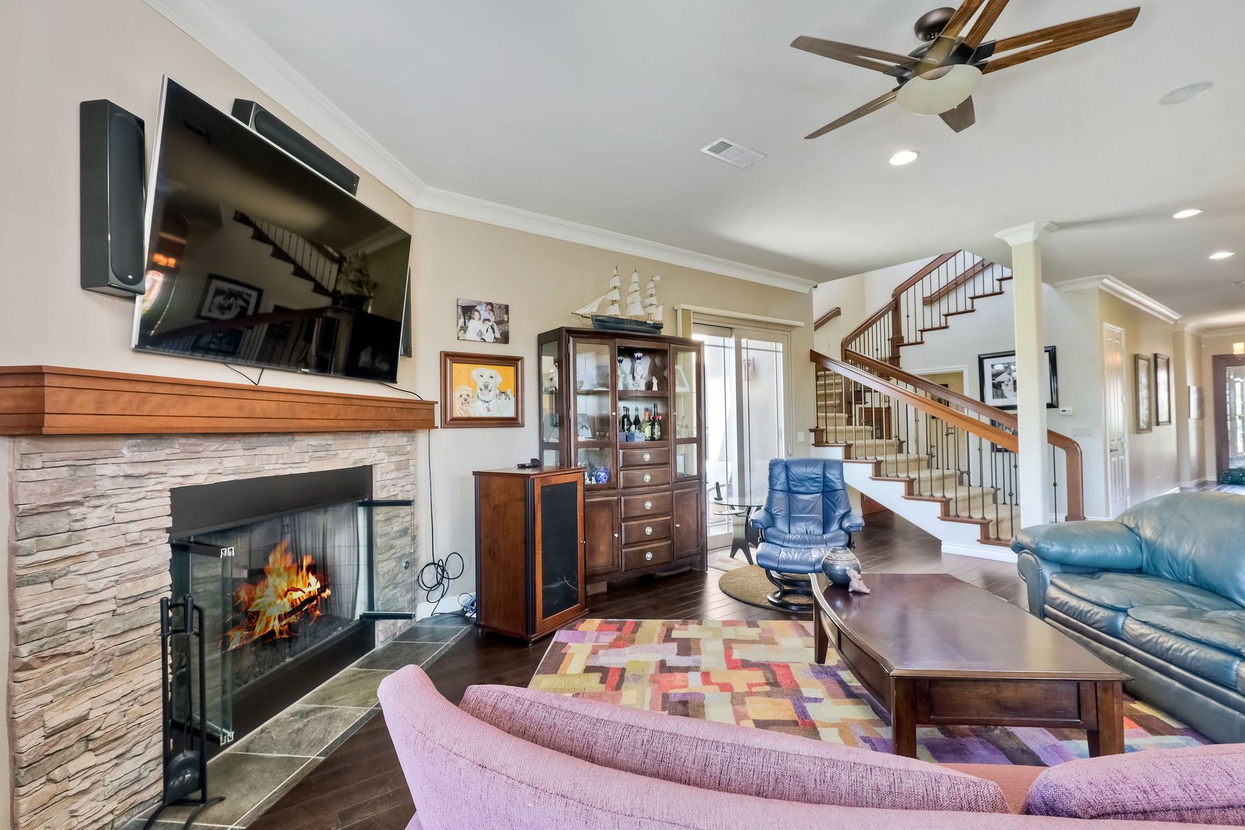 This elegant Montelena home welcomes you through a dramatic archway into a flawless combination of tall ceilings, wood floors, lovely finishes, rich warm colors and stunning views. To your right is a spacious office/senior suite/teenagers room with attached bathroom offering extra large shower for wheelchair/walker access if needed, custom tile, cabinets and large walk in closet. The adjacent family room/dining room/kitchen area is the heart of the home with open sightlines to panoramic views. See Supp The gourmet kitchen includes stainless steel appliances, double ovens, granite countertops, beautiful cabinetry, an island with seating for 4, pendant lighting and a separate bar with wine refrigerator. The butler's pantry extra storage and nearby laundry room make everyday function or entertaining a pleasure. A dramatic staircase to the second floor is illuminated by a skylight and multiple windows. The master suite is a true retreat with tall ceilings, a cozy fireplace and sliding glass doors to a balcony large enough for both dining and lounging while soaking in the mountain views. The master bath is beautifully appointed with lovely tile and stone work, a oversized walk in shower, double vanity, lots of storage and a walk in closet that's able to accommodate any wardrobe. A shared bathroom for the two spacious bedrooms both with large windows, large closets and one with access to a private patio with views of western hills complete the second floor. The backyard is the perfect balance of stone and concrete design, low maintenance plantings and artificial turf. The covered patio is a dining pleasure with surround sound, recessed lighting, piped in gas for barbecue, outdoor fan and lots of room for a table and chairs. A spiral staircase to the master suite balcony offers easy access to the backyard and above ground spa with views of Battle Mountain. Conversation areas complete this relaxing outdoor oasis. Amazing Location! In the award winning Poway Unified School District and close to restaurants, shopping and freeway access.