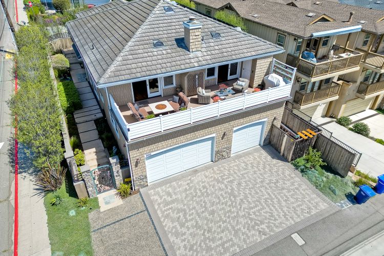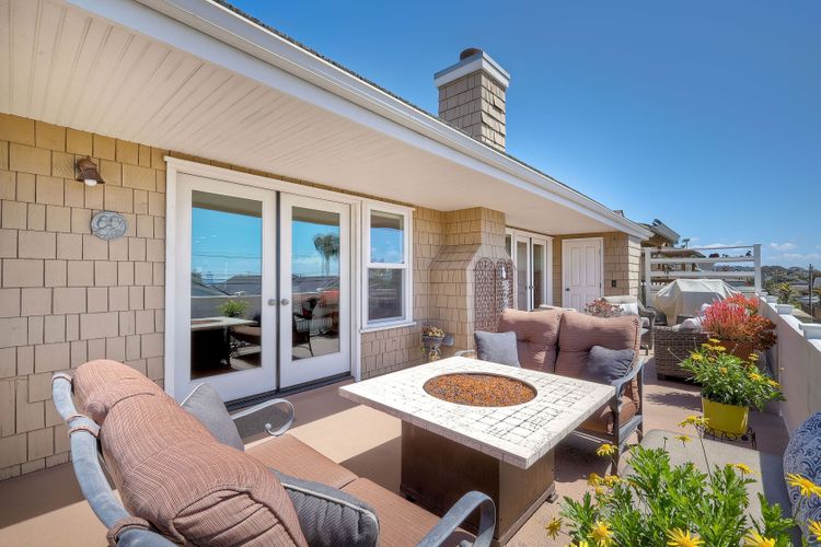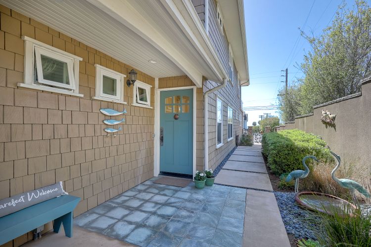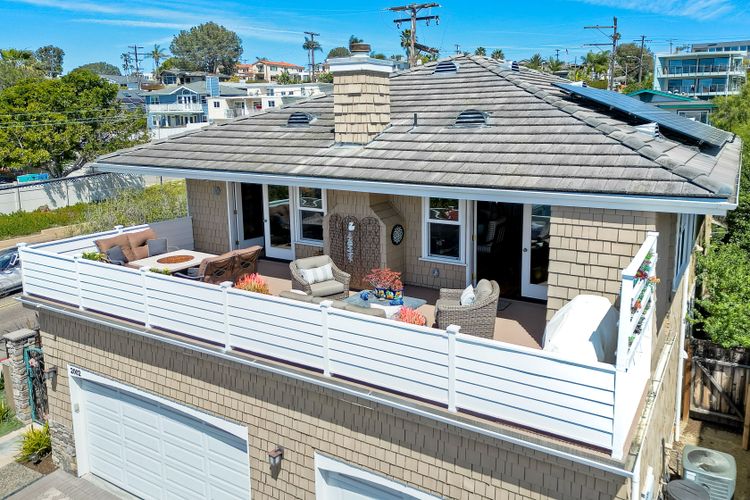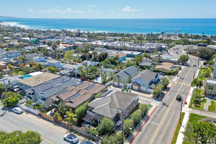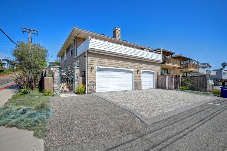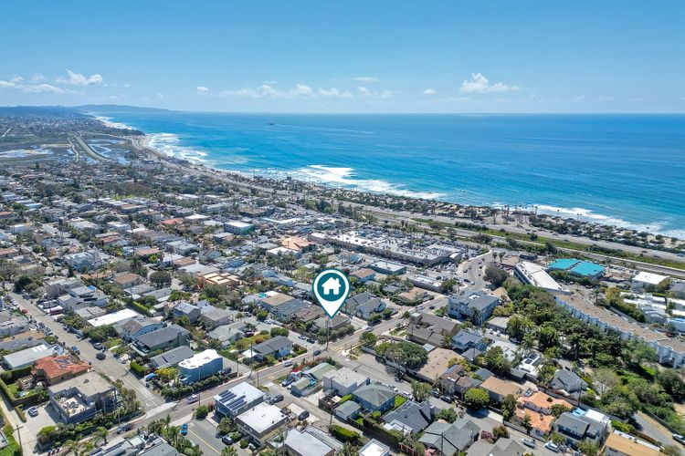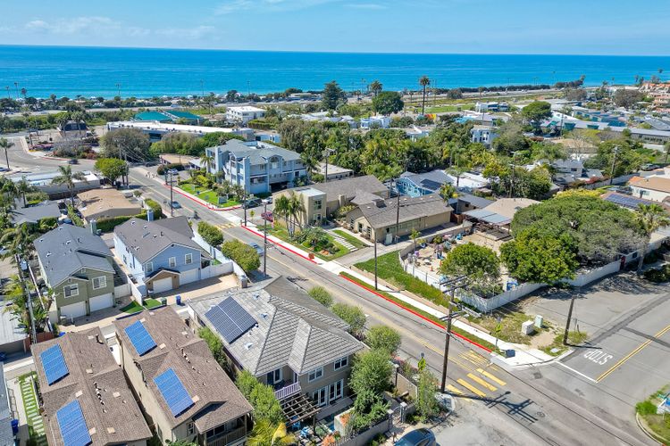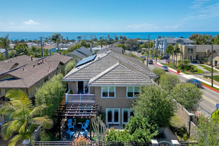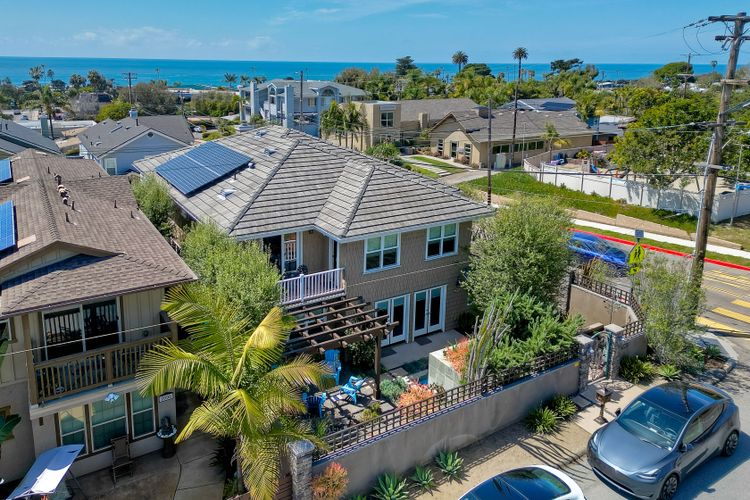 Discover unparalleled luxury living in this modern coastal retreat, perfectly situated just steps from the beach, Cardiff Seaside Market, fine dining, and the coastal rail trail. Boasting a unique blend of contemporary design and coastal charm, this home offers 3 bedrooms plus an office and 4 baths. Step inside to experience a seamless fusion of modern design and coastal inspired decor. The light-filled living spaces feature high ceilings, hardwood floors, large windows and french doors to capture the views of the ocean and spacious deck. Enjoy the spectacular sunsets, ocean views and coastal breezes while sipping a beverage by your custom firepit.  The chef's kitchen is a culinary masterpiece, with lovely granite countertops, large island with extra storage, sub-zero refrigerator, and beautiful cabinetry. The wine frig and bosch dishwasher also make hosting a breeze. Entertain family and friends in the expansive bonus room. With ample space for seating, a storage closet, and beautiful guest bath with marble floor and shower, this room is perfect for hosting gatherings or enjoying laid back evenings with loved ones. If needed, it could be easily converted into a guest suite or extra bedrooms. Retreat to your primary suite, complete with a spa-like ensuite and walk in closet. Just outside the french doors of the bedroom is a custom fountain, sitting area, and meticulously landscaped sea garden, to enjoy your morning coffee or evening glass of wine. Enjoy the ultimate convenience of a private elevator providing easy access to the second level of the home. Whether you're carrying groceries from the garage, or simply want to avoid the stairs, the elevator adds an extra layer of comfort and design. This home offers ample parking with a 3-car garage, and 4 additional spaces in the driveway, providing plenty of room for guests or multiple vehicles. With parking at a premium in Cardiff, this is definitely a huge asset. The garage also has a tesla outlet, and is perfect for storing surfboards, bikes and all your beach needs. Paid off solar panels save you dollars. Don't miss this rare opportunity to own a piece of coastal paradise with all the modern amenities you desire.