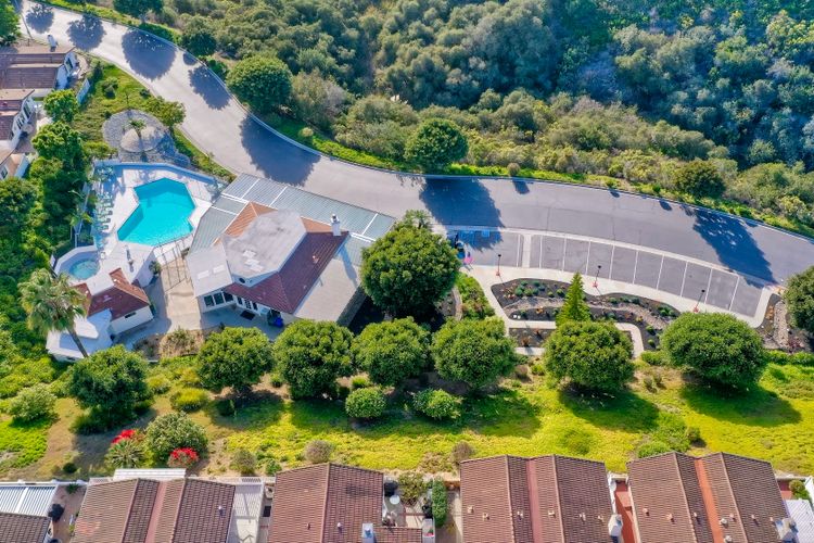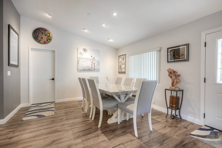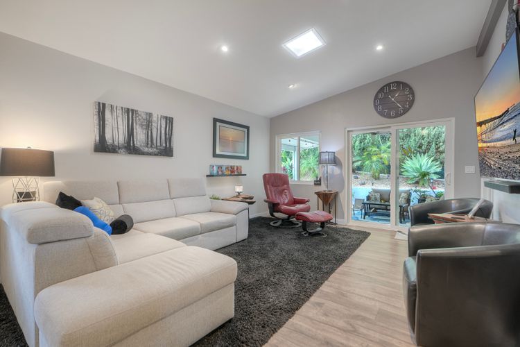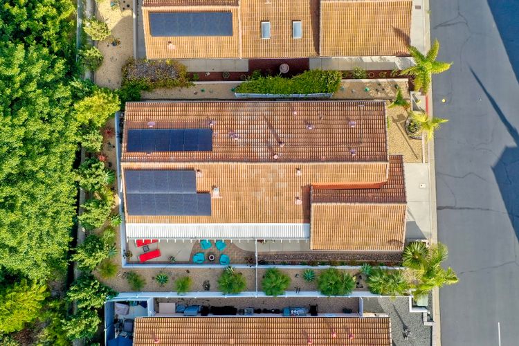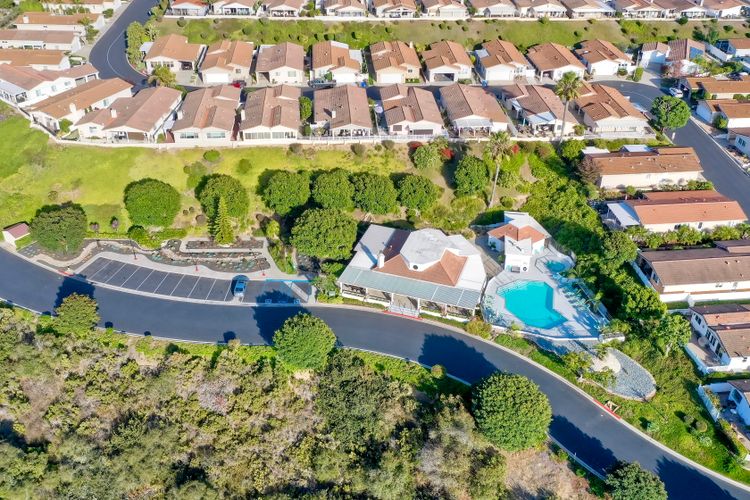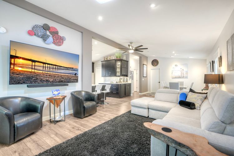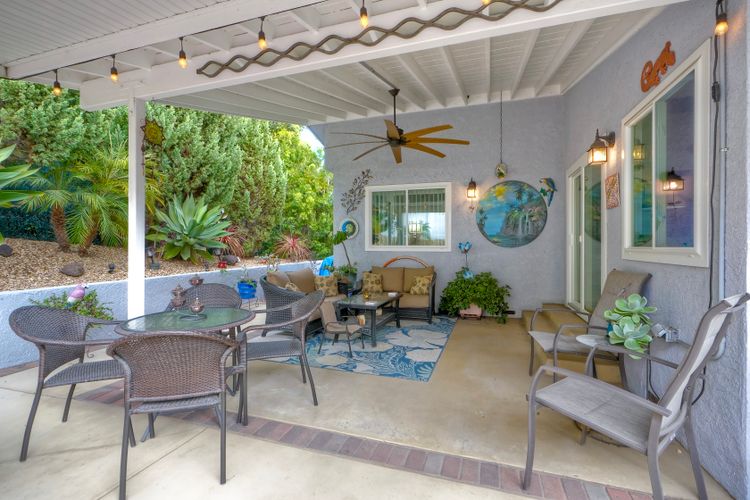 Stunning home beautifully updated! Home offers functionality with a long list of modern enhancements! Wall removed in kitchen to acquire a more open concept*Elegant recessed lighting*brand new kitchen contemporary finishes*granite counters*LED lighting*New flooring for a fresh cohesive look! Bar frig/ wine rack for entertaining* New refrigerator* Energy efficient SOLAR owned*New roof*Murphy bed*Primary remodel bedroom for efficiency*Gorgeous oversized shower with 2 shower heads custom remodeled room extremely efficient* custom front door* new windows with disappearing screens*Sought after west side location *direct access from garage to house*Garage cabinets/shelving *Spacious private yard with natural gas firepit boasting landscape lighting & overhead yard illumination an entertainers dream quiet/private* Own the land, own the house, gated senior community enjoy the ocean breezes!