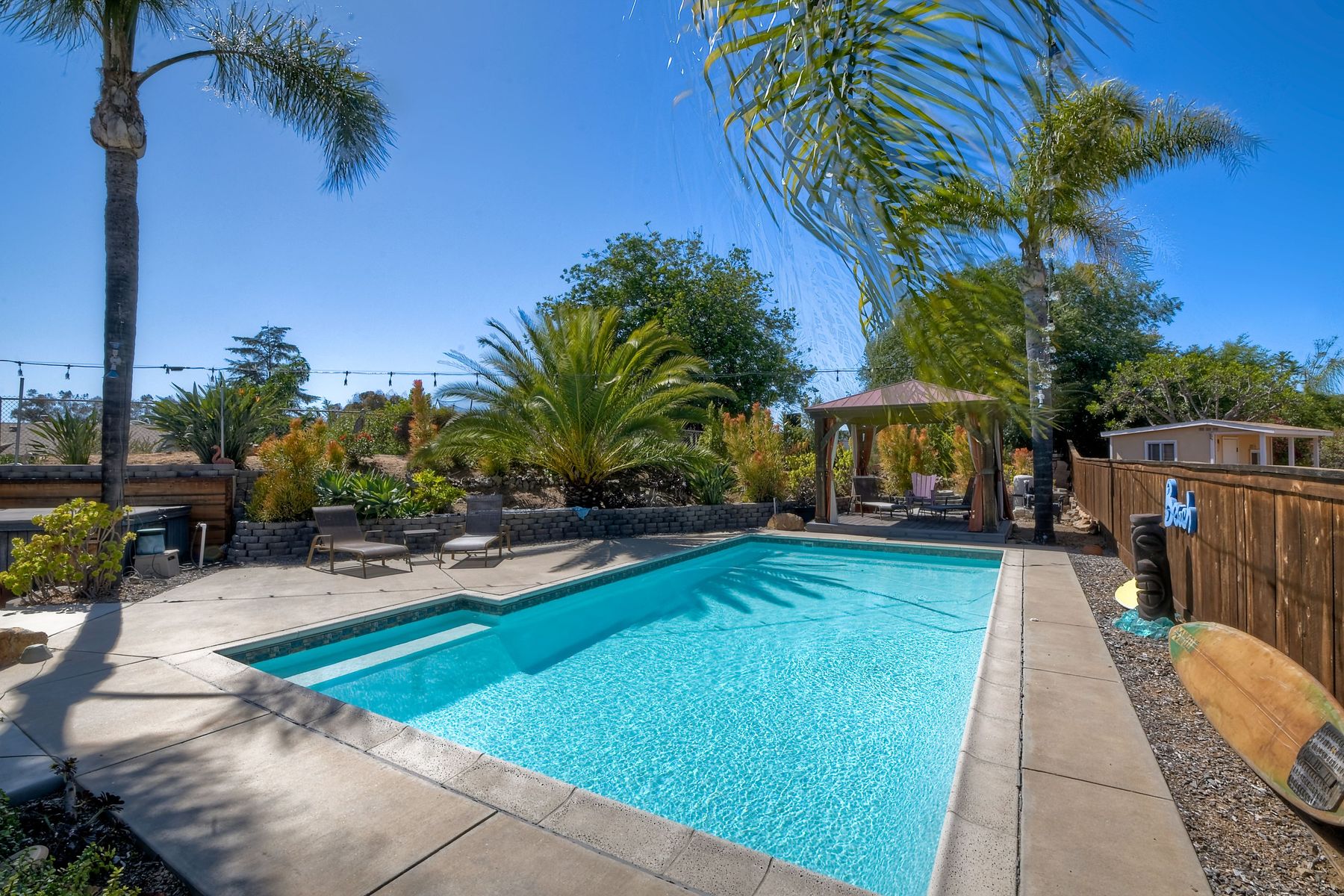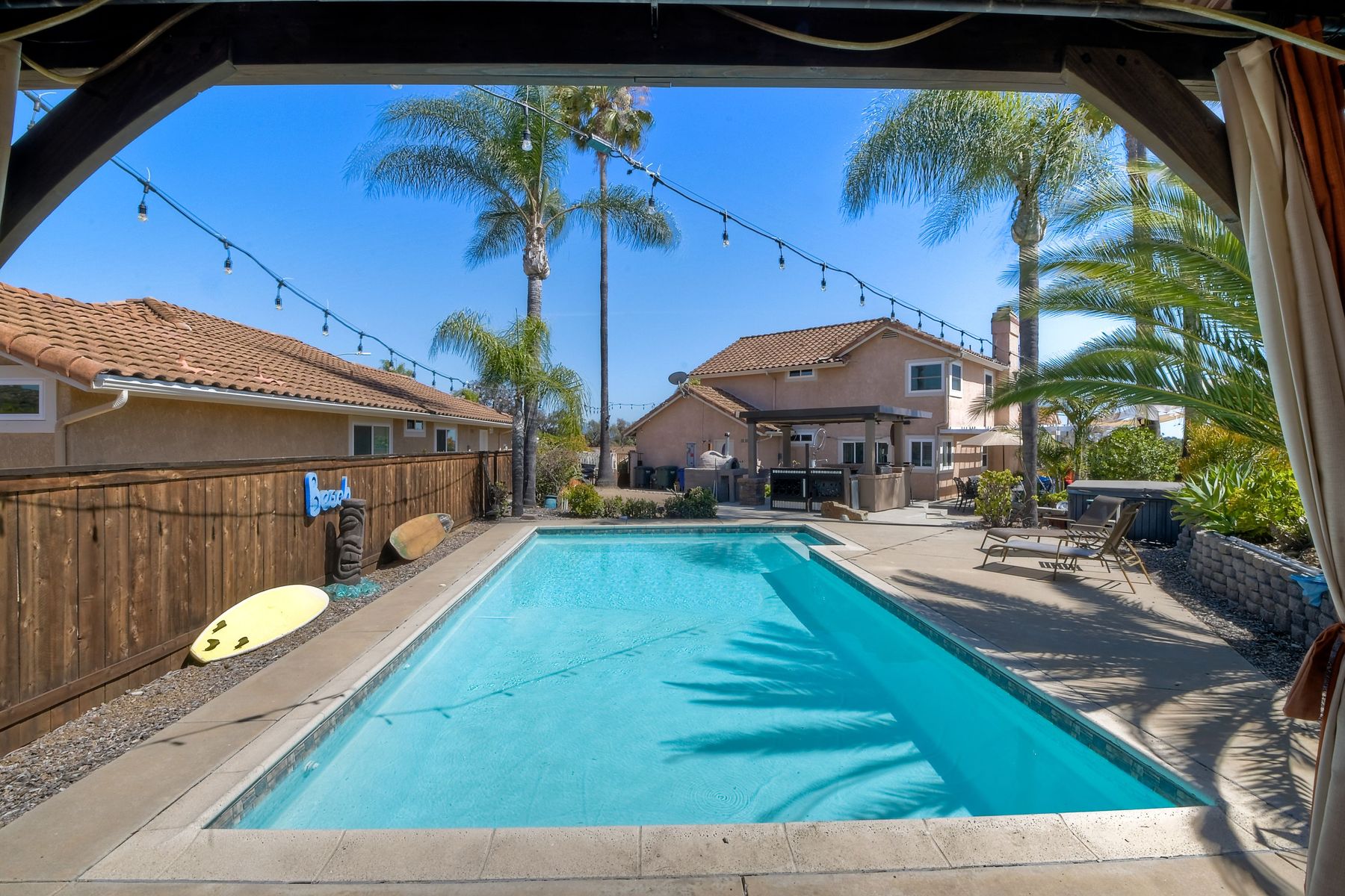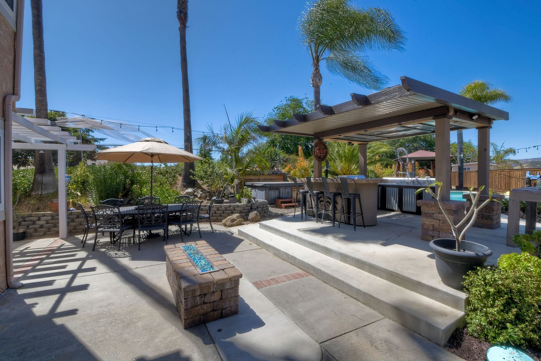 Spacious top-of-the-hill home in a desirable community. The location of this home is fantastic, it has views and is close to I-15, Shopping, Fire departments, parks, and easy access to Temecula, San Marcos, and town. As you enter this home feel welcomed by the spacious Living room/dining area with high ceilings thru-out. The family room is oversized with a cozy fireplace and convenient access to the kitchen. Downstairs you have a bedroom and bath with 3 more spacious bedrooms and a full, upgraded bath upstairs. The Master bedroom suite is extra spacious with a dressing area, tub, and tons of storage. This home boasts A paid solar system, and a resort backyard with many amenities such as: Pizza oven, firepit, gas cooking kitchen, 2 tap kegerator, dual sinks, pool, and jacuzzi. The lounging area is wired for a sound system and the whole backyard area has an automated sprinkler system. Think of the family and friends that will enjoy this backyard and the memories that you will make.