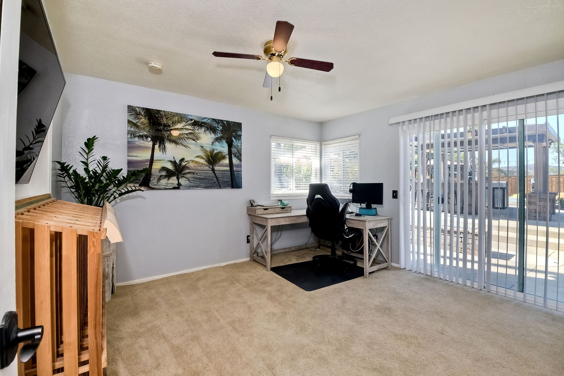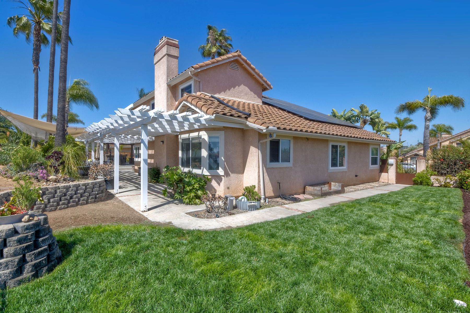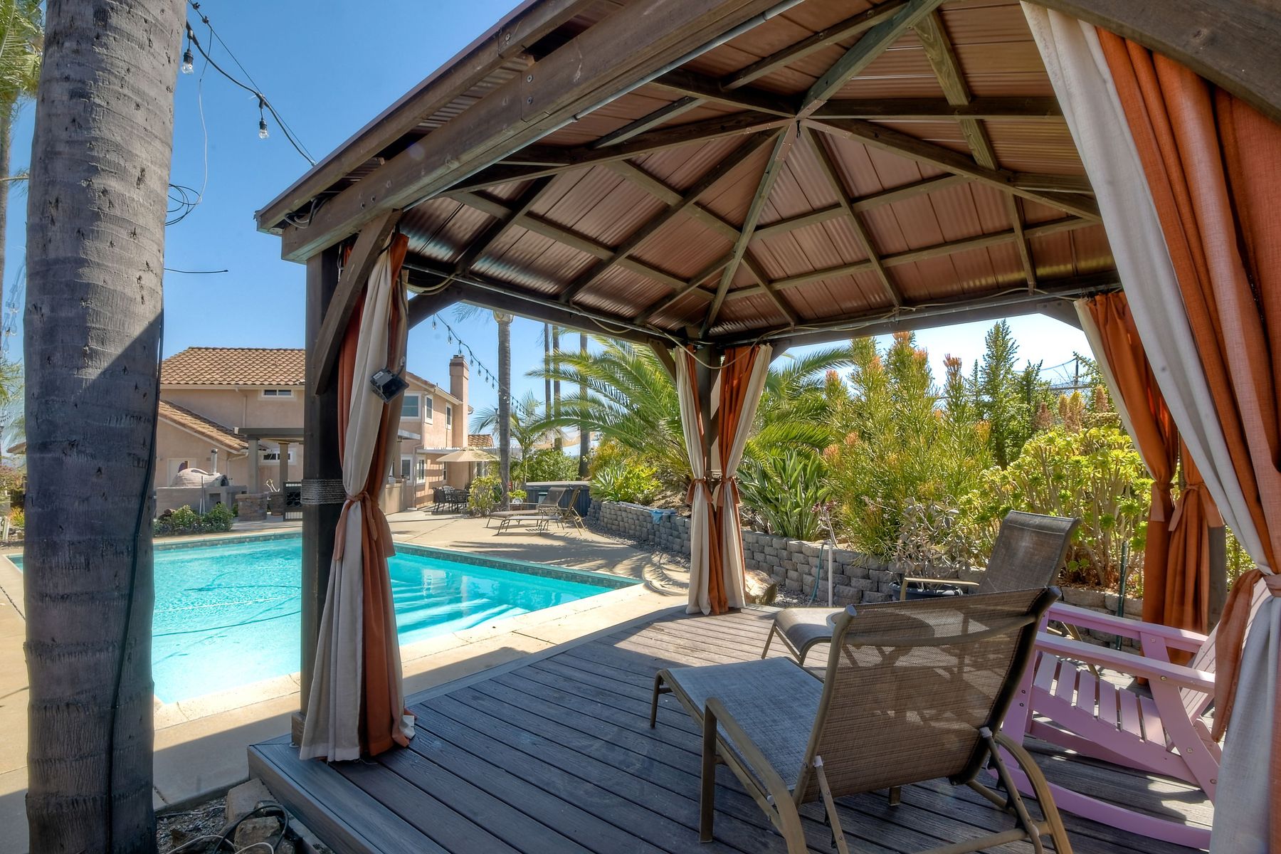 Spacious top-of-the-hill home in a desirable community. The location of this home is fantastic, it has views and is close to I-15, Shopping, Fire departments, parks, and easy access to Temecula, San Marcos, and town. As you enter this home feel welcomed by the spacious Living room/dining area with high ceilings thru-out. The family room is oversized with a cozy fireplace and convenient access to the kitchen. Downstairs you have a bedroom and bath with 3 more spacious bedrooms and a full, upgraded bath upstairs. The Master bedroom suite is extra spacious with a dressing area, tub, and tons of storage. This home boasts A paid solar system, and a resort backyard with many amenities such as: Pizza oven, firepit, gas cooking kitchen, 2 tap kegerator, dual sinks, pool, and jacuzzi. The lounging area is wired for a sound system and the whole backyard area has an automated sprinkler system. Think of the family and friends that will enjoy this backyard and the memories that you will make.