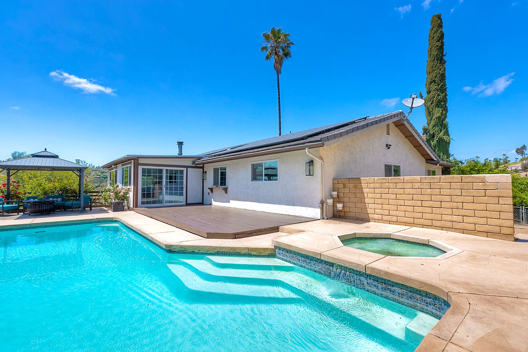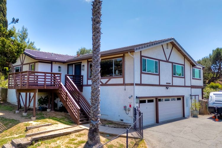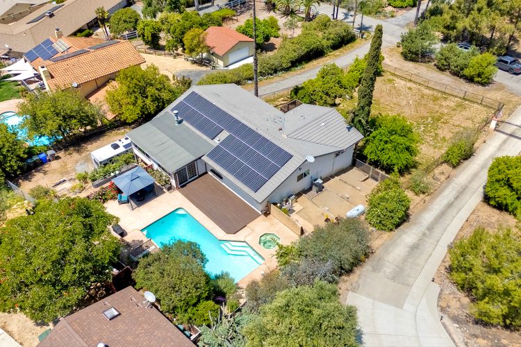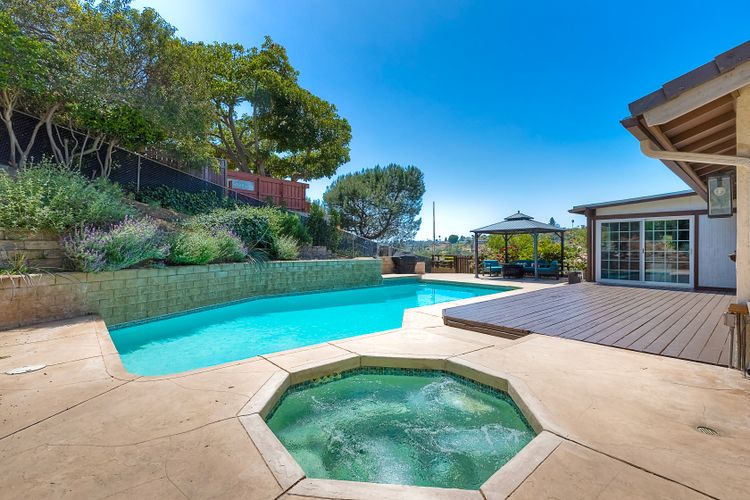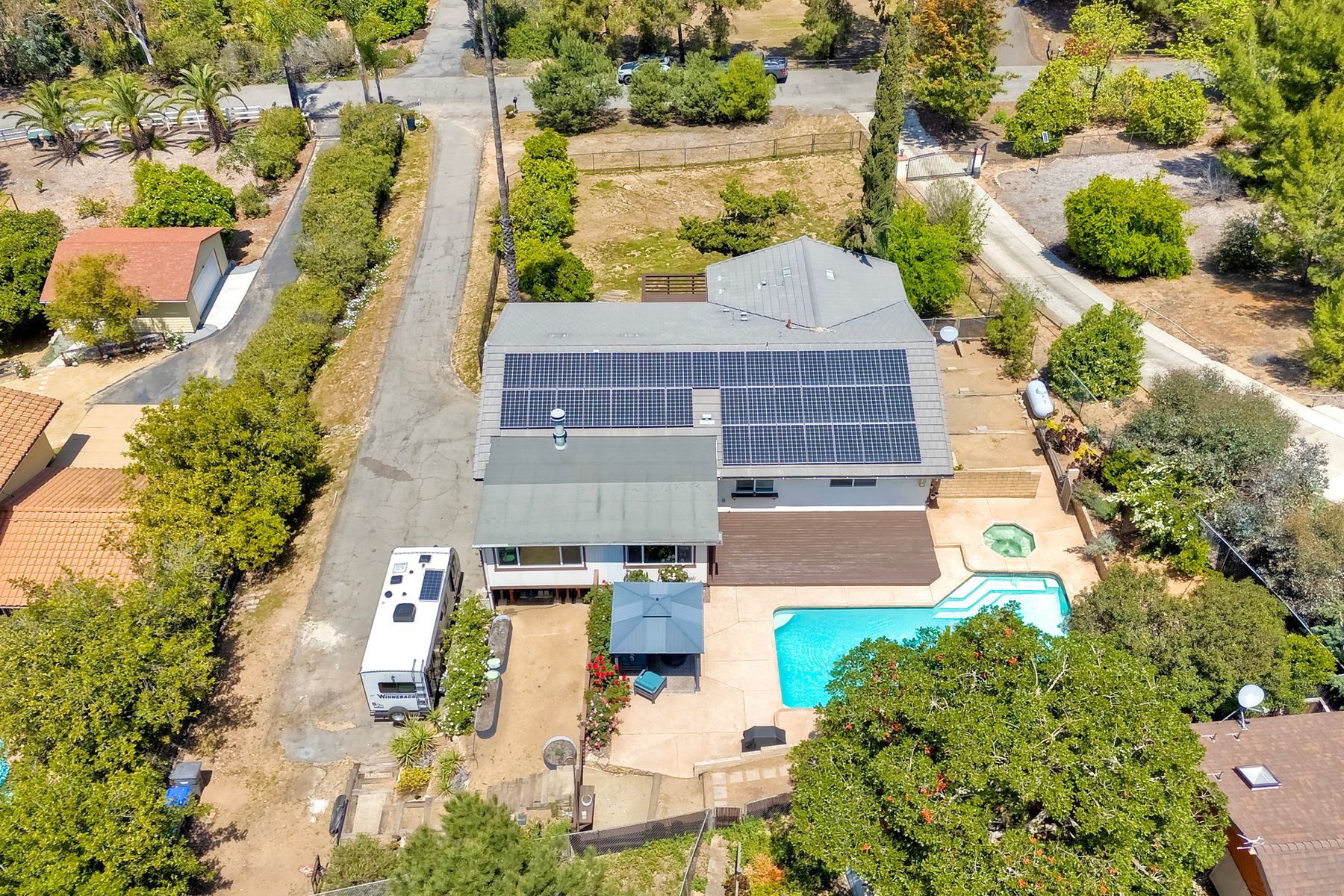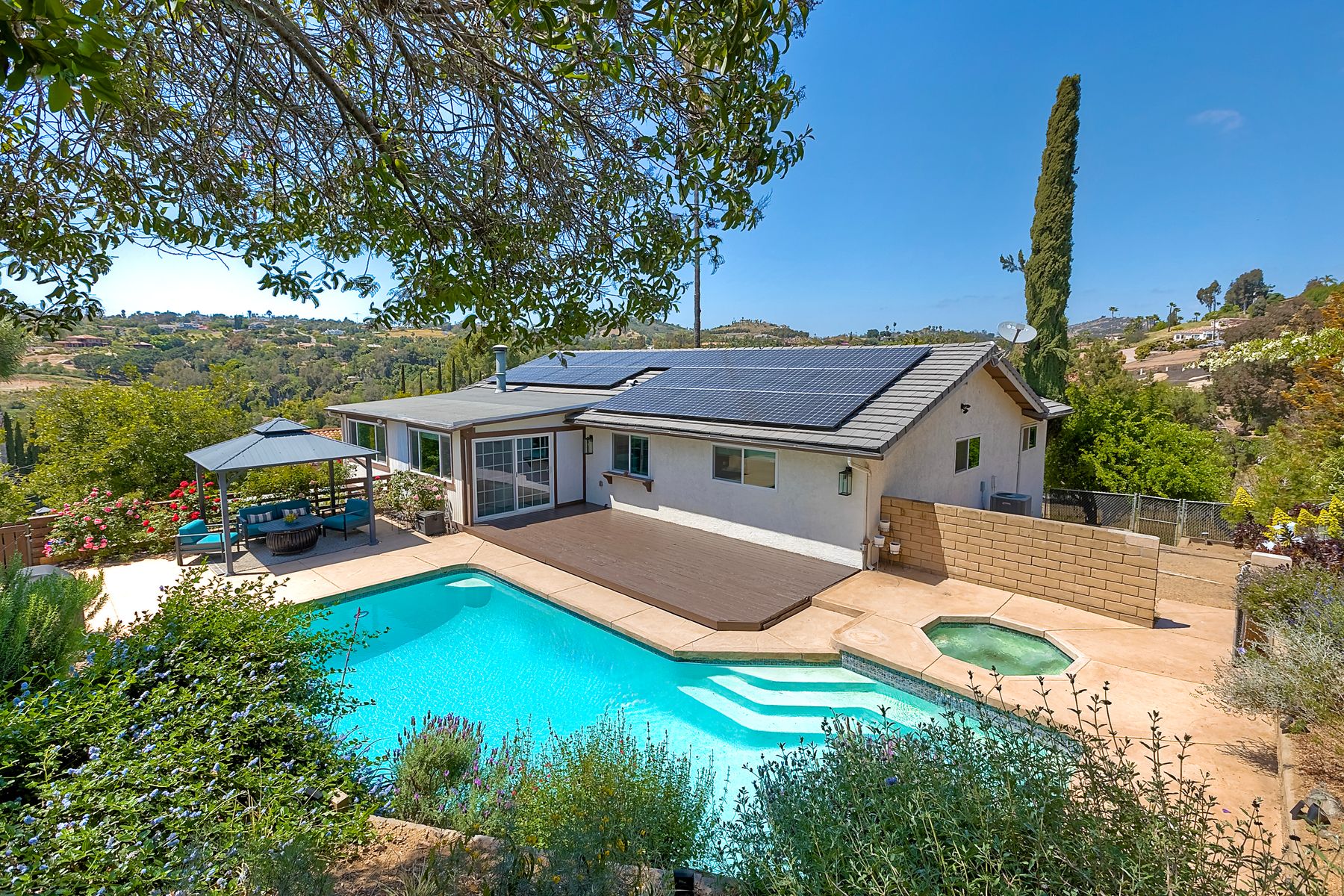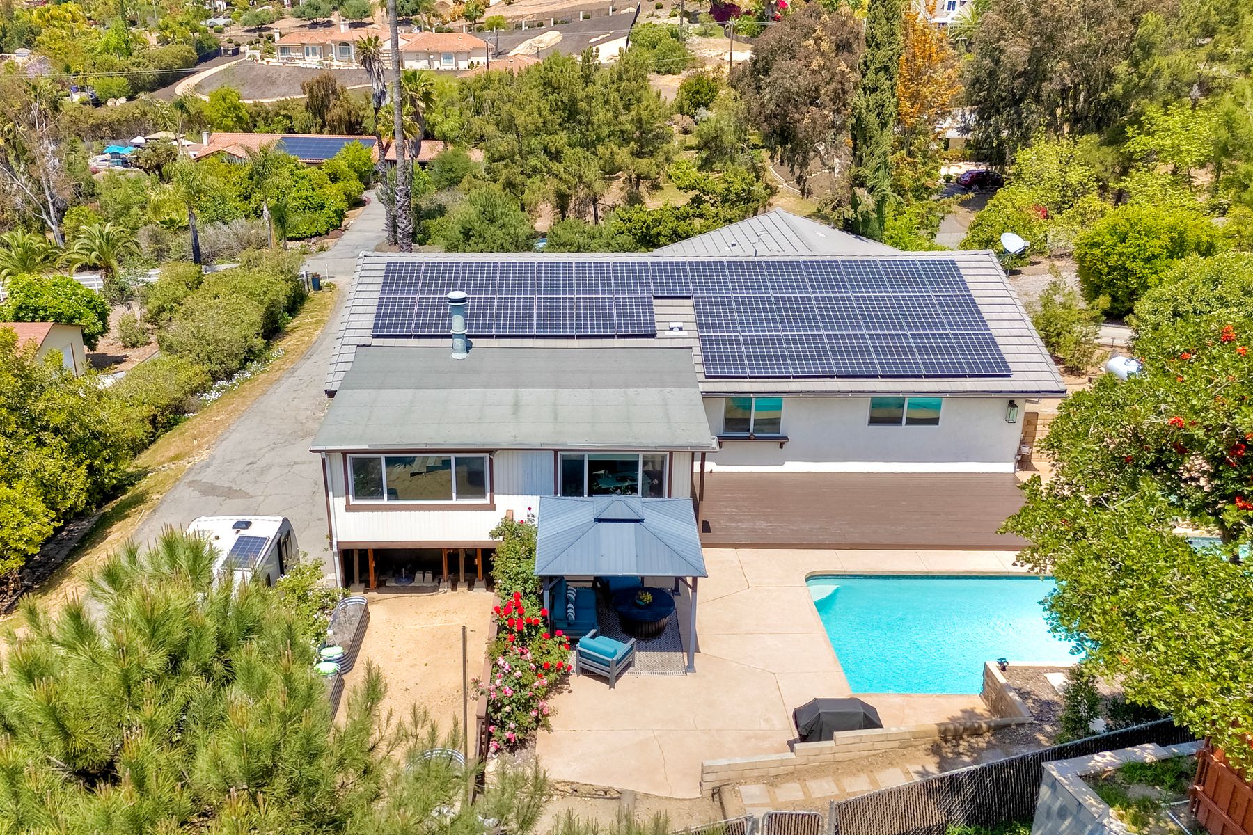 Breathtaking Views and Modern Comfort in San Pasqual Valley! Welcome to this stunning solar owned 5-bedroom, 3-bathroom home perched above the picturesque San Pasqual Valley in Escondido. Nestled on a spacious half-acre lot, this elevated property offers single story living, privacy, serenity and panoramic views that will take your breath away. As you ascend the steps to the inviting second-story entry, you’re greeted by a generous front deck—perfect for morning coffee or sunset gatherings—overlooking a lush, fully fenced yard with mature fruit trees. Inside, the light-filled great room boasts expansive windows, luxury vinyl plank flooring, and a cozy freestanding fireplace, all designed to highlight the incredible scenery and create a relaxing atmosphere. The heart of the home is the newly remodeled kitchen, featuring sleek stainless-steel appliances, crisp white cabinetry, abundant counter space and a large island with seating and extra storage. Whether you are entertaining or enjoying a quiet evening, this open-concept space is both functional and stylish. A versatile bonus room off the main living area makes an ideal home office, with sliding glass doors that open to a back deck, plus an adjacent bedroom for added flexibility. Retreat to the spacious primary suite, where soft, calming tones, dual barn door closets, and large windows create a peaceful haven. The private en-suite bath is beautifully designed for relaxation and convenience. Two additional bedrooms share a chic, updated bath with a double vanity and deep soaking tub/shower combo as well as a conveniently located laundry room. A private guest room, beautifully renovated full bath, and a mudroom with direct access to the 3-car garage and added storage complete the interior. Step outside and enjoy your own backyard paradise—complete with a sparkling pool and jacuzzi, expansive entertaining deck, cozy gazebo, and stunning landscaping framed by a charming brick retaining wall. And of course, the view... Simply incredible! Owned Solar! Additional features include RV parking with full water and power hookups, ample driveway space, and a long list of thoughtful upgrades—available upon request. Don’t miss this rare opportunity to own a slice of San Pasqual Valley paradise!