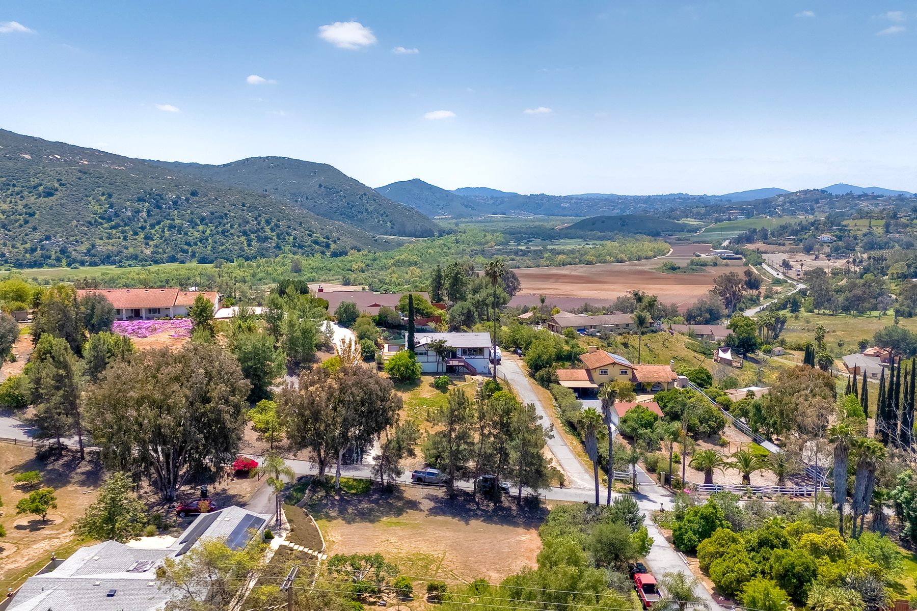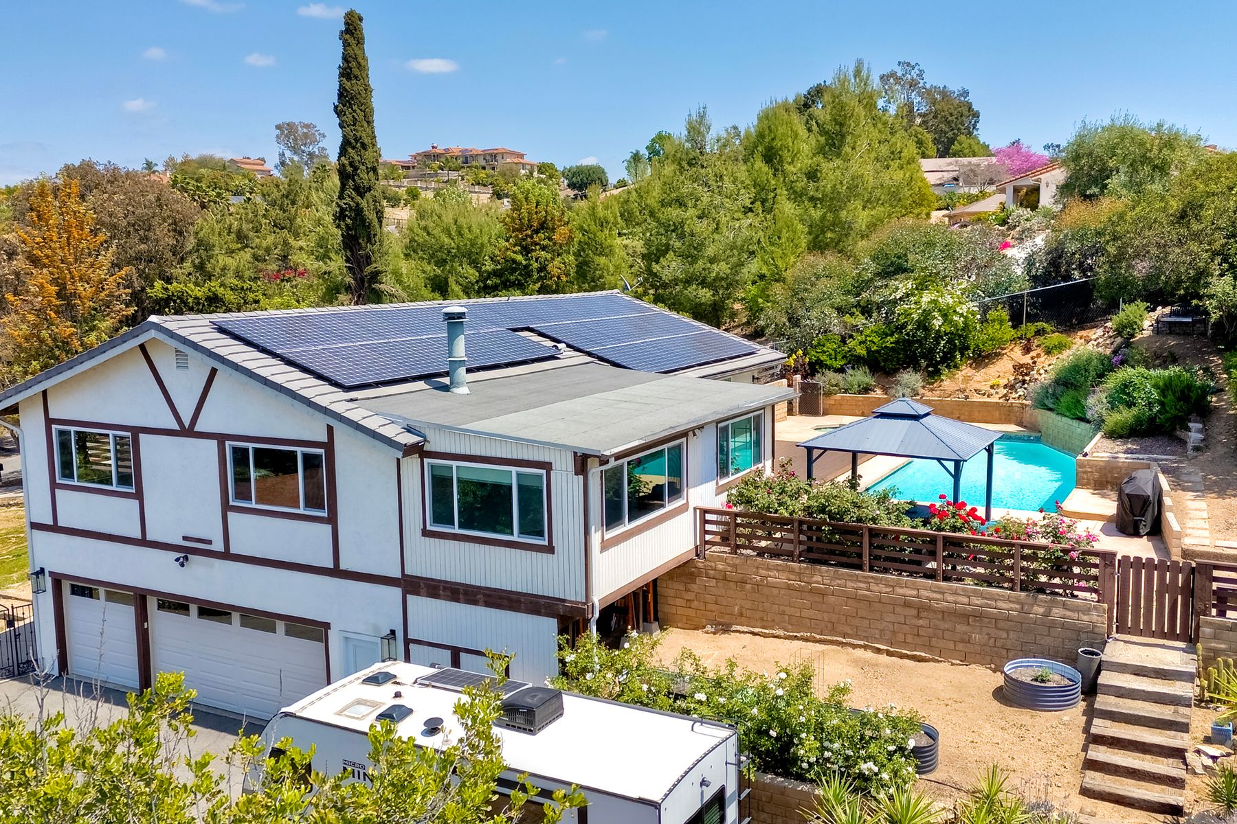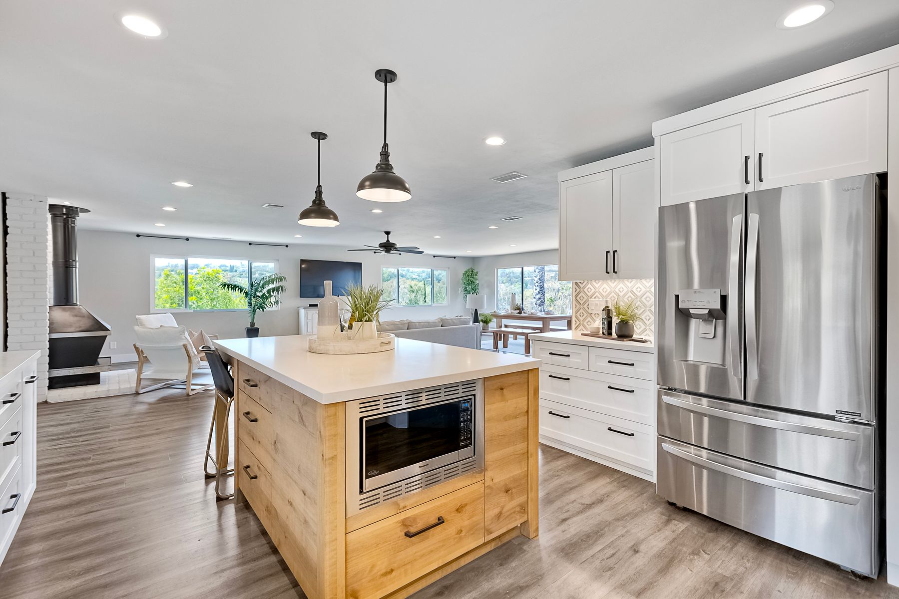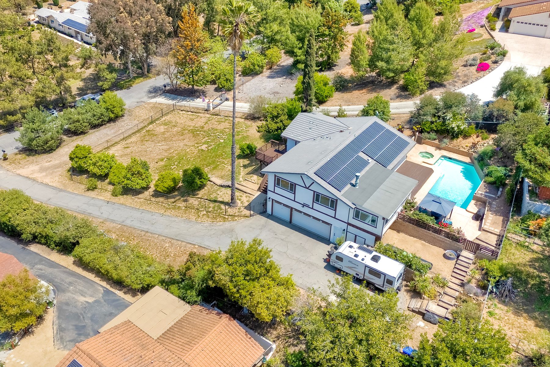 Breathtaking Views and Modern Comfort in San Pasqual Valley! Welcome to this stunning solar owned 5-bedroom, 3-bathroom home perched above the picturesque San Pasqual Valley in Escondido. Nestled on a spacious half-acre lot, this elevated property offers single story living, privacy, serenity and panoramic views that will take your breath away. As you ascend the steps to the inviting second-story entry, you’re greeted by a generous front deck—perfect for morning coffee or sunset gatherings—overlooking a lush, fully fenced yard with mature fruit trees. Inside, the light-filled great room boasts expansive windows, luxury vinyl plank flooring, and a cozy freestanding fireplace, all designed to highlight the incredible scenery and create a relaxing atmosphere. The heart of the home is the newly remodeled kitchen, featuring sleek stainless-steel appliances, crisp white cabinetry, abundant counter space and a large island with seating and extra storage. Whether you are entertaining or enjoying a quiet evening, this open-concept space is both functional and stylish. A versatile bonus room off the main living area makes an ideal home office, with sliding glass doors that open to a back deck, plus an adjacent bedroom for added flexibility. Retreat to the spacious primary suite, where soft, calming tones, dual barn door closets, and large windows create a peaceful haven. The private en-suite bath is beautifully designed for relaxation and convenience. Two additional bedrooms share a chic, updated bath with a double vanity and deep soaking tub/shower combo as well as a conveniently located laundry room. A private guest room, beautifully renovated full bath, and a mudroom with direct access to the 3-car garage and added storage complete the interior. Step outside and enjoy your own backyard paradise—complete with a sparkling pool and jacuzzi, expansive entertaining deck, cozy gazebo, and stunning landscaping framed by a charming brick retaining wall. And of course, the view... Simply incredible! Owned Solar! Additional features include RV parking with full water and power hookups, ample driveway space, and a long list of thoughtful upgrades—available upon request. Don’t miss this rare opportunity to own a slice of San Pasqual Valley paradise!