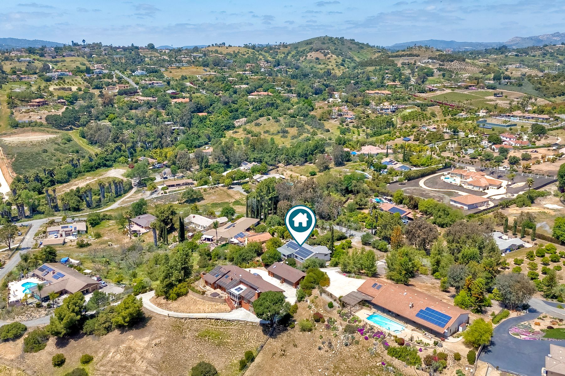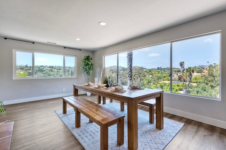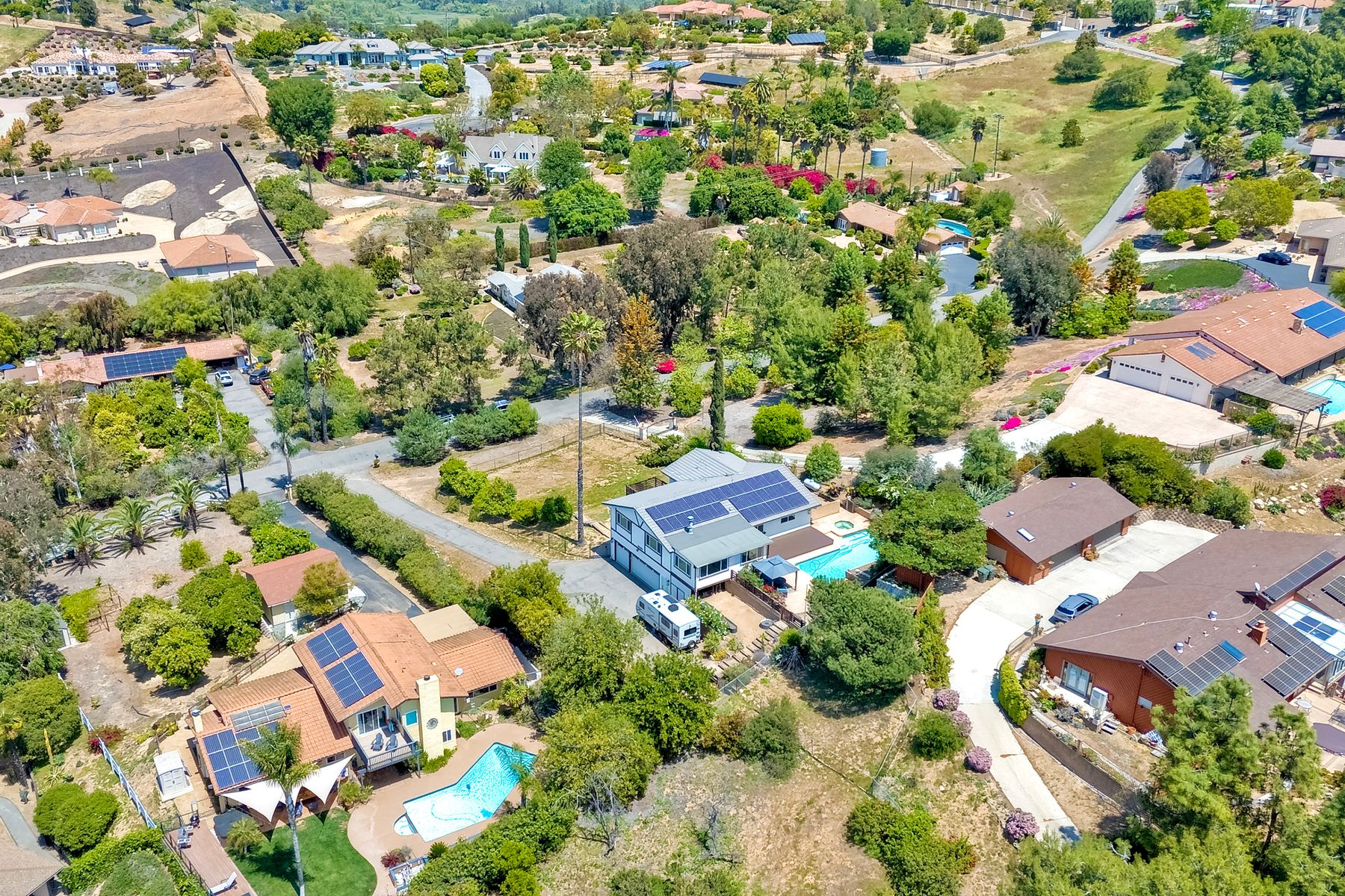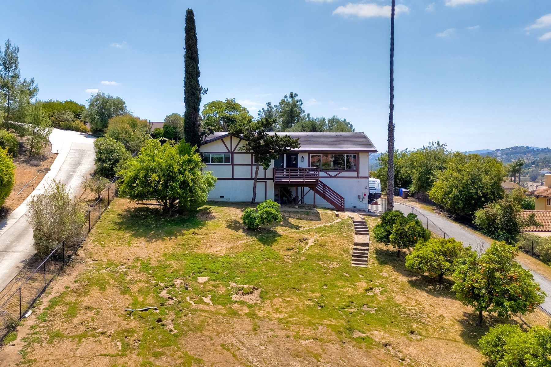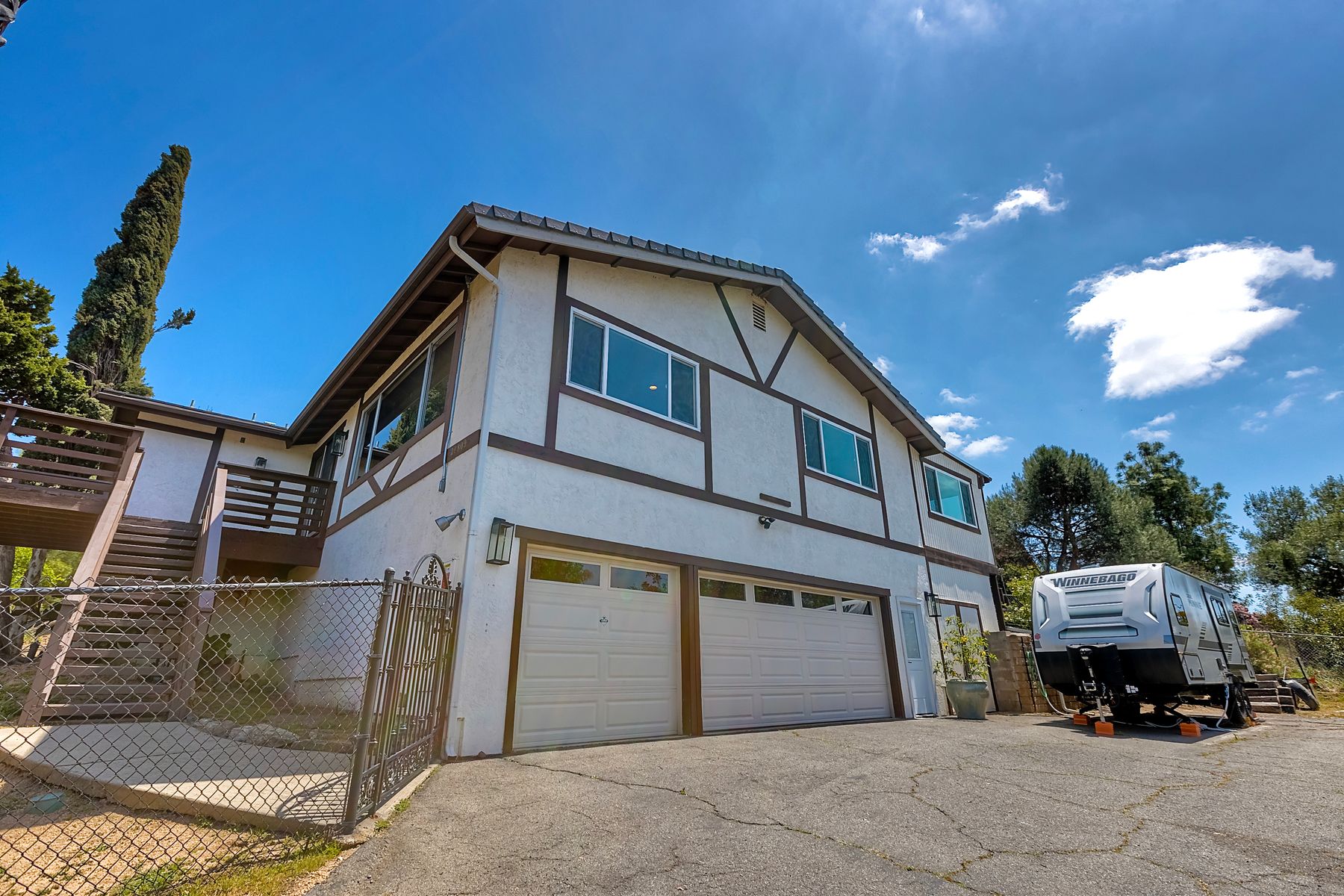 Breathtaking Views and Modern Comfort in San Pasqual Valley! Welcome to this stunning solar owned 5-bedroom, 3-bathroom home perched above the picturesque San Pasqual Valley in Escondido. Nestled on a spacious half-acre lot, this elevated property offers single story living, privacy, serenity and panoramic views that will take your breath away. As you ascend the steps to the inviting second-story entry, you’re greeted by a generous front deck—perfect for morning coffee or sunset gatherings—overlooking a lush, fully fenced yard with mature fruit trees. Inside, the light-filled great room boasts expansive windows, luxury vinyl plank flooring, and a cozy freestanding fireplace, all designed to highlight the incredible scenery and create a relaxing atmosphere. The heart of the home is the newly remodeled kitchen, featuring sleek stainless-steel appliances, crisp white cabinetry, abundant counter space and a large island with seating and extra storage. Whether you are entertaining or enjoying a quiet evening, this open-concept space is both functional and stylish. A versatile bonus room off the main living area makes an ideal home office, with sliding glass doors that open to a back deck, plus an adjacent bedroom for added flexibility. Retreat to the spacious primary suite, where soft, calming tones, dual barn door closets, and large windows create a peaceful haven. The private en-suite bath is beautifully designed for relaxation and convenience. Two additional bedrooms share a chic, updated bath with a double vanity and deep soaking tub/shower combo as well as a conveniently located laundry room. A private guest room, beautifully renovated full bath, and a mudroom with direct access to the 3-car garage and added storage complete the interior. Step outside and enjoy your own backyard paradise—complete with a sparkling pool and jacuzzi, expansive entertaining deck, cozy gazebo, and stunning landscaping framed by a charming brick retaining wall. And of course, the view... Simply incredible! Owned Solar! Additional features include RV parking with full water and power hookups, ample driveway space, and a long list of thoughtful upgrades—available upon request. Don’t miss this rare opportunity to own a slice of San Pasqual Valley paradise!
