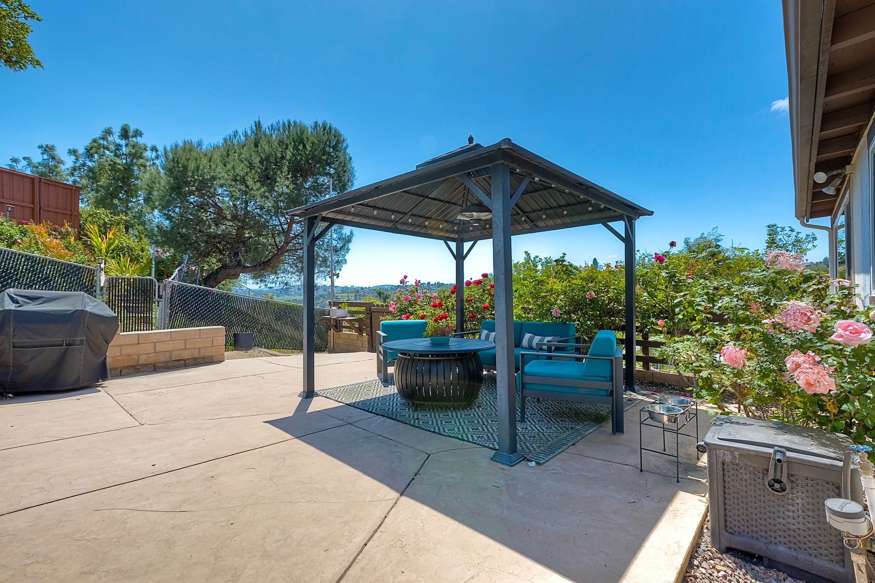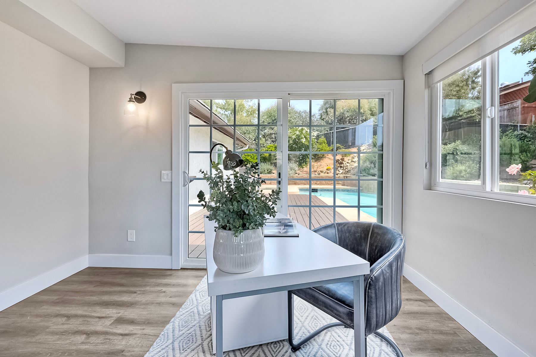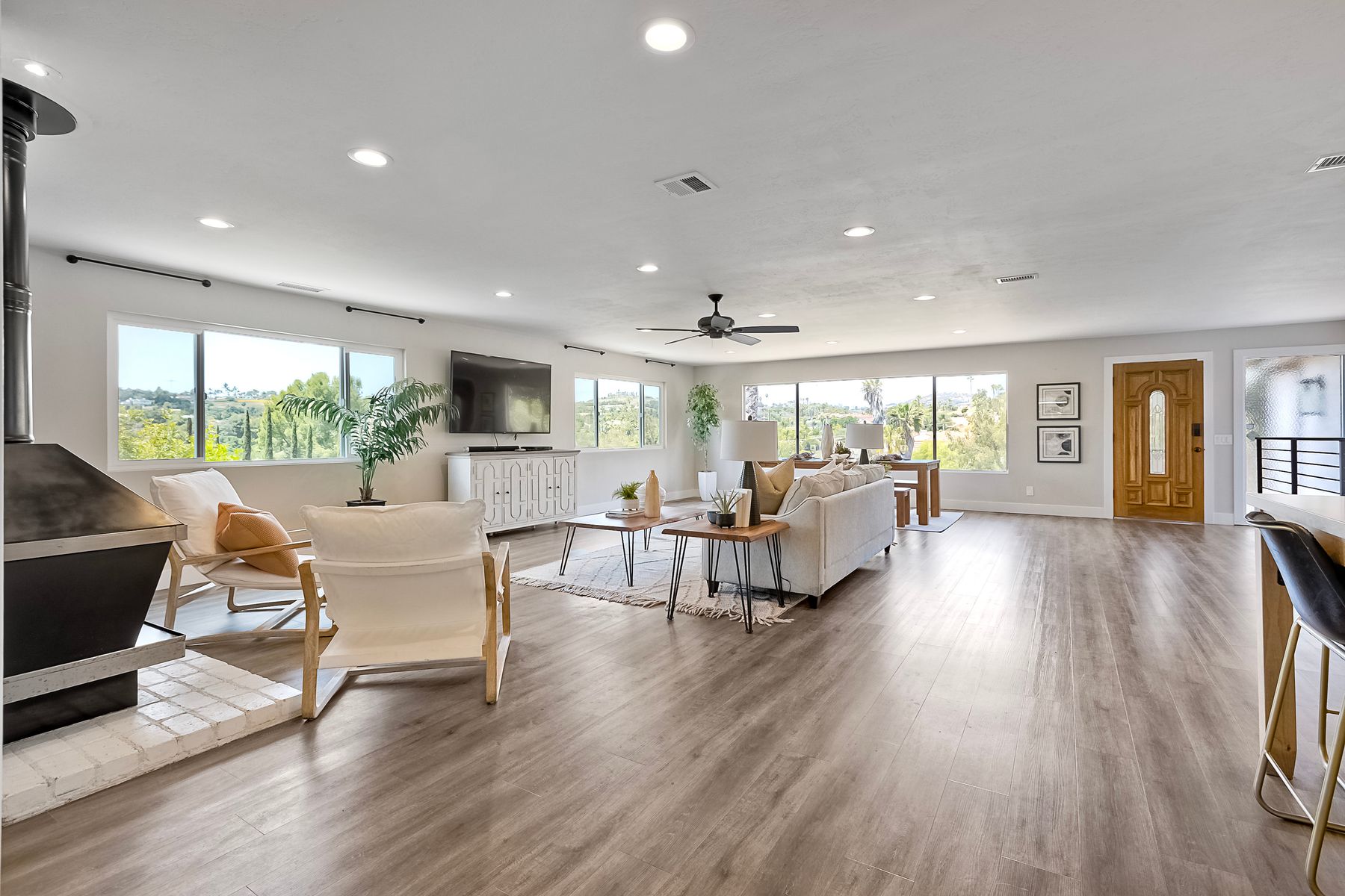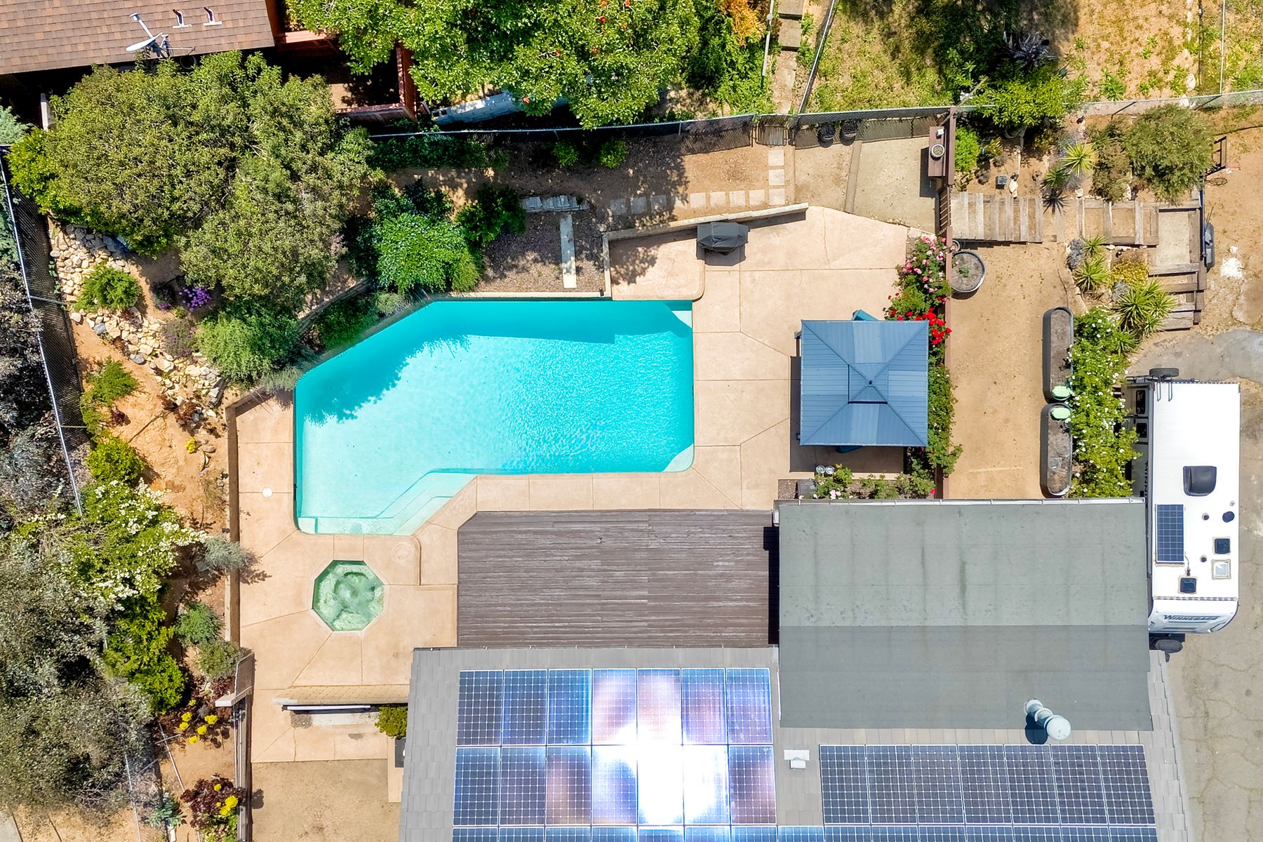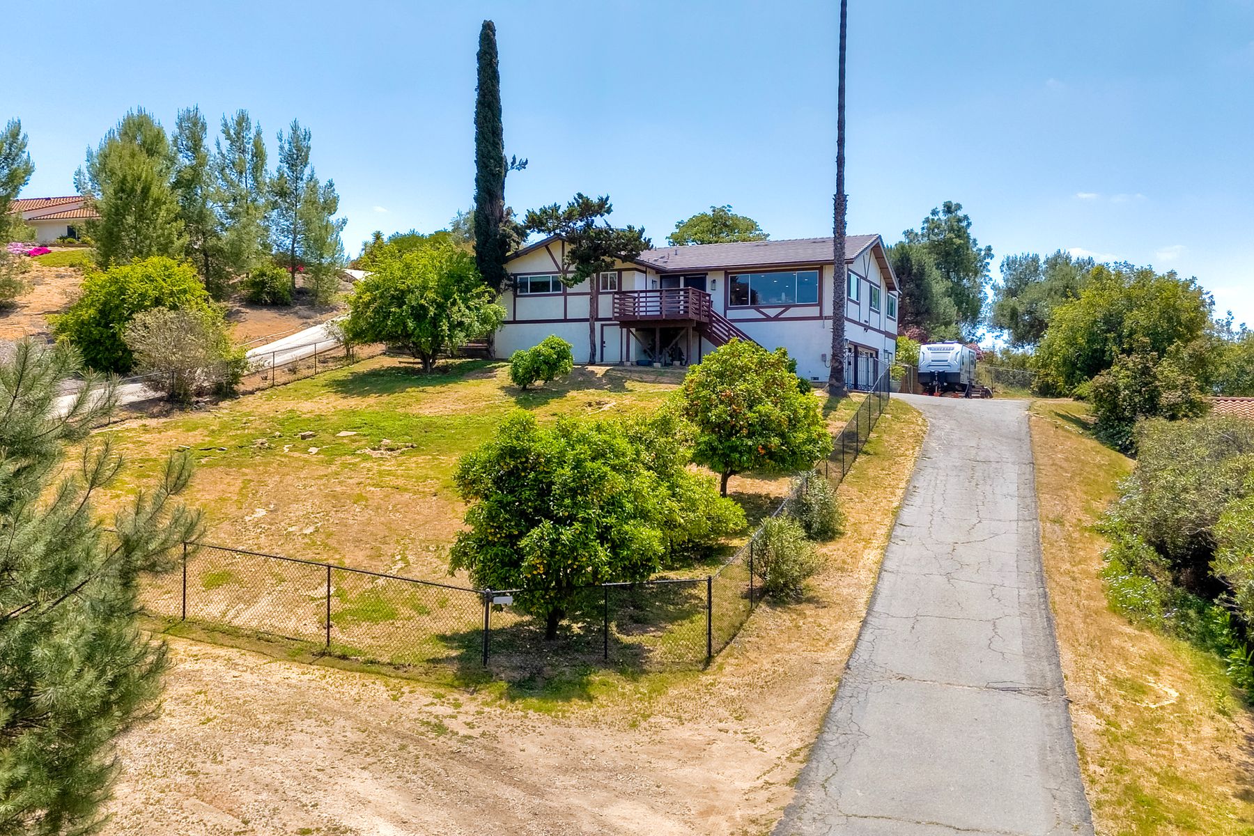 Breathtaking Views and Modern Comfort in San Pasqual Valley! Welcome to this stunning solar owned 5-bedroom, 3-bathroom home perched above the picturesque San Pasqual Valley in Escondido. Nestled on a spacious half-acre lot, this elevated property offers single story living, privacy, serenity and panoramic views that will take your breath away. As you ascend the steps to the inviting second-story entry, you’re greeted by a generous front deck—perfect for morning coffee or sunset gatherings—overlooking a lush, fully fenced yard with mature fruit trees. Inside, the light-filled great room boasts expansive windows, luxury vinyl plank flooring, and a cozy freestanding fireplace, all designed to highlight the incredible scenery and create a relaxing atmosphere. The heart of the home is the newly remodeled kitchen, featuring sleek stainless-steel appliances, crisp white cabinetry, abundant counter space and a large island with seating and extra storage. Whether you are entertaining or enjoying a quiet evening, this open-concept space is both functional and stylish. A versatile bonus room off the main living area makes an ideal home office, with sliding glass doors that open to a back deck, plus an adjacent bedroom for added flexibility. Retreat to the spacious primary suite, where soft, calming tones, dual barn door closets, and large windows create a peaceful haven. The private en-suite bath is beautifully designed for relaxation and convenience. Two additional bedrooms share a chic, updated bath with a double vanity and deep soaking tub/shower combo as well as a conveniently located laundry room. A private guest room, beautifully renovated full bath, and a mudroom with direct access to the 3-car garage and added storage complete the interior. Step outside and enjoy your own backyard paradise—complete with a sparkling pool and jacuzzi, expansive entertaining deck, cozy gazebo, and stunning landscaping framed by a charming brick retaining wall. And of course, the view... Simply incredible! Owned Solar! Additional features include RV parking with full water and power hookups, ample driveway space, and a long list of thoughtful upgrades—available upon request. Don’t miss this rare opportunity to own a slice of San Pasqual Valley paradise!