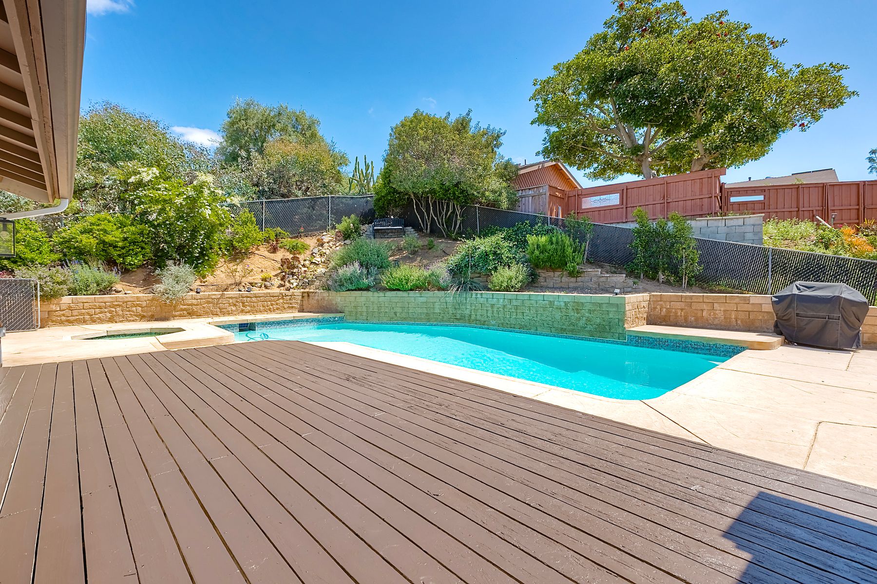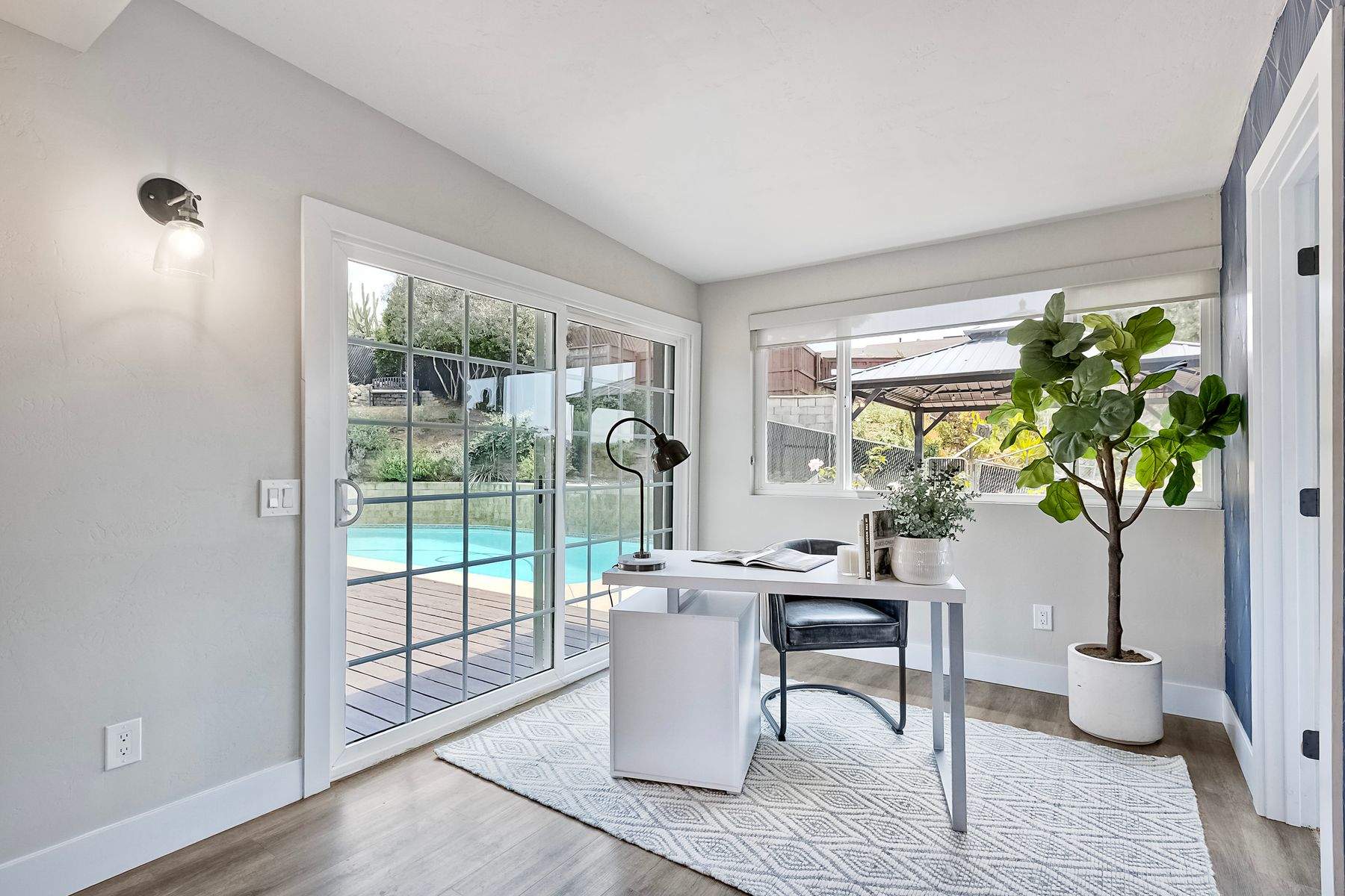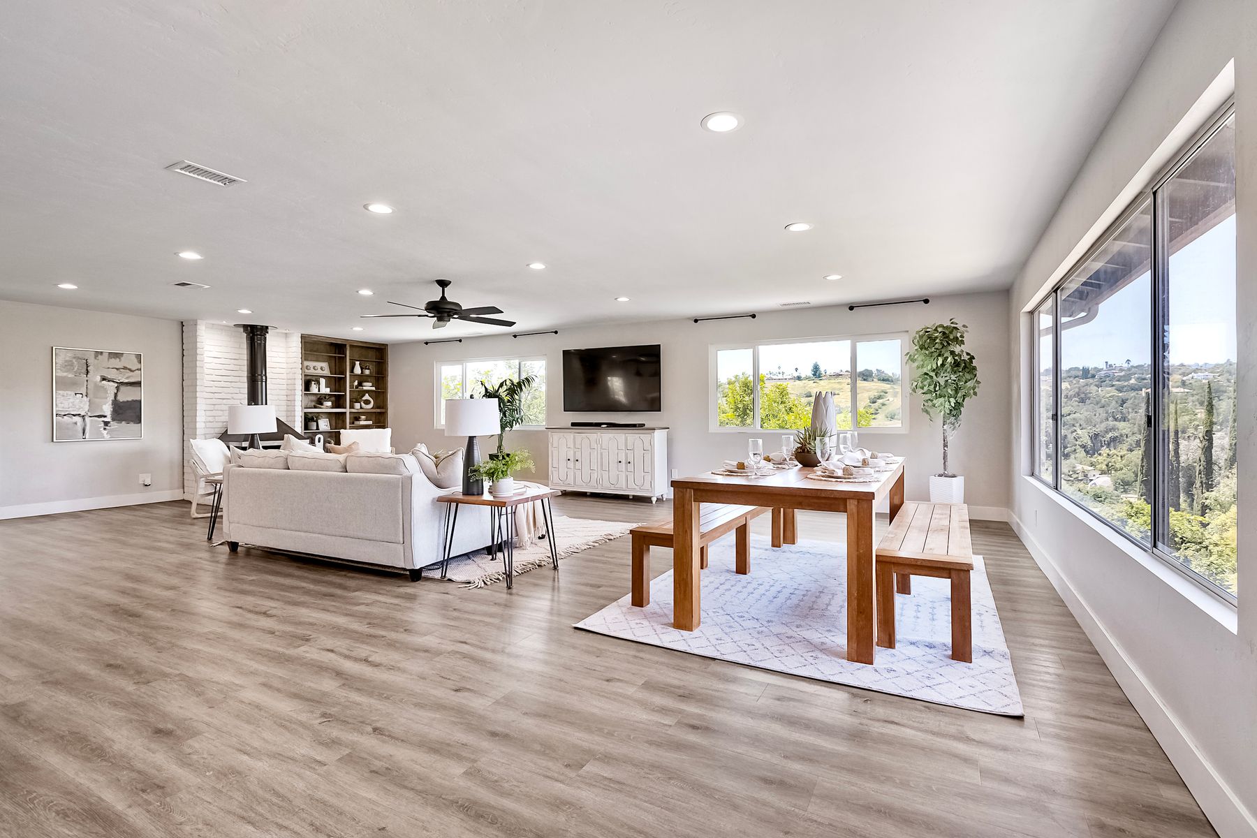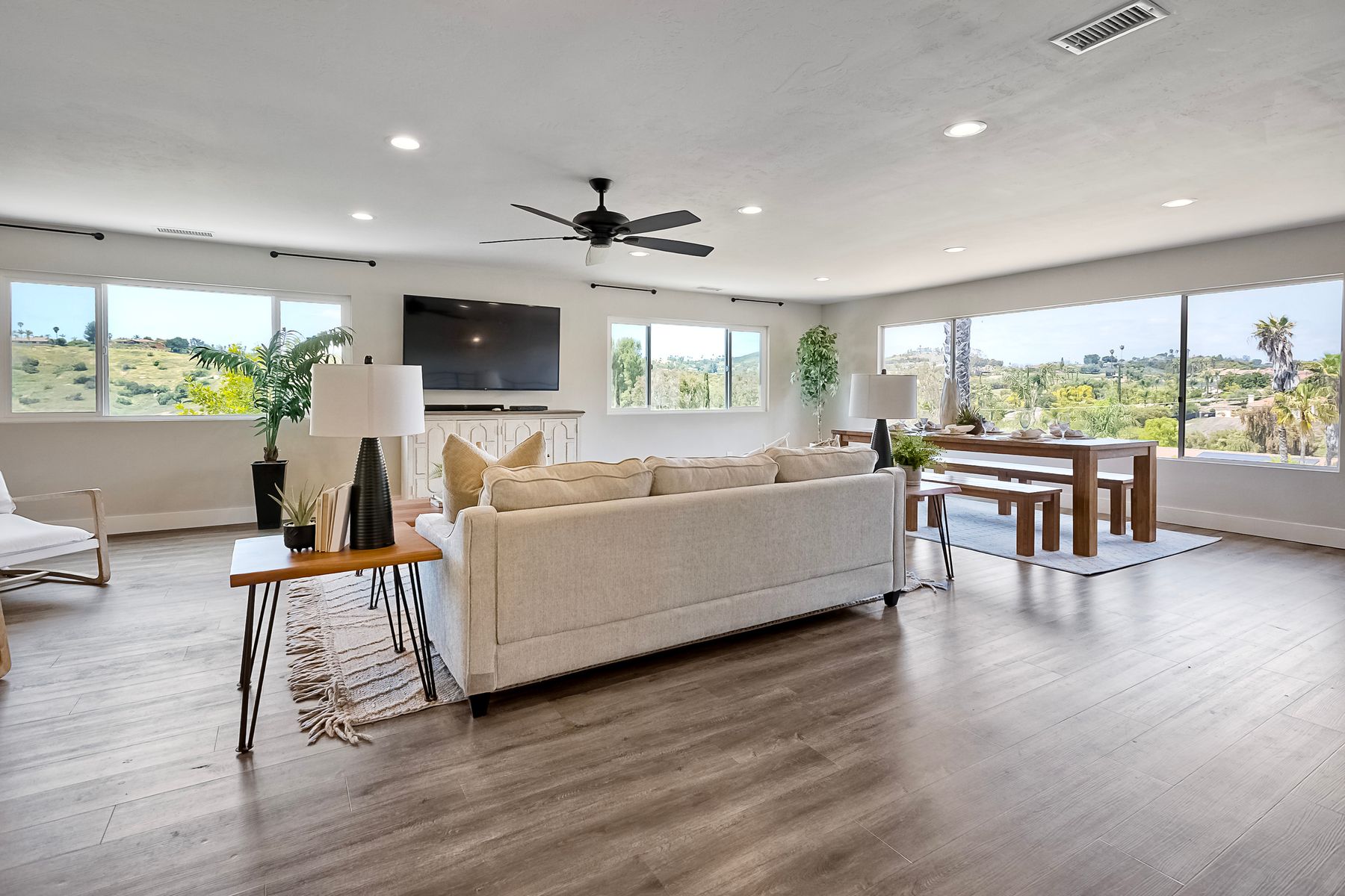 Breathtaking Views and Modern Comfort in San Pasqual Valley! Welcome to this stunning solar owned 5-bedroom, 3-bathroom home perched above the picturesque San Pasqual Valley in Escondido. Nestled on a spacious half-acre lot, this elevated property offers single story living, privacy, serenity and panoramic views that will take your breath away. As you ascend the steps to the inviting second-story entry, you’re greeted by a generous front deck—perfect for morning coffee or sunset gatherings—overlooking a lush, fully fenced yard with mature fruit trees. Inside, the light-filled great room boasts expansive windows, luxury vinyl plank flooring, and a cozy freestanding fireplace, all designed to highlight the incredible scenery and create a relaxing atmosphere. The heart of the home is the newly remodeled kitchen, featuring sleek stainless-steel appliances, crisp white cabinetry, abundant counter space and a large island with seating and extra storage. Whether you are entertaining or enjoying a quiet evening, this open-concept space is both functional and stylish. A versatile bonus room off the main living area makes an ideal home office, with sliding glass doors that open to a back deck, plus an adjacent bedroom for added flexibility. Retreat to the spacious primary suite, where soft, calming tones, dual barn door closets, and large windows create a peaceful haven. The private en-suite bath is beautifully designed for relaxation and convenience. Two additional bedrooms share a chic, updated bath with a double vanity and deep soaking tub/shower combo as well as a conveniently located laundry room. A private guest room, beautifully renovated full bath, and a mudroom with direct access to the 3-car garage and added storage complete the interior. Step outside and enjoy your own backyard paradise—complete with a sparkling pool and jacuzzi, expansive entertaining deck, cozy gazebo, and stunning landscaping framed by a charming brick retaining wall. And of course, the view... Simply incredible! Owned Solar! Additional features include RV parking with full water and power hookups, ample driveway space, and a long list of thoughtful upgrades—available upon request. Don’t miss this rare opportunity to own a slice of San Pasqual Valley paradise!