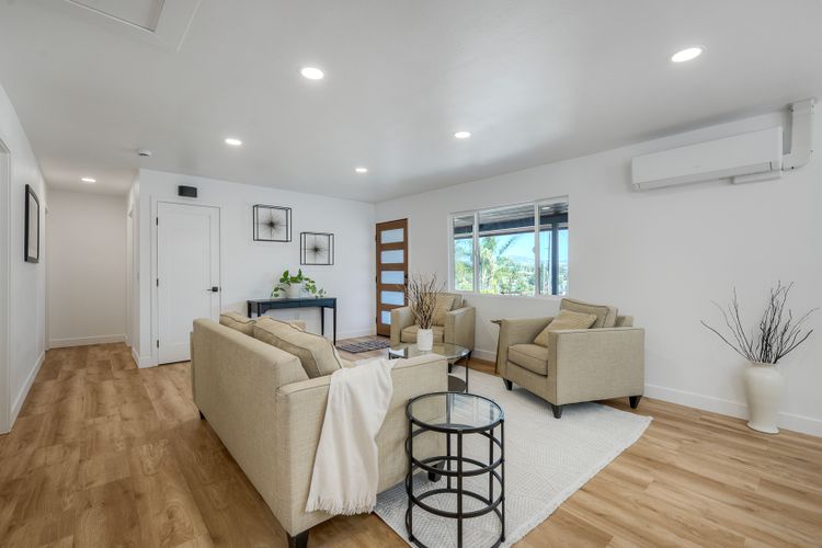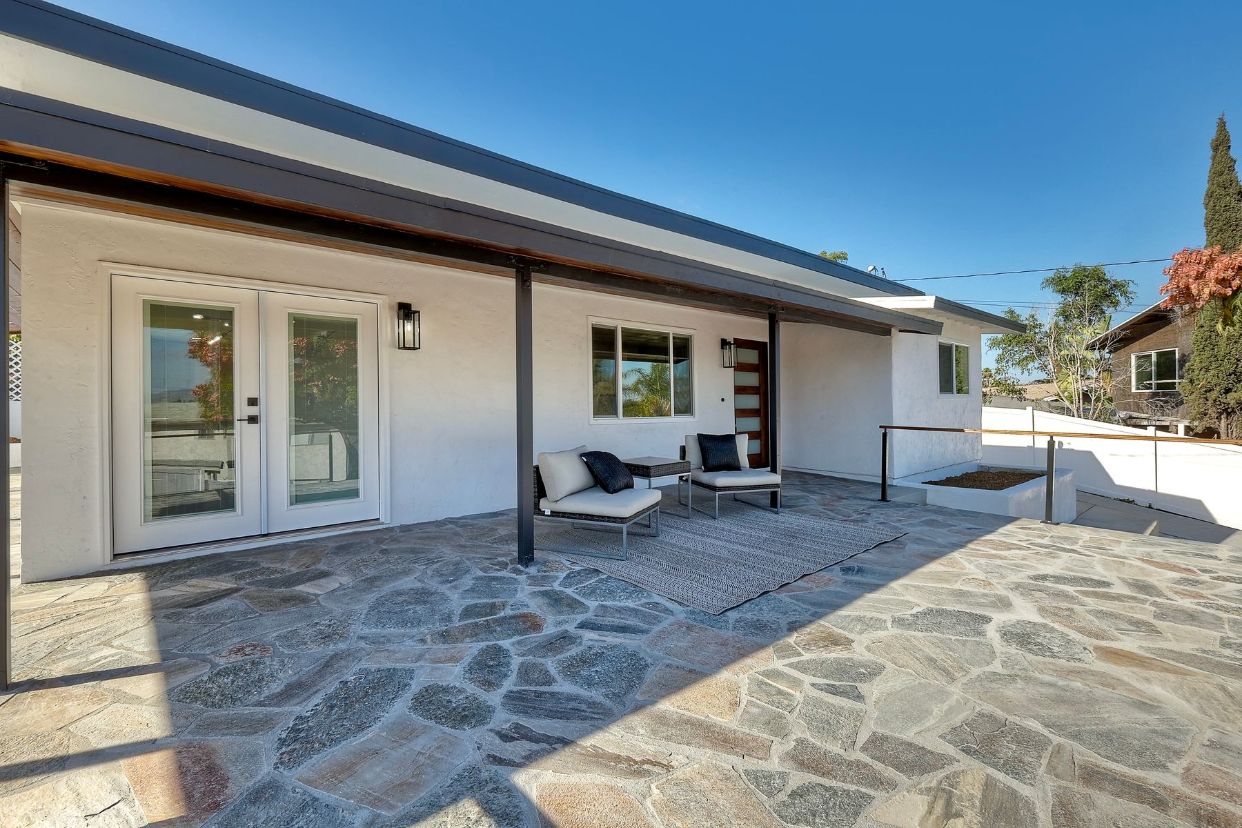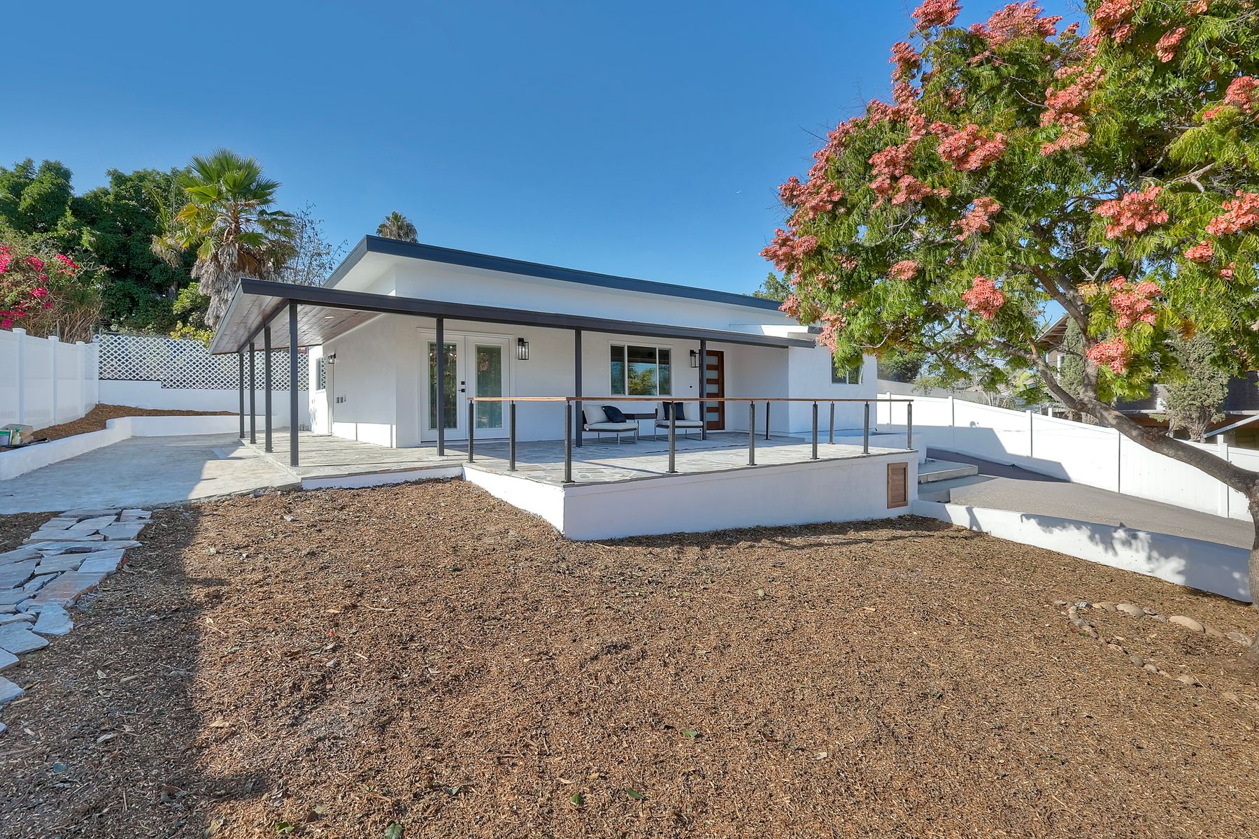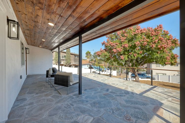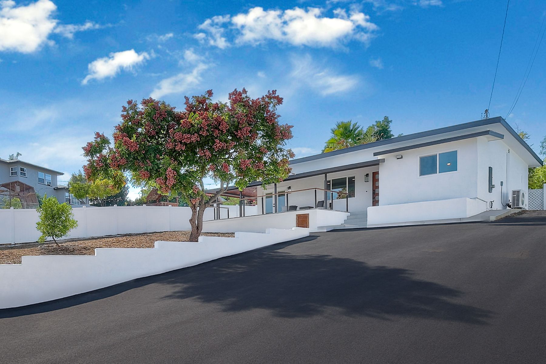 Discover this beautifully renovated, turnkey home where pride of ownership shines inside and out. Every detail has been updated—from new paint, trim, and doors to modern vinyl flooring and energy-efficient dual-pane windows. The open layout fills with natural light and flows into a stunning kitchen featuring quartz countertops, shaker cabinets, tile backsplash, and a full suite of new stainless steel appliances, including a slide-in range, built-in microwave, dishwasher, and refrigerator with water and ice. Both bathrooms offer floor-to-ceiling tile, new vanities, mirrors, and bathtub with sliding glass enclosure. Each bedroom enjoys its own mini-split system for personalized comfort, plus wood-framed mirrored closet doors. Step outside to a massive flagstone patio perfect for entertaining or relaxing with panoramic city and mountain views. Located on a quiet street in the heart of Lemon Grove—just minutes to freeways, shopping, schools, and downtown San Diego—this property combines suburban tranquility with unbeatable convenience. The driveway and street are scheduled to be paved within the week. Pictures of the driveway have been digitally enhanced to show what the driveway will look like once completed.