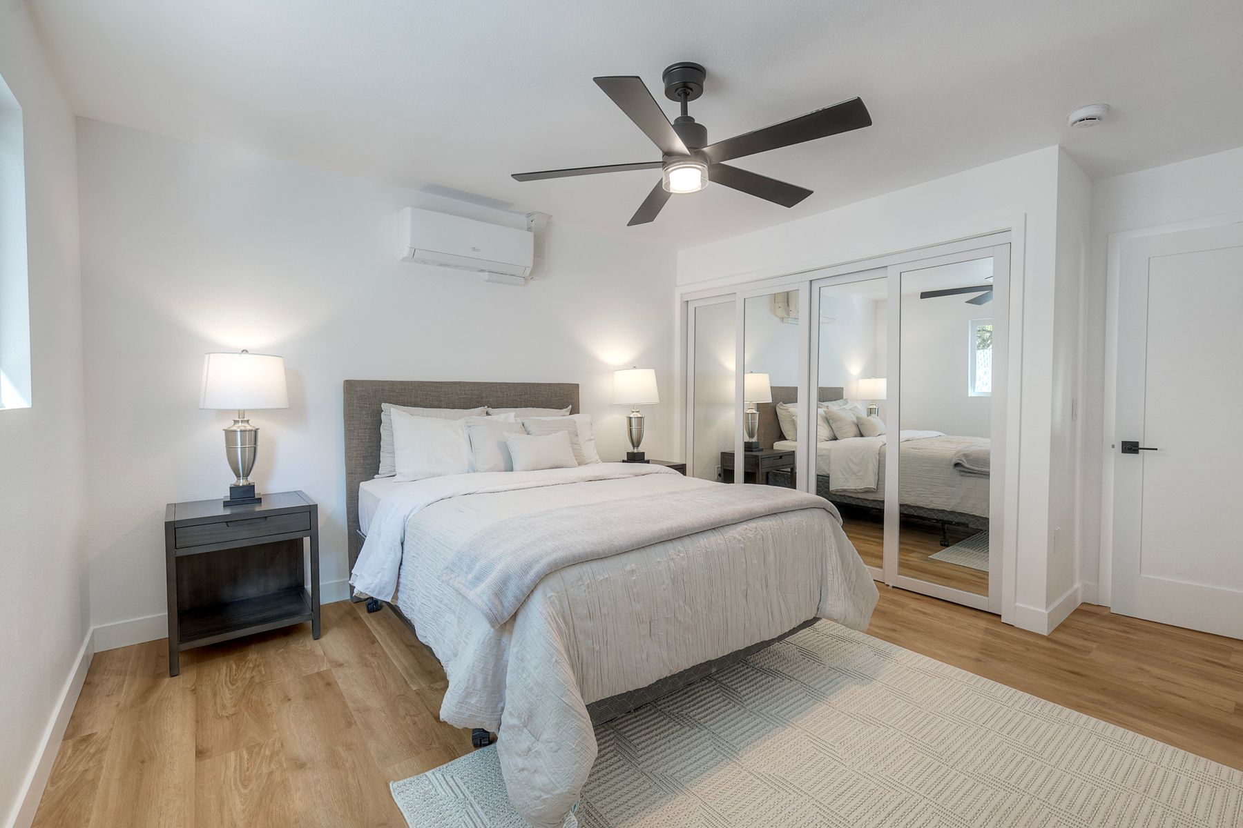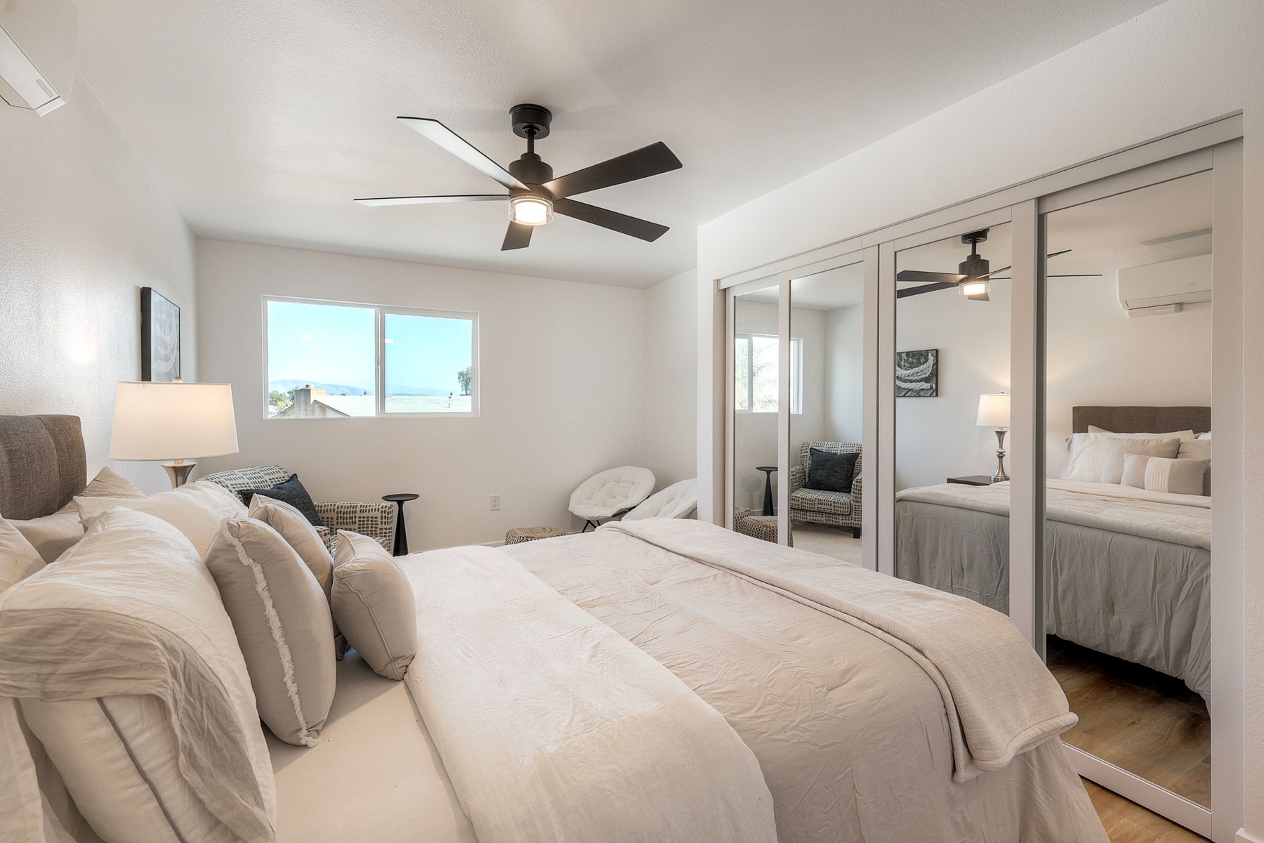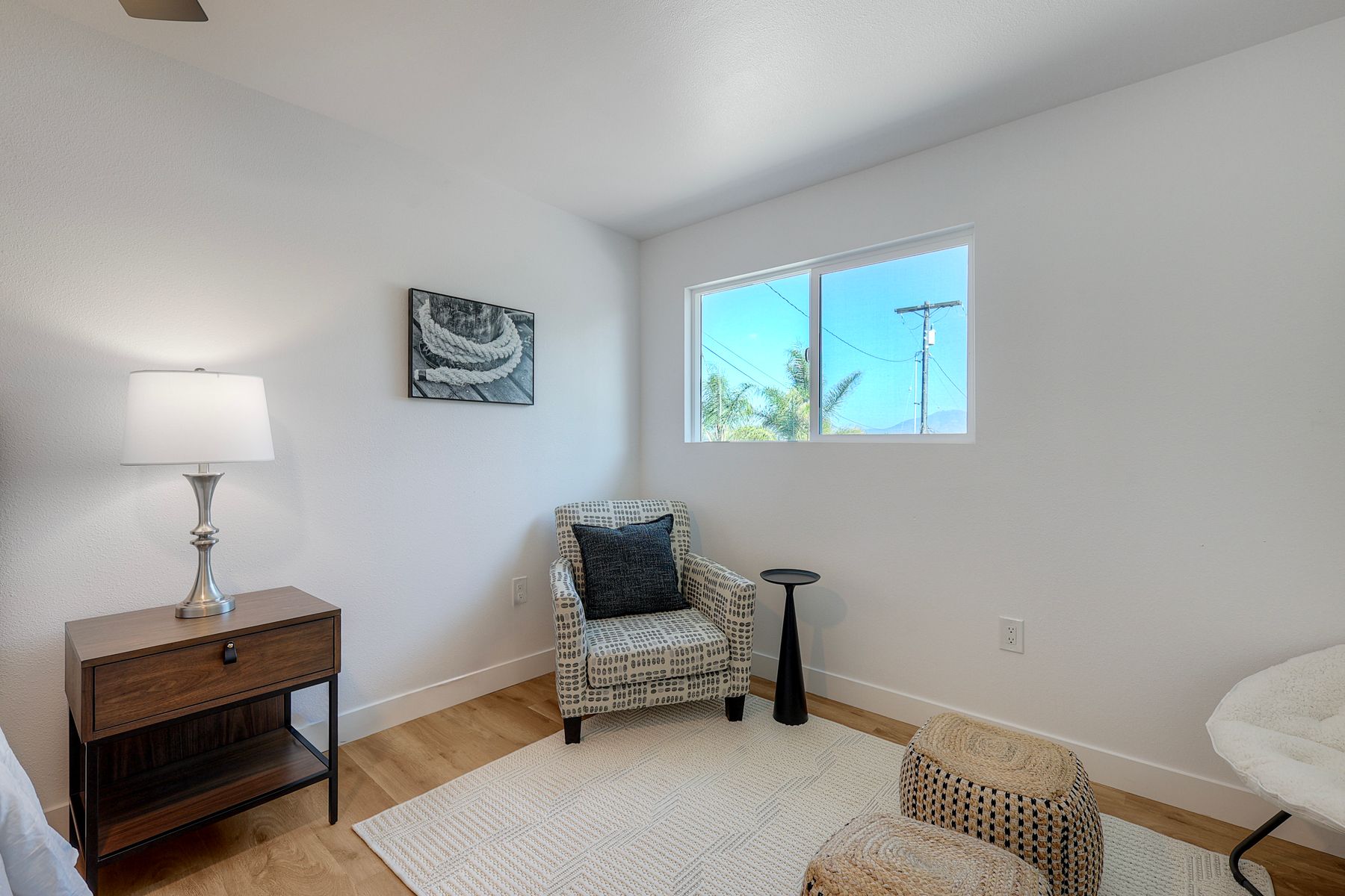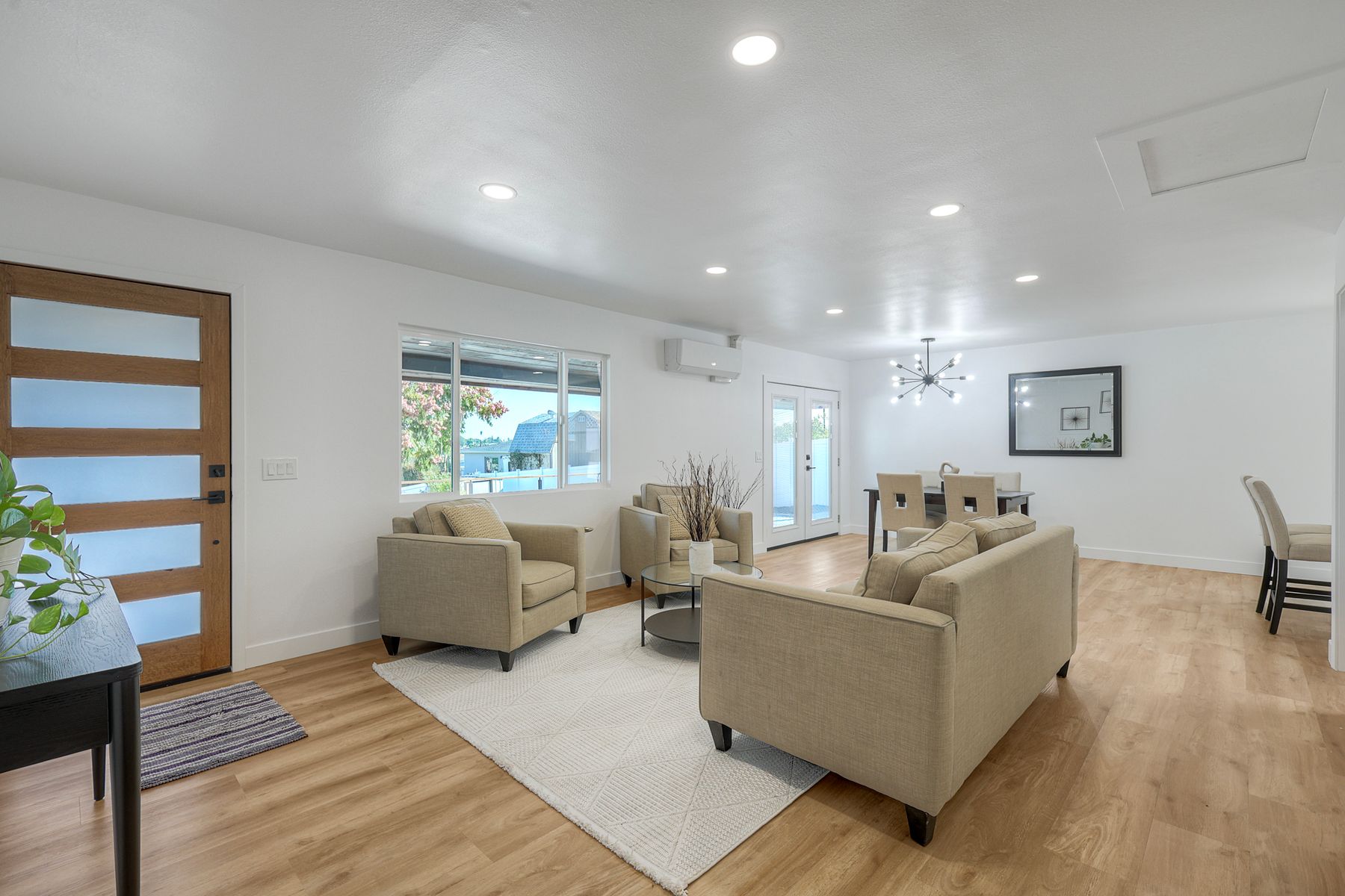 Discover this beautifully renovated, turnkey home where pride of ownership shines inside and out. Every detail has been updated—from new paint, trim, and doors to modern vinyl flooring and energy-efficient dual-pane windows. The open layout fills with natural light and flows into a stunning kitchen featuring quartz countertops, shaker cabinets, tile backsplash, and a full suite of new stainless steel appliances, including a slide-in range, built-in microwave, dishwasher, and refrigerator with water and ice. Both bathrooms offer floor-to-ceiling tile, new vanities, mirrors, and bathtub with sliding glass enclosure. Each bedroom enjoys its own mini-split system for personalized comfort, plus wood-framed mirrored closet doors. Step outside to a massive flagstone patio perfect for entertaining or relaxing with panoramic city and mountain views. Located on a quiet street in the heart of Lemon Grove—just minutes to freeways, shopping, schools, and downtown San Diego—this property combines suburban tranquility with unbeatable convenience. The driveway and street are scheduled to be paved within the week. Pictures of the driveway have been digitally enhanced to show what the driveway will look like once completed.