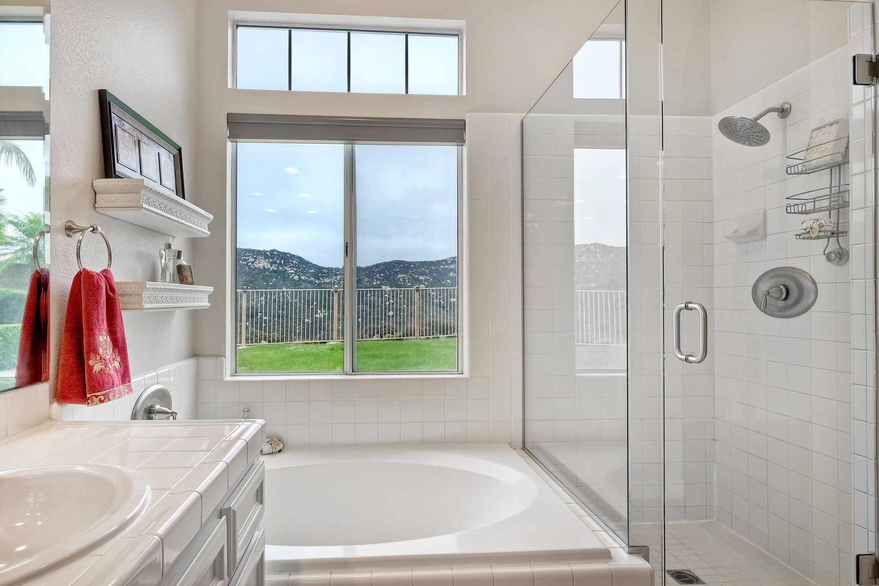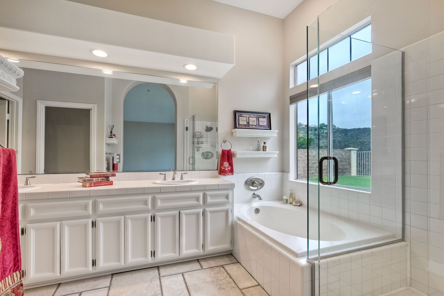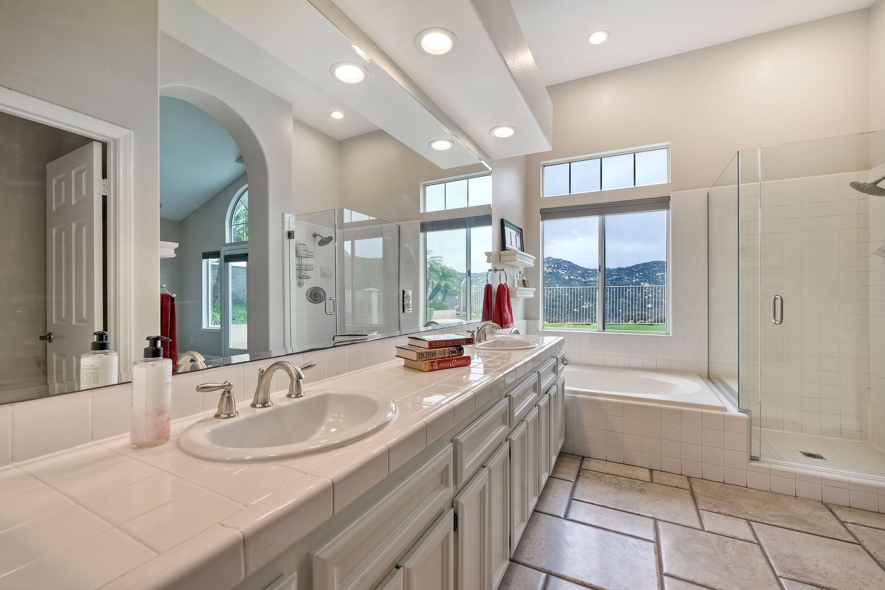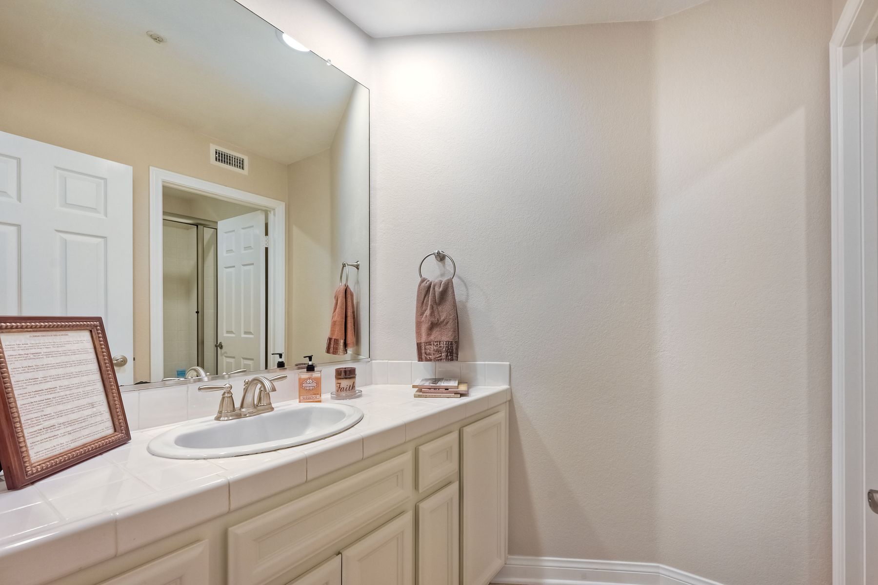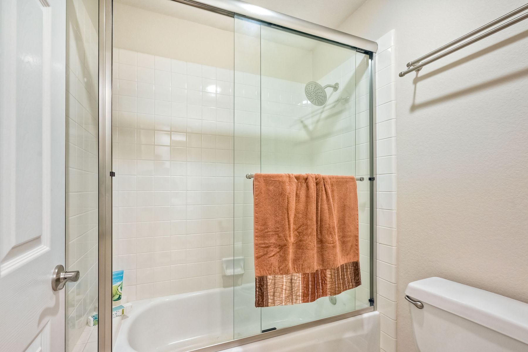 Double Sinks in Primary Bath, Exhaust fan(s), Privacy toilet door, Separate tub and shower, Tile Counters, Walk-in shower, Shower in Tub, Bathtub, Closet in bathroom