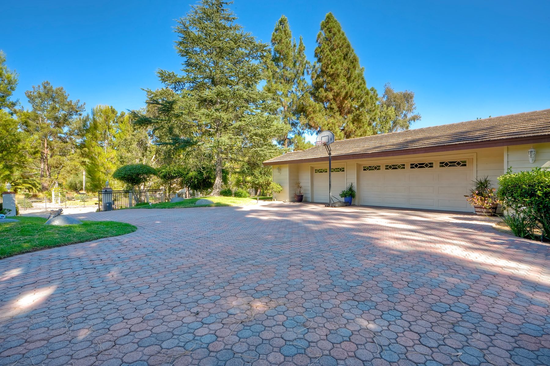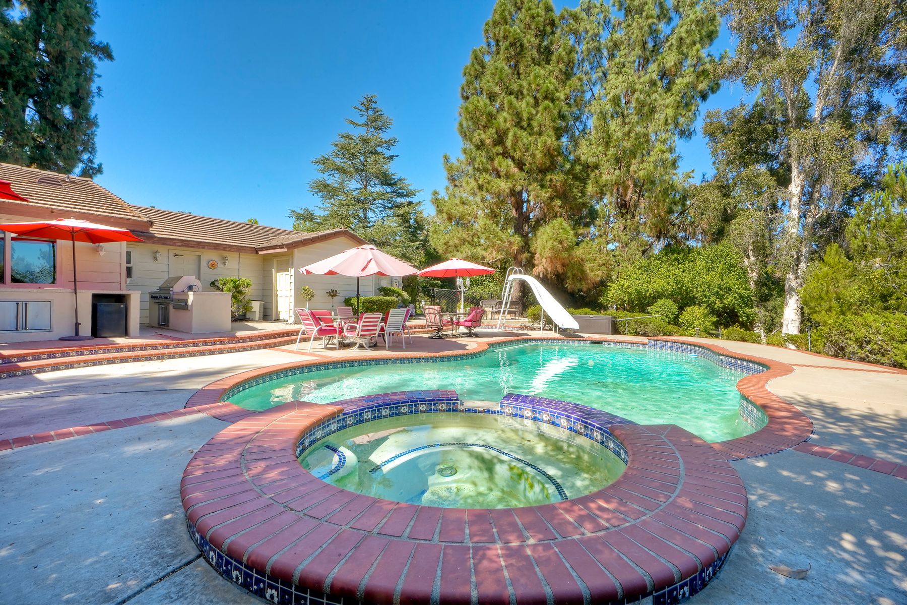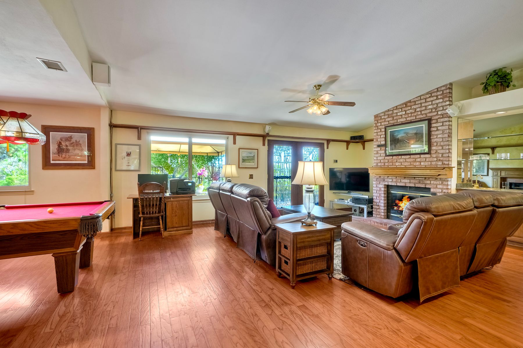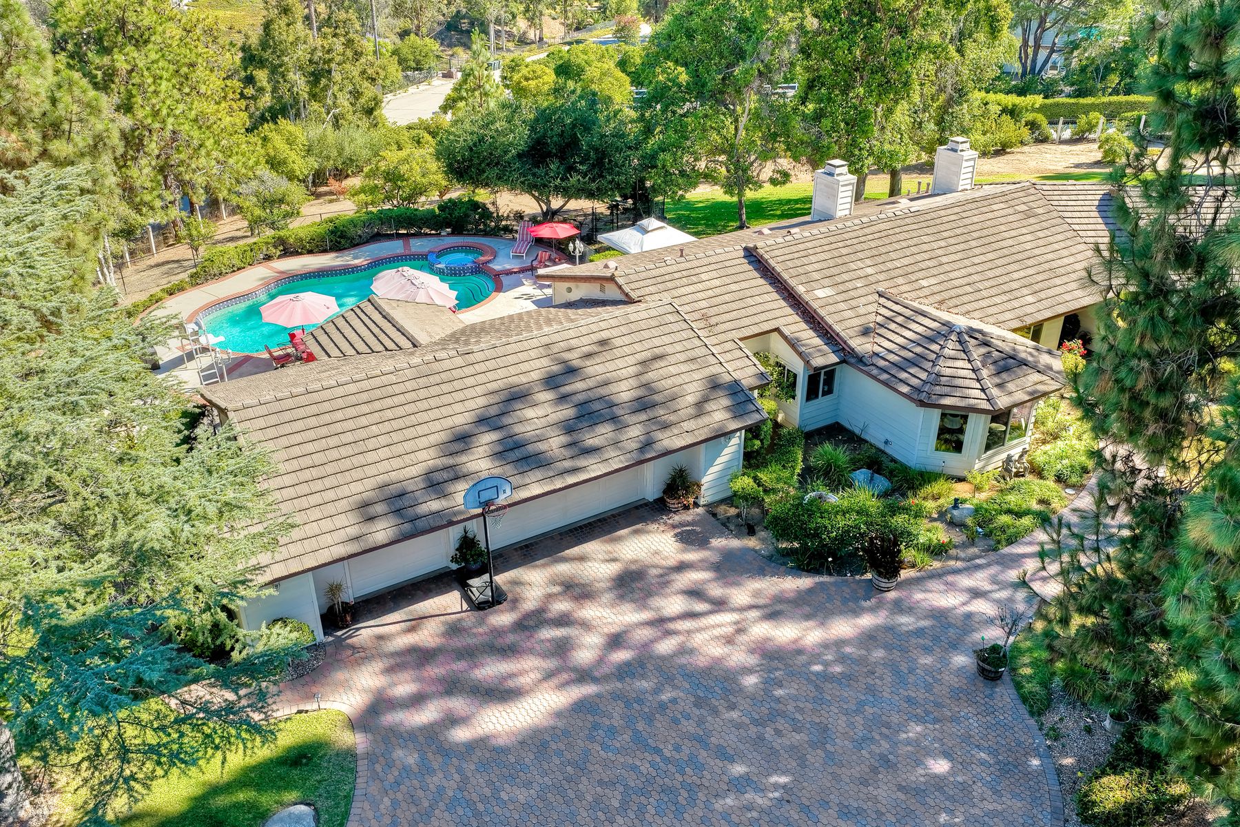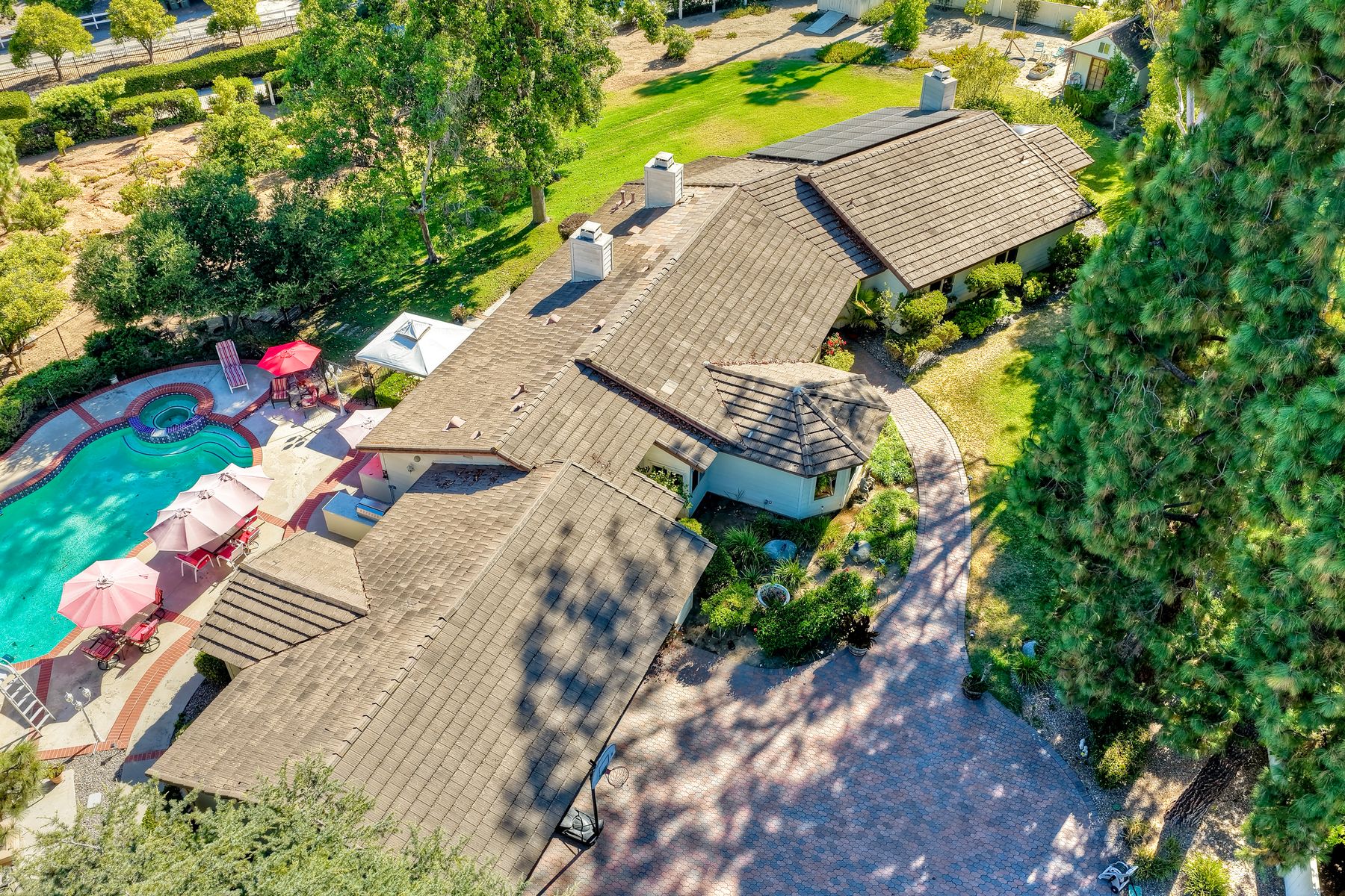 Discover functionality and comfort in this 5-bedroom, 3.5-bath single-story residence, boasting 3,510 square feet of living space. A double-door entry with leaded glass windows welcomes you with natural light and sets a warm, inviting tone. Wood flooring guides you through a thoughtfully designed floorplan with amazing potential to make it your own home. The entry hall separates the bedroom wing from the living and entertaining areas. The spacious living room with fireplace is open to the formal dining room, perfect for gatherings. The adjacent family room with a second fireplace and French doors open to the beautifully landscaped backyard. A versatile bonus room with built-in bookcases offers possibilities as a game room, library, playroom, or media room. The kitchen features stainless steel appliances, a center island with cooktop, ample cabinetry for storage items, a peninsula with bar stool seating options and a spacious dining nook with a bay window overlooking the landscaped yard. The bedroom wing of the home includes four bedrooms sharing two full bathrooms, strategically placed for privacy and convenience. The primary suite features vaulted ceilings, a third fireplace, direct backyard access, a spacious walk-in closet, and an ensuite bathroom with a skylight, dual-sink vanity, glass-enclosed shower, and a jetted tub framed by large windows showcasing a tranquil atrium view with amazing landscape potential. A dedicated laundry room at the opposite end of the hallway offers a window for natural light, a sink cabinet and two storage closets. A convenient half bathroom near the garage entry provides easy access to the backyard’s pool area. Step outside to a backyard perfect for entertaining, complete with an inground pool featuring a slide, a built-in Viking grill BBQ station, multiple seating areas, lamp posts with electrical outlets for evening ambiance, a gas fire pit, beautiful landscaping, a garden area, several fruit trees, and two storage sheds. The gated driveway creates both curb appeal and privacy. This exceptional single-story home offers a desirable floor plan with versatile spaces making it a rare gem for you to make your mark. Great floorplan and lot for entertaining and everyday living.