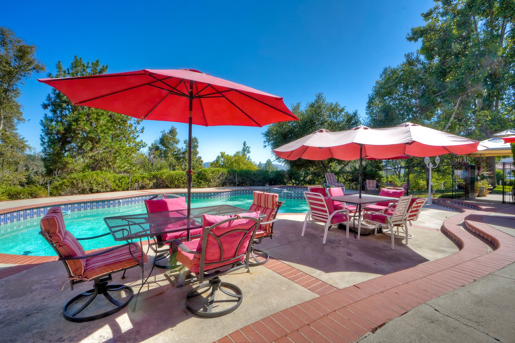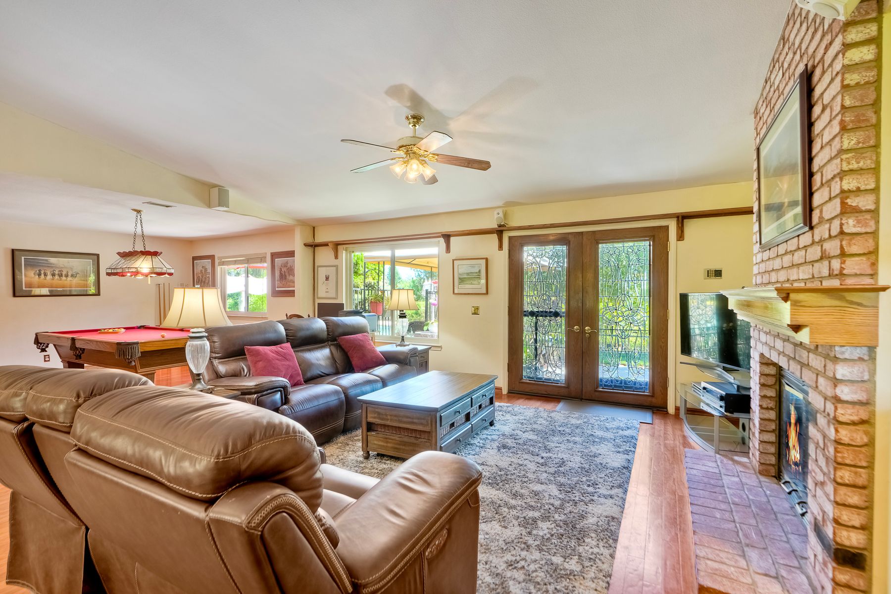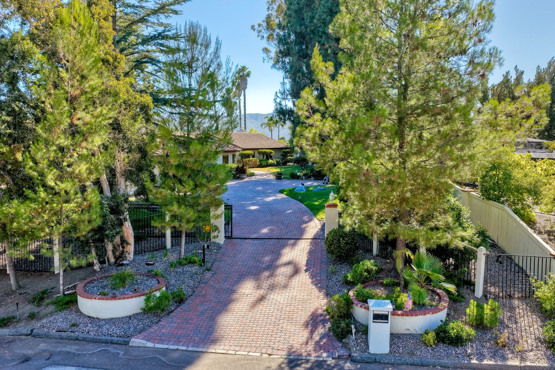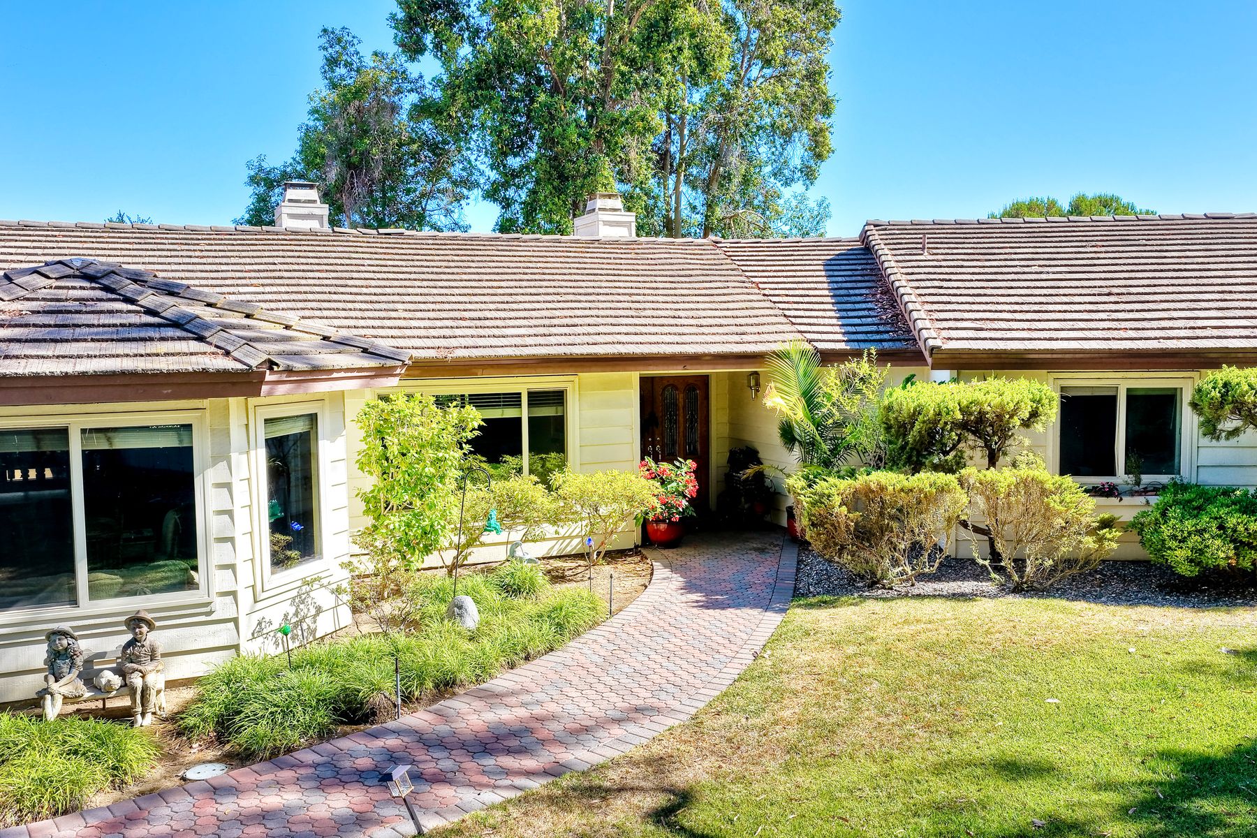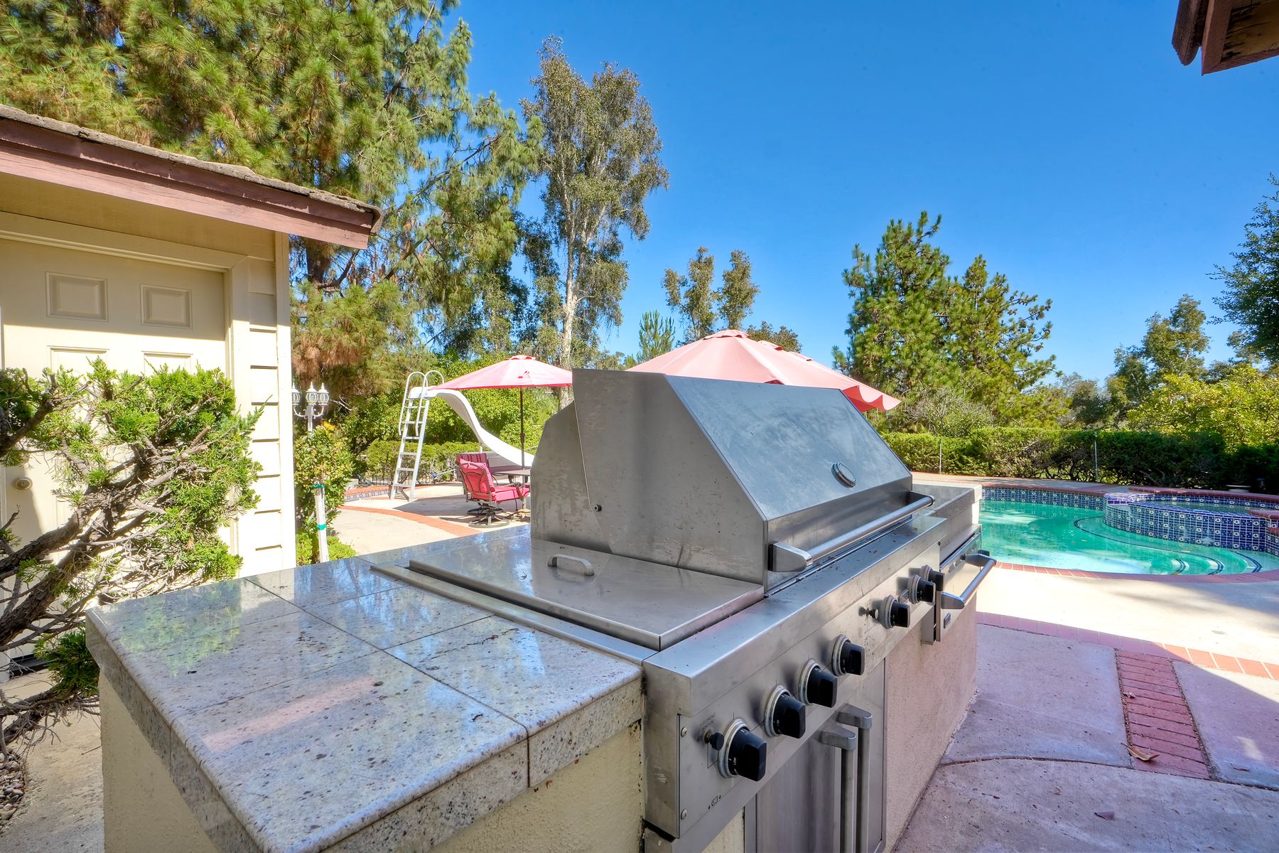 Discover functionality and comfort in this 5-bedroom, 3.5-bath single-story residence, boasting 3,510 square feet of living space. A double-door entry with leaded glass windows welcomes you with natural light and sets a warm, inviting tone. Wood flooring guides you through a thoughtfully designed floorplan with amazing potential to make it your own home. The entry hall separates the bedroom wing from the living and entertaining areas. The spacious living room with fireplace is open to the formal dining room, perfect for gatherings. The adjacent family room with a second fireplace and French doors open to the beautifully landscaped backyard. A versatile bonus room with built-in bookcases offers possibilities as a game room, library, playroom, or media room. The kitchen features stainless steel appliances, a center island with cooktop, ample cabinetry for storage items, a peninsula with bar stool seating options and a spacious dining nook with a bay window overlooking the landscaped yard. The bedroom wing of the home includes four bedrooms sharing two full bathrooms, strategically placed for privacy and convenience. The primary suite features vaulted ceilings, a third fireplace, direct backyard access, a spacious walk-in closet, and an ensuite bathroom with a skylight, dual-sink vanity, glass-enclosed shower, and a jetted tub framed by large windows showcasing a tranquil atrium view with amazing landscape potential. A dedicated laundry room at the opposite end of the hallway offers a window for natural light, a sink cabinet and two storage closets. A convenient half bathroom near the garage entry provides easy access to the backyard’s pool area. Step outside to a backyard perfect for entertaining, complete with an inground pool featuring a slide, a built-in Viking grill BBQ station, multiple seating areas, lamp posts with electrical outlets for evening ambiance, a gas fire pit, beautiful landscaping, a garden area, several fruit trees, and two storage sheds. The gated driveway creates both curb appeal and privacy. This exceptional single-story home offers a desirable floor plan with versatile spaces making it a rare gem for you to make your mark. Great floorplan and lot for entertaining and everyday living.