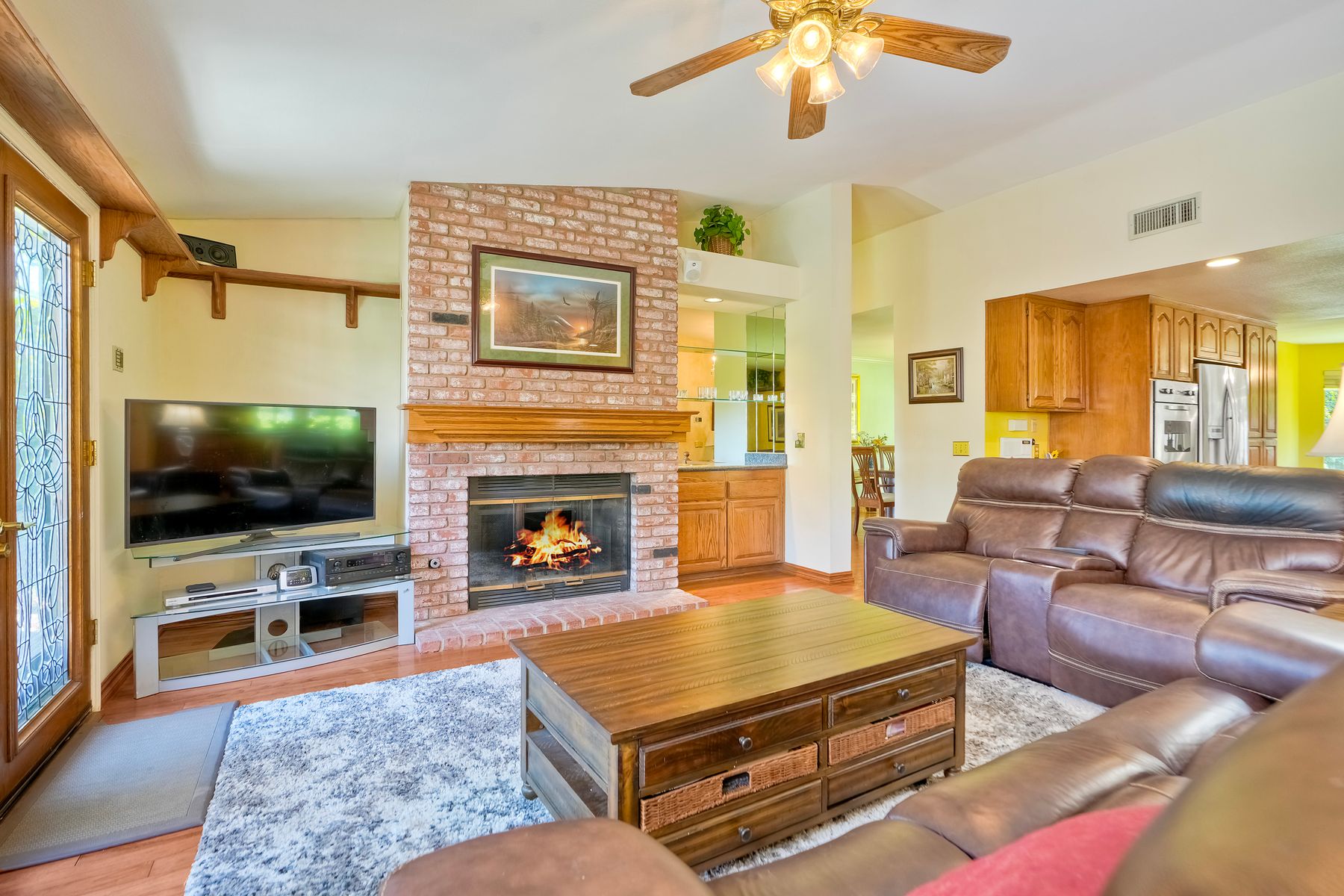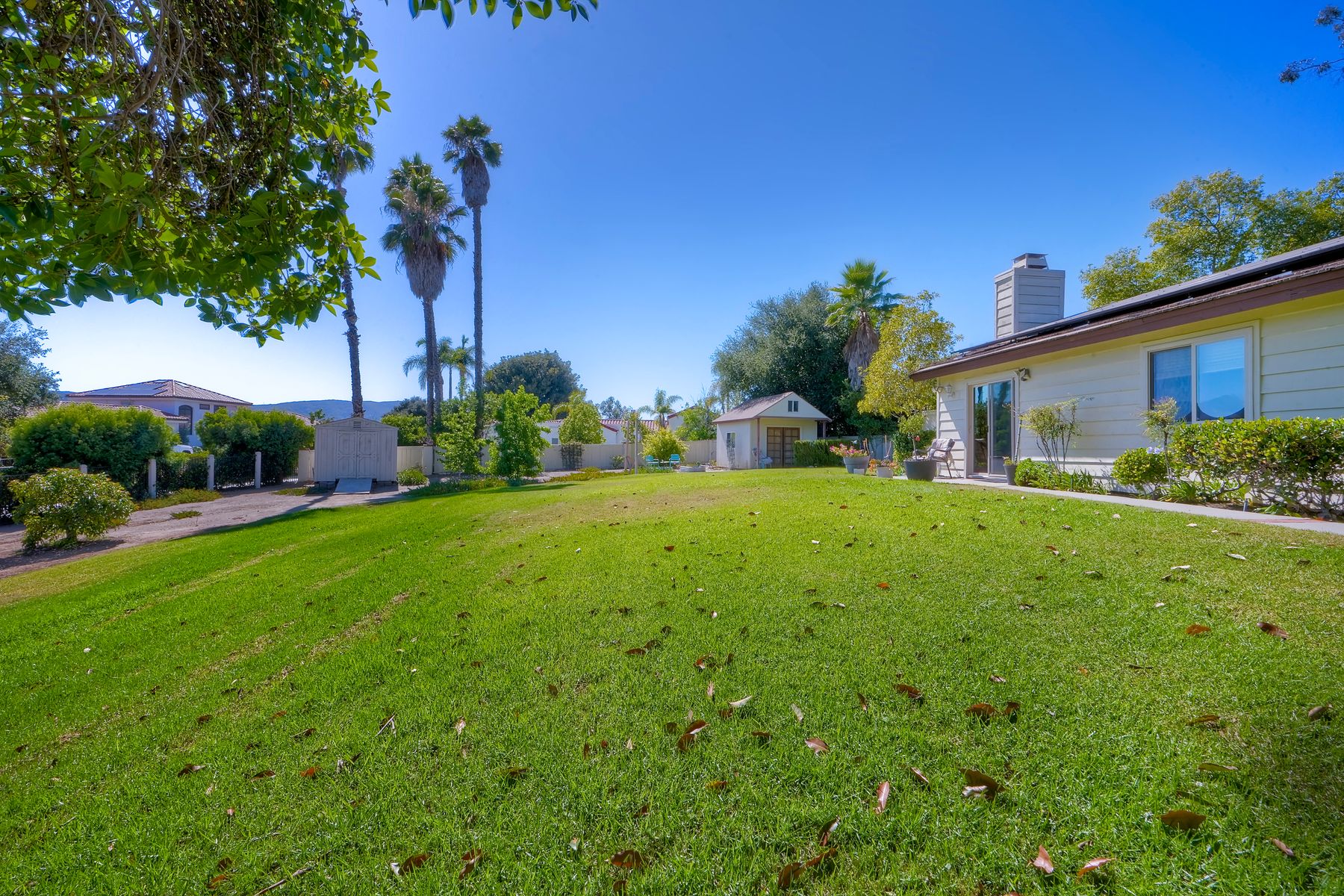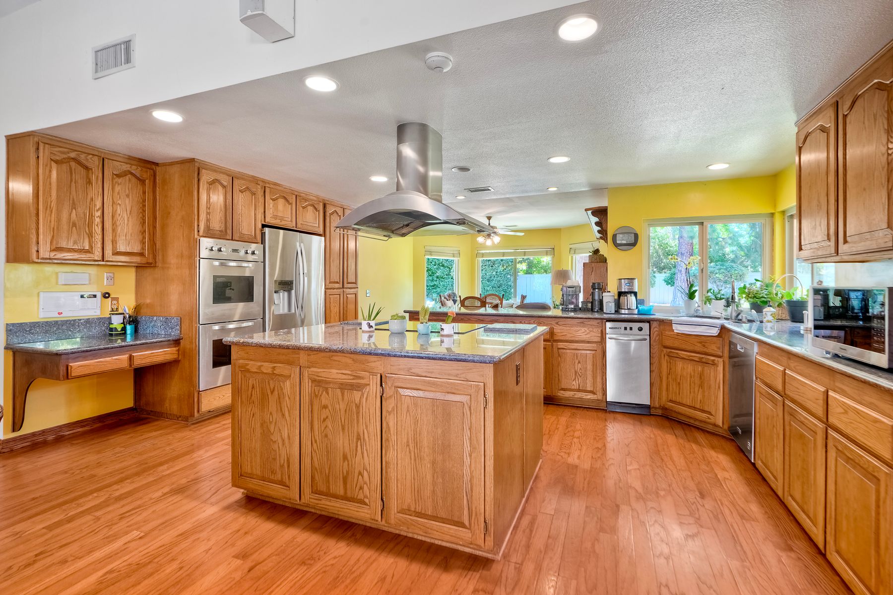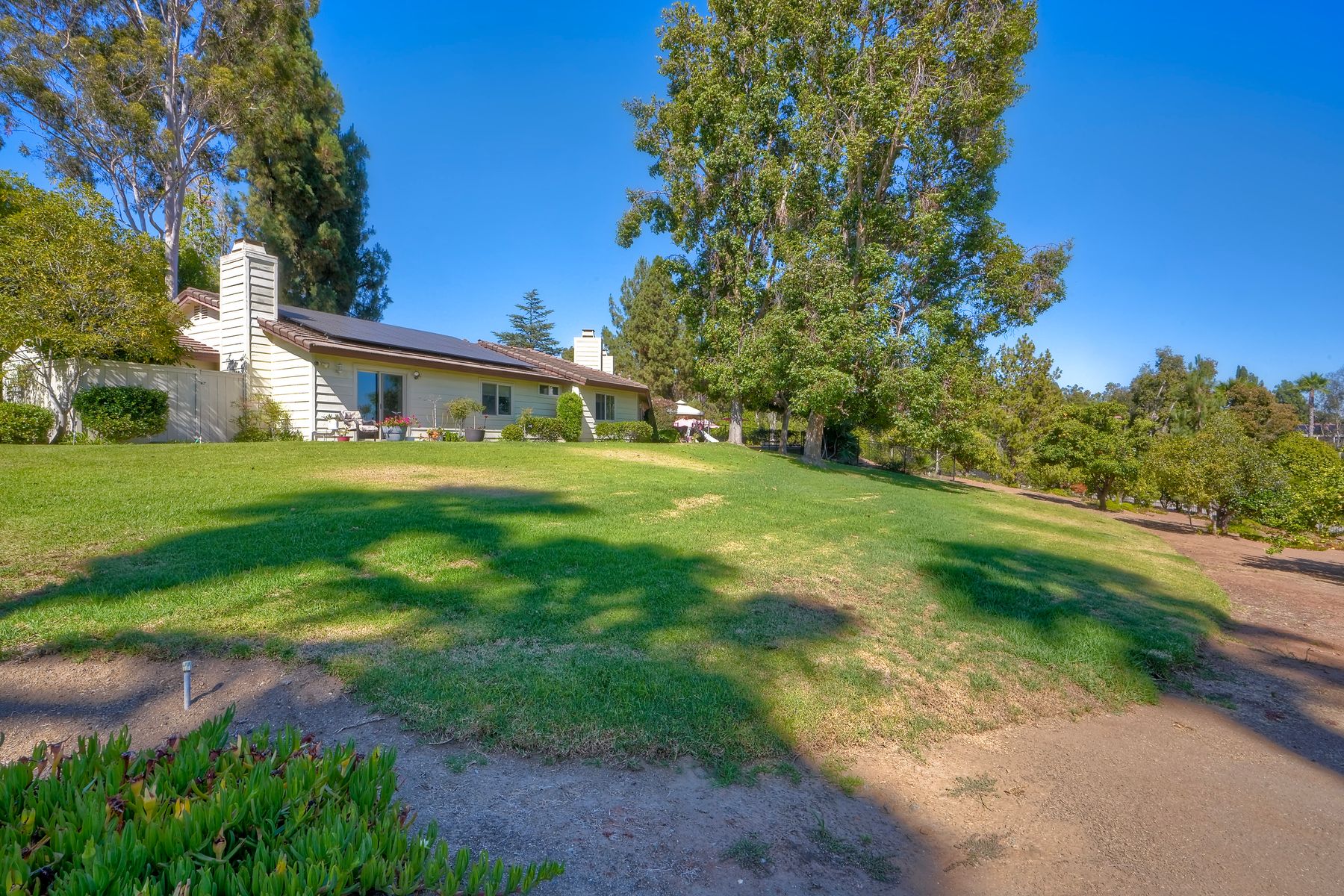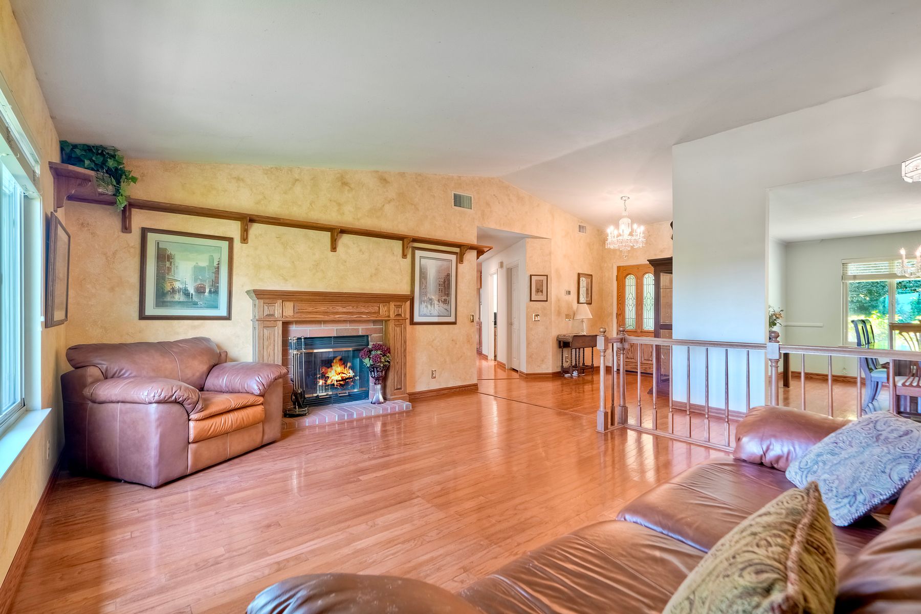 Discover functionality and comfort in this 5-bedroom, 3.5-bath single-story residence, boasting 3,510 square feet of living space. A double-door entry with leaded glass windows welcomes you with natural light and sets a warm, inviting tone. Wood flooring guides you through a thoughtfully designed floorplan with amazing potential to make it your own home. The entry hall separates the bedroom wing from the living and entertaining areas. The spacious living room with fireplace is open to the formal dining room, perfect for gatherings. The adjacent family room with a second fireplace and French doors open to the beautifully landscaped backyard. A versatile bonus room with built-in bookcases offers possibilities as a game room, library, playroom, or media room. The kitchen features stainless steel appliances, a center island with cooktop, ample cabinetry for storage items, a peninsula with bar stool seating options and a spacious dining nook with a bay window overlooking the landscaped yard. The bedroom wing of the home includes four bedrooms sharing two full bathrooms, strategically placed for privacy and convenience. The primary suite features vaulted ceilings, a third fireplace, direct backyard access, a spacious walk-in closet, and an ensuite bathroom with a skylight, dual-sink vanity, glass-enclosed shower, and a jetted tub framed by large windows showcasing a tranquil atrium view with amazing landscape potential. A dedicated laundry room at the opposite end of the hallway offers a window for natural light, a sink cabinet and two storage closets. A convenient half bathroom near the garage entry provides easy access to the backyard’s pool area. Step outside to a backyard perfect for entertaining, complete with an inground pool featuring a slide, a built-in Viking grill BBQ station, multiple seating areas, lamp posts with electrical outlets for evening ambiance, a gas fire pit, beautiful landscaping, a garden area, several fruit trees, and two storage sheds. The gated driveway creates both curb appeal and privacy. This exceptional single-story home offers a desirable floor plan with versatile spaces making it a rare gem for you to make your mark. Great floorplan and lot for entertaining and everyday living.