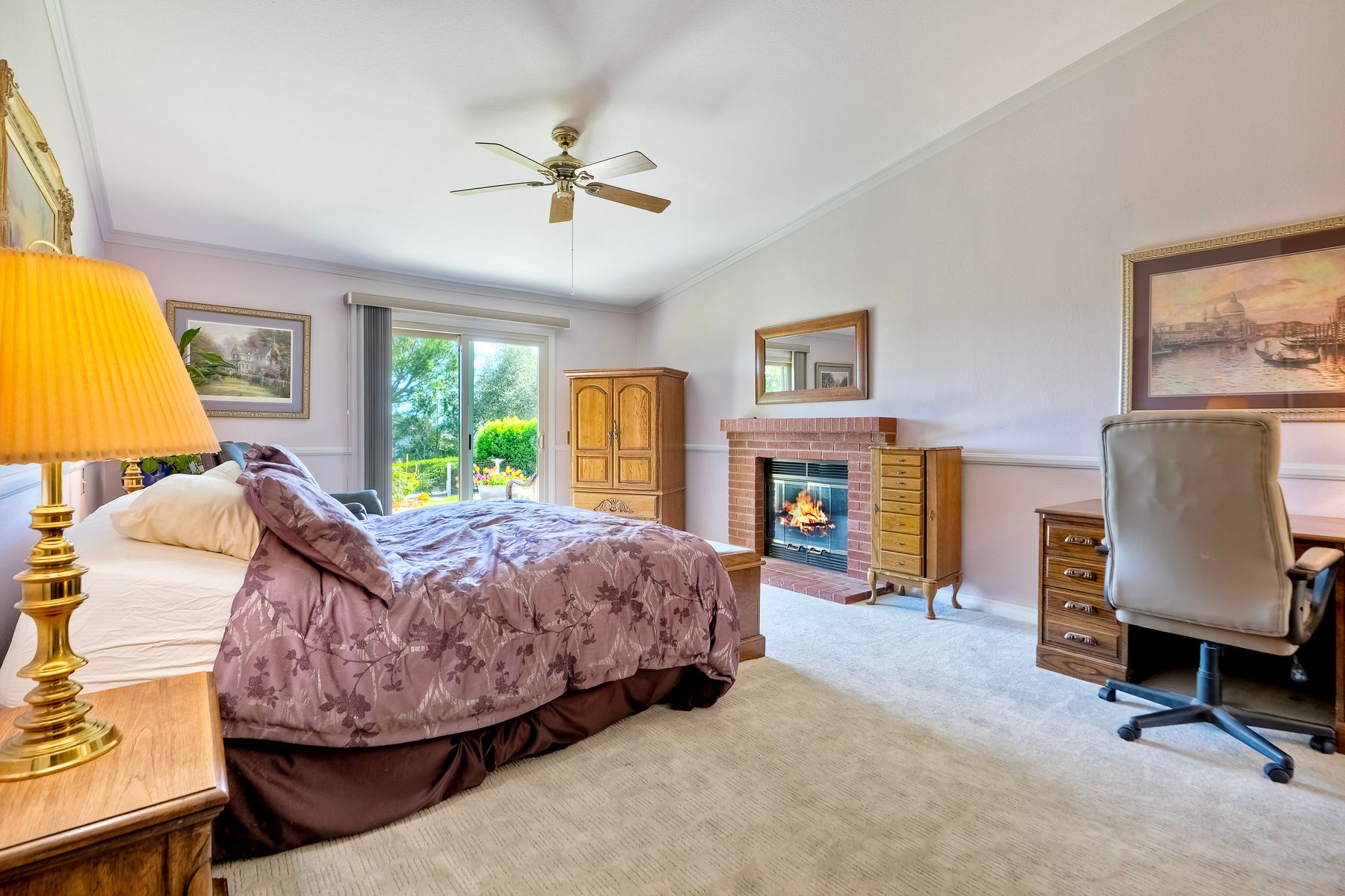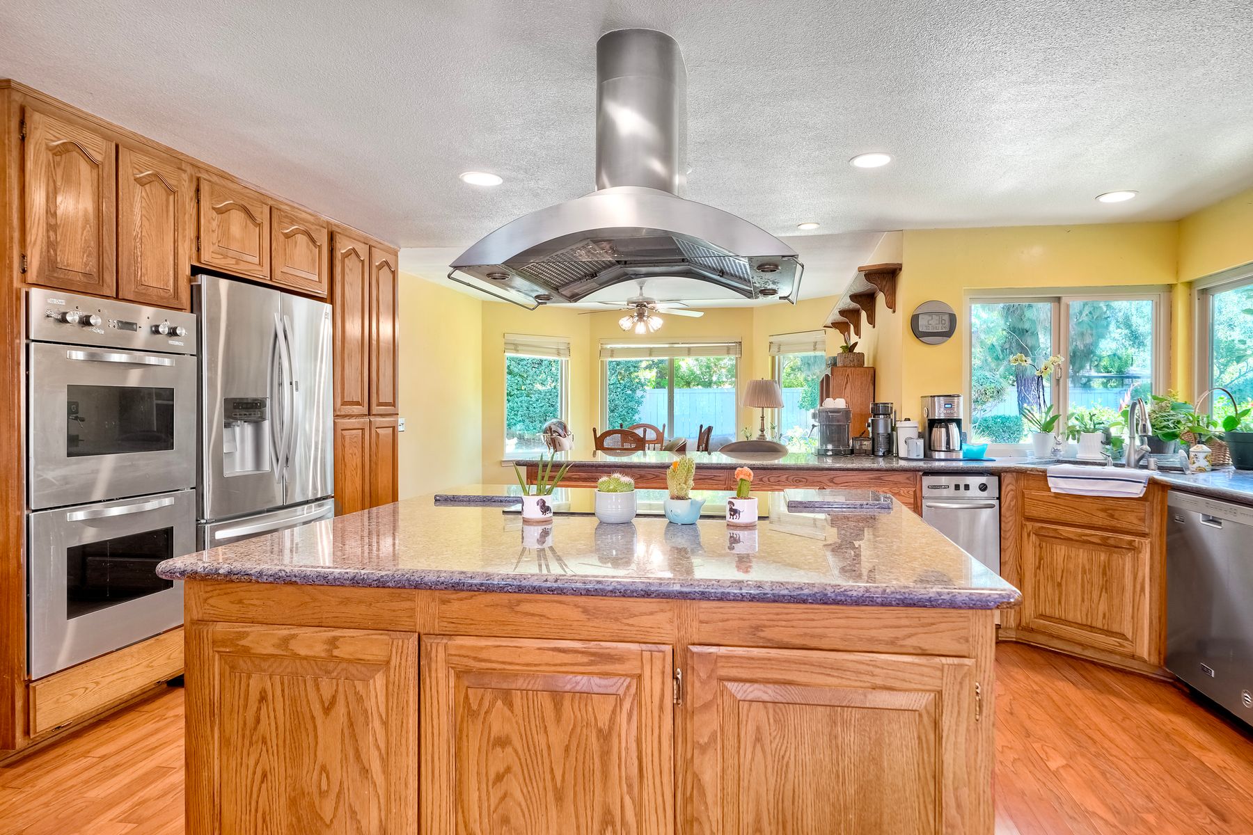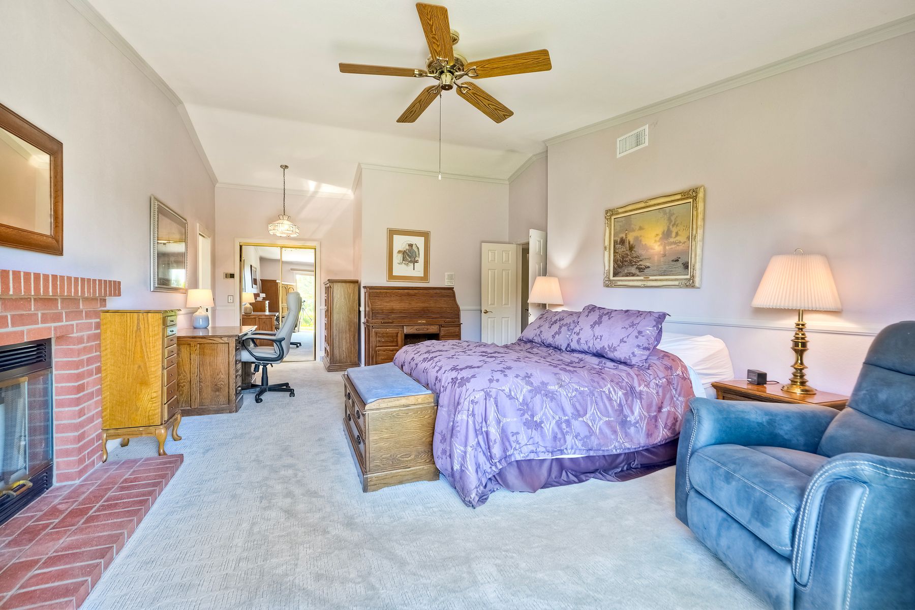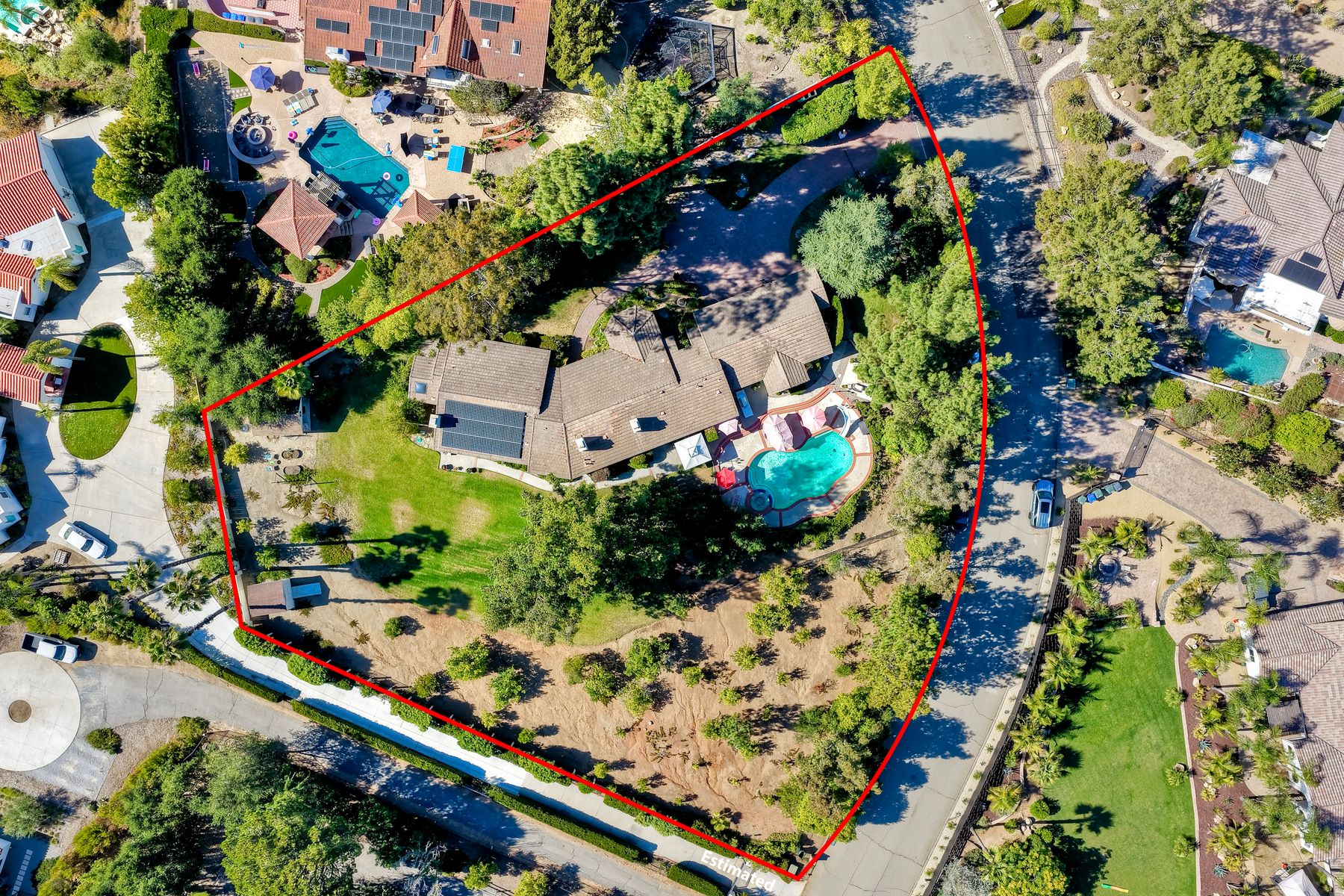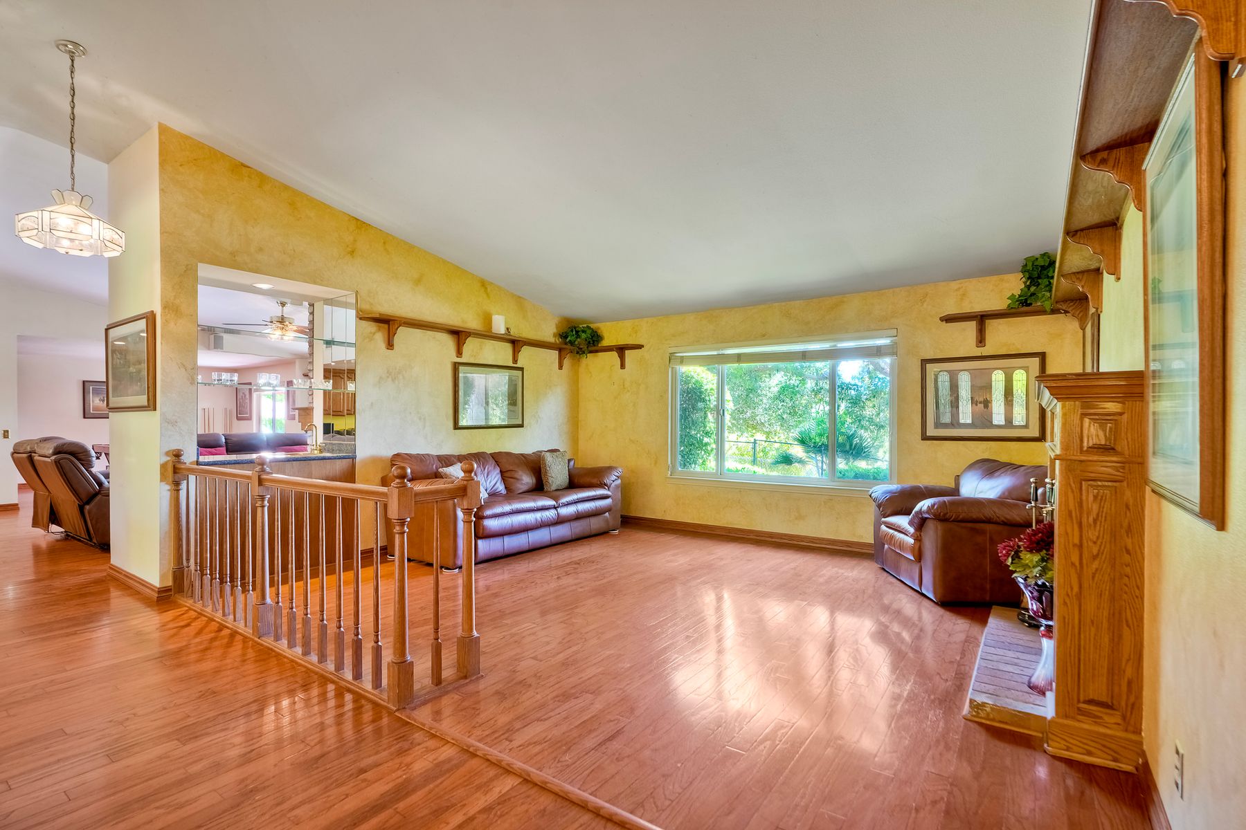 Discover functionality and comfort in this 5-bedroom, 3.5-bath single-story residence, boasting 3,510 square feet of living space. A double-door entry with leaded glass windows welcomes you with natural light and sets a warm, inviting tone. Wood flooring guides you through a thoughtfully designed floorplan with amazing potential to make it your own home. The entry hall separates the bedroom wing from the living and entertaining areas. The spacious living room with fireplace is open to the formal dining room, perfect for gatherings. The adjacent family room with a second fireplace and French doors open to the beautifully landscaped backyard. A versatile bonus room with built-in bookcases offers possibilities as a game room, library, playroom, or media room. The kitchen features stainless steel appliances, a center island with cooktop, ample cabinetry for storage items, a peninsula with bar stool seating options and a spacious dining nook with a bay window overlooking the landscaped yard. The bedroom wing of the home includes four bedrooms sharing two full bathrooms, strategically placed for privacy and convenience. The primary suite features vaulted ceilings, a third fireplace, direct backyard access, a spacious walk-in closet, and an ensuite bathroom with a skylight, dual-sink vanity, glass-enclosed shower, and a jetted tub framed by large windows showcasing a tranquil atrium view with amazing landscape potential. A dedicated laundry room at the opposite end of the hallway offers a window for natural light, a sink cabinet and two storage closets. A convenient half bathroom near the garage entry provides easy access to the backyard’s pool area. Step outside to a backyard perfect for entertaining, complete with an inground pool featuring a slide, a built-in Viking grill BBQ station, multiple seating areas, lamp posts with electrical outlets for evening ambiance, a gas fire pit, beautiful landscaping, a garden area, several fruit trees, and two storage sheds. The gated driveway creates both curb appeal and privacy. This exceptional single-story home offers a desirable floor plan with versatile spaces making it a rare gem for you to make your mark. Great floorplan and lot for entertaining and everyday living.