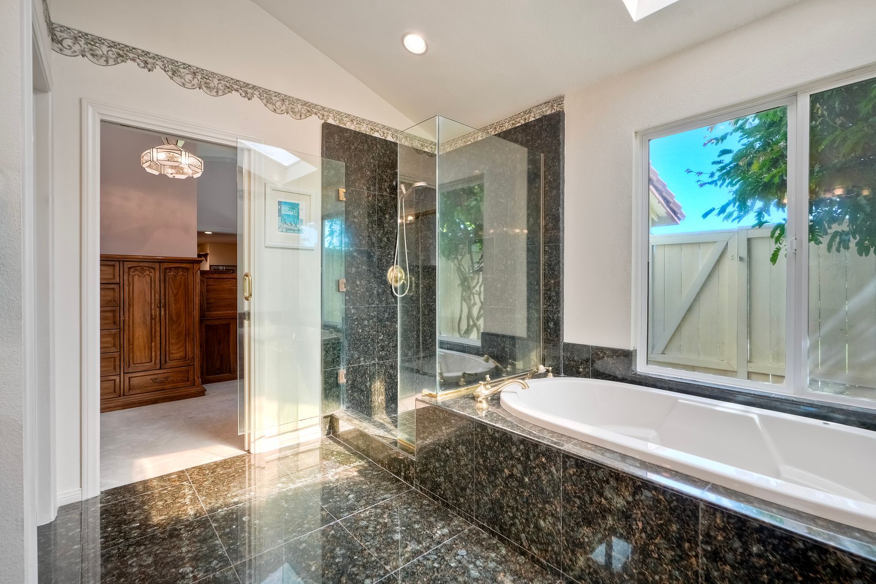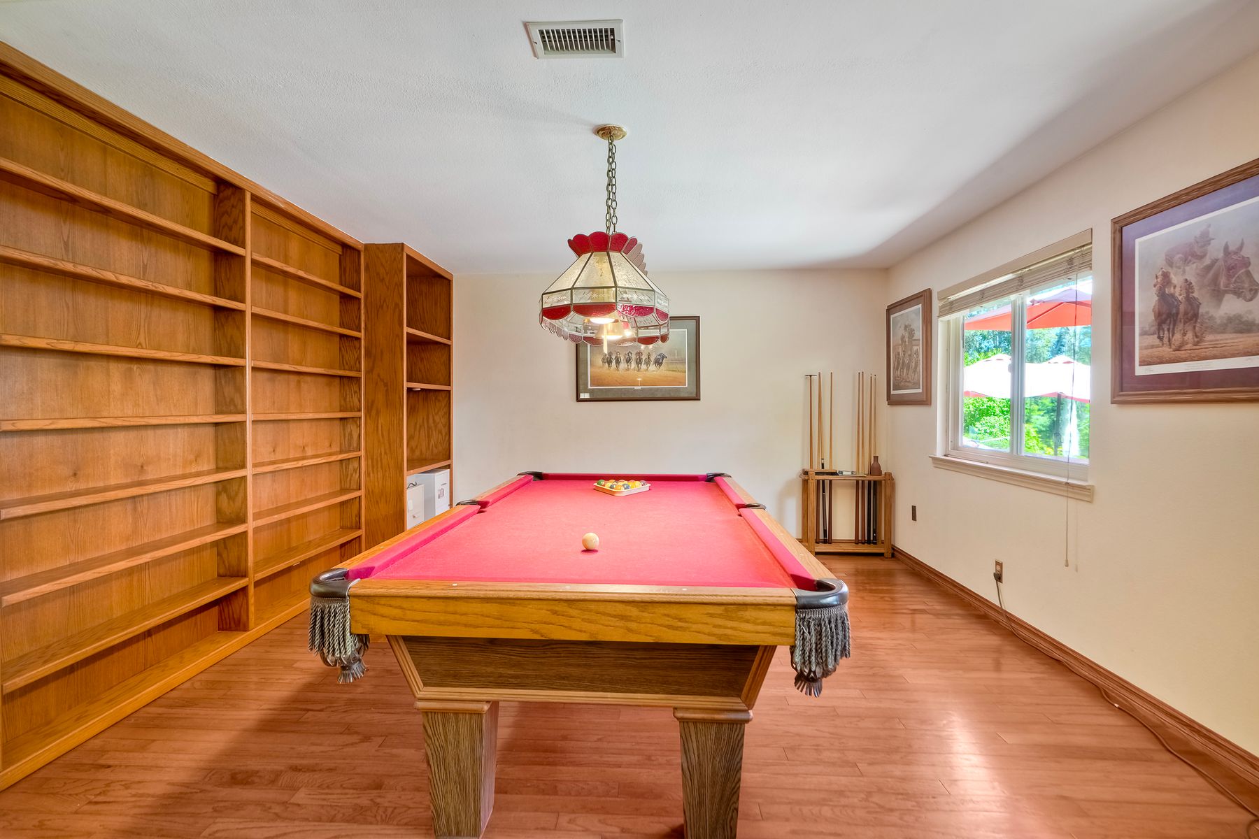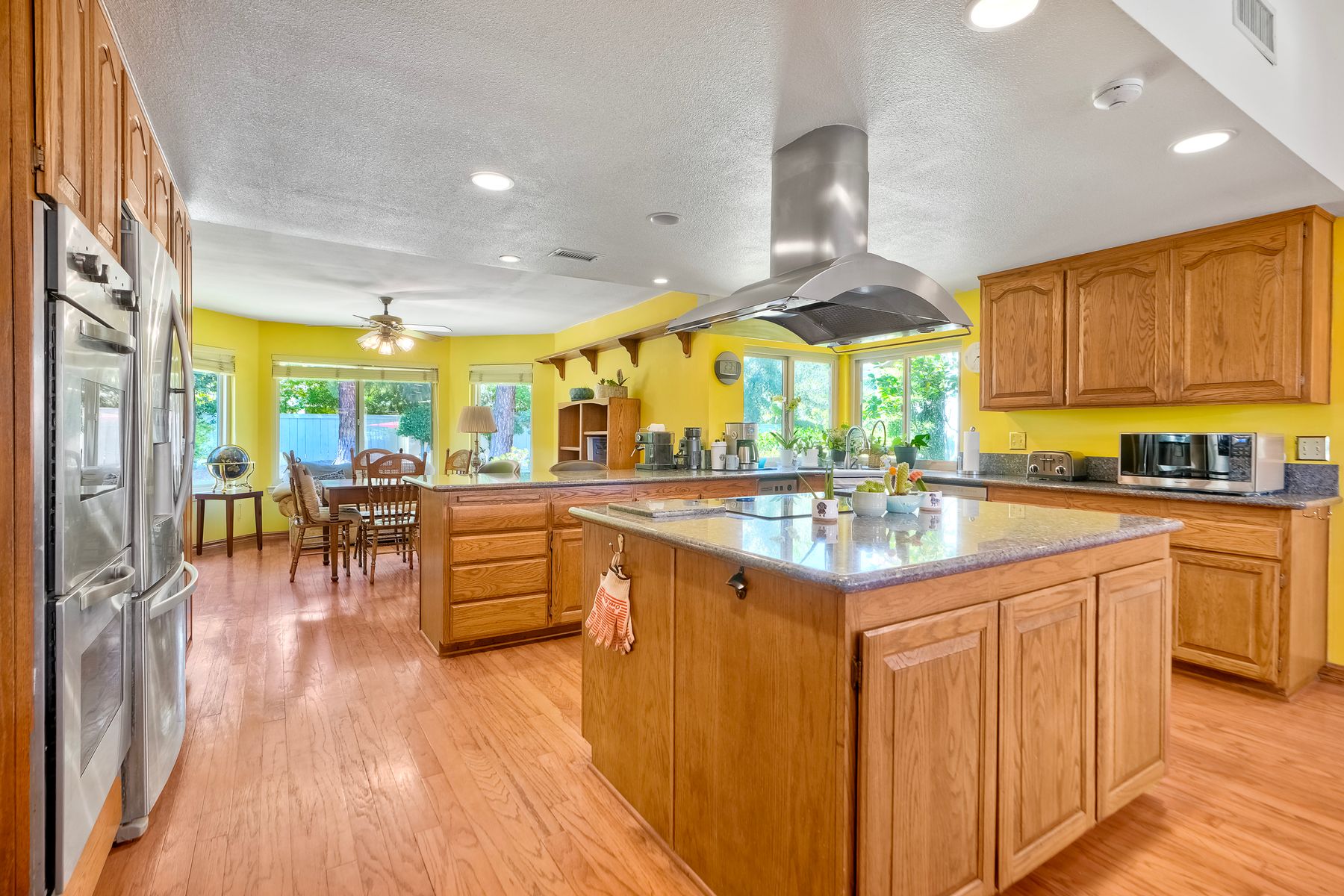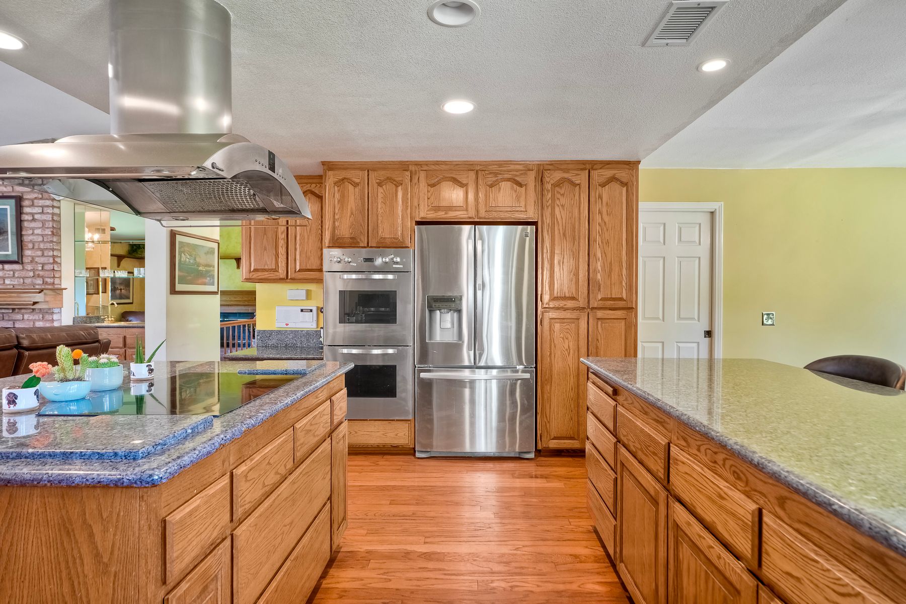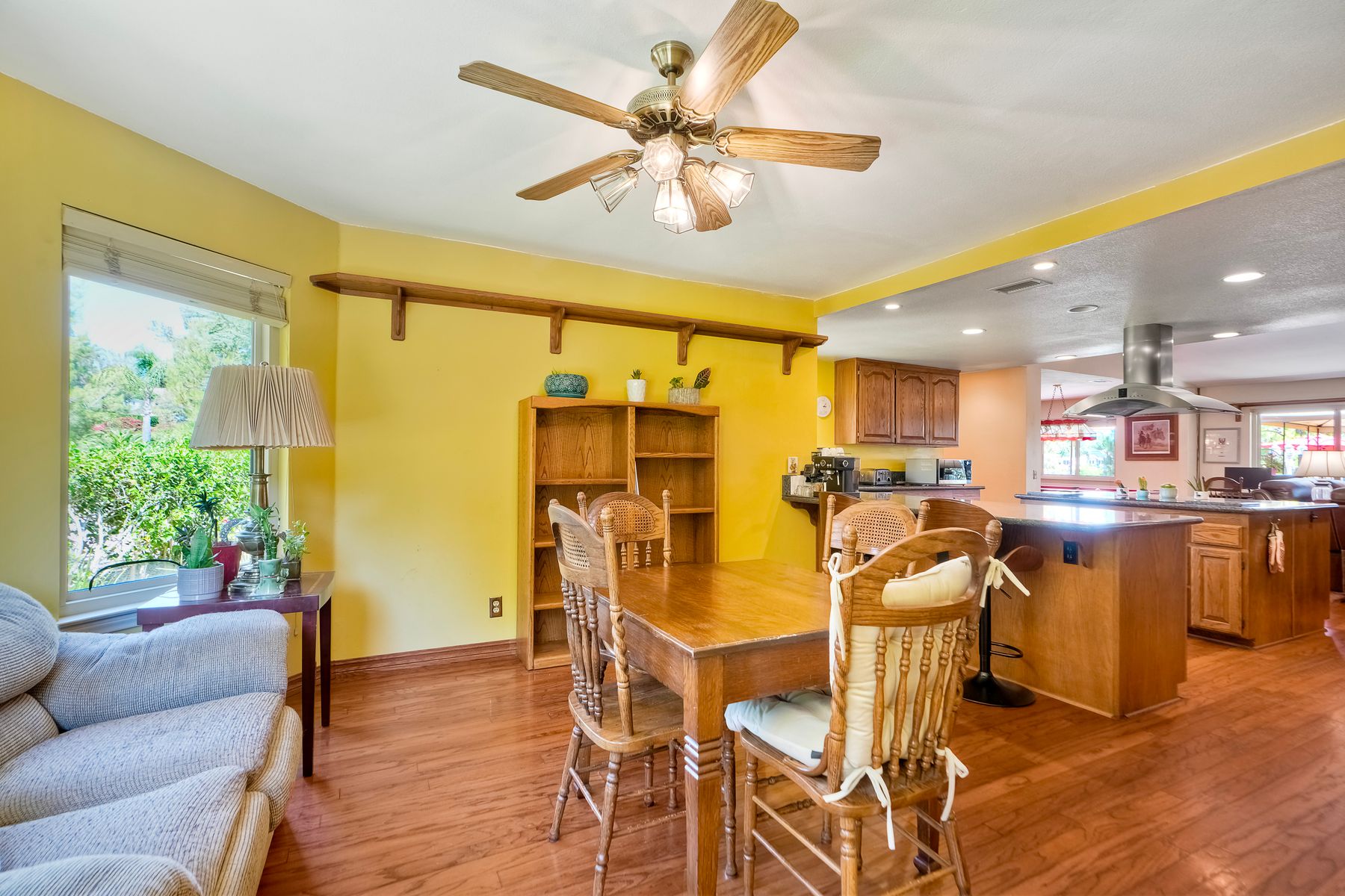 Discover functionality and comfort in this 5-bedroom, 3.5-bath single-story residence, boasting 3,510 square feet of living space. A double-door entry with leaded glass windows welcomes you with natural light and sets a warm, inviting tone. Wood flooring guides you through a thoughtfully designed floorplan with amazing potential to make it your own home. The entry hall separates the bedroom wing from the living and entertaining areas. The spacious living room with fireplace is open to the formal dining room, perfect for gatherings. The adjacent family room with a second fireplace and French doors open to the beautifully landscaped backyard. A versatile bonus room with built-in bookcases offers possibilities as a game room, library, playroom, or media room. The kitchen features stainless steel appliances, a center island with cooktop, ample cabinetry for storage items, a peninsula with bar stool seating options and a spacious dining nook with a bay window overlooking the landscaped yard. The bedroom wing of the home includes four bedrooms sharing two full bathrooms, strategically placed for privacy and convenience. The primary suite features vaulted ceilings, a third fireplace, direct backyard access, a spacious walk-in closet, and an ensuite bathroom with a skylight, dual-sink vanity, glass-enclosed shower, and a jetted tub framed by large windows showcasing a tranquil atrium view with amazing landscape potential. A dedicated laundry room at the opposite end of the hallway offers a window for natural light, a sink cabinet and two storage closets. A convenient half bathroom near the garage entry provides easy access to the backyard’s pool area. Step outside to a backyard perfect for entertaining, complete with an inground pool featuring a slide, a built-in Viking grill BBQ station, multiple seating areas, lamp posts with electrical outlets for evening ambiance, a gas fire pit, beautiful landscaping, a garden area, several fruit trees, and two storage sheds. The gated driveway creates both curb appeal and privacy. This exceptional single-story home offers a desirable floor plan with versatile spaces making it a rare gem for you to make your mark. Great floorplan and lot for entertaining and everyday living.