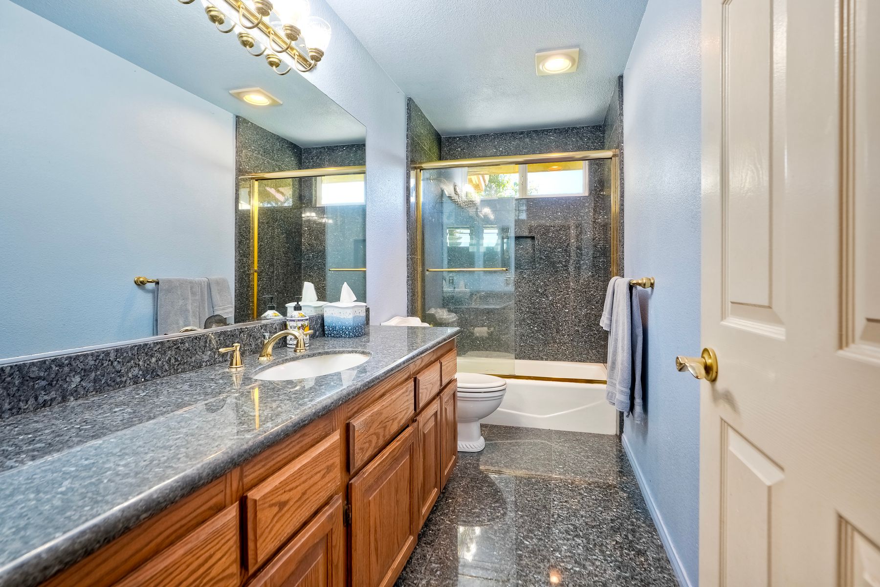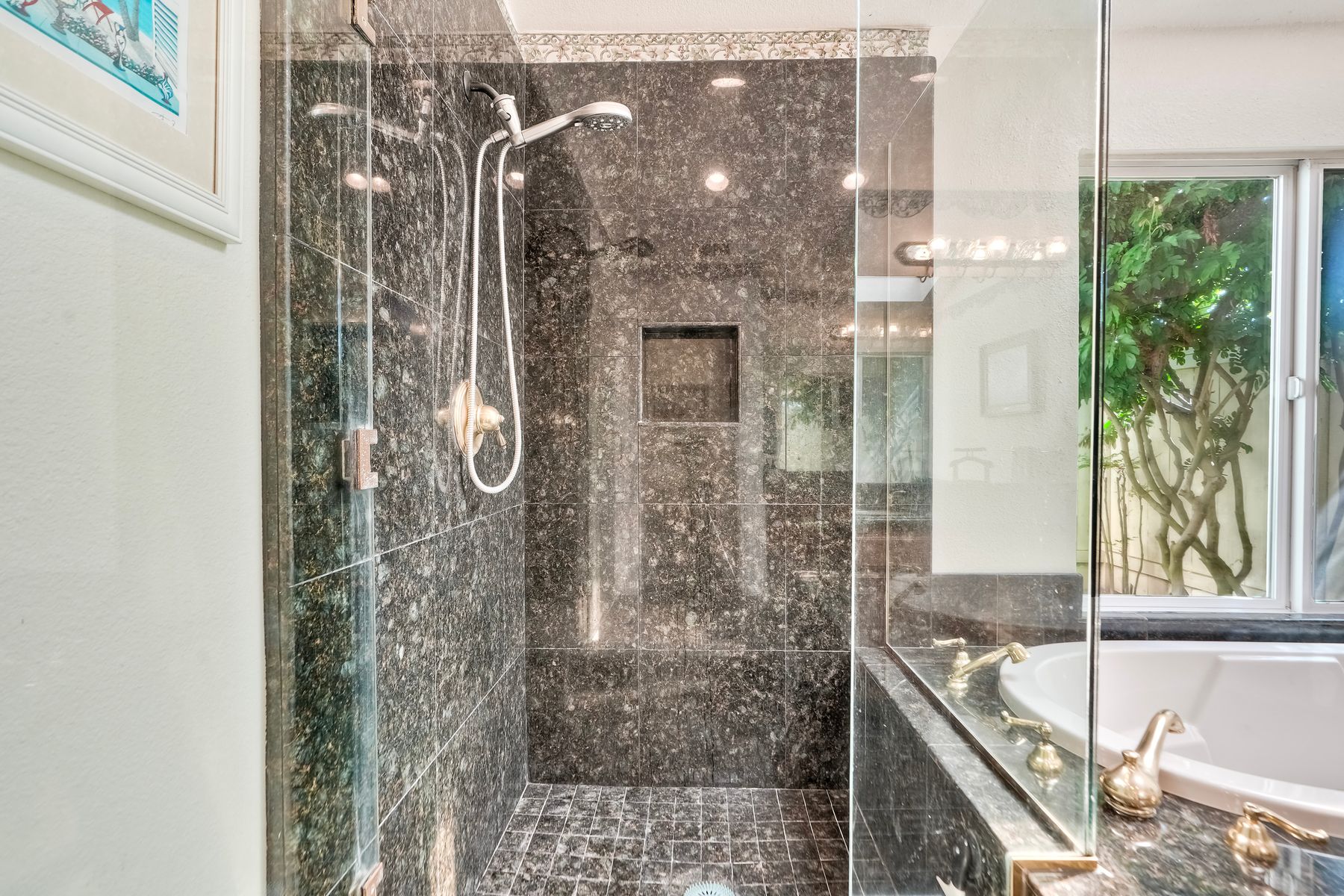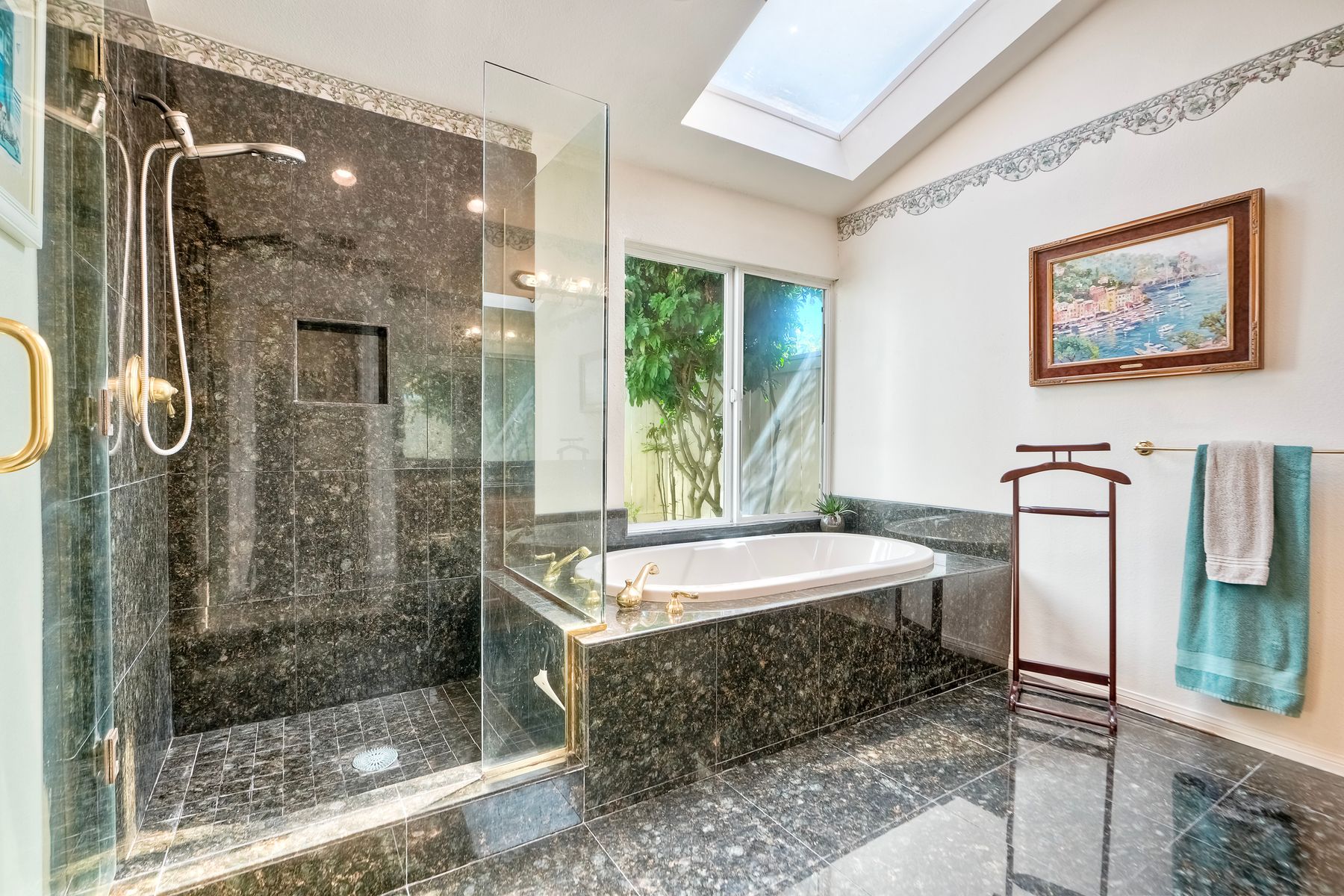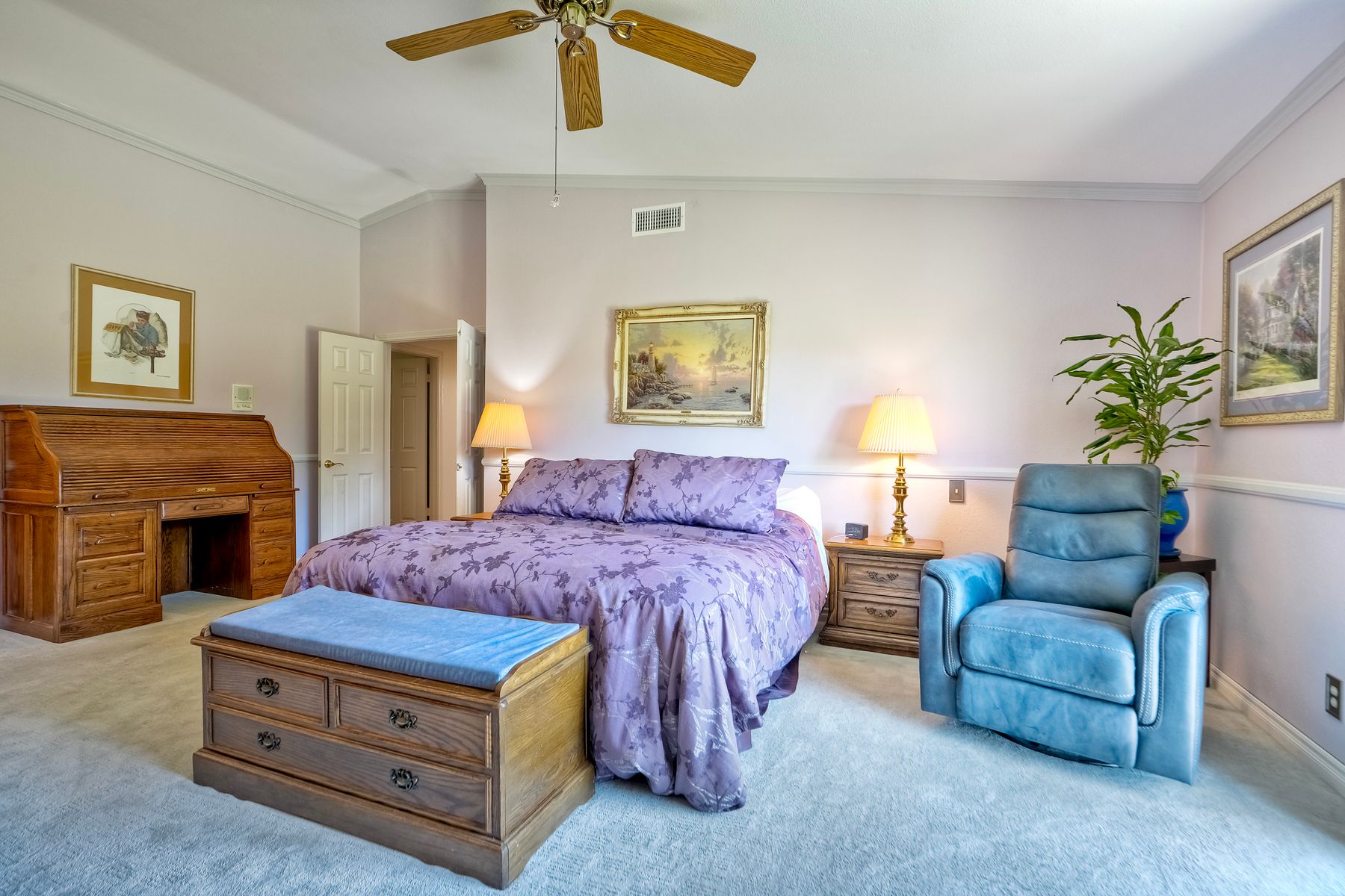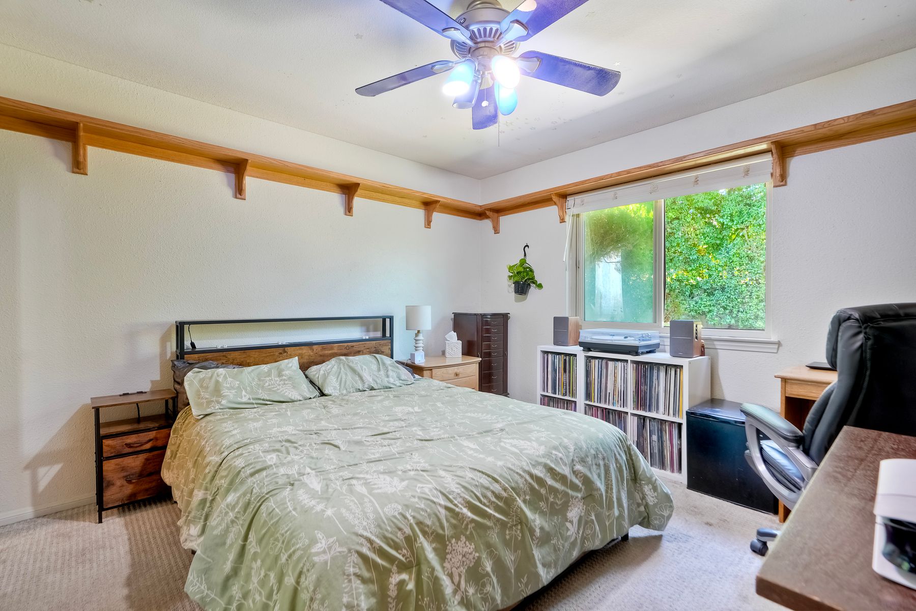 Discover functionality and comfort in this 5-bedroom, 3.5-bath single-story residence, boasting 3,510 square feet of living space. A double-door entry with leaded glass windows welcomes you with natural light and sets a warm, inviting tone. Wood flooring guides you through a thoughtfully designed floorplan with amazing potential to make it your own home. The entry hall separates the bedroom wing from the living and entertaining areas. The spacious living room with fireplace is open to the formal dining room, perfect for gatherings. The adjacent family room with a second fireplace and French doors open to the beautifully landscaped backyard. A versatile bonus room with built-in bookcases offers possibilities as a game room, library, playroom, or media room. The kitchen features stainless steel appliances, a center island with cooktop, ample cabinetry for storage items, a peninsula with bar stool seating options and a spacious dining nook with a bay window overlooking the landscaped yard. The bedroom wing of the home includes four bedrooms sharing two full bathrooms, strategically placed for privacy and convenience. The primary suite features vaulted ceilings, a third fireplace, direct backyard access, a spacious walk-in closet, and an ensuite bathroom with a skylight, dual-sink vanity, glass-enclosed shower, and a jetted tub framed by large windows showcasing a tranquil atrium view with amazing landscape potential. A dedicated laundry room at the opposite end of the hallway offers a window for natural light, a sink cabinet and two storage closets. A convenient half bathroom near the garage entry provides easy access to the backyard’s pool area. Step outside to a backyard perfect for entertaining, complete with an inground pool featuring a slide, a built-in Viking grill BBQ station, multiple seating areas, lamp posts with electrical outlets for evening ambiance, a gas fire pit, beautiful landscaping, a garden area, several fruit trees, and two storage sheds. The gated driveway creates both curb appeal and privacy. This exceptional single-story home offers a desirable floor plan with versatile spaces making it a rare gem for you to make your mark. Great floorplan and lot for entertaining and everyday living.