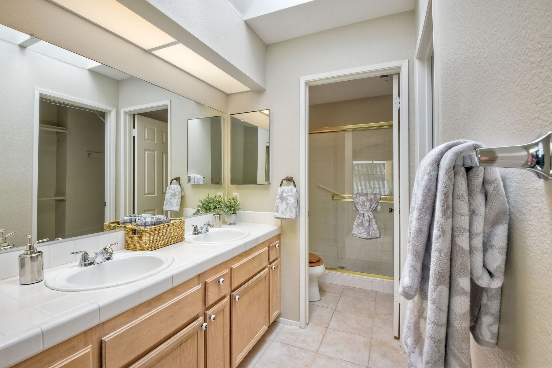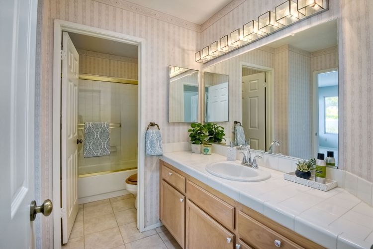 Double Sinks In Master Bath, Exhaust fan(s), Privacy toilet door, Tile Counters, Shower, Shower in Tub, Bathtub