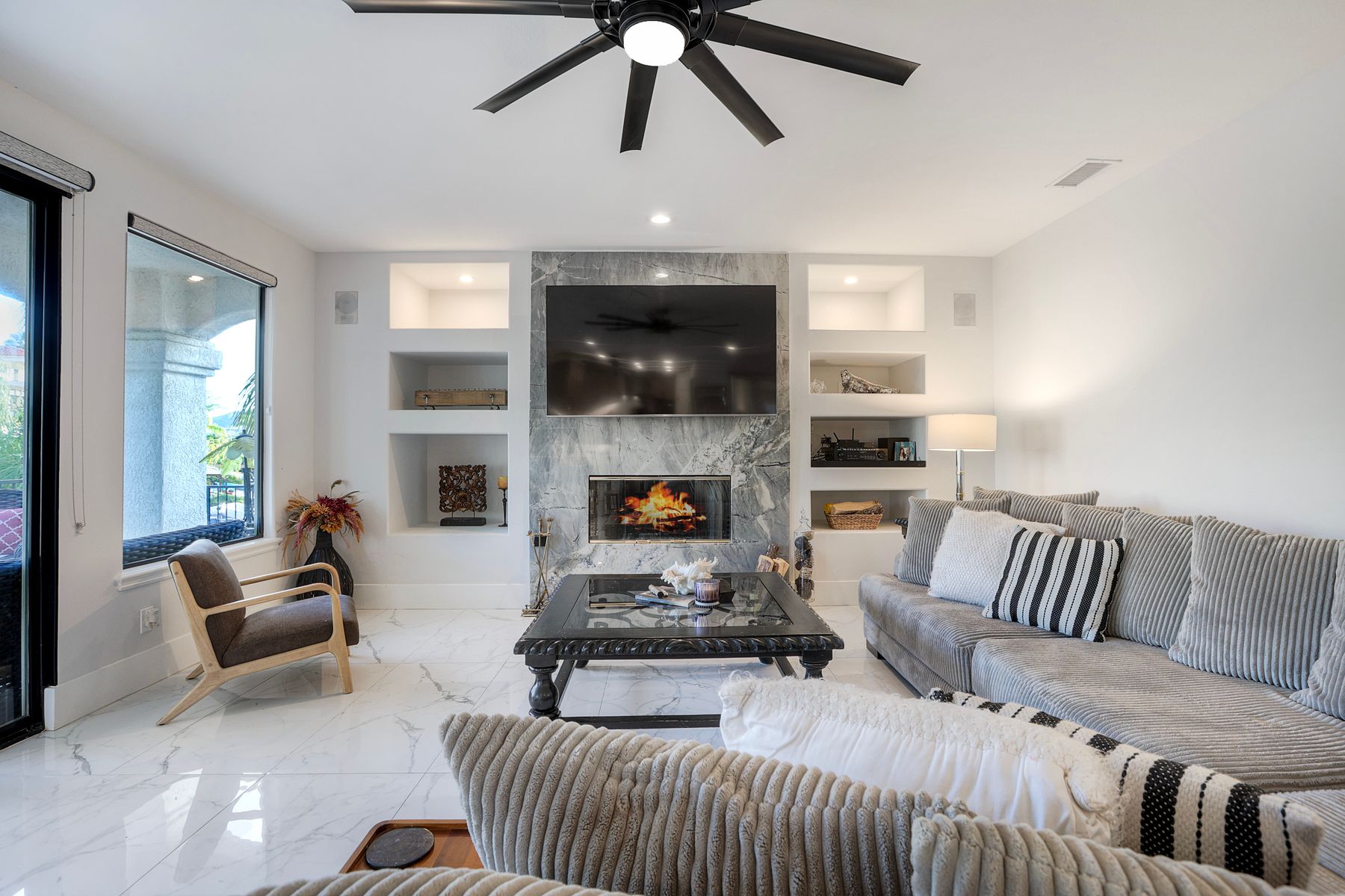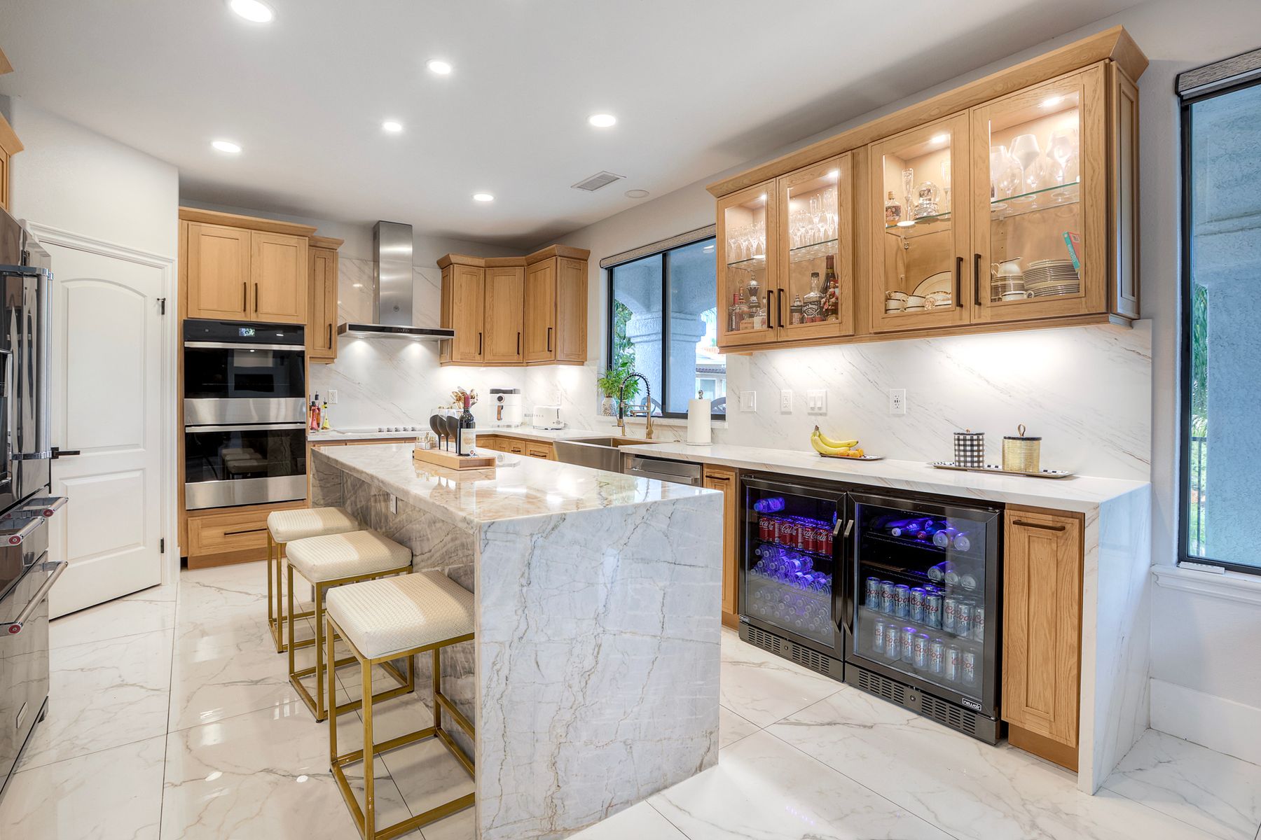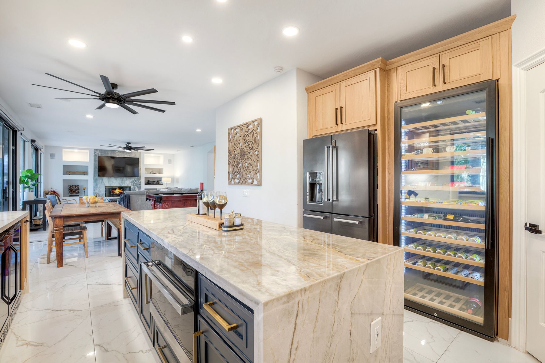 The remodeled kitchen is a standout, showcasing high-end appliances, custom cabinetry, and an expansive quartz island with ample seating, perfect for both everyday living and entertaining. The open-concept design flows seamlessly into the main living areas, filled with natural light and designed to capture the surrounding views. Buyer to assume solar lease.