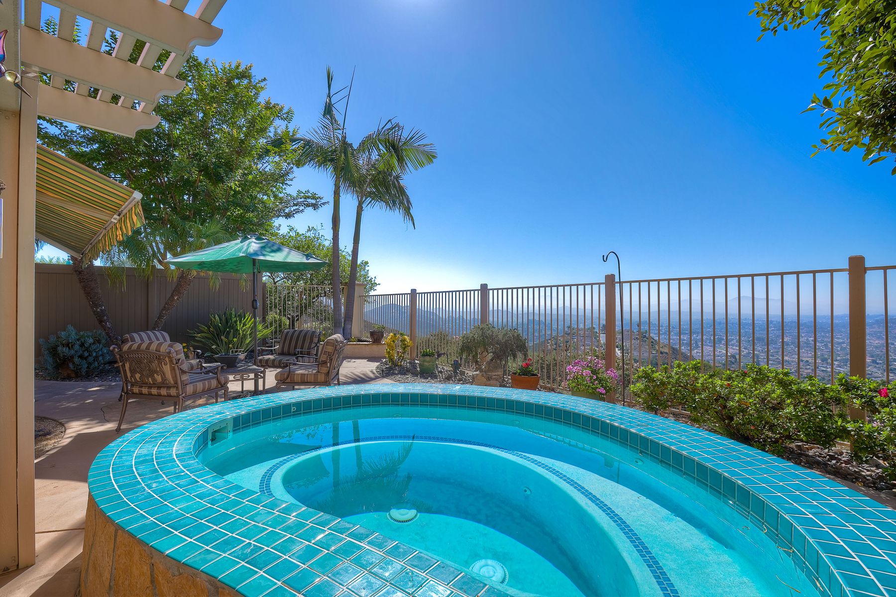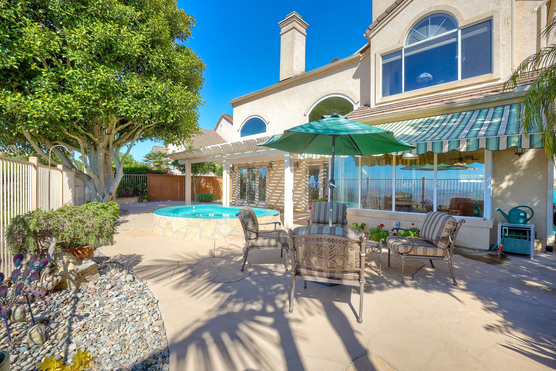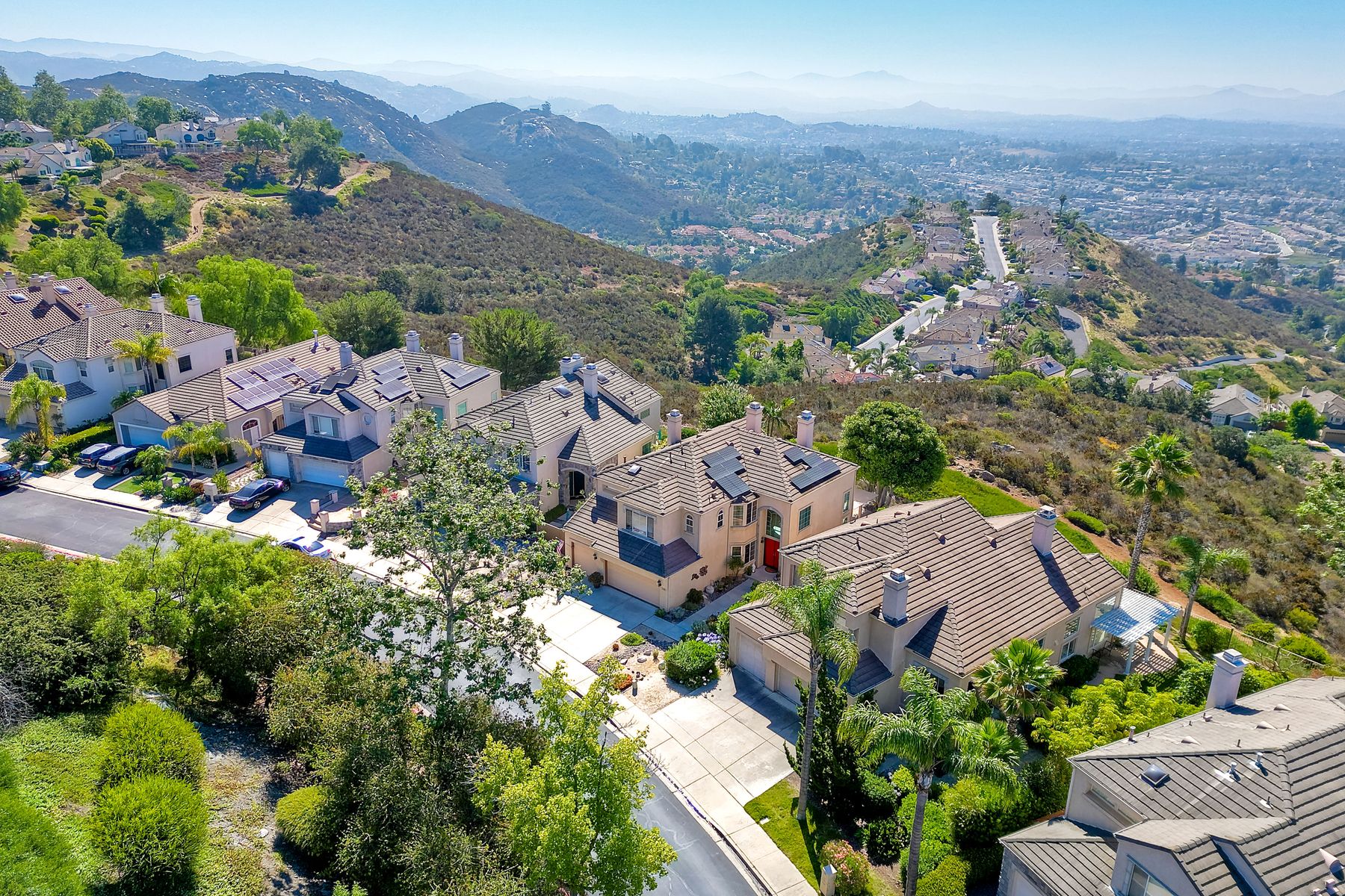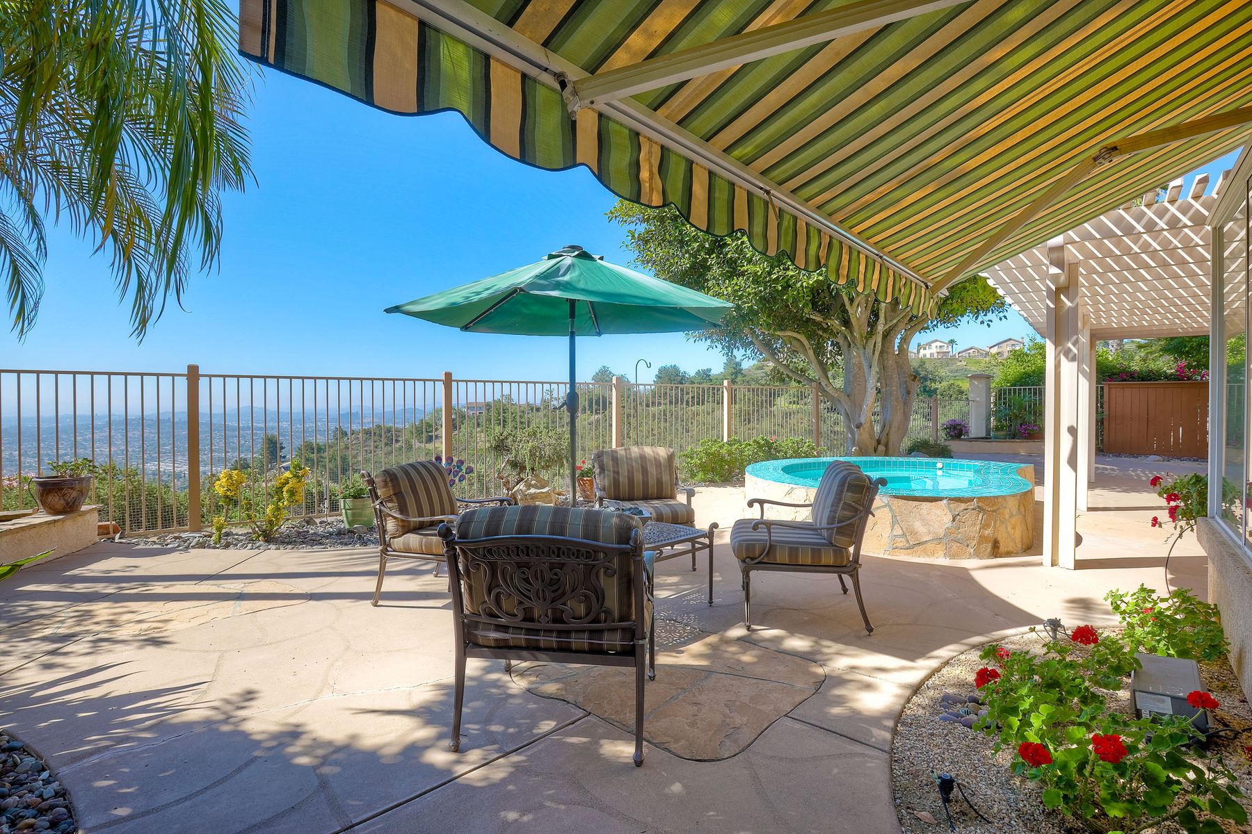 Welcome home and be prepared to have the panoramic views take your breath every day! This beautiful pride of ownership home is located in the guard gated community of Emerald Heights. As you enter the home through the double door entry you'll see the beautiful staircase, the light and bright home and enjoy the views through the high arched windows. This four bedroom three full bath home, enjoys the primary bedroom upstairs, along with two additional bedrooms and with a first floor bedroom that is presently configured as an office. The spacious primary suite enjoys the incredible views, a huge mirrored closet area, dual vanities, makeup/dressing area, soaking tub and separate Glass Block shower. The two additional bedrooms upstairs have an Hollywood style Jack & Jill bathroom. You'll be inspired to cook in this gourmet kitchen with custom cabinetry, granite countertops, and newer stainless steel appliances. You'll be a part of the party with this great room style area that includes an atrium breakfast nook, kitchen and family room. Start your morning with a cup of coffee taking in the spectacular view, and end your day in the jacuzzi enjoying the city light views. Step outside through the Anderson patio doors to the patio with the jacuzzi and large patio area for your entertaining pleasure. Enjoy plenty of shade under the Aluma wood cover, as well as the Retractable awning. Both the front and backyard areas are beautifully landscaped with convenient drip irrigation. The solar is leased. Enjoy resort style living in the Emerald Heights community. Get your exercise in the Olympic sized pool that is heated year round, spa, or on the pickleball, tennis and basketball courts. The little ones will have fun in the play ground, wading pool and the picnic area too! The HOA organizes events like Adult parties, Music at Sunset, Easter Egg Hunts, 4th of July parades and many many more fun activities!