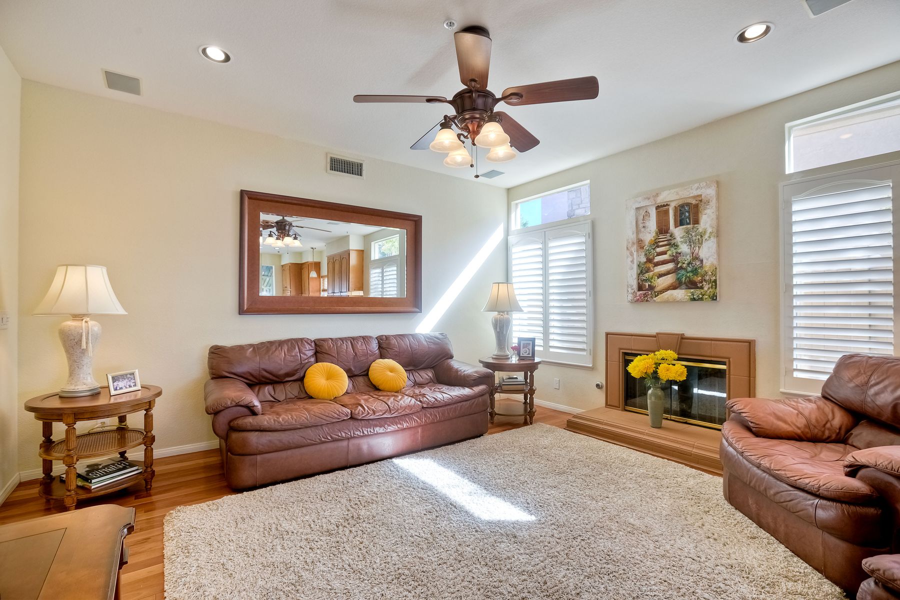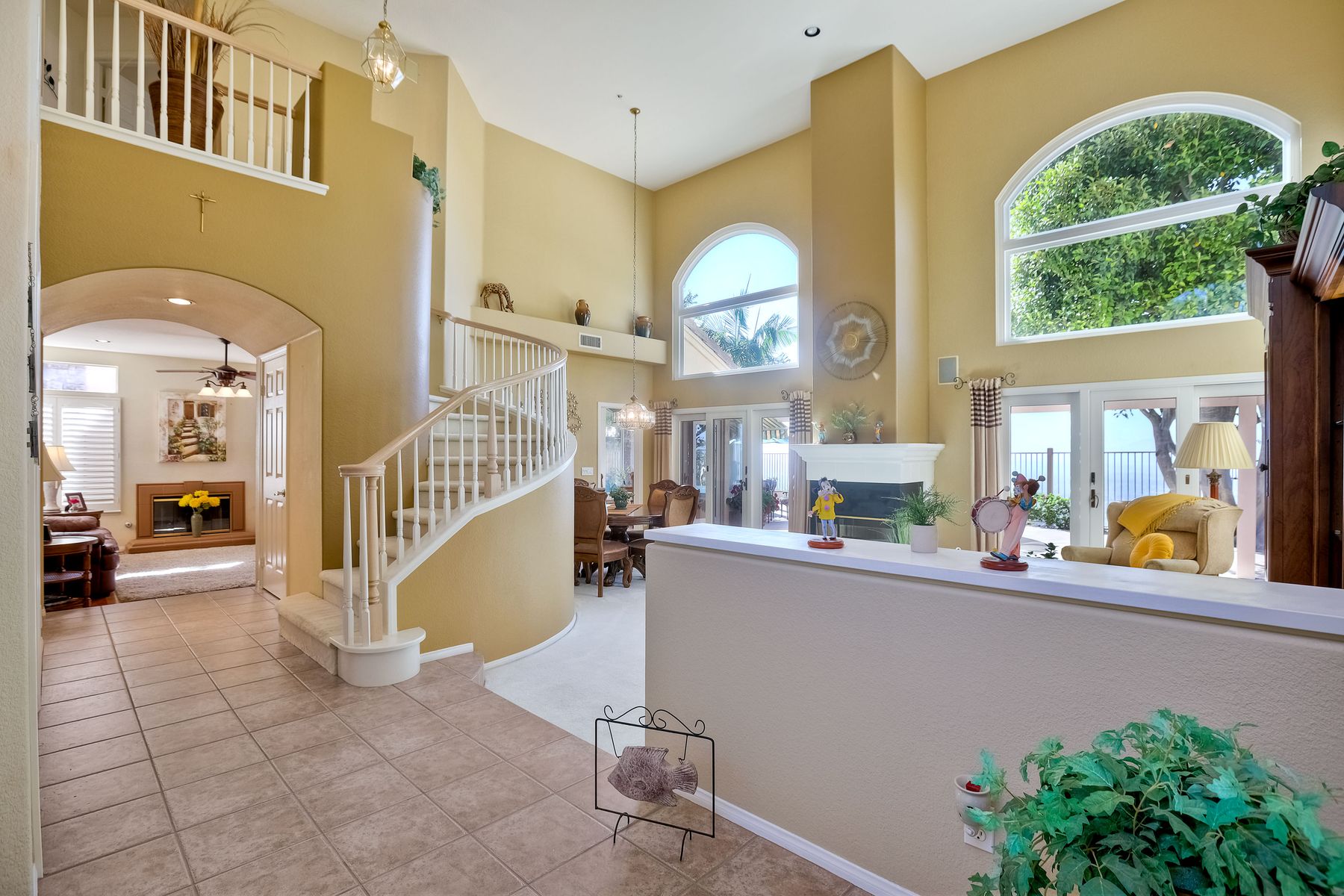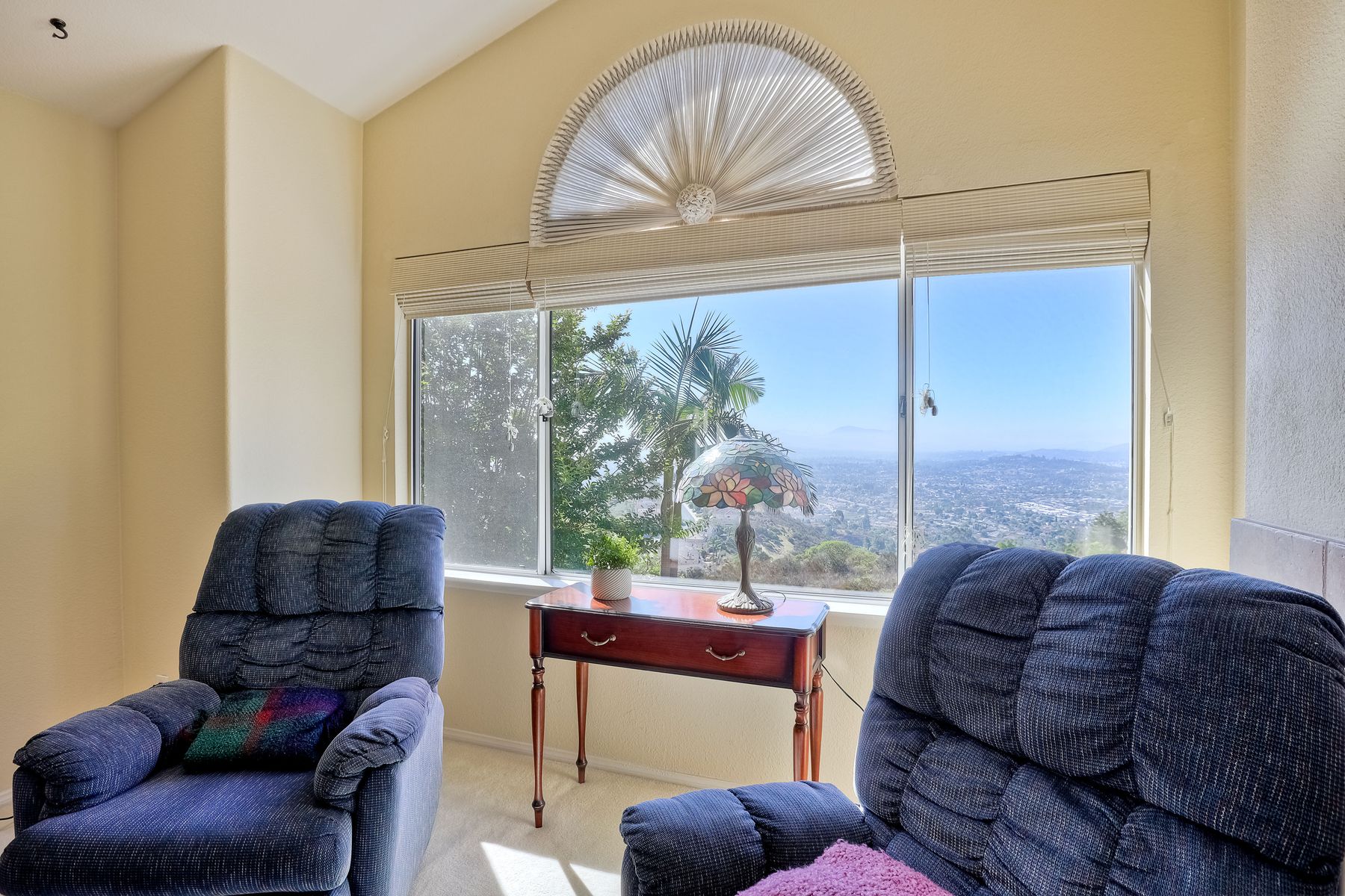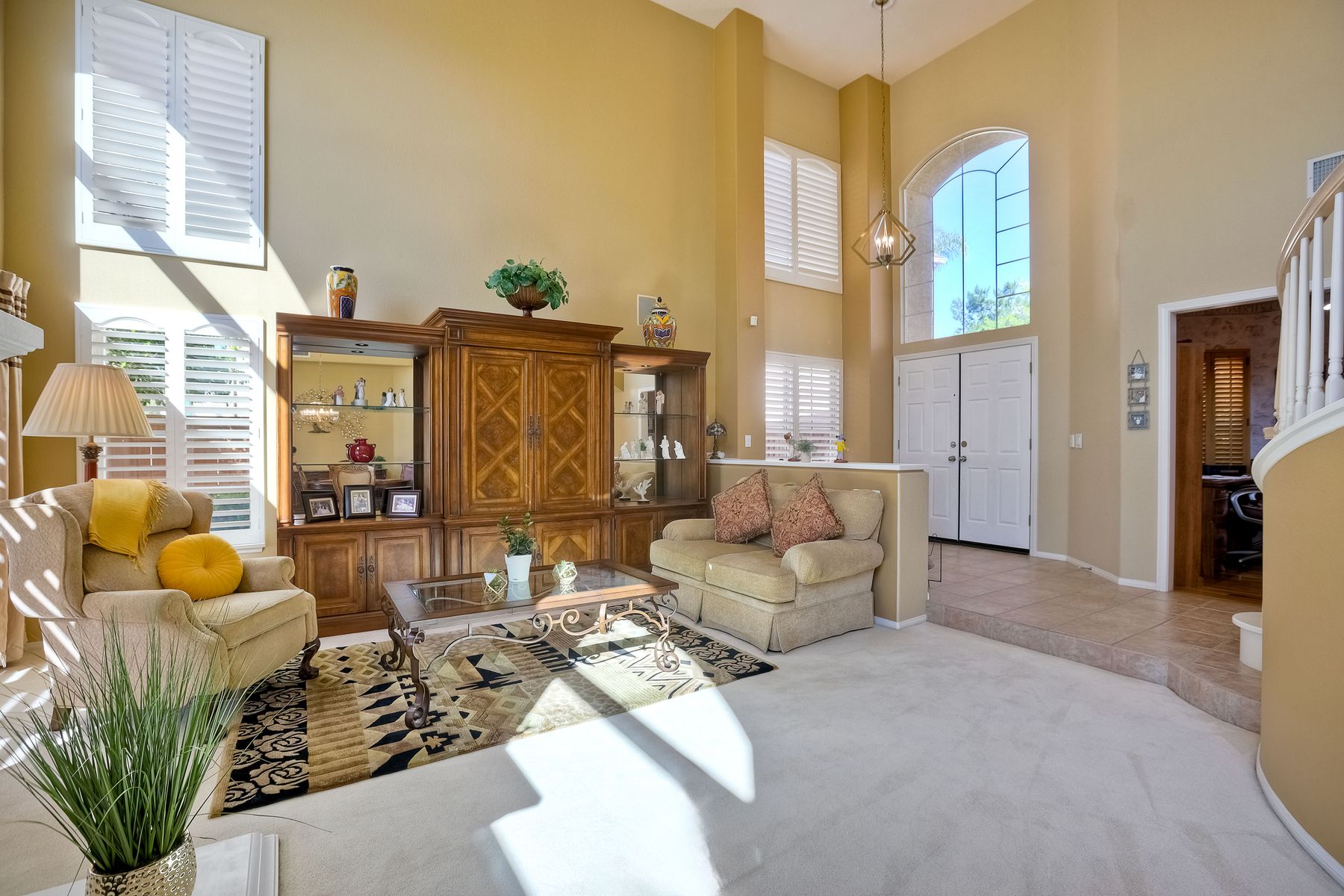 Welcome home and be prepared to have the panoramic views take your breath every day! This beautiful pride of ownership home is located in the guard gated community of Emerald Heights. As you enter the home through the double door entry you'll see the beautiful staircase, the light and bright home and enjoy the views through the high arched windows. This four bedroom three full bath home, enjoys the primary bedroom upstairs, along with two additional bedrooms and with a first floor bedroom that is presently configured as an office. The spacious primary suite enjoys the incredible views, a huge mirrored closet area, dual vanities, makeup/dressing area, soaking tub and separate Glass Block shower. The two additional bedrooms upstairs have an Hollywood style Jack & Jill bathroom. You'll be inspired to cook in this gourmet kitchen with custom cabinetry, granite countertops, and newer stainless steel appliances. You'll be a part of the party with this great room style area that includes an atrium breakfast nook, kitchen and family room. Start your morning with a cup of coffee taking in the spectacular view, and end your day in the jacuzzi enjoying the city light views. Step outside through the Anderson patio doors to the patio with the jacuzzi and large patio area for your entertaining pleasure. Enjoy plenty of shade under the Aluma wood cover, as well as the Retractable awning. Both the front and backyard areas are beautifully landscaped with convenient drip irrigation. The solar is leased. Enjoy resort style living in the Emerald Heights community. Get your exercise in the Olympic sized pool that is heated year round, spa, or on the pickleball, tennis and basketball courts. The little ones will have fun in the play ground, wading pool and the picnic area too! The HOA organizes events like Adult parties, Music at Sunset, Easter Egg Hunts, 4th of July parades and many many more fun activities!