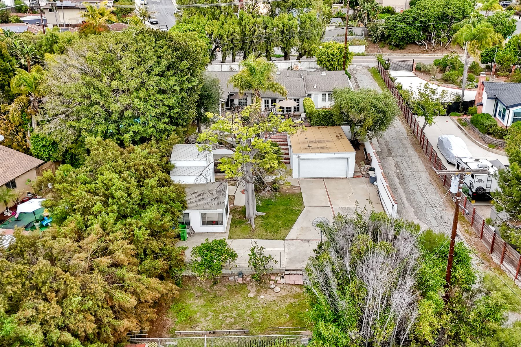 Renovators, Investors and Visionaries - an epic opportunity awaits you in the well-known and highly sought after Fire Mountain community! Nestled behind this fully gated 1/3-acre property, you will find privacy, serenity, a vintage 2384 SqFt single level home. Couple that with a detached 460 SqFt "building" which could be anything your heart desires (potential ADU). This spacious building currently serves as a storage space on the lower level and a “playroom” on the upper level. Bonus: a spacious 600 SqFt detached garage in addition to plenty of space to park a boat, an RV or extra vehicles. Multiple gardens, tiered patio spaces, mature trees, producing fruit trees and outdoor spaces that say "entertainment". This well-cared for home simply needs that person with the vision to create and the pocketbook to carry those dreams to fruition. Moments from all of the shopping necessary at the I-5 and I-78 intersection, less than 30 minutes from the countless "happenings" in the sizzling South O'Side community, not to mention the proximity to Olde Carlsbad AND the beaches in both Carlsbad and Oceanside.