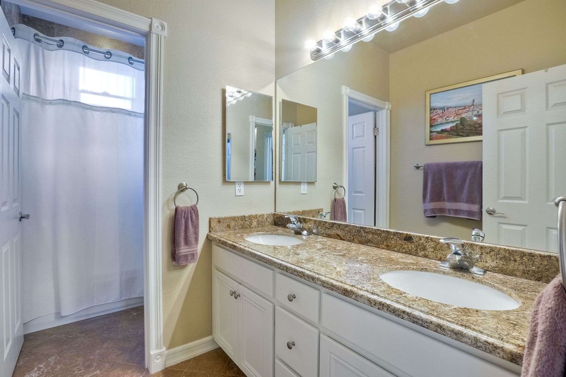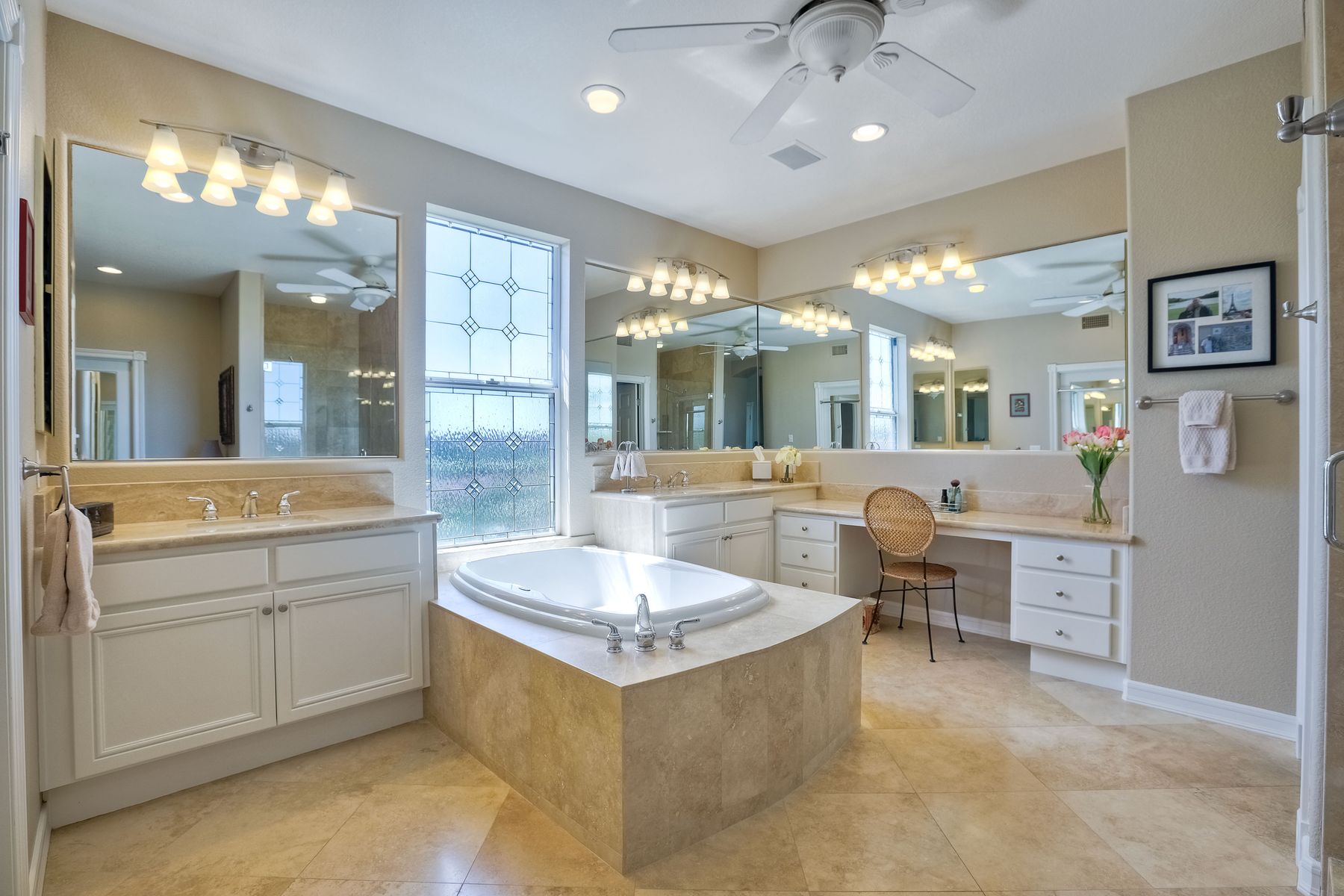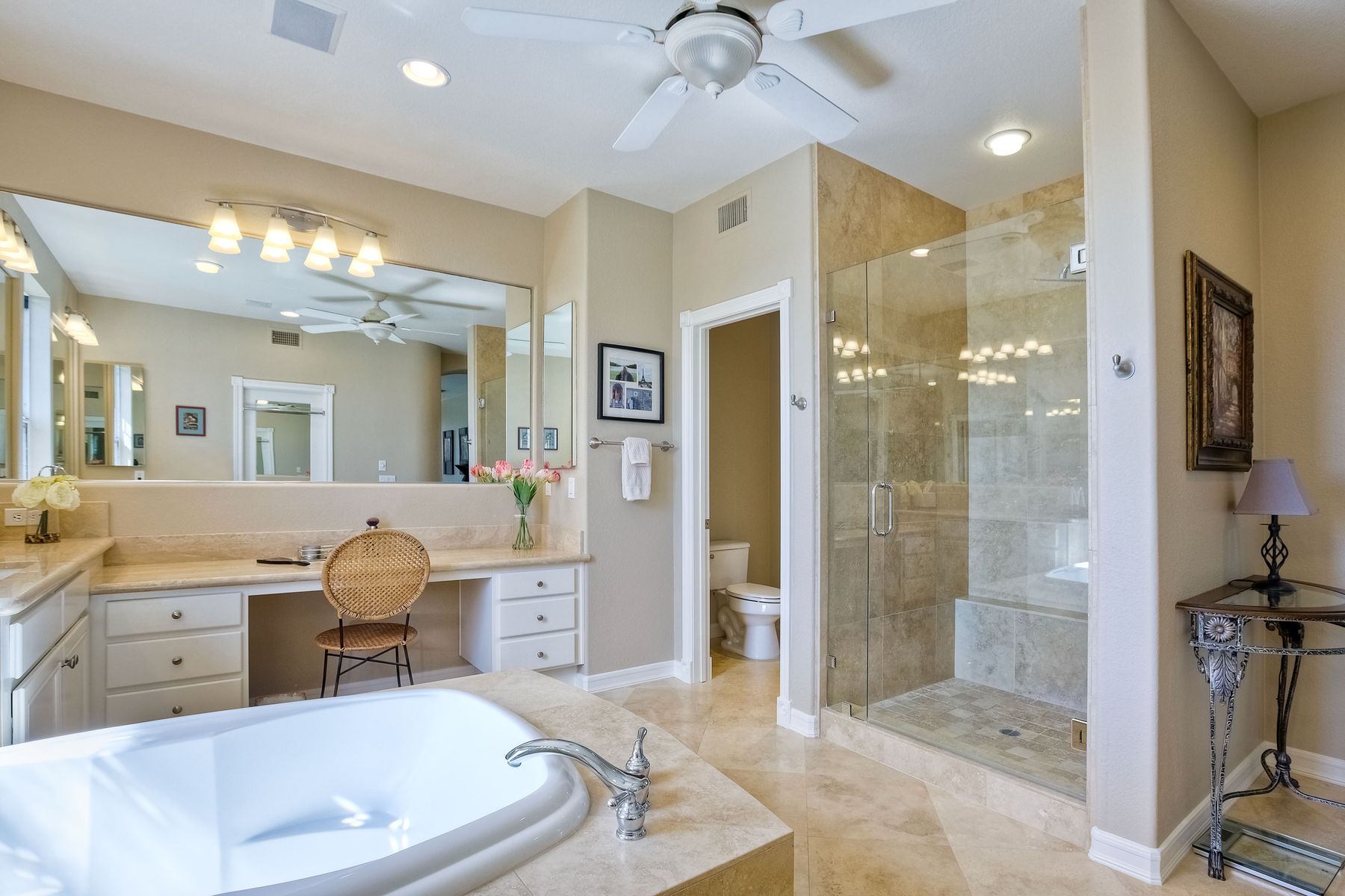 Double Sinks In Master Bath, Exhaust fan(s), Linen Closet/Storage, Low Flow Toilet(s), Separate tub and shower, Soaking Tub, Stone Counters, Vanity area, Walk-in shower, Shower, Shower in Tub, Bathtub