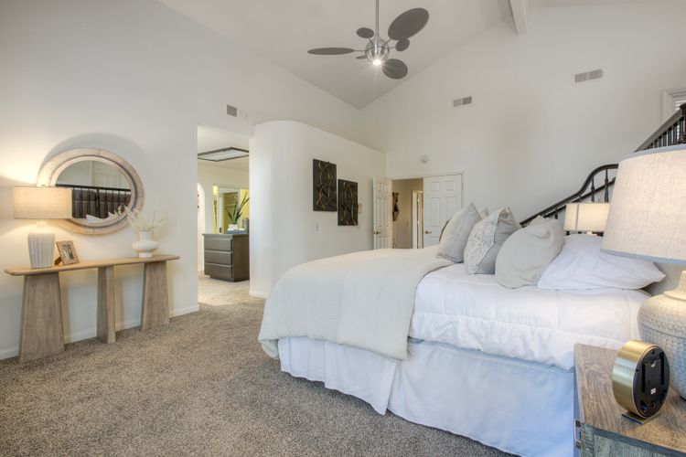 Enjoy the Southern California lifestyle in your backyard oasis — complete with a sparkling pool and spa, lush palm trees, and panoramic fairway views. The oversized, deep garage provides plenty of room for vehicles and is large enough to store a boat and golf cart... a perfect fit for life in this lake and golf community.