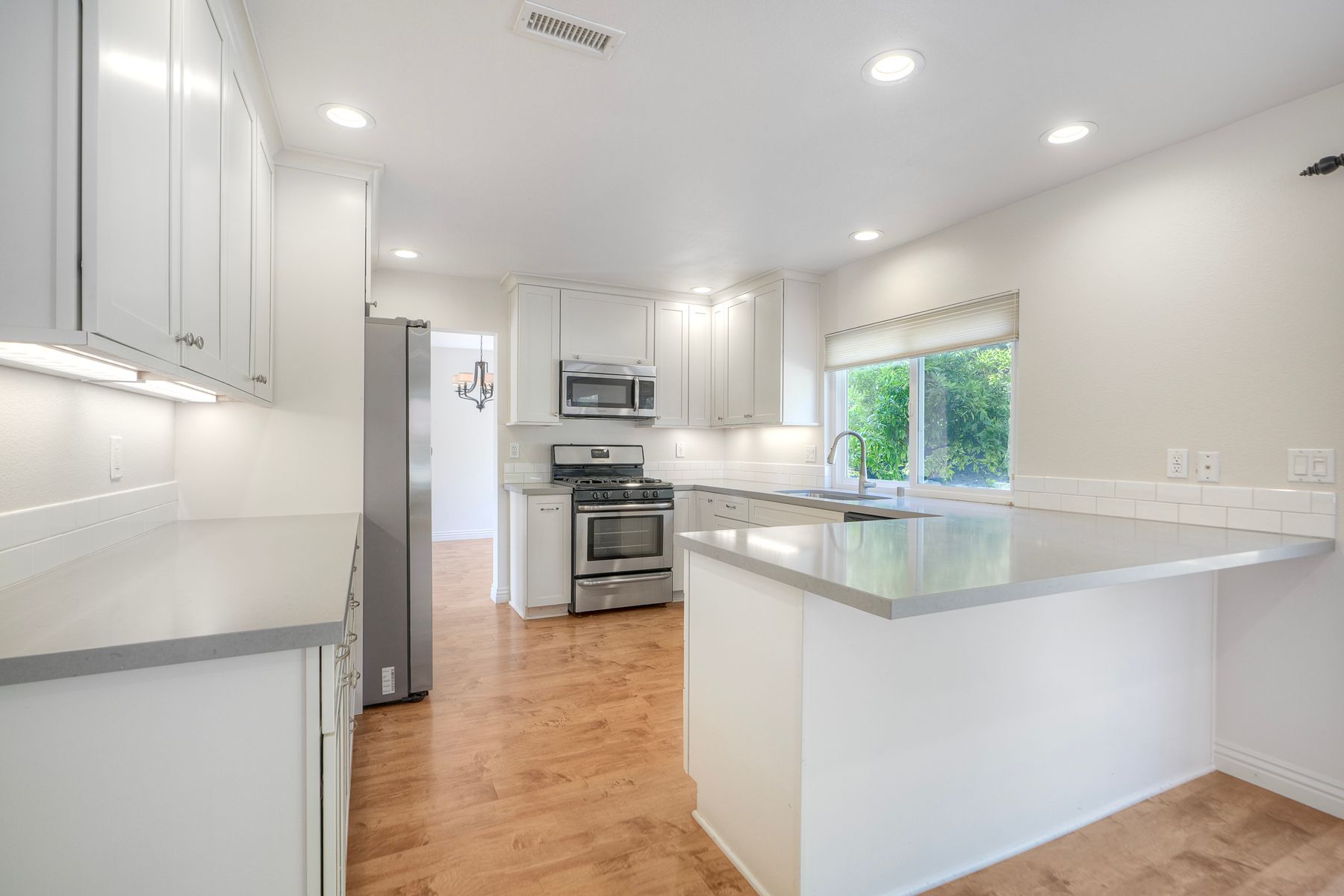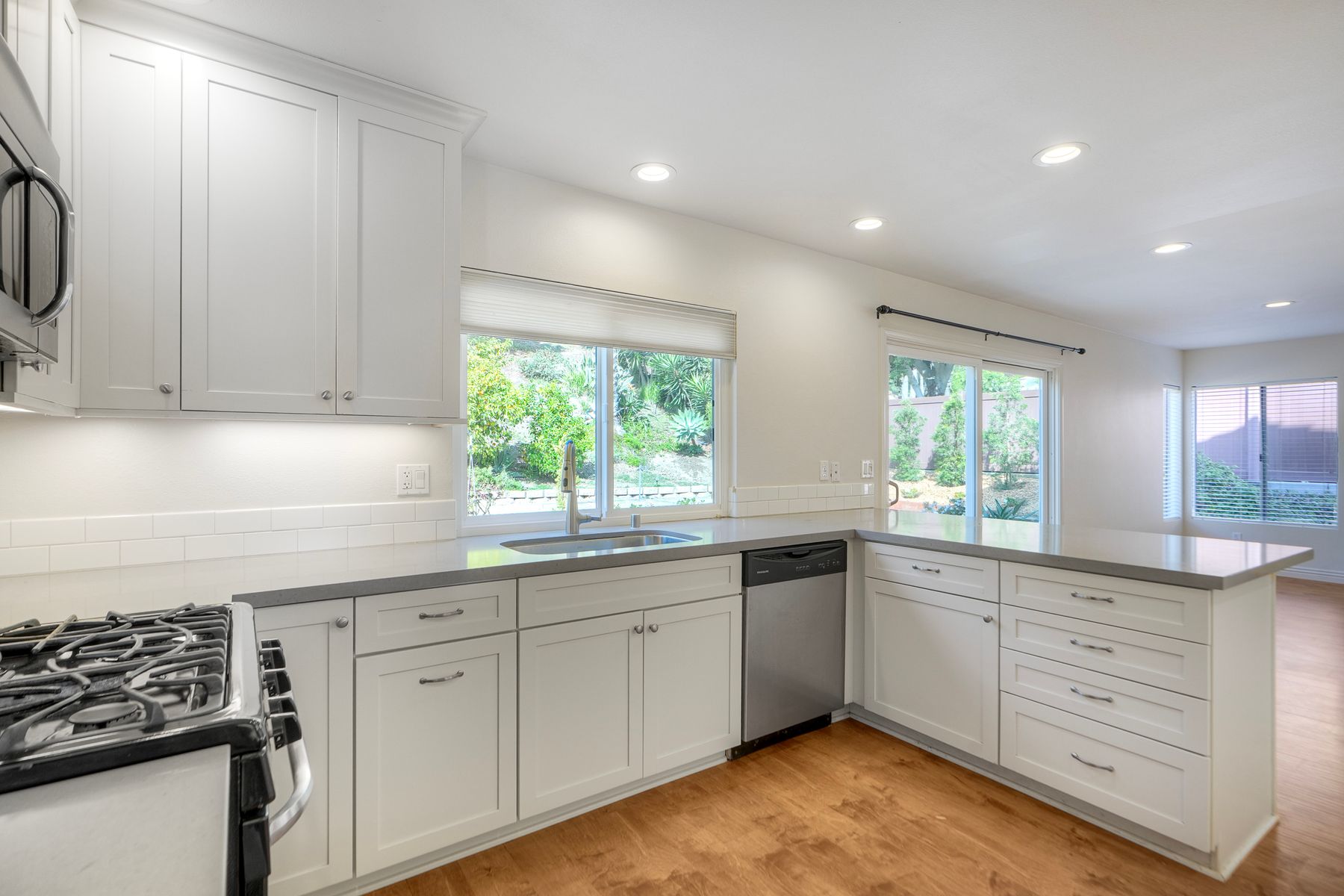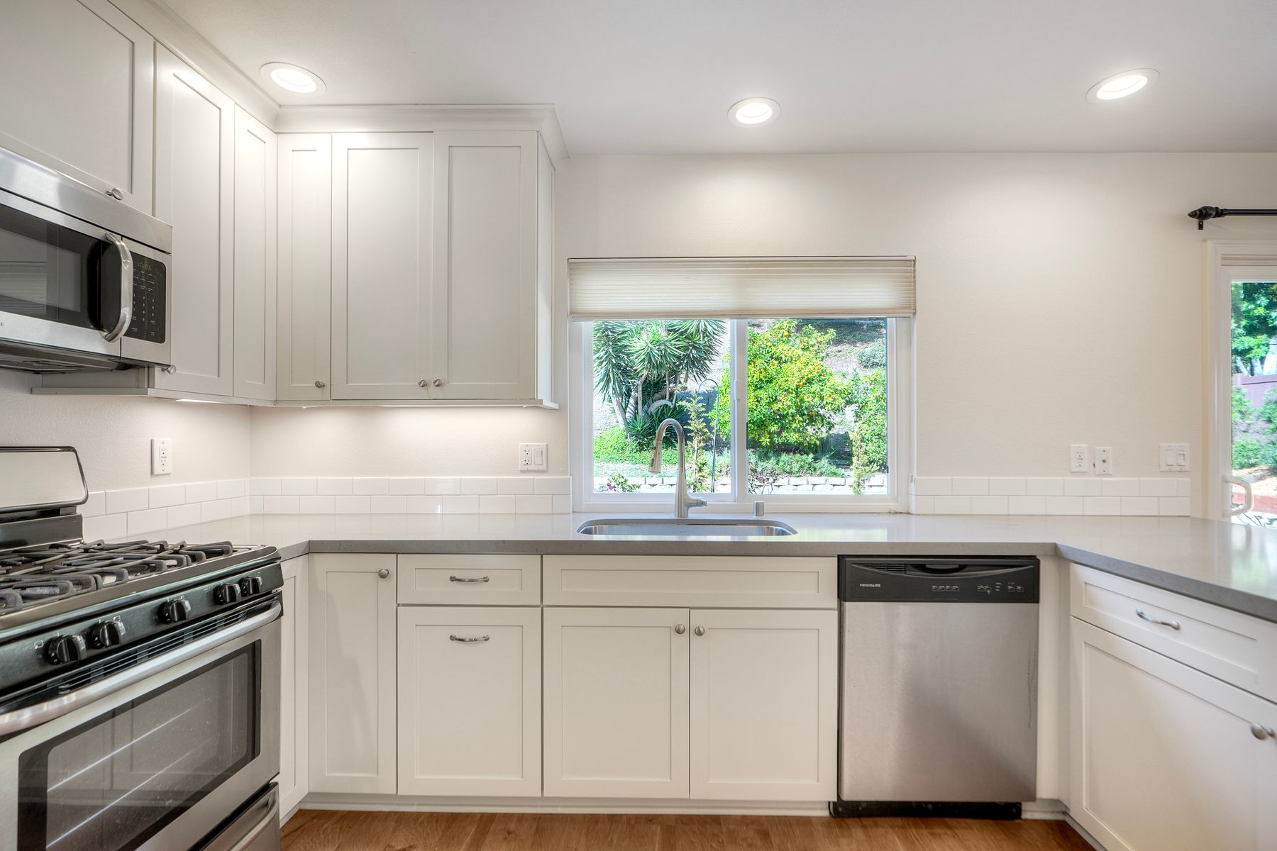The kitchen, centrally located between the dining room and family room, features updates including white cabinetry, grey quartz countertops and modern sink overlooking the backyard. The breakfast bar opens into the family room, which includes a fireplace, as well as access to the half bath and laundry area.