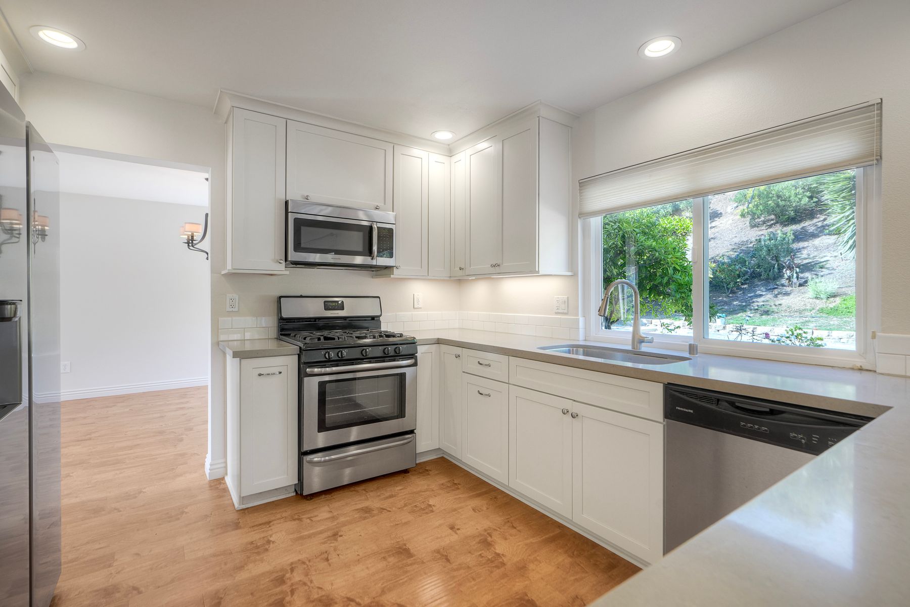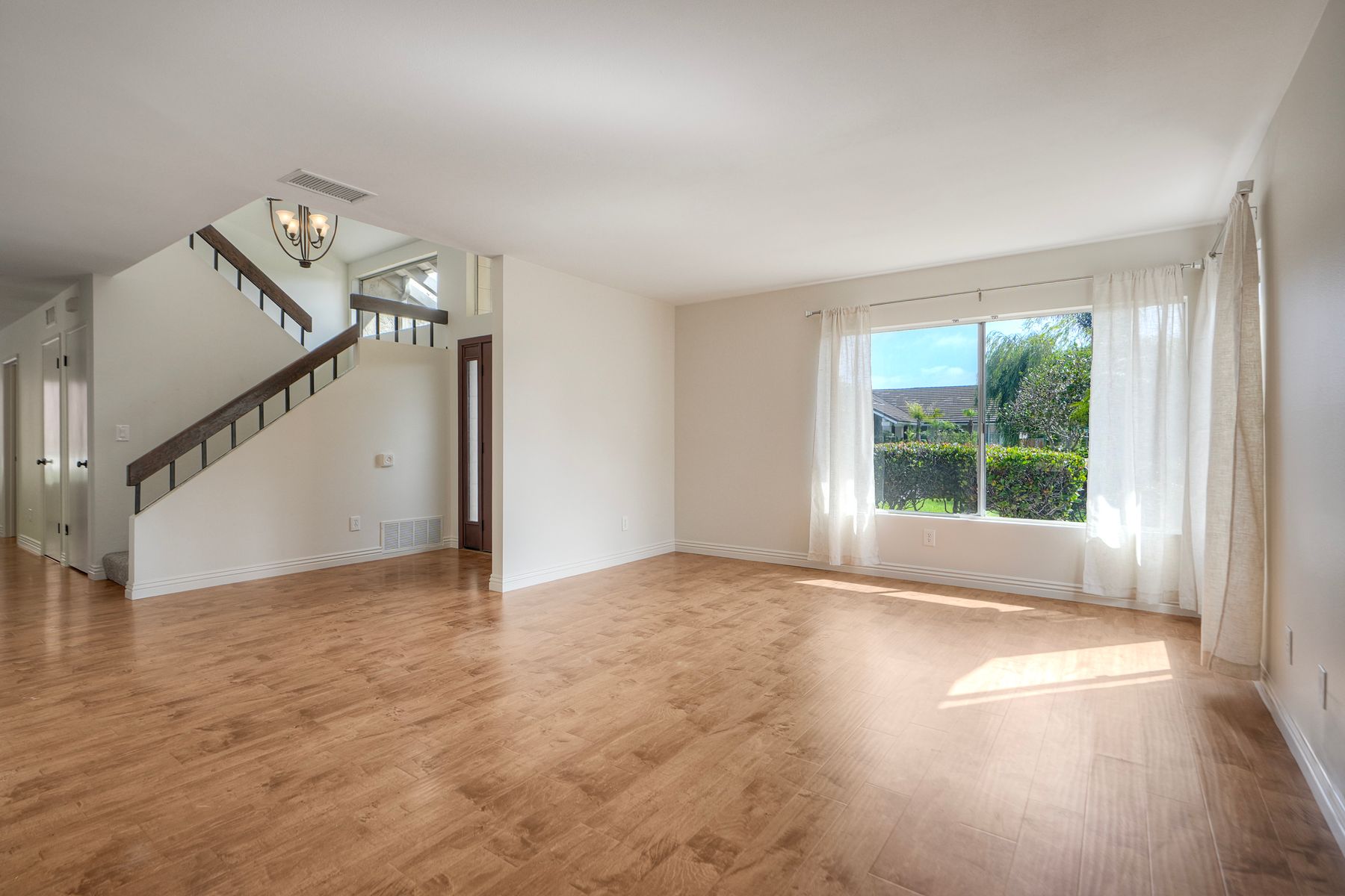 The two-story residence is located on a semi-cul-de-sac, just half a block from a park and conveniently close to shopping centers. Upon entry, the newer front door with privacy side window leads to elegant honey-colored wood flooring. The formal living and dining rooms are positioned to the left, while the family room and staircase to the upper level are to the right.