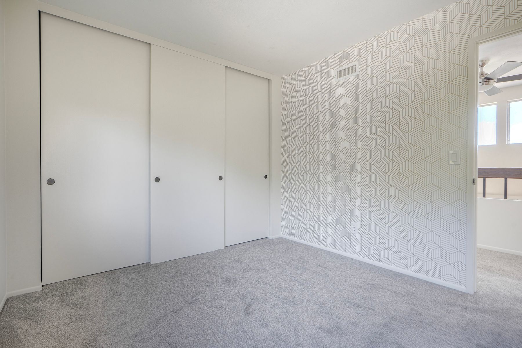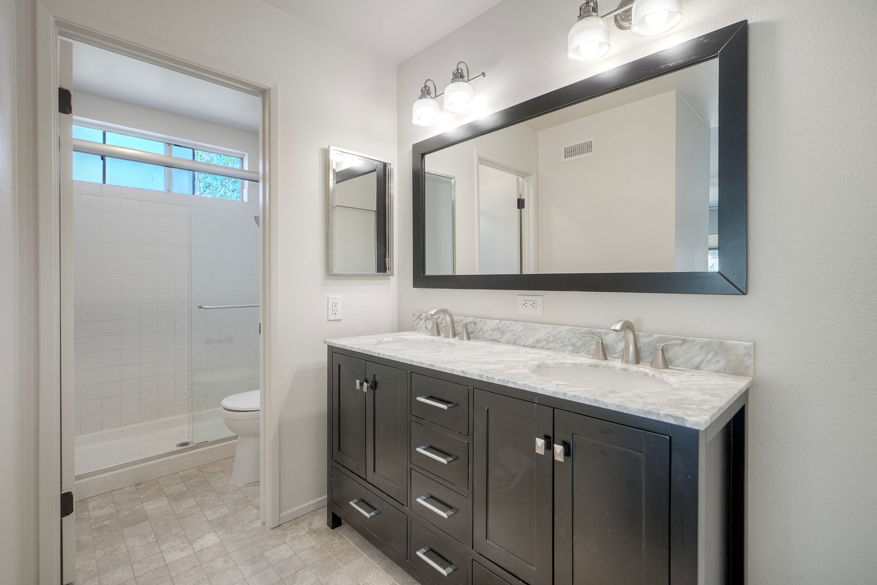 Upstairs, there are four bedrooms. Three are positioned to the left alongside a fully remodeled bathroom. The master bedroom and en-suite bath are on the right; the master bath has been updated with tile, an espresso double-sink vanity with marble countertop, mirrors, and lighting fixtures.