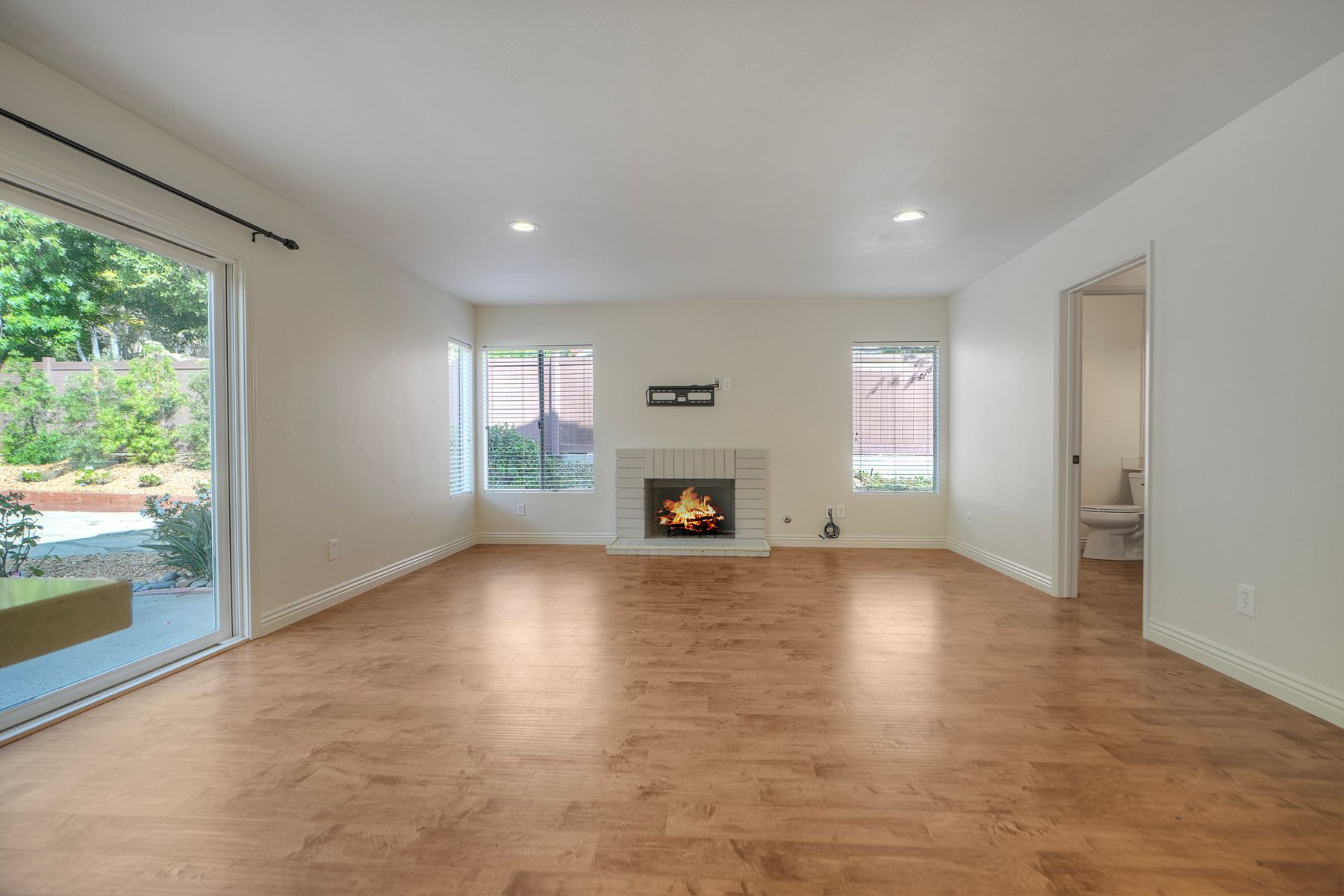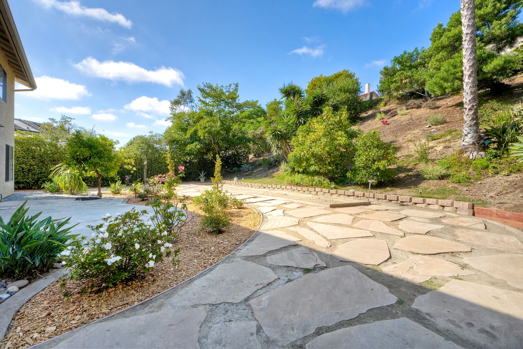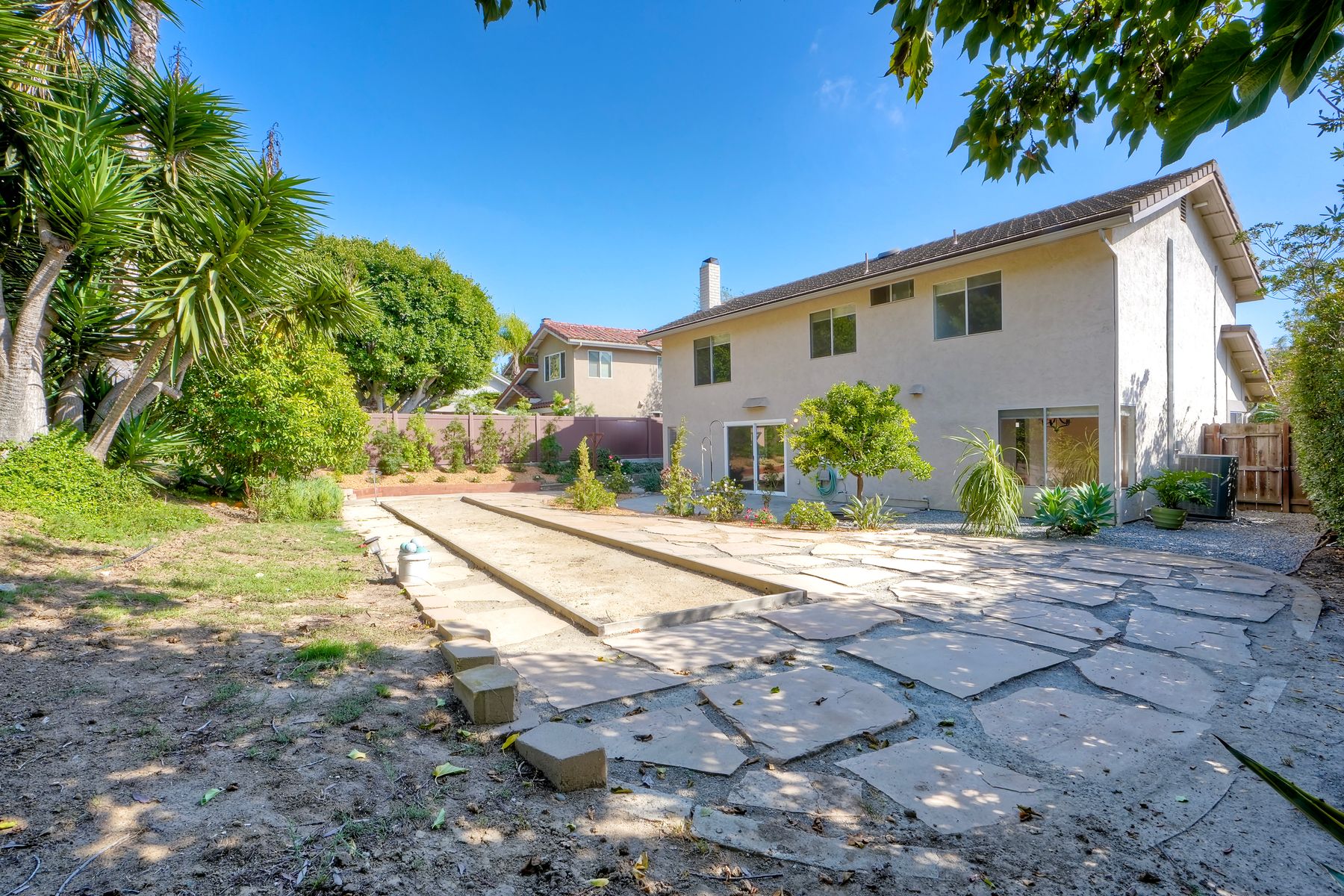 The family room leads to a spacious, fenced backyard with a concrete patio, bocci ball court, and landscaped hill, creating a private retreat.