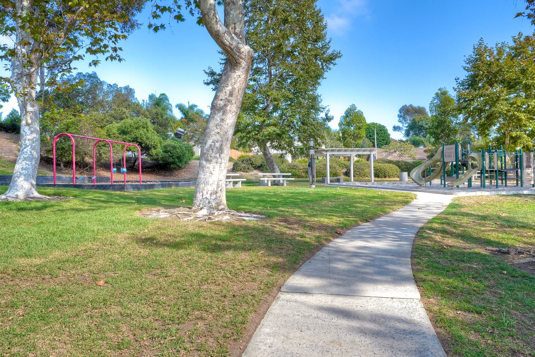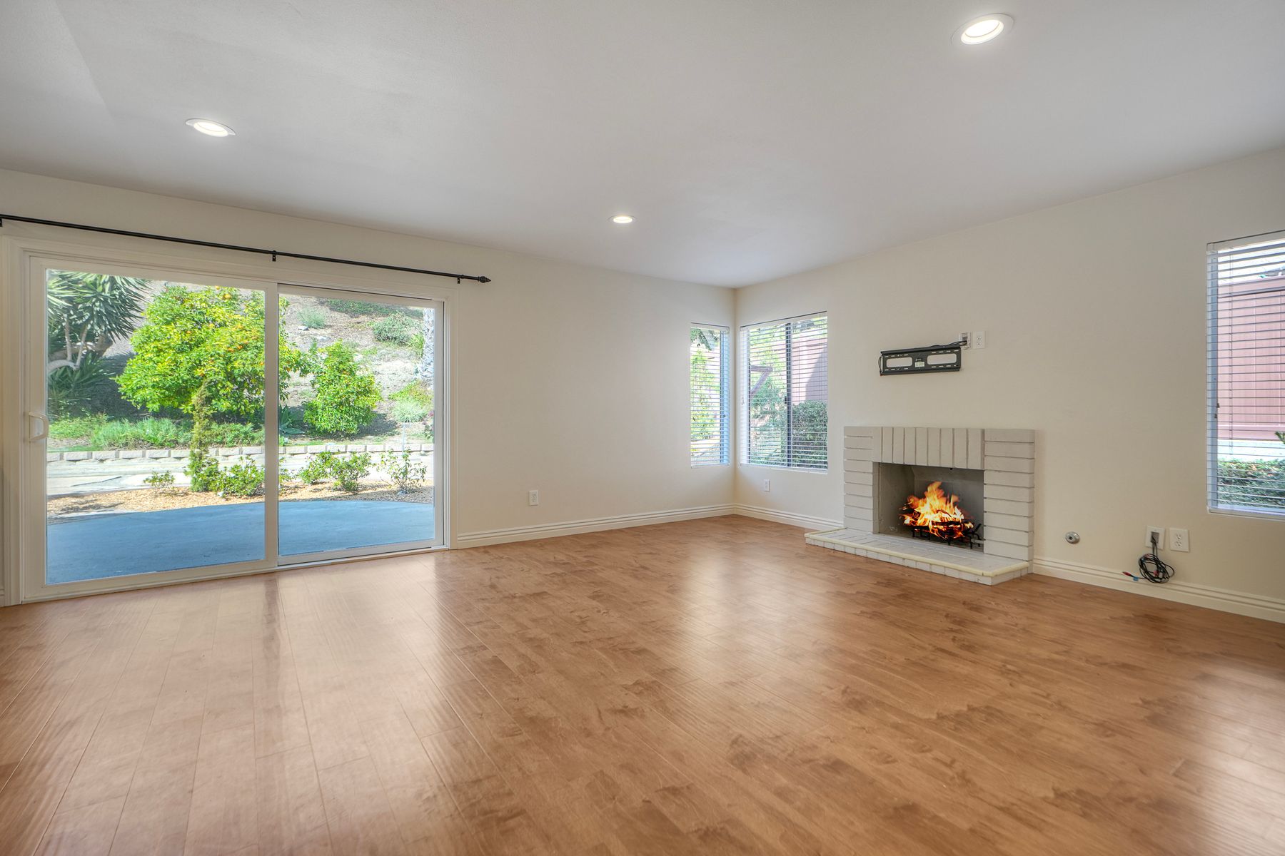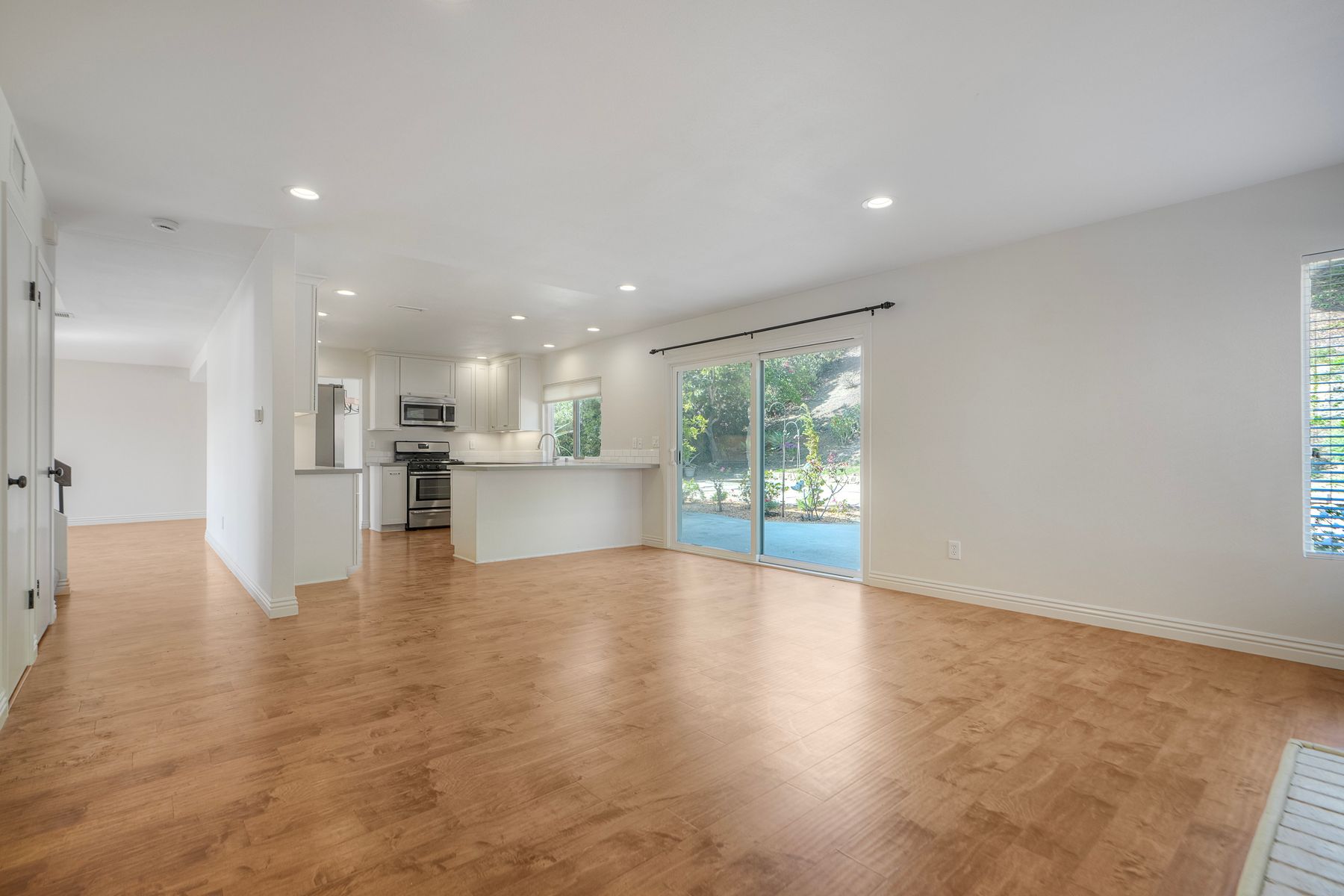 The family room leads to a spacious, fenced backyard with a concrete patio, bocci ball court, and landscaped hill, creating a private retreat.
