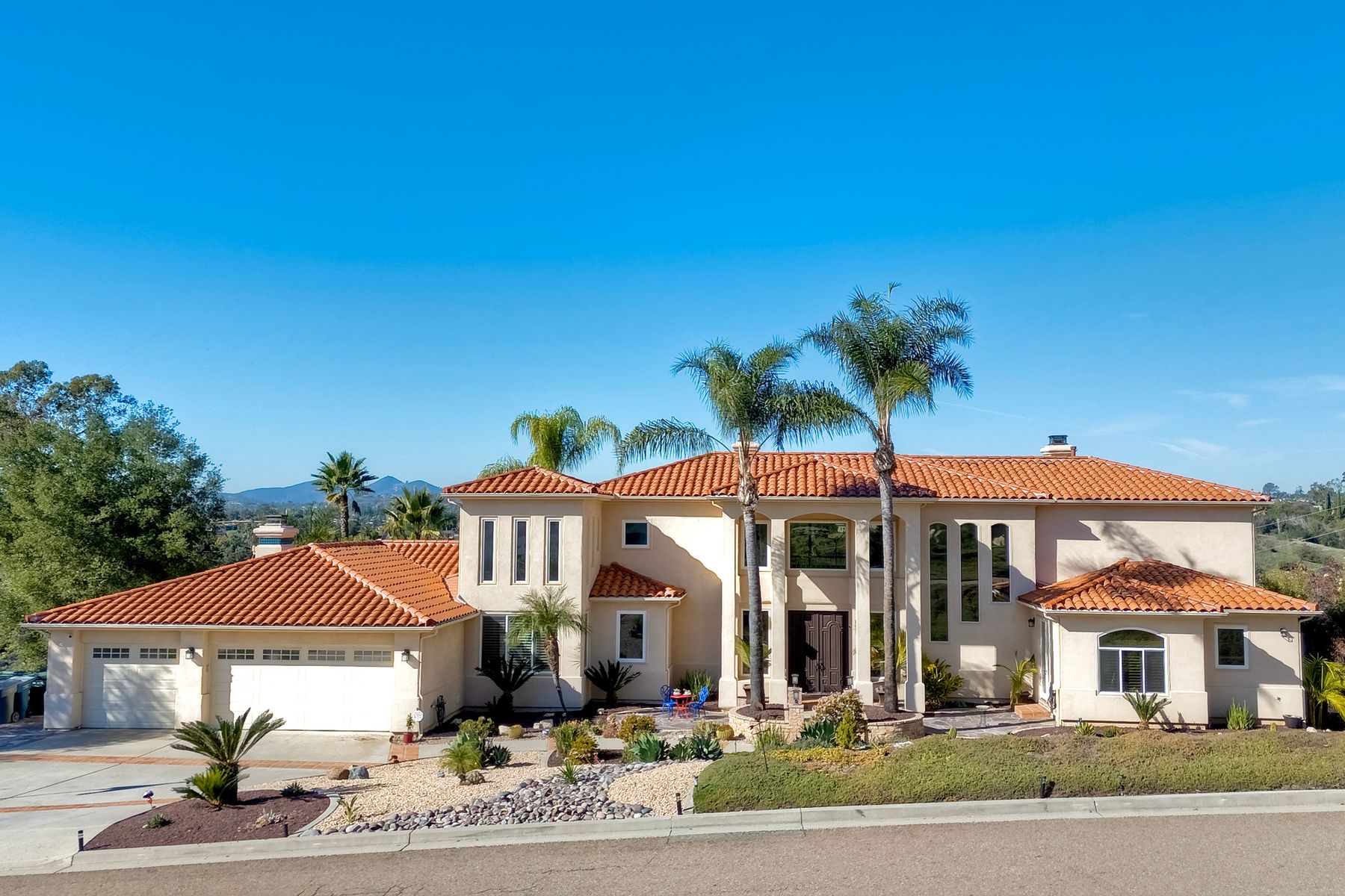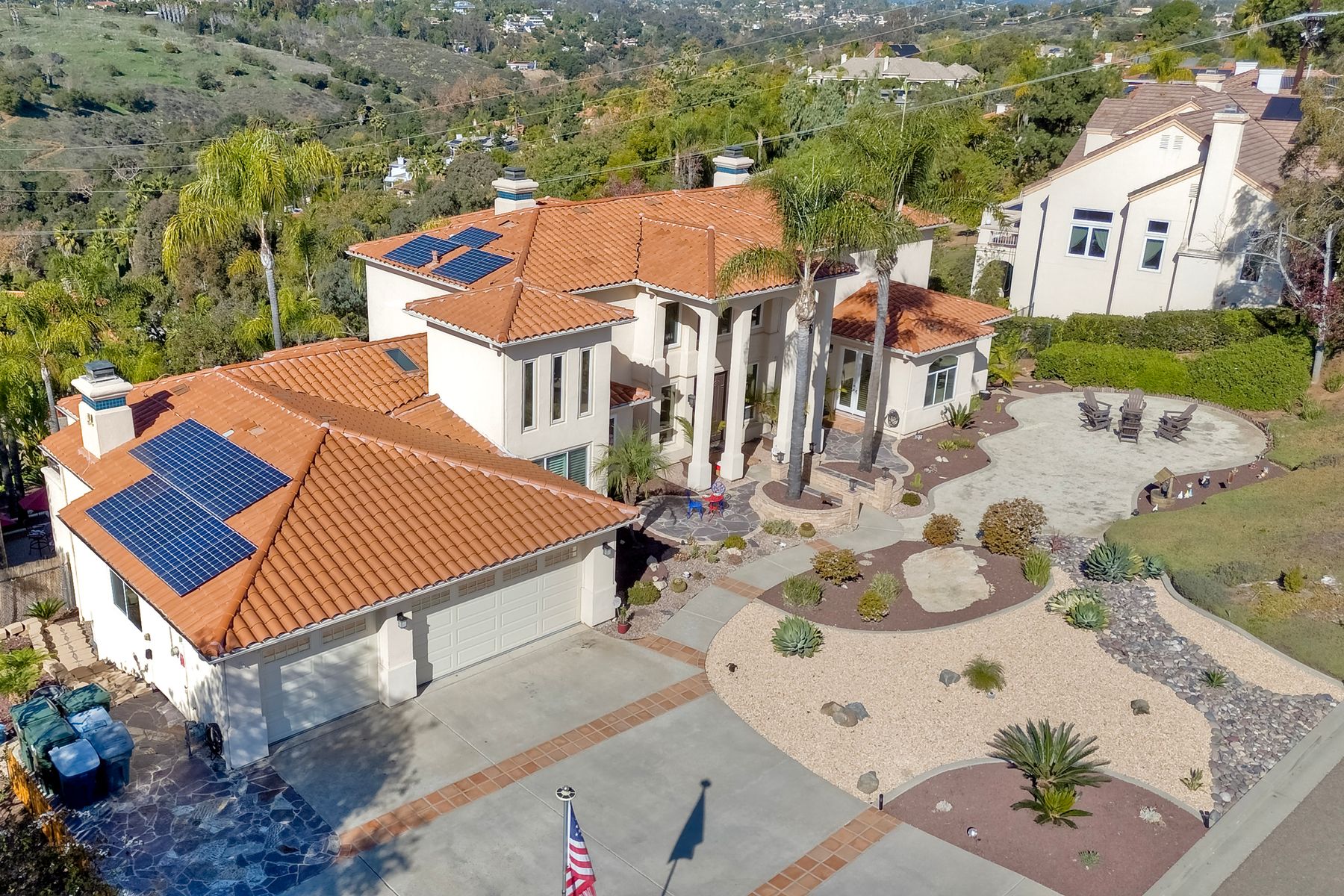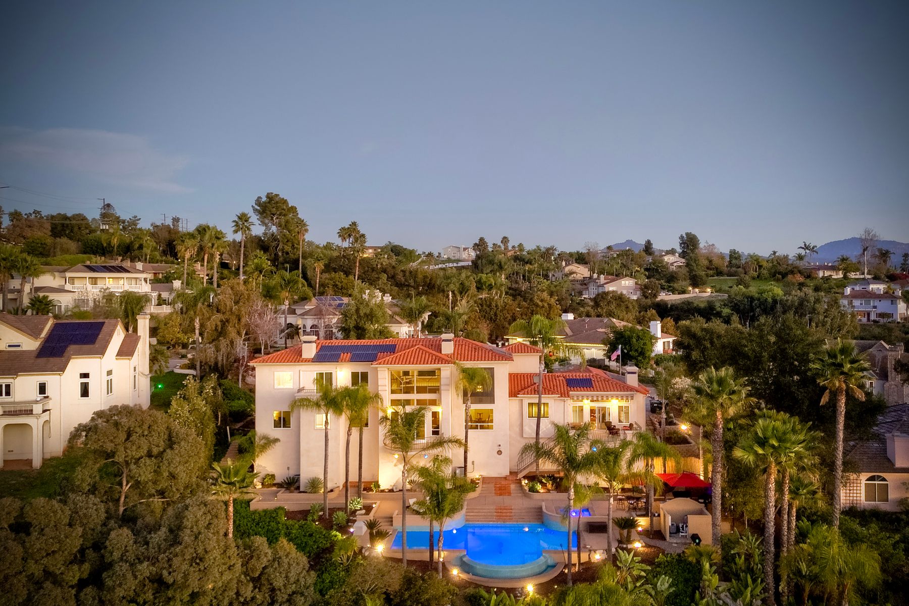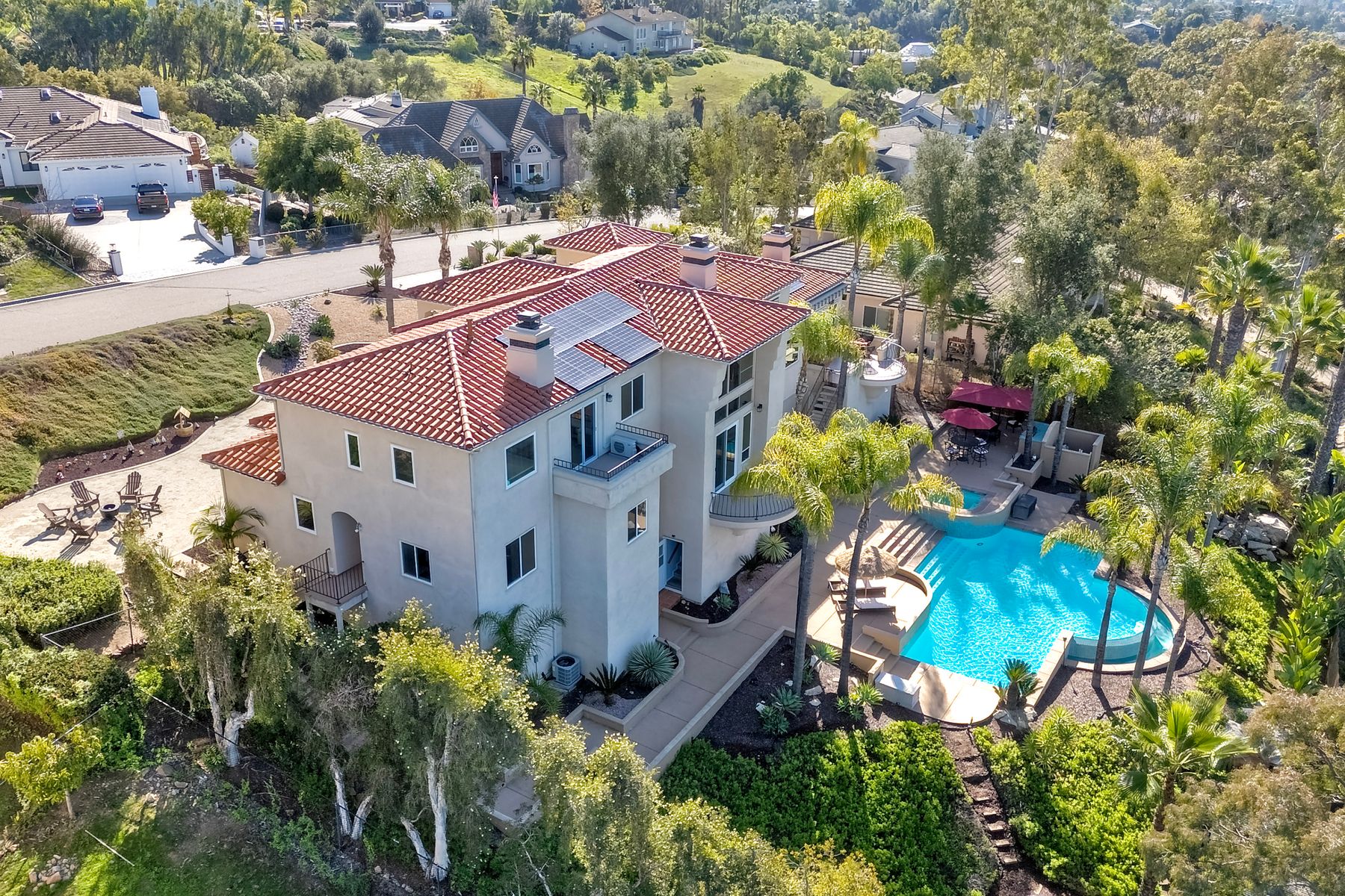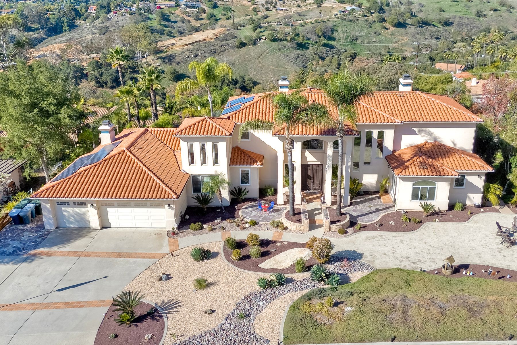 This Canyon View Estates home is situated on a ½-acre elevated premium lot, offering breathtaking panoramic sunset views. With over $250,000 in upgrades, this meticulously maintained residence is truly move-in ready. Notable improvements include a 27-panel owned solar system installed in 2018, newer windows, a new dual-fuel heat pump and air conditioning system, and new roof tiles and underlayment with added bird stops and fire-resistant paper installed July 2025. Additional highlights include split mini heat/air units in the primary bedroom and garage, solar window tinting to reduce summer heat, drought-tolerant landscaping, plantation shutters, travertine and hardwood flooring, granite countertops, a built-in refrigerator, wainscoting, and three fireplaces with glass doors. The home also features electric solar fabric blinds on rear windows, an awning over the kitchen deck, a bonus loft/office area, and a spacious triple garage with quiet motors and MyQ remote access. All garage doors are insulated. Upon entry, you’re greeted by soaring 19-foot ceilings, expansive living spaces, and large picture windows that flood the home with natural light. The primary suite is a true retreat, featuring vaulted ceilings with exposed beams, a dual-sided fireplace, private view balcony, generous walk-in closet, dual vanities, soaking tub, and a walk-in shower with frameless glass enclosure. The backyard is designed for resort-style living, showcasing a vanishing-edge salt water pool and spa, lush tropical landscaping, built-in barbecue, and expansive deck areas ideal for entertaining or relaxing. A downstairs bathroom provides convenient access for poolside enjoyment. Additional features include a fully wired alarm system, smart smoke detectors, and numerous smart-home upgrades throughout. Canyon View Estates is highly sought after for its scenic views, rolling topography, and generous lot sizes. Ideally located near Orfila Winery, San Diego Zoo Safari Park, Vineyards Golf Course, Lake Hodges, Kit Carson Park, shopping, and freeway access. Assigned schools include L.R. Green Elementary, Bear Valley Middle School, and San Pasqual High School.