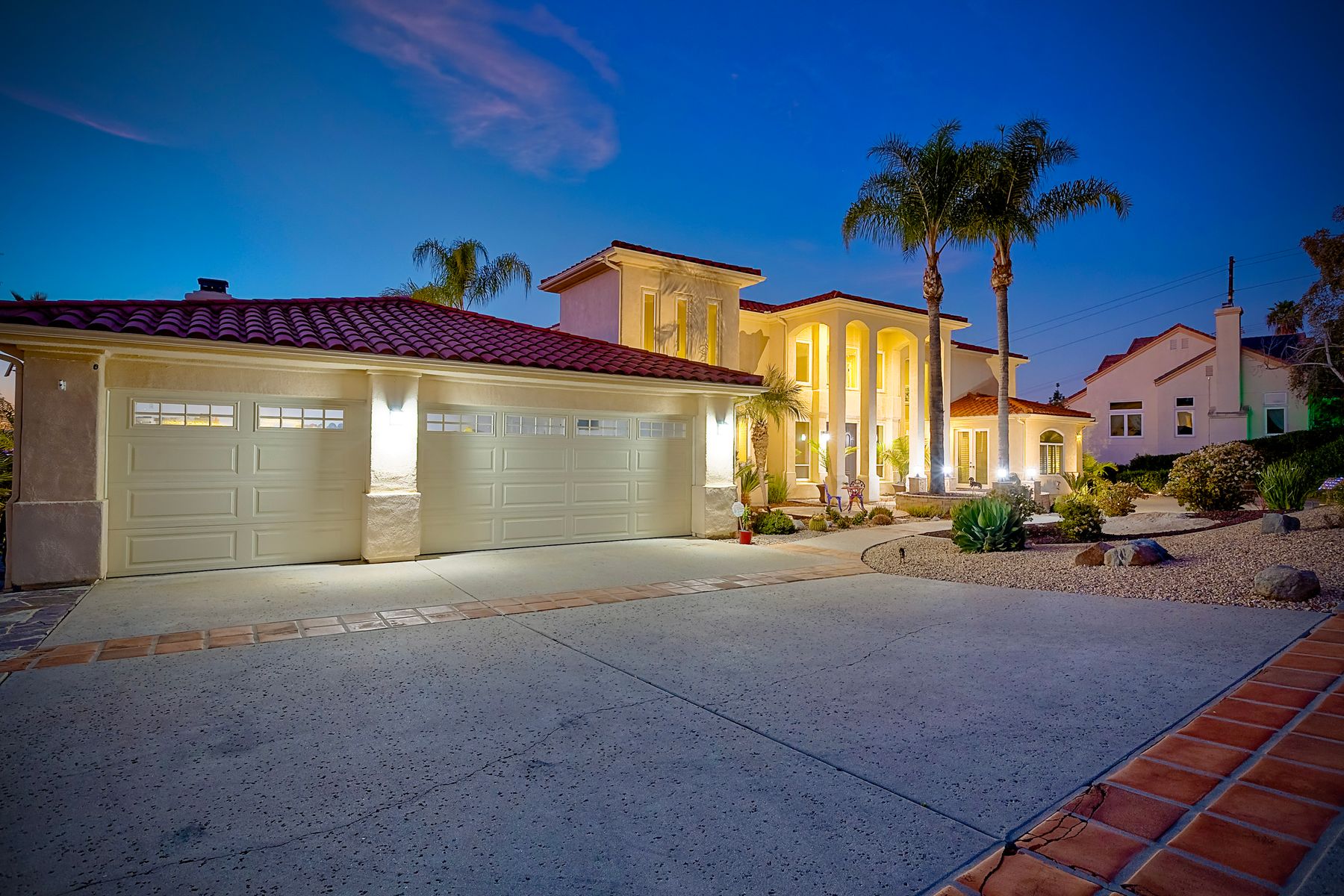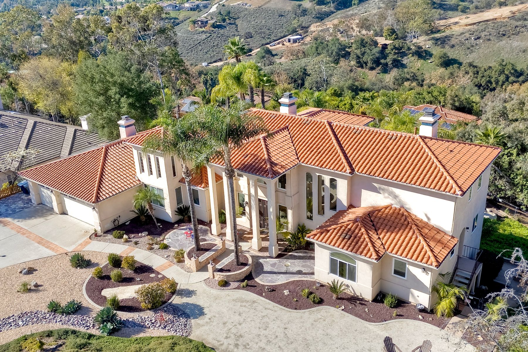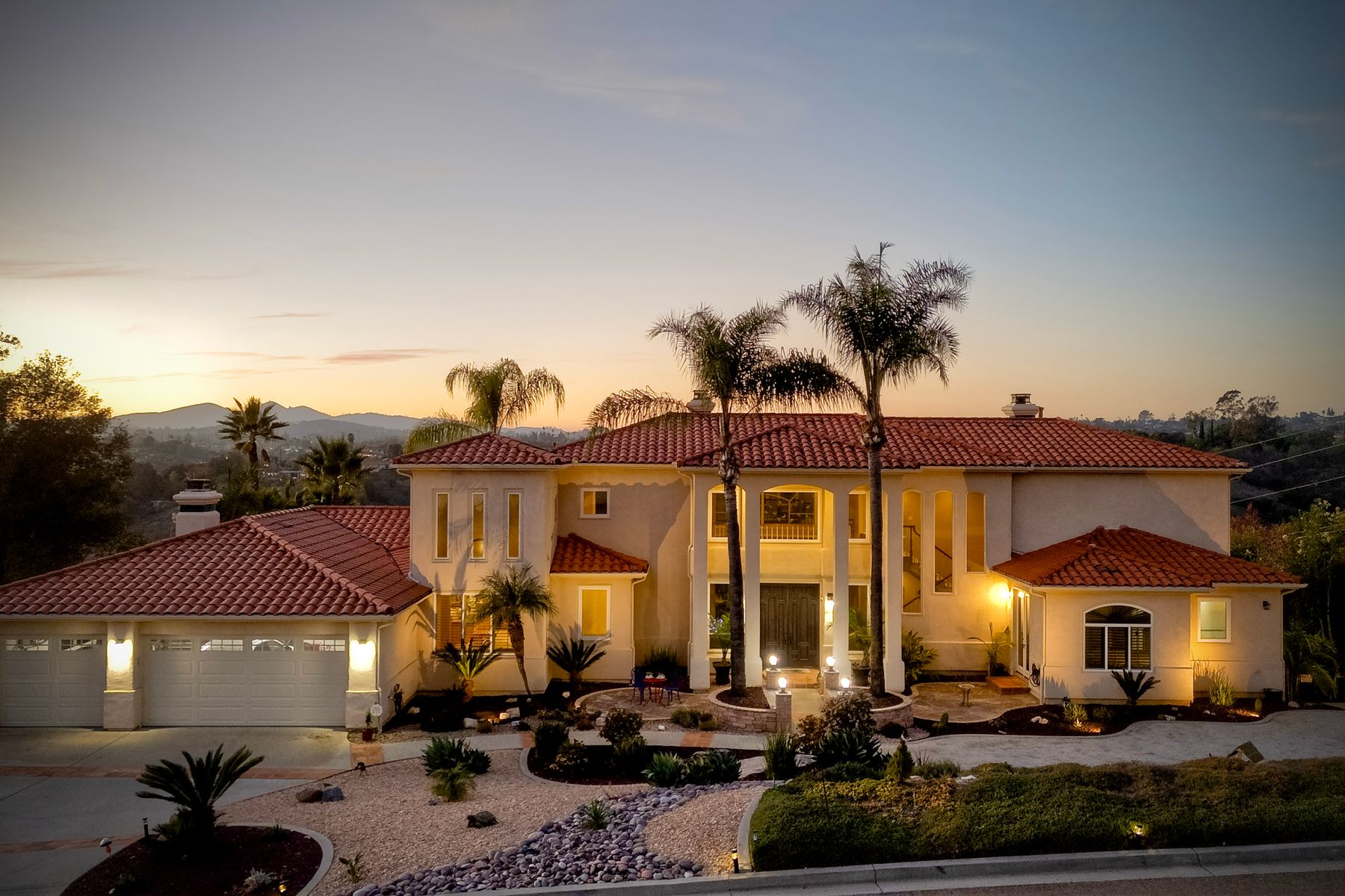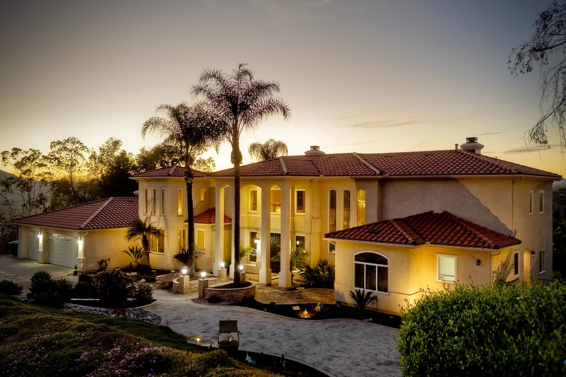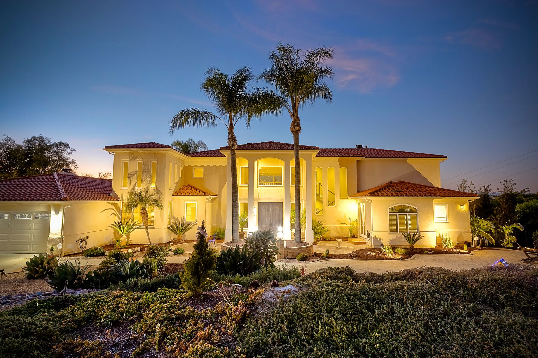 This Canyon View Estates home is situated on a ½-acre elevated premium lot, offering breathtaking panoramic sunset views. With over $250,000 in upgrades, this meticulously maintained residence is truly move-in ready. Notable improvements include a 27-panel owned solar system installed in 2018, newer windows, a new dual-fuel heat pump and air conditioning system, and new roof tiles and underlayment with added bird stops and fire-resistant paper installed July 2025. Additional highlights include split mini heat/air units in the primary bedroom and garage, solar window tinting to reduce summer heat, drought-tolerant landscaping, plantation shutters, travertine and hardwood flooring, granite countertops, a built-in refrigerator, wainscoting, and three fireplaces with glass doors. The home also features electric solar fabric blinds on rear windows, an awning over the kitchen deck, a bonus loft/office area, and a spacious triple garage with quiet motors and MyQ remote access. All garage doors are insulated. Upon entry, you’re greeted by soaring 19-foot ceilings, expansive living spaces, and large picture windows that flood the home with natural light. The primary suite is a true retreat, featuring vaulted ceilings with exposed beams, a dual-sided fireplace, private view balcony, generous walk-in closet, dual vanities, soaking tub, and a walk-in shower with frameless glass enclosure. The backyard is designed for resort-style living, showcasing a vanishing-edge salt water pool and spa, lush tropical landscaping, built-in barbecue, and expansive deck areas ideal for entertaining or relaxing. A downstairs bathroom provides convenient access for poolside enjoyment. Additional features include a fully wired alarm system, smart smoke detectors, and numerous smart-home upgrades throughout. Canyon View Estates is highly sought after for its scenic views, rolling topography, and generous lot sizes. Ideally located near Orfila Winery, San Diego Zoo Safari Park, Vineyards Golf Course, Lake Hodges, Kit Carson Park, shopping, and freeway access. Assigned schools include L.R. Green Elementary, Bear Valley Middle School, and San Pasqual High School.