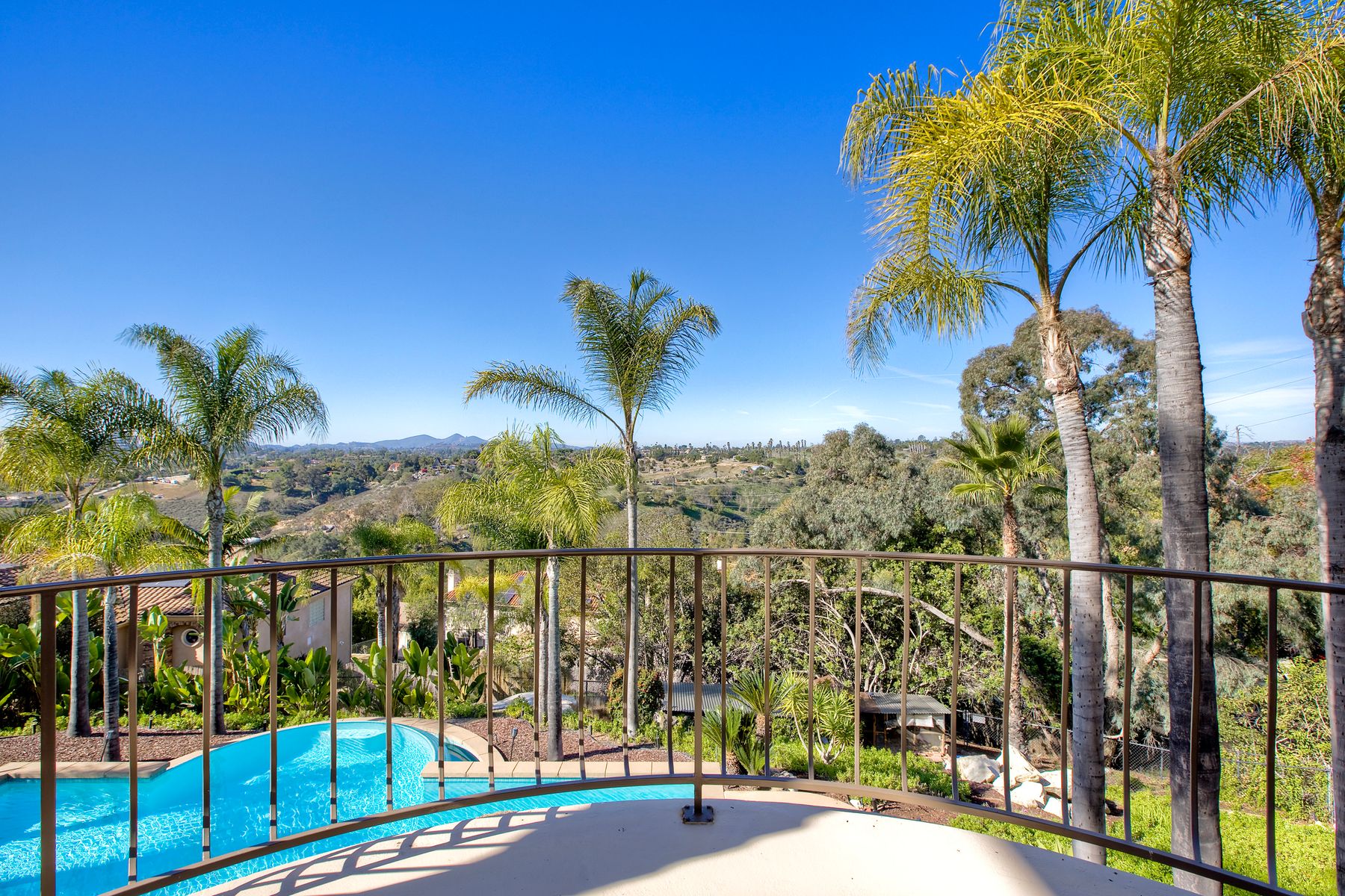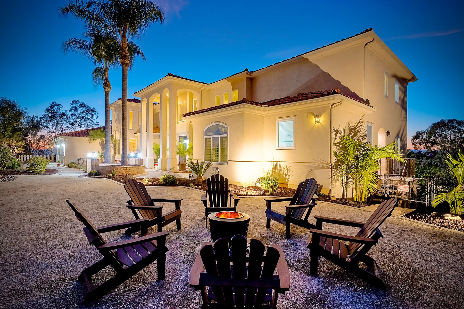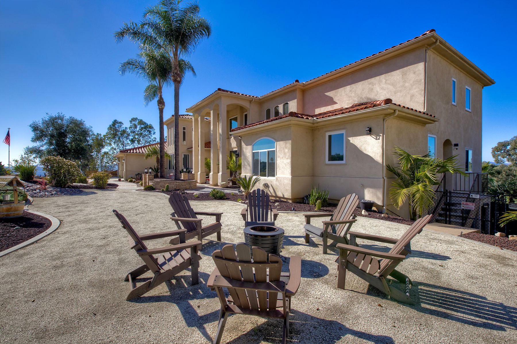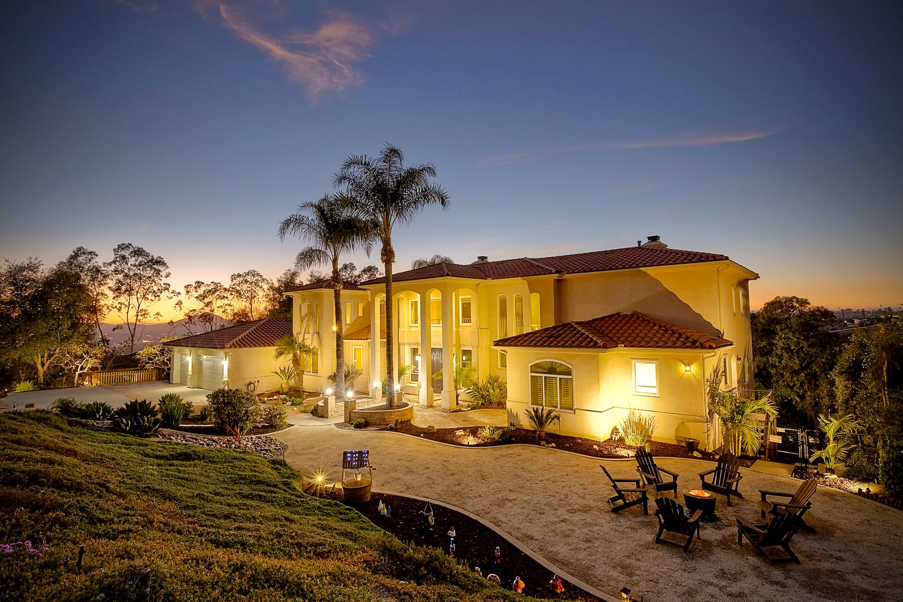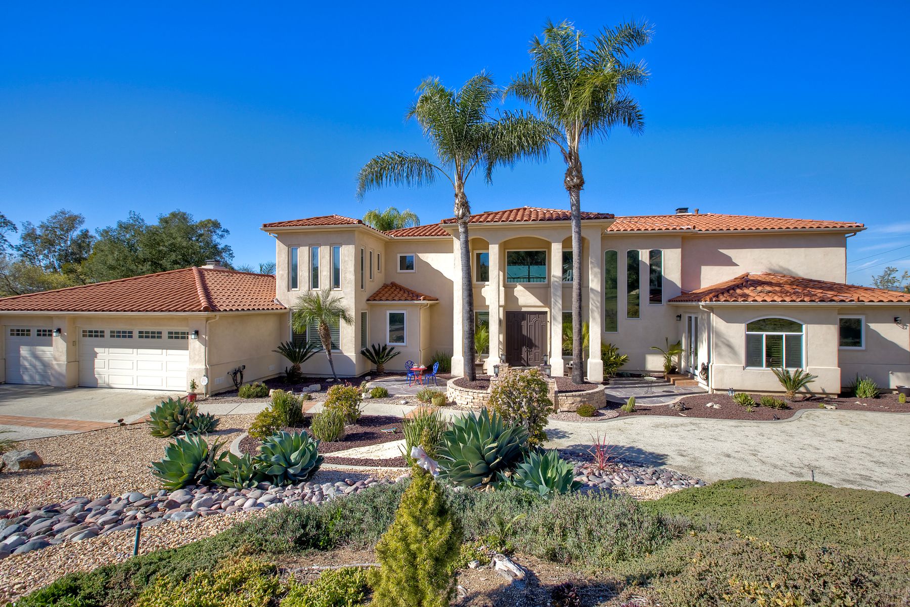 This Canyon View Estates home is situated on a ½-acre elevated premium lot, offering breathtaking panoramic sunset views. With over $250,000 in upgrades, this meticulously maintained residence is truly move-in ready. Notable improvements include a 27-panel owned solar system installed in 2018, newer windows, a new dual-fuel heat pump and air conditioning system, and new roof tiles and underlayment with added bird stops and fire-resistant paper installed July 2025. Additional highlights include split mini heat/air units in the primary bedroom and garage, solar window tinting to reduce summer heat, drought-tolerant landscaping, plantation shutters, travertine and hardwood flooring, granite countertops, a built-in refrigerator, wainscoting, and three fireplaces with glass doors. The home also features electric solar fabric blinds on rear windows, an awning over the kitchen deck, a bonus loft/office area, and a spacious triple garage with quiet motors and MyQ remote access. All garage doors are insulated. Upon entry, you’re greeted by soaring 19-foot ceilings, expansive living spaces, and large picture windows that flood the home with natural light. The primary suite is a true retreat, featuring vaulted ceilings with exposed beams, a dual-sided fireplace, private view balcony, generous walk-in closet, dual vanities, soaking tub, and a walk-in shower with frameless glass enclosure. The backyard is designed for resort-style living, showcasing a vanishing-edge salt water pool and spa, lush tropical landscaping, built-in barbecue, and expansive deck areas ideal for entertaining or relaxing. A downstairs bathroom provides convenient access for poolside enjoyment. Additional features include a fully wired alarm system, smart smoke detectors, and numerous smart-home upgrades throughout. Canyon View Estates is highly sought after for its scenic views, rolling topography, and generous lot sizes. Ideally located near Orfila Winery, San Diego Zoo Safari Park, Vineyards Golf Course, Lake Hodges, Kit Carson Park, shopping, and freeway access. Assigned schools include L.R. Green Elementary, Bear Valley Middle School, and San Pasqual High School.