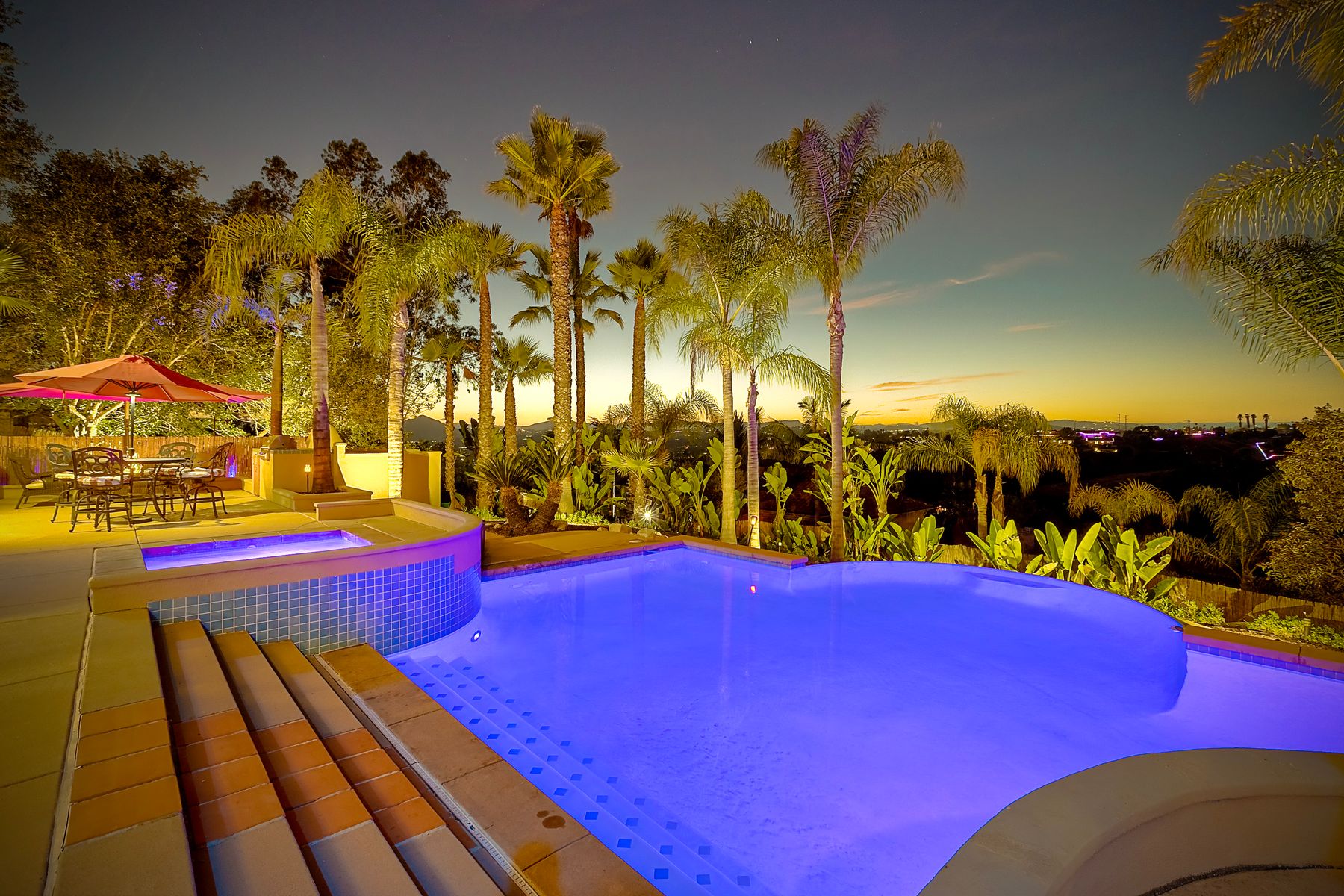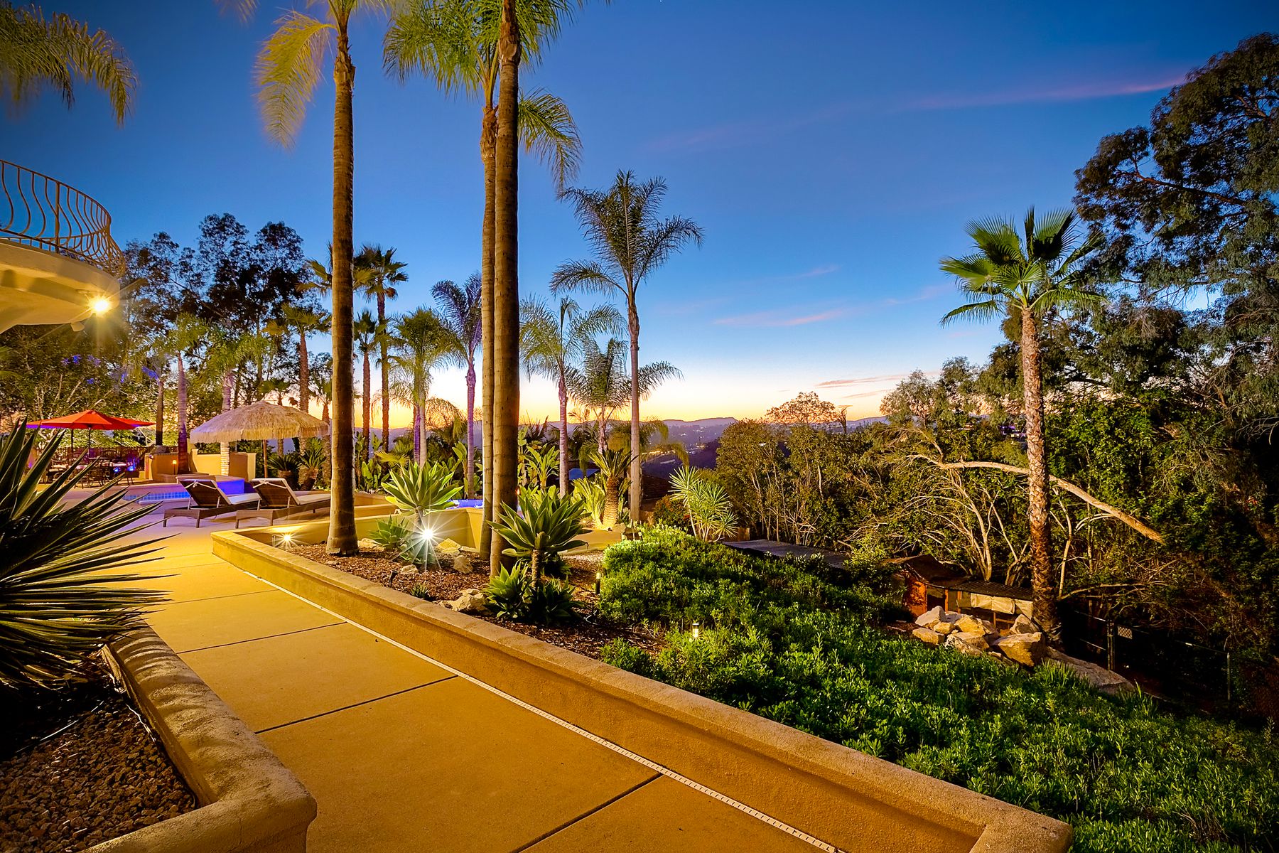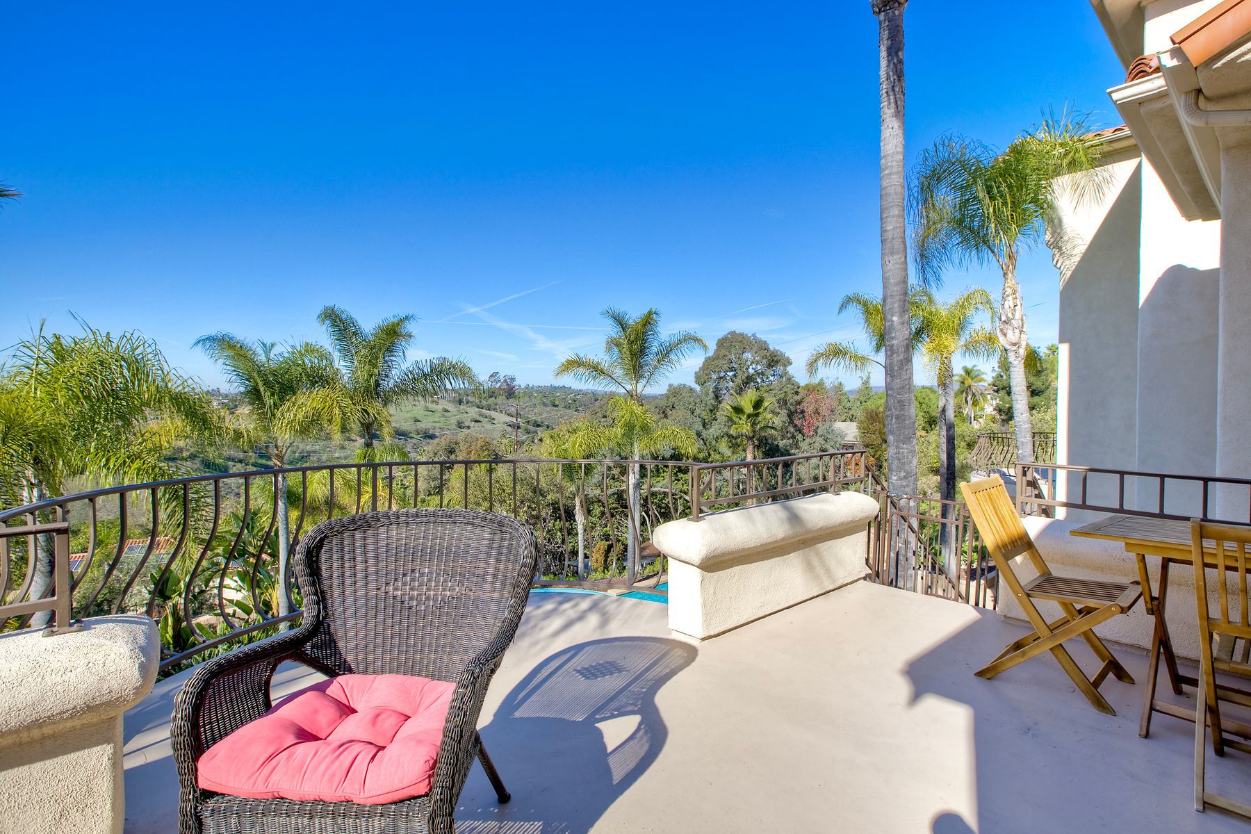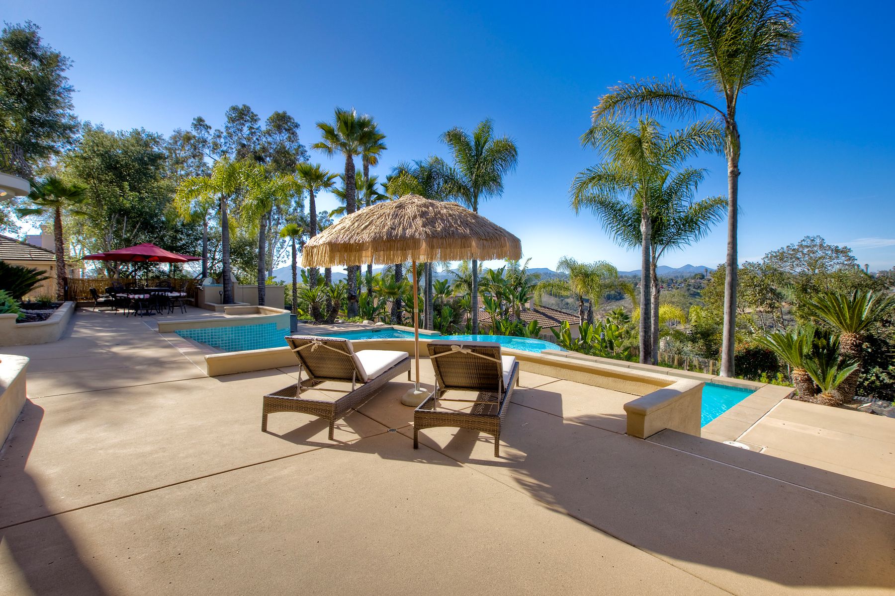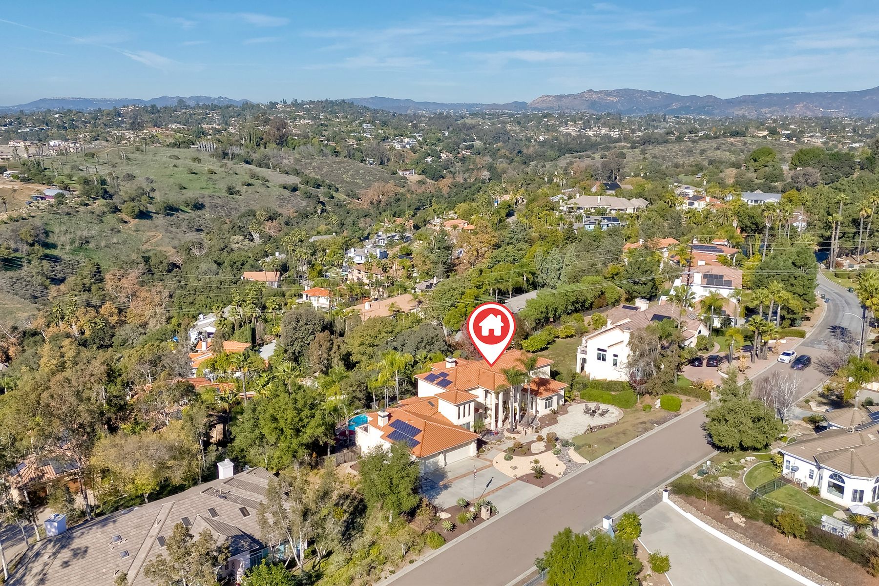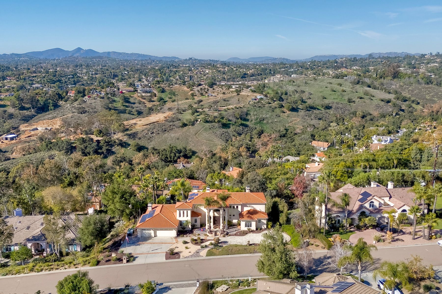 This Canyon View Estates home is situated on a ½-acre elevated premium lot, offering breathtaking panoramic sunset views. With over $250,000 in upgrades, this meticulously maintained residence is truly move-in ready. Notable improvements include a 27-panel owned solar system installed in 2018, newer windows, a new dual-fuel heat pump and air conditioning system, and new roof tiles and underlayment with added bird stops and fire-resistant paper installed July 2025. Additional highlights include split mini heat/air units in the primary bedroom and garage, solar window tinting to reduce summer heat, drought-tolerant landscaping, plantation shutters, travertine and hardwood flooring, granite countertops, a built-in refrigerator, wainscoting, and three fireplaces with glass doors. The home also features electric solar fabric blinds on rear windows, an awning over the kitchen deck, a bonus loft/office area, and a spacious triple garage with quiet motors and MyQ remote access. All garage doors are insulated. Upon entry, you’re greeted by soaring 19-foot ceilings, expansive living spaces, and large picture windows that flood the home with natural light. The primary suite is a true retreat, featuring vaulted ceilings with exposed beams, a dual-sided fireplace, private view balcony, generous walk-in closet, dual vanities, soaking tub, and a walk-in shower with frameless glass enclosure. The backyard is designed for resort-style living, showcasing a vanishing-edge salt water pool and spa, lush tropical landscaping, built-in barbecue, and expansive deck areas ideal for entertaining or relaxing. A downstairs bathroom provides convenient access for poolside enjoyment. Additional features include a fully wired alarm system, smart smoke detectors, and numerous smart-home upgrades throughout. Canyon View Estates is highly sought after for its scenic views, rolling topography, and generous lot sizes. Ideally located near Orfila Winery, San Diego Zoo Safari Park, Vineyards Golf Course, Lake Hodges, Kit Carson Park, shopping, and freeway access. Assigned schools include L.R. Green Elementary, Bear Valley Middle School, and San Pasqual High School.
