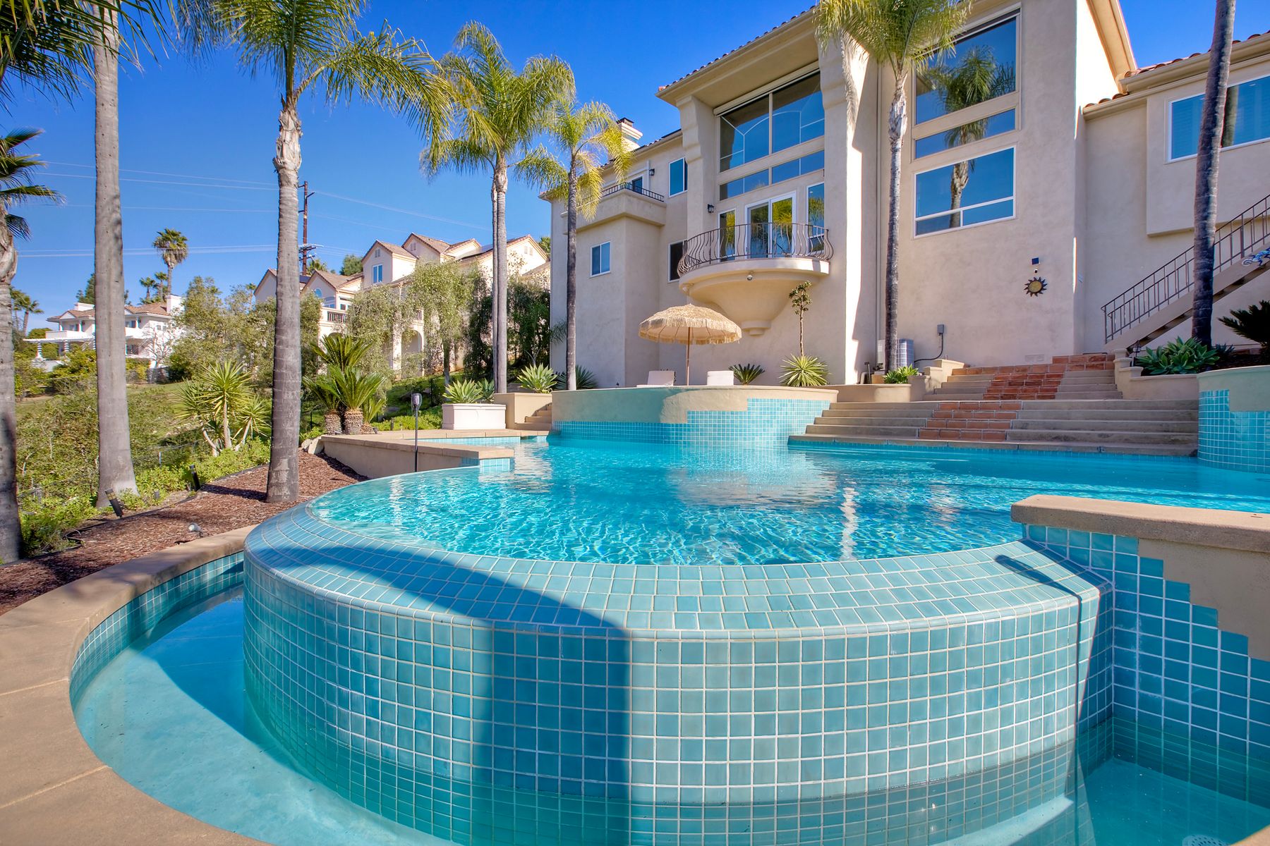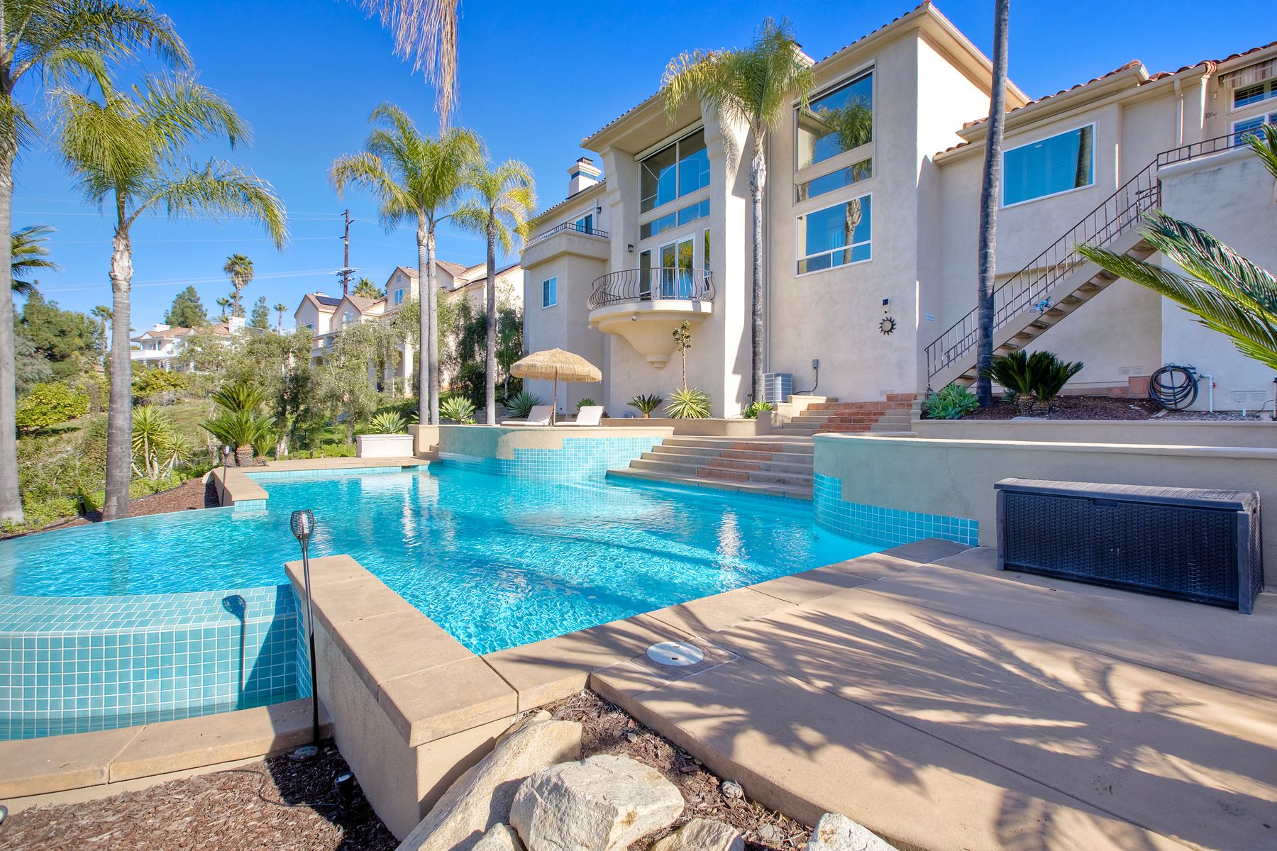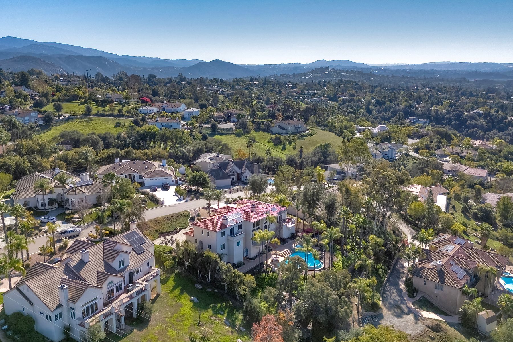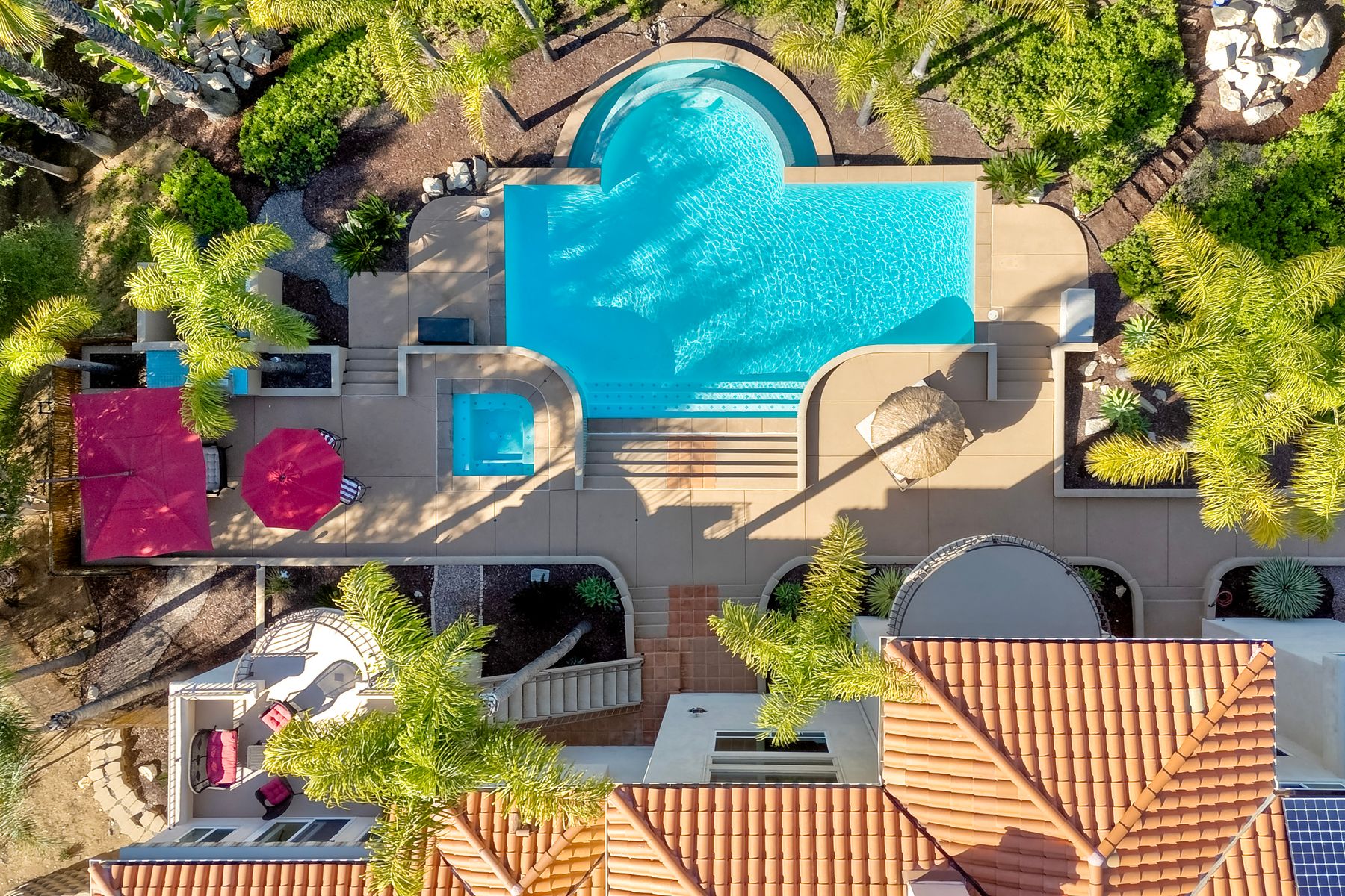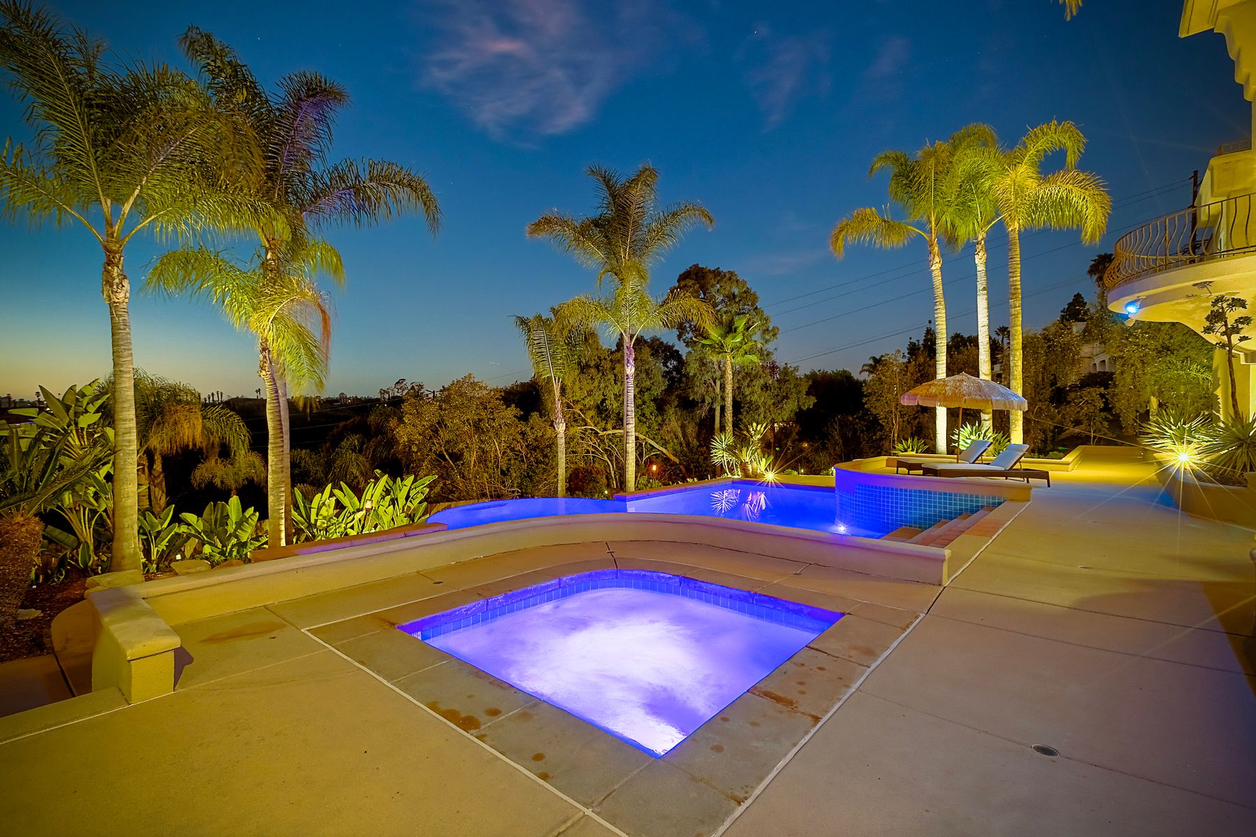 This Canyon View Estates home is situated on a ½-acre elevated premium lot, offering breathtaking panoramic sunset views. With over $250,000 in upgrades, this meticulously maintained residence is truly move-in ready. Notable improvements include a 27-panel owned solar system installed in 2018, newer windows, a new dual-fuel heat pump and air conditioning system, and new roof tiles and underlayment with added bird stops and fire-resistant paper installed July 2025. Additional highlights include split mini heat/air units in the primary bedroom and garage, solar window tinting to reduce summer heat, drought-tolerant landscaping, plantation shutters, travertine and hardwood flooring, granite countertops, a built-in refrigerator, wainscoting, and three fireplaces with glass doors. The home also features electric solar fabric blinds on rear windows, an awning over the kitchen deck, a bonus loft/office area, and a spacious triple garage with quiet motors and MyQ remote access. All garage doors are insulated. Upon entry, you’re greeted by soaring 19-foot ceilings, expansive living spaces, and large picture windows that flood the home with natural light. The primary suite is a true retreat, featuring vaulted ceilings with exposed beams, a dual-sided fireplace, private view balcony, generous walk-in closet, dual vanities, soaking tub, and a walk-in shower with frameless glass enclosure. The backyard is designed for resort-style living, showcasing a vanishing-edge salt water pool and spa, lush tropical landscaping, built-in barbecue, and expansive deck areas ideal for entertaining or relaxing. A downstairs bathroom provides convenient access for poolside enjoyment. Additional features include a fully wired alarm system, smart smoke detectors, and numerous smart-home upgrades throughout. Canyon View Estates is highly sought after for its scenic views, rolling topography, and generous lot sizes. Ideally located near Orfila Winery, San Diego Zoo Safari Park, Vineyards Golf Course, Lake Hodges, Kit Carson Park, shopping, and freeway access. Assigned schools include L.R. Green Elementary, Bear Valley Middle School, and San Pasqual High School.