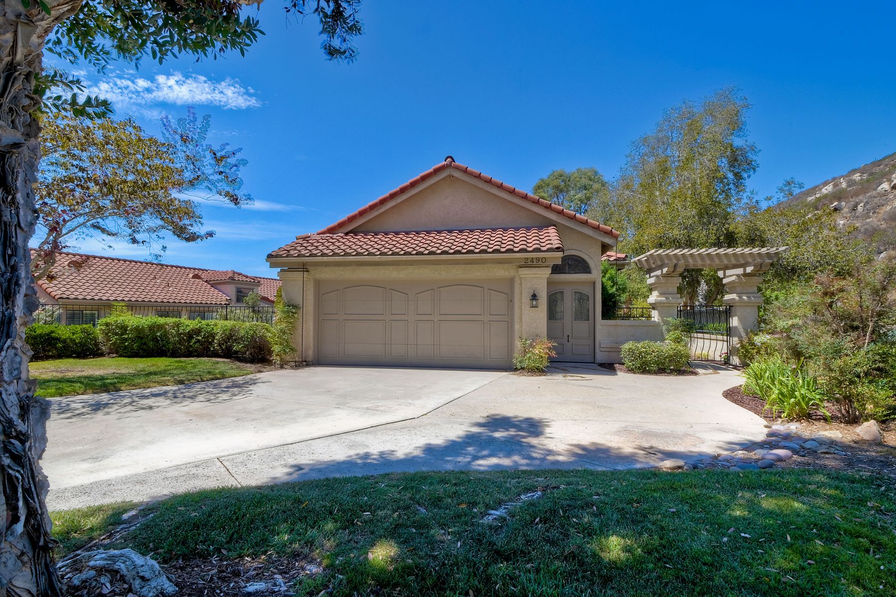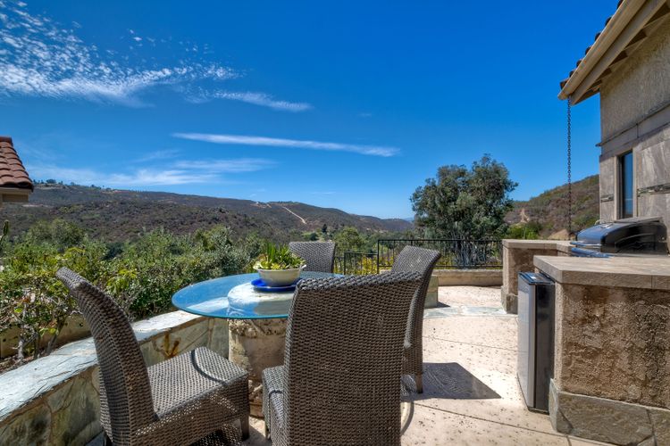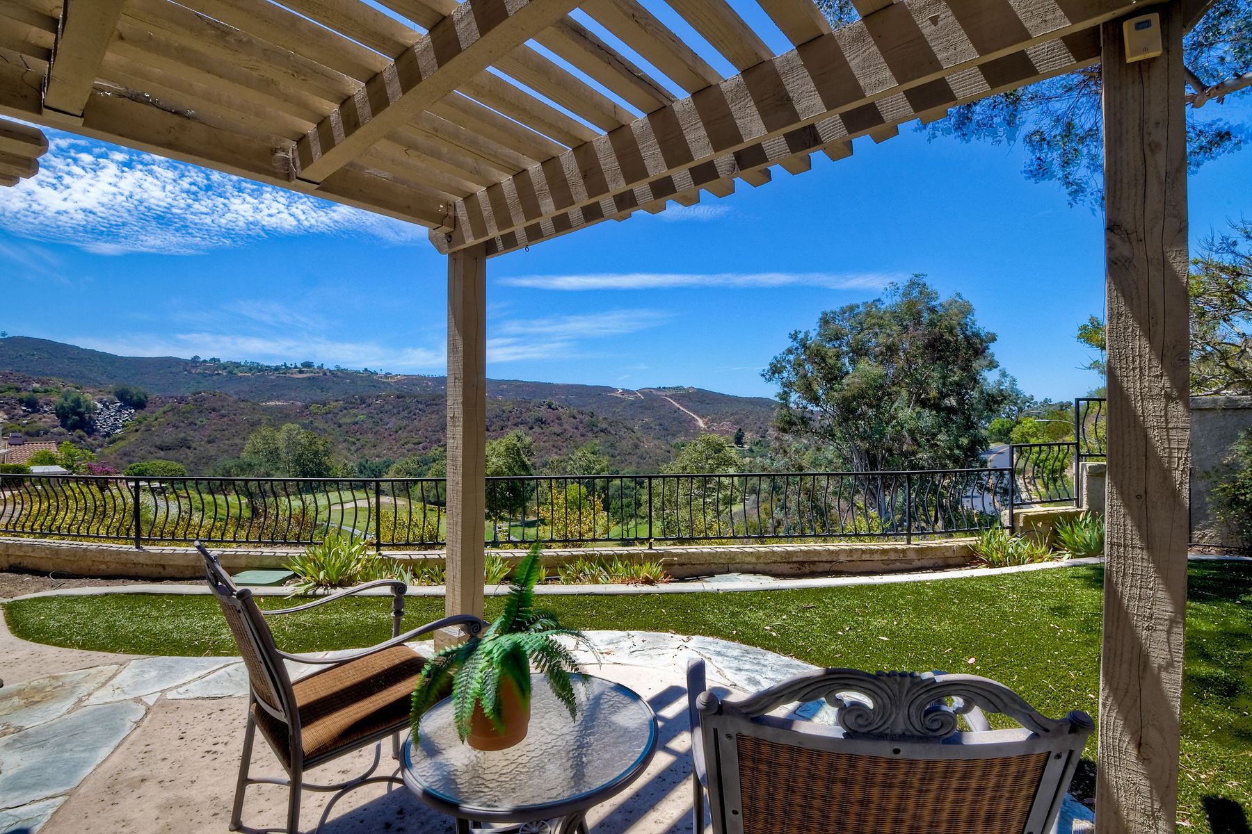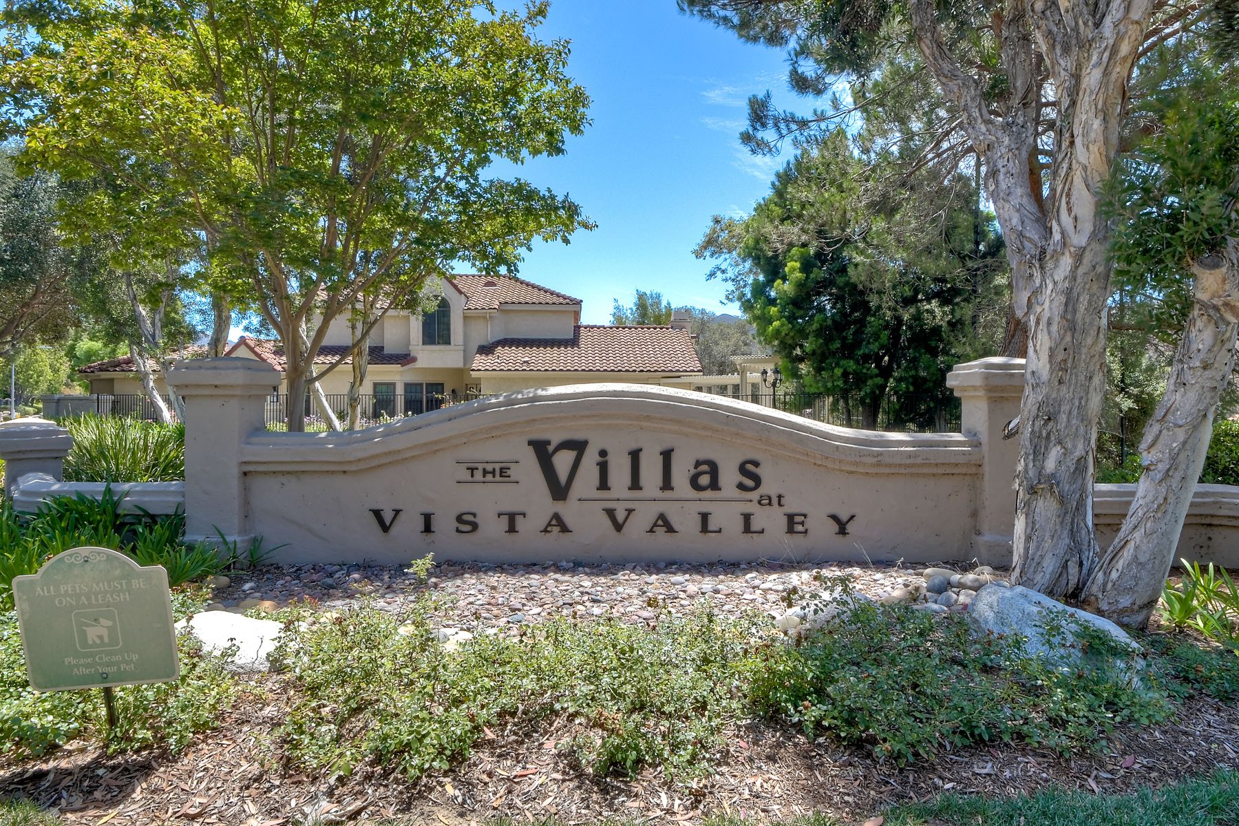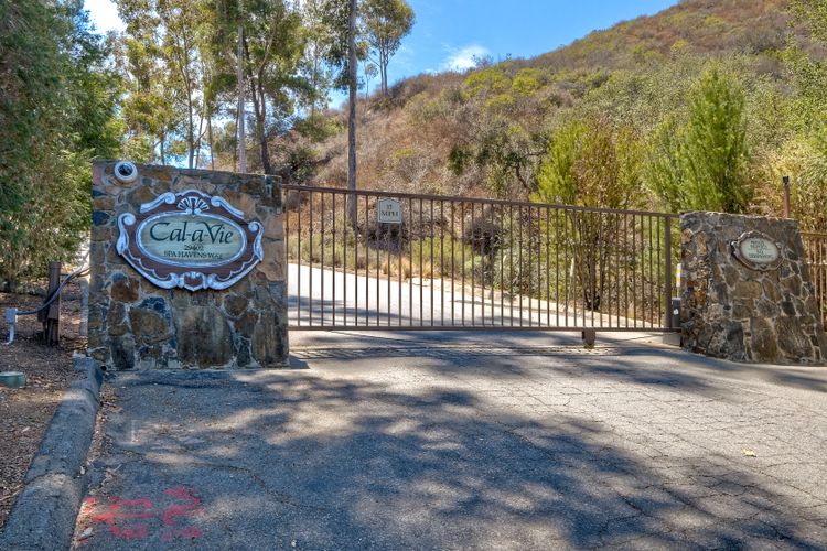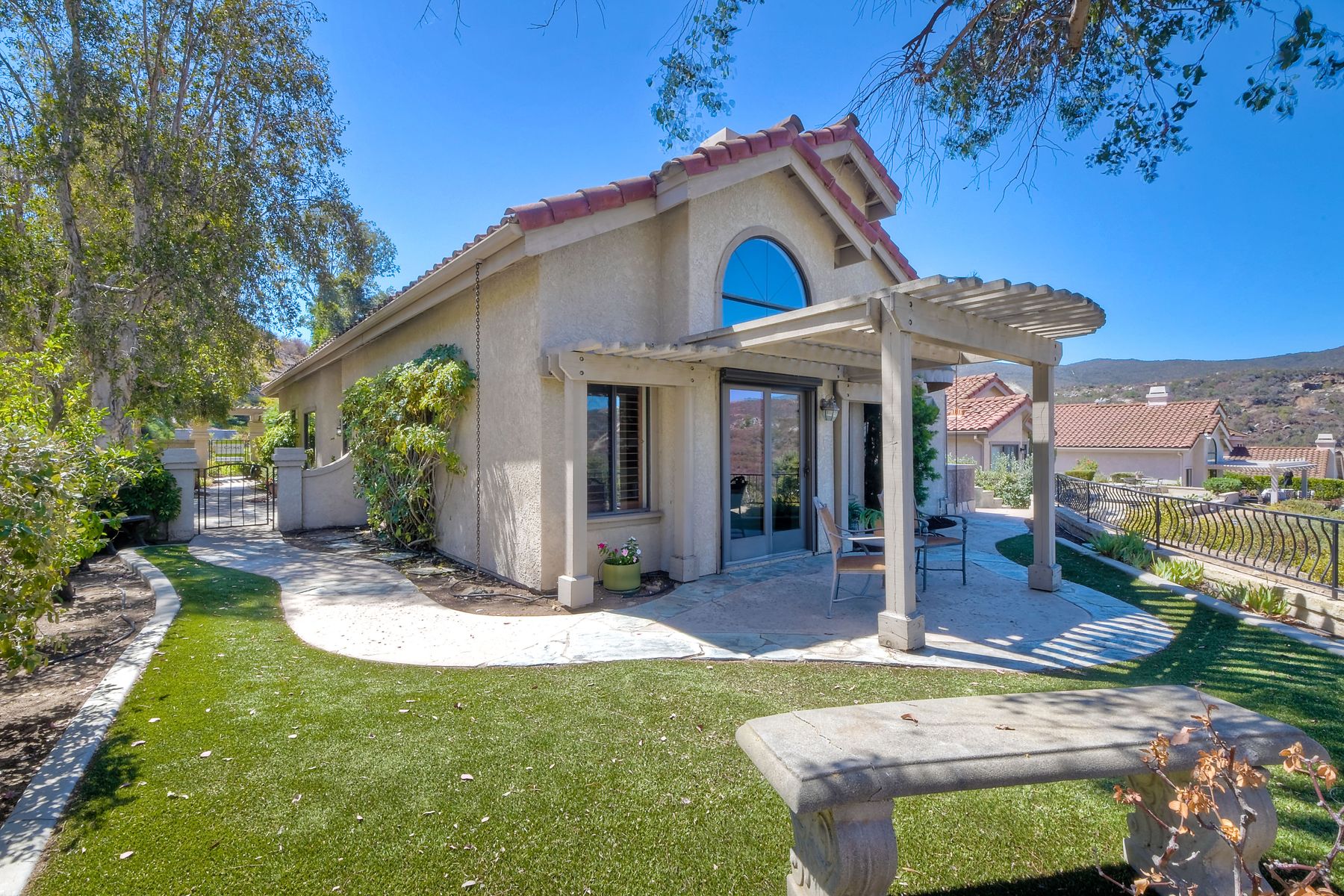 Located in the coveted gated golf community of Vista Valley Country Club, this 1730sf, 2 Bedroom, 2 Bath + Office, 2-car + Golf Cart Garage, one-level home, is situated on a quiet, corner lot with inspiring golf course and mountain VIEWS overlooking the 3rd fairway in the Villas at Vista Valley. This well-cared for property needs a little TLC but has many great features including paid solar! Welcoming gated courtyard entrance. Vaulted ceilings with arched windows and open layout to Dining and Living Room with brick fireplace, sliding doors to back yard and wired for surround sound. Kitchen has granite counters, subway tile backsplash and stainless Kitchen Aid appliances with double oven, Bosch dishwasher. Master Suite has double French door entry, double sink vanity, large walk-in closet with built-ins, custom steam shower plus separate travertine shower. Large En-Suite Bedroom with private Bath. Separate Office with double French Door entry, floor-to-ceiling built-in shelves/cabinets and hardwood flooring. Plantation shutters throughout. Separate Laundry Room with cabinets. Garage has epoxy flooring, golf cart garage, built-in cabinets and overhead storage. Whole house water filtration system and central vacuum. Exterior features include custom in-ground spa, outdoor TV, built-in BBQ, new mini-fridge, custom awnings and pergola over back yard patio with VIEWS! Community pool just across the street! Vista Valley Country Club is a championship golf course with newly renovated club house offering several membership options to include amenities - gym, pickleball, exercise and steam room, spa, classes and community activities with varying golf privileges whether for the avid golfer or just enjoying social gatherings. Just a few minutes to the 15 freeway. This property is perfect for relaxed living or weekend get-away! Won’t last long!