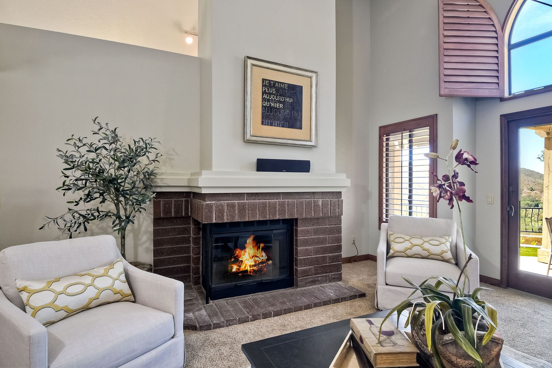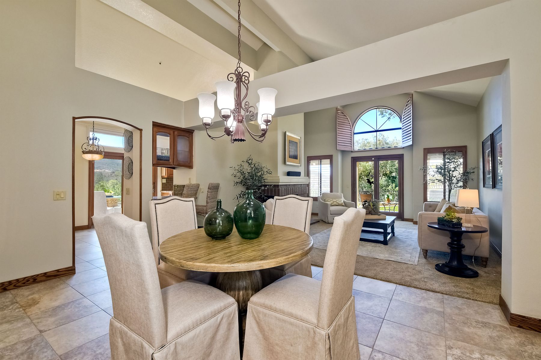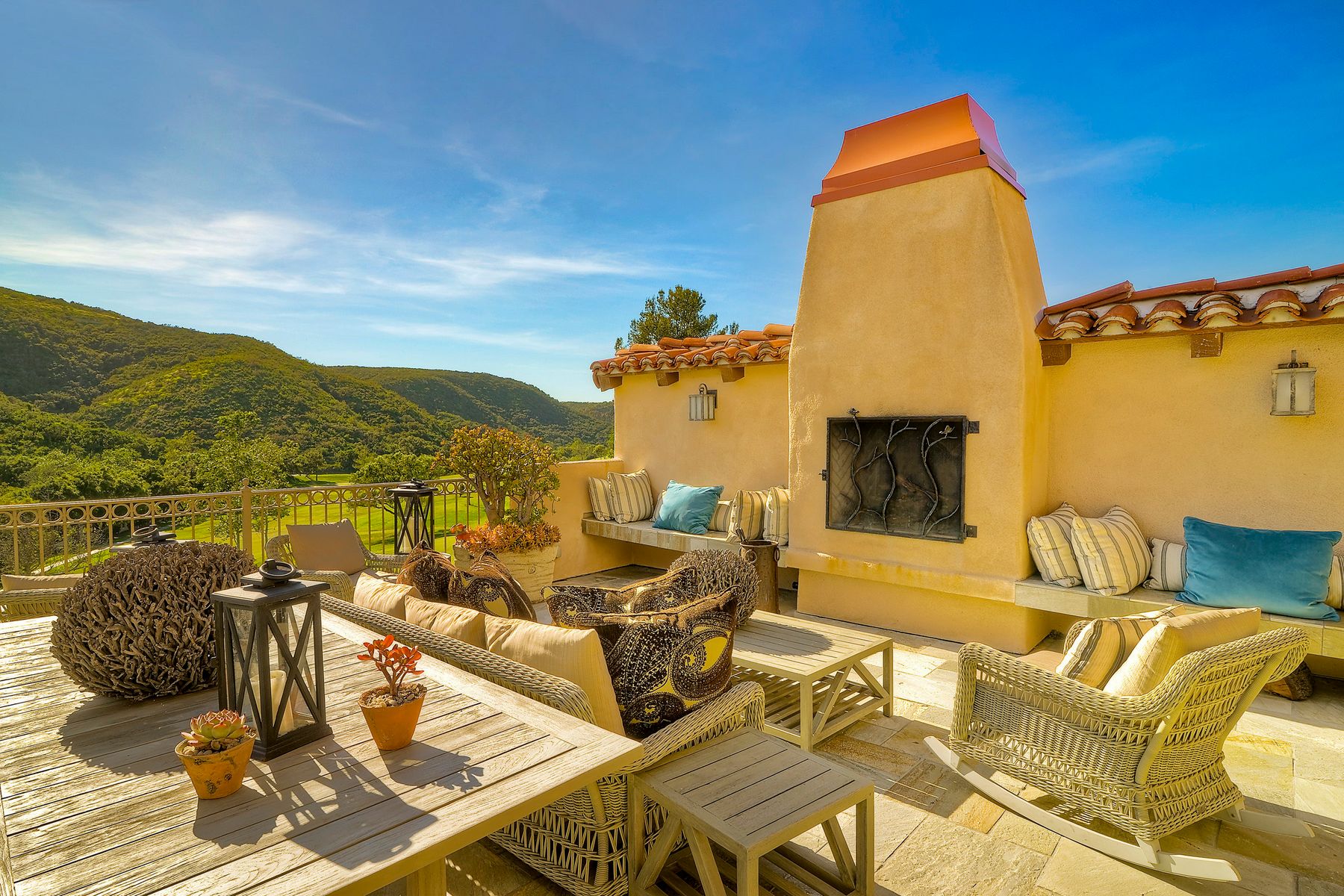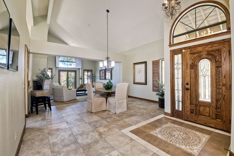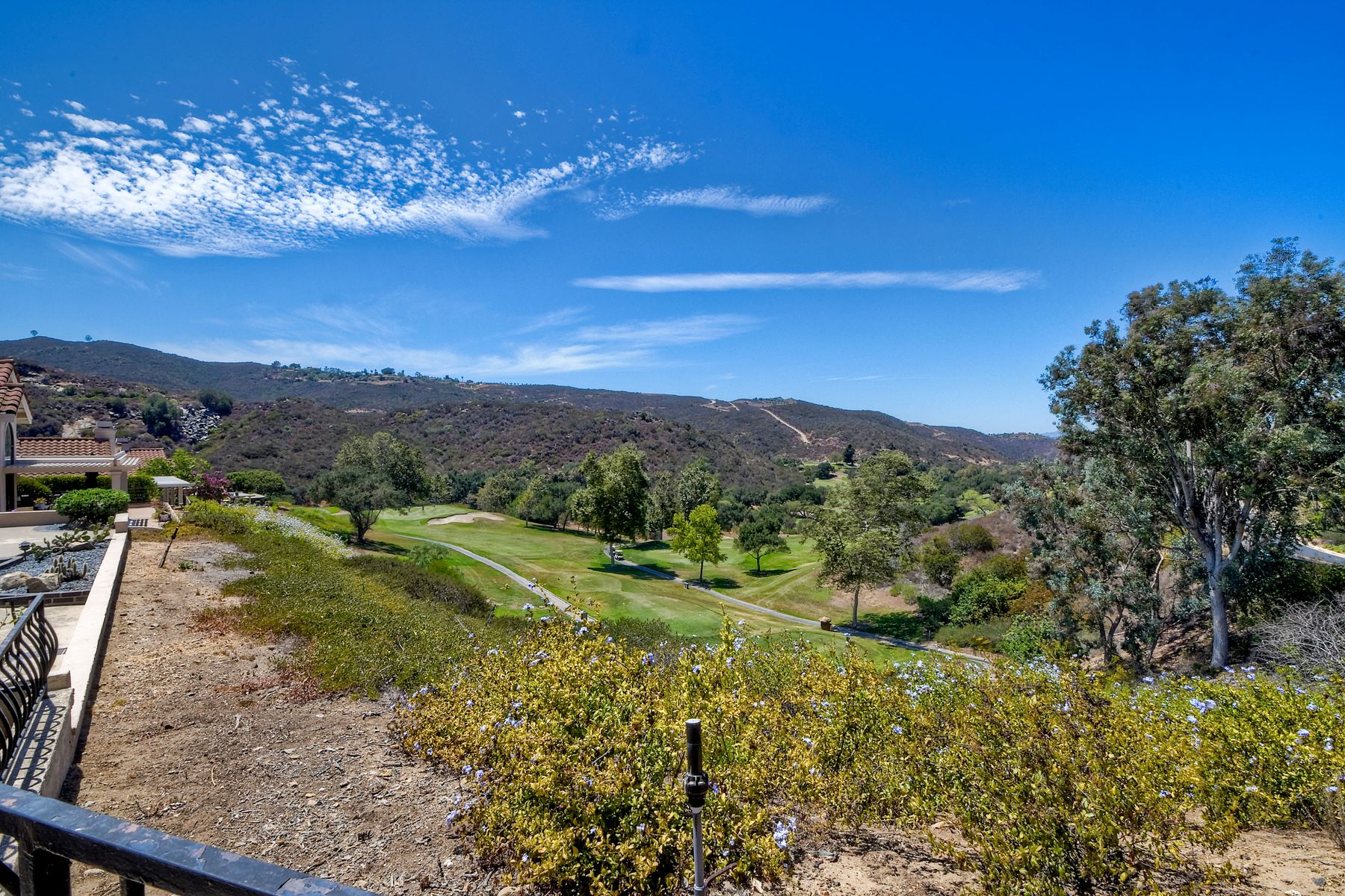 Located in the coveted gated golf community of Vista Valley Country Club, this 1730sf, 2 Bedroom, 2 Bath + Office, 2-car + Golf Cart Garage, one-level home, is situated on a quiet, corner lot with inspiring golf course and mountain VIEWS overlooking the 3rd fairway in the Villas at Vista Valley. This well-cared for property needs a little TLC but has many great features including paid solar! Welcoming gated courtyard entrance. Vaulted ceilings with arched windows and open layout to Dining and Living Room with brick fireplace, sliding doors to back yard and wired for surround sound. Kitchen has granite counters, subway tile backsplash and stainless Kitchen Aid appliances with double oven, Bosch dishwasher. Master Suite has double French door entry, double sink vanity, large walk-in closet with built-ins, custom steam shower plus separate travertine shower. Large En-Suite Bedroom with private Bath. Separate Office with double French Door entry, floor-to-ceiling built-in shelves/cabinets and hardwood flooring. Plantation shutters throughout. Separate Laundry Room with cabinets. Garage has epoxy flooring, golf cart garage, built-in cabinets and overhead storage. Whole house water filtration system and central vacuum. Exterior features include custom in-ground spa, outdoor TV, built-in BBQ, new mini-fridge, custom awnings and pergola over back yard patio with VIEWS! Community pool just across the street! Vista Valley Country Club is a championship golf course with newly renovated club house offering several membership options to include amenities - gym, pickleball, exercise and steam room, spa, classes and community activities with varying golf privileges whether for the avid golfer or just enjoying social gatherings. Just a few minutes to the 15 freeway. This property is perfect for relaxed living or weekend get-away! Won’t last long!
