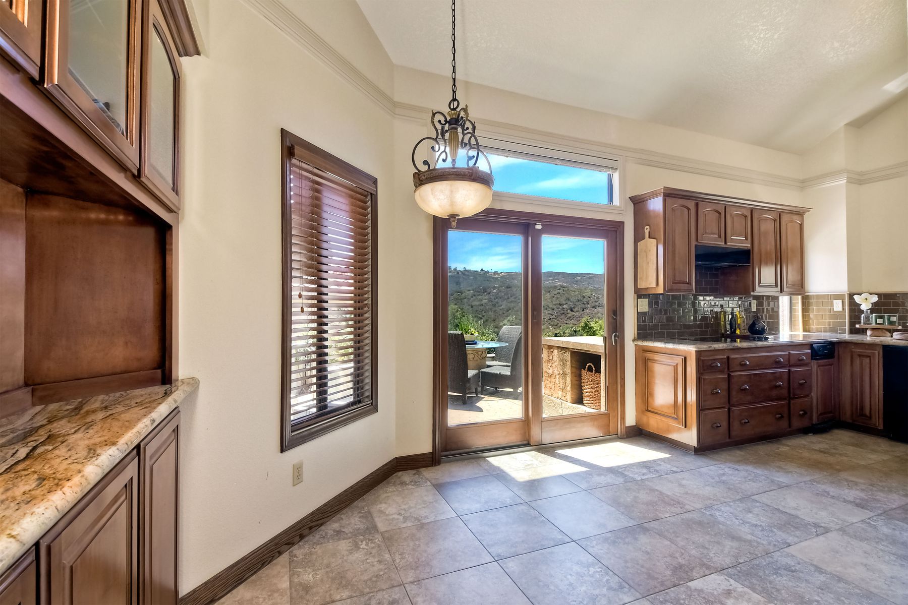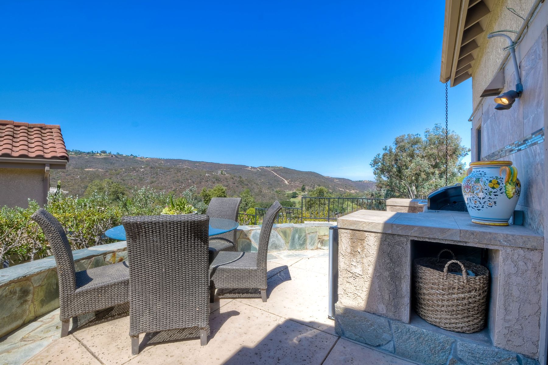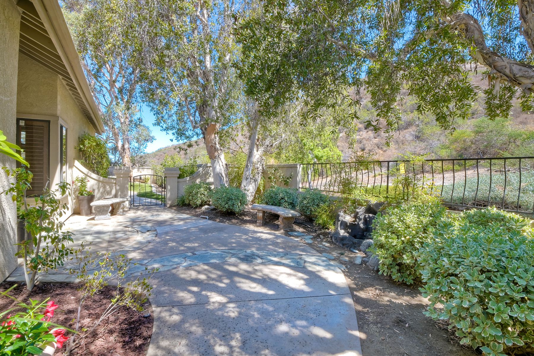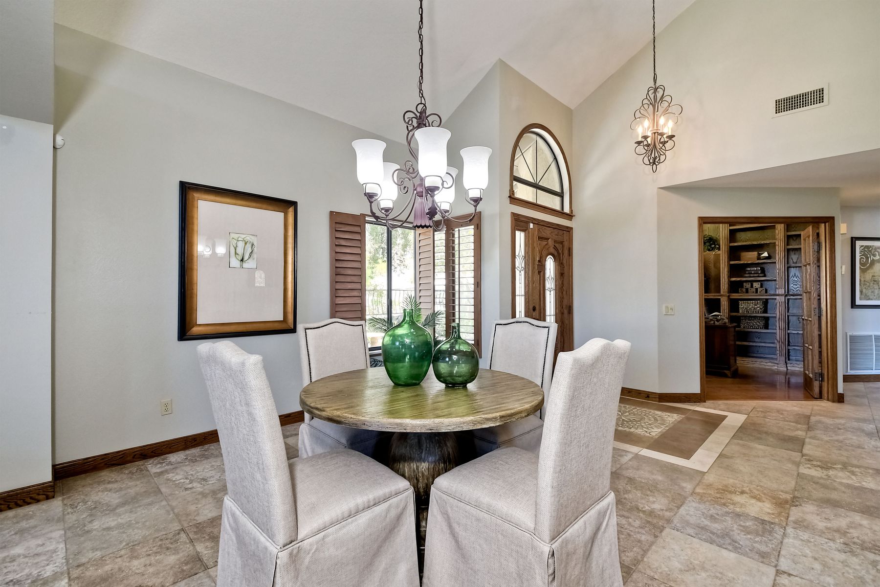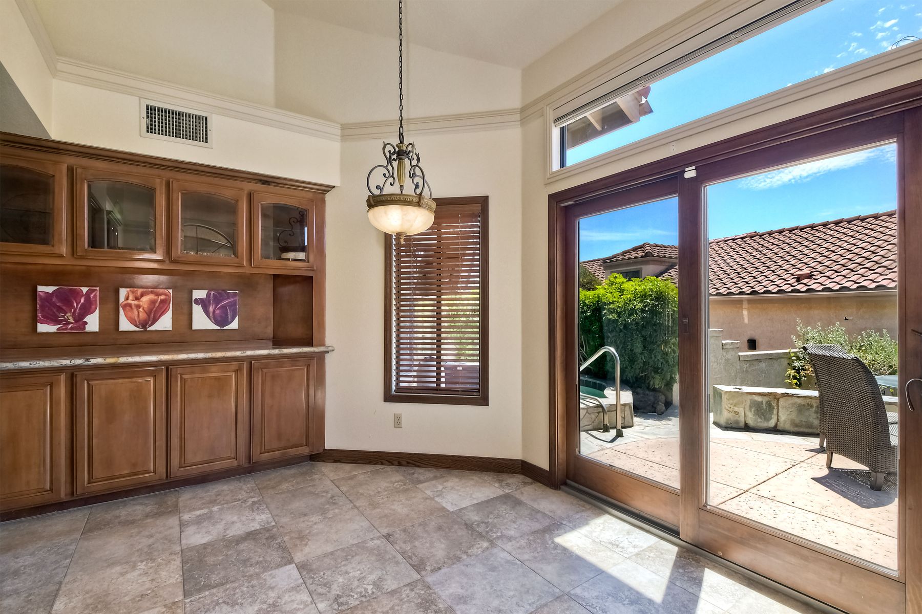 Located in the coveted gated golf community of Vista Valley Country Club, this 1730sf, 2 Bedroom, 2 Bath + Office, 2-car + Golf Cart Garage, one-level home, is situated on a quiet, corner lot with inspiring golf course and mountain VIEWS overlooking the 3rd fairway in the Villas at Vista Valley. This well-cared for property needs a little TLC but has many great features including paid solar! Welcoming gated courtyard entrance. Vaulted ceilings with arched windows and open layout to Dining and Living Room with brick fireplace, sliding doors to back yard and wired for surround sound. Kitchen has granite counters, subway tile backsplash and stainless Kitchen Aid appliances with double oven, Bosch dishwasher. Master Suite has double French door entry, double sink vanity, large walk-in closet with built-ins, custom steam shower plus separate travertine shower. Large En-Suite Bedroom with private Bath. Separate Office with double French Door entry, floor-to-ceiling built-in shelves/cabinets and hardwood flooring. Plantation shutters throughout. Separate Laundry Room with cabinets. Garage has epoxy flooring, golf cart garage, built-in cabinets and overhead storage. Whole house water filtration system and central vacuum. Exterior features include custom in-ground spa, outdoor TV, built-in BBQ, new mini-fridge, custom awnings and pergola over back yard patio with VIEWS! Community pool just across the street! Vista Valley Country Club is a championship golf course with newly renovated club house offering several membership options to include amenities - gym, pickleball, exercise and steam room, spa, classes and community activities with varying golf privileges whether for the avid golfer or just enjoying social gatherings. Just a few minutes to the 15 freeway. This property is perfect for relaxed living or weekend get-away! Won’t last long!