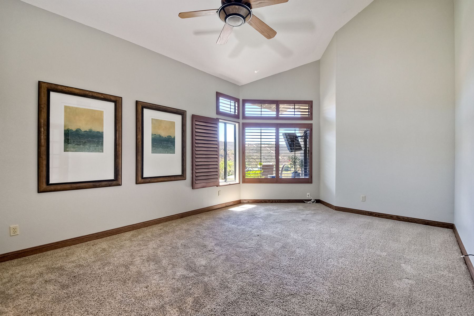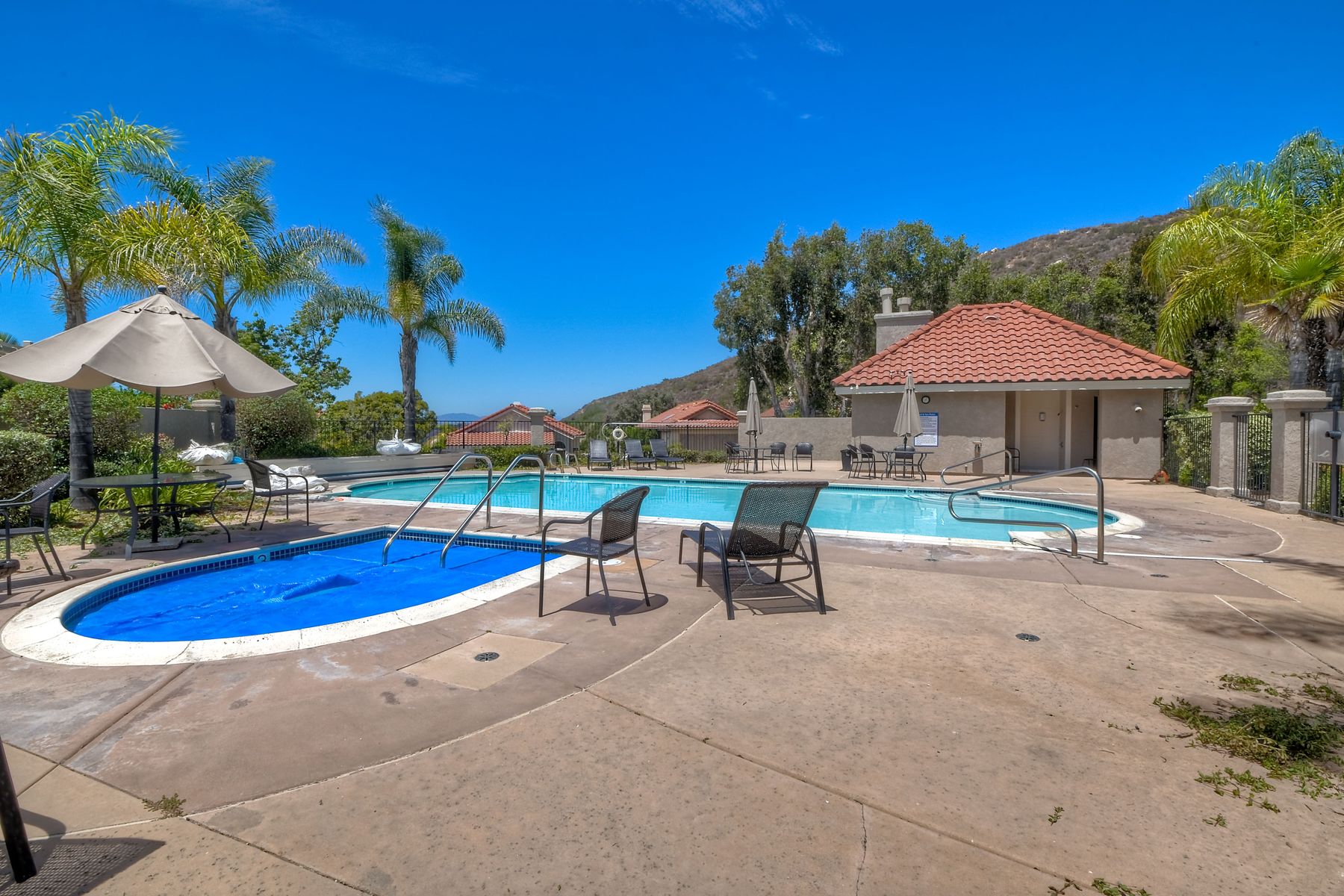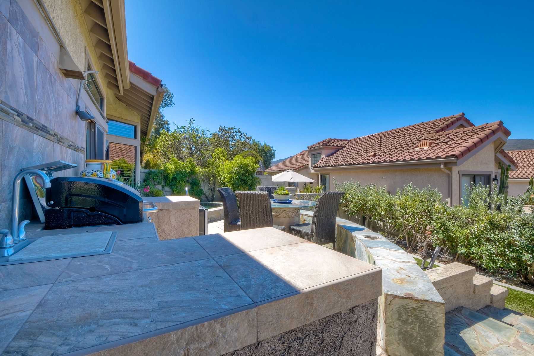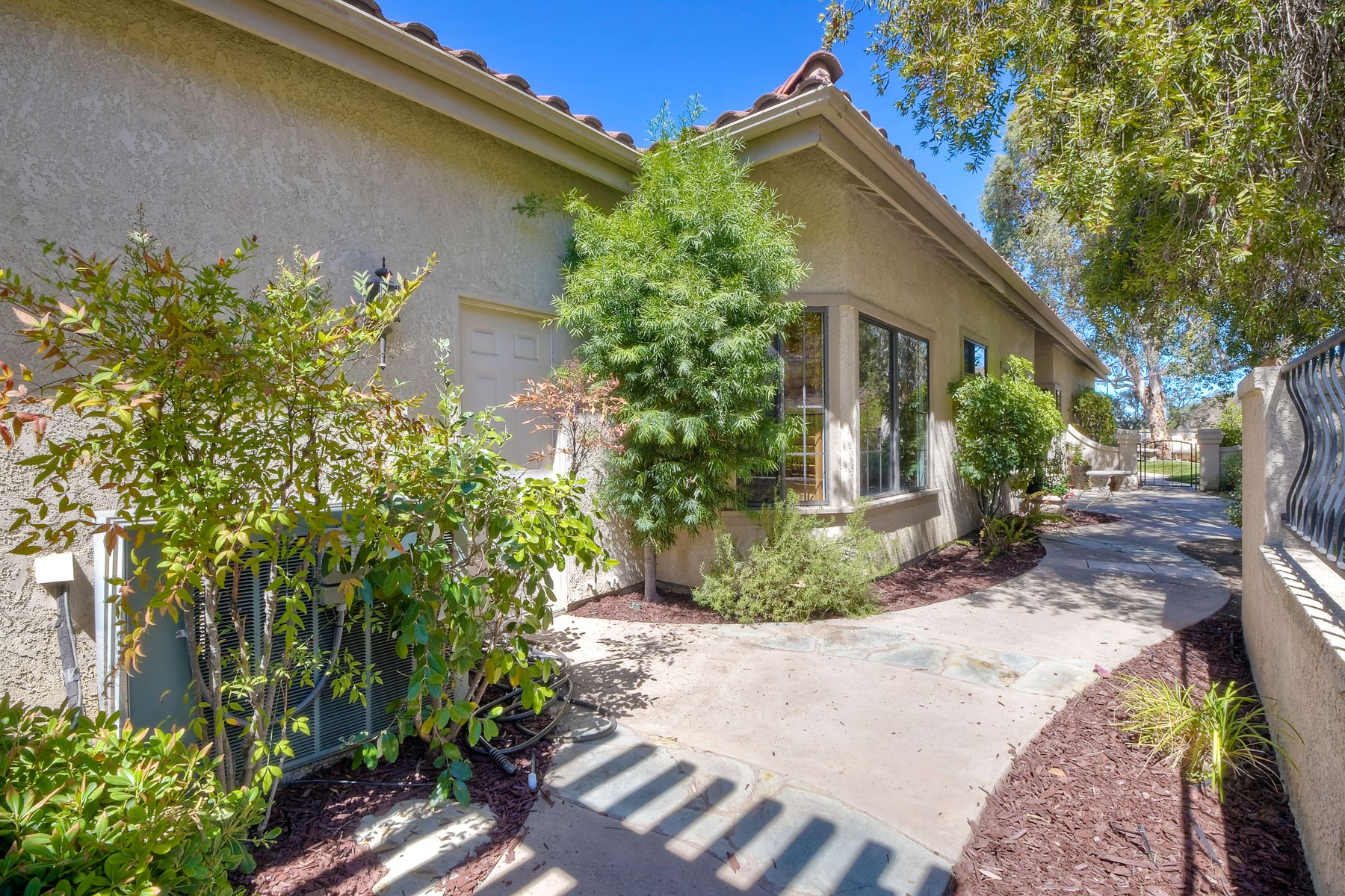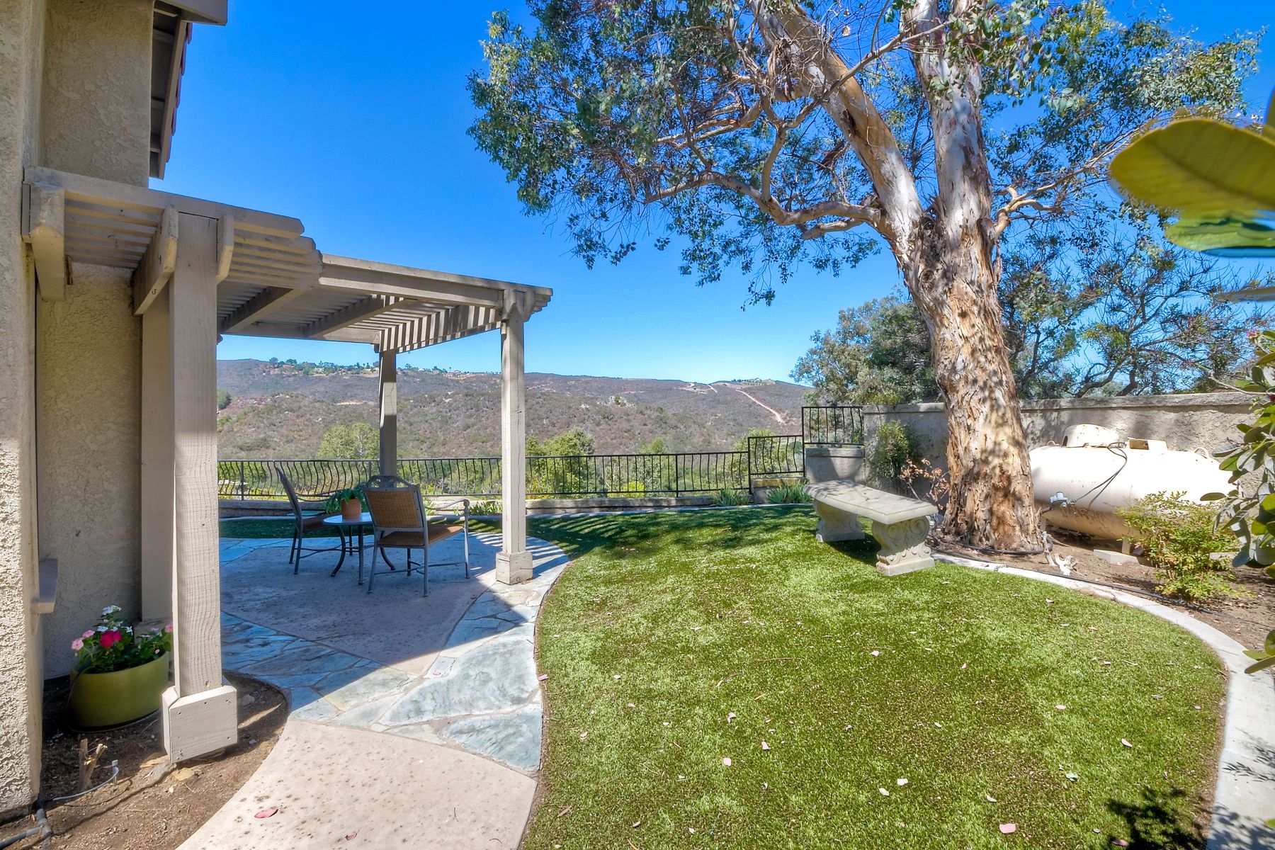 Located in the coveted gated golf community of Vista Valley Country Club, this 1730sf, 2 Bedroom, 2 Bath + Office, 2-car + Golf Cart Garage, one-level home, is situated on a quiet, corner lot with inspiring golf course and mountain VIEWS overlooking the 3rd fairway in the Villas at Vista Valley. This well-cared for property needs a little TLC but has many great features including paid solar! Welcoming gated courtyard entrance. Vaulted ceilings with arched windows and open layout to Dining and Living Room with brick fireplace, sliding doors to back yard and wired for surround sound. Kitchen has granite counters, subway tile backsplash and stainless Kitchen Aid appliances with double oven, Bosch dishwasher. Master Suite has double French door entry, double sink vanity, large walk-in closet with built-ins, custom steam shower plus separate travertine shower. Large En-Suite Bedroom with private Bath. Separate Office with double French Door entry, floor-to-ceiling built-in shelves/cabinets and hardwood flooring. Plantation shutters throughout. Separate Laundry Room with cabinets. Garage has epoxy flooring, golf cart garage, built-in cabinets and overhead storage. Whole house water filtration system and central vacuum. Exterior features include custom in-ground spa, outdoor TV, built-in BBQ, new mini-fridge, custom awnings and pergola over back yard patio with VIEWS! Community pool just across the street! Vista Valley Country Club is a championship golf course with newly renovated club house offering several membership options to include amenities - gym, pickleball, exercise and steam room, spa, classes and community activities with varying golf privileges whether for the avid golfer or just enjoying social gatherings. Just a few minutes to the 15 freeway. This property is perfect for relaxed living or weekend get-away! Won’t last long!