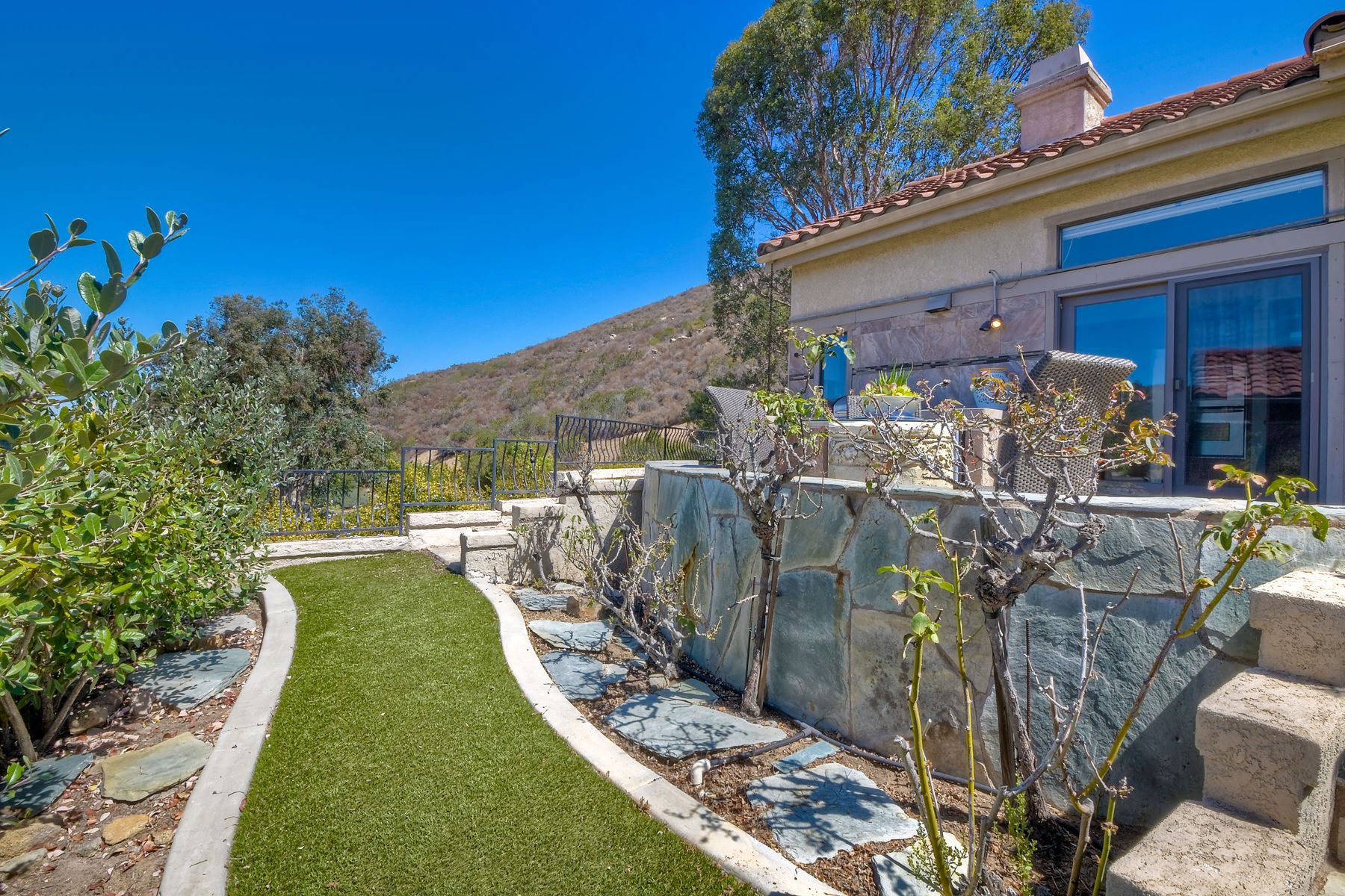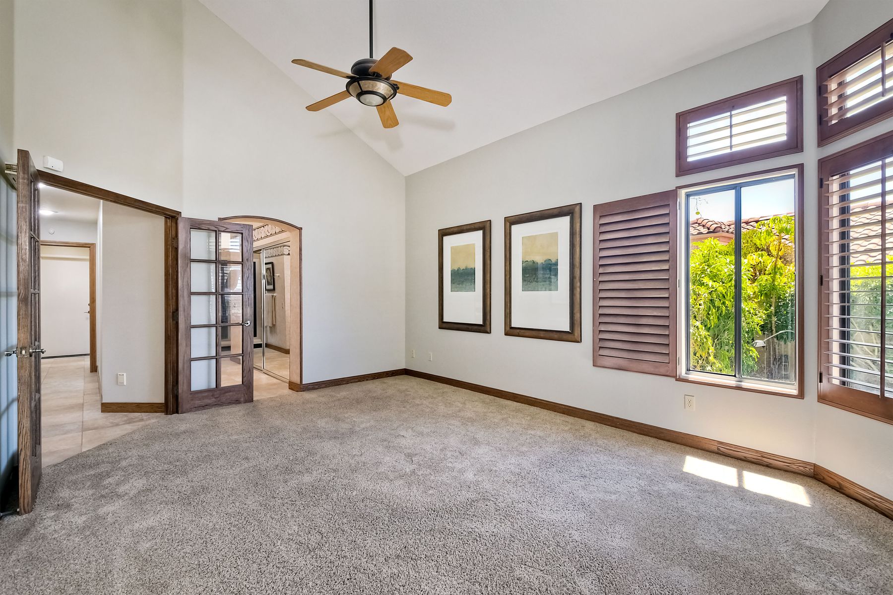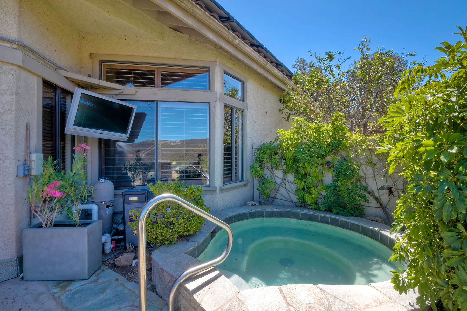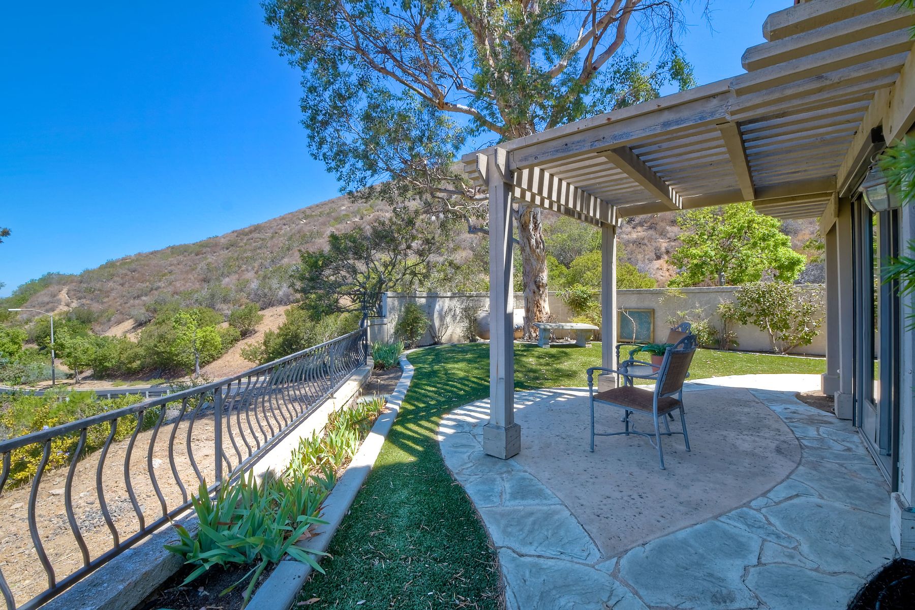 Located in the coveted gated golf community of Vista Valley Country Club, this 1730sf, 2 Bedroom, 2 Bath + Office, 2-car + Golf Cart Garage, one-level home, is situated on a quiet, corner lot with inspiring golf course and mountain VIEWS overlooking the 3rd fairway in the Villas at Vista Valley. This well-cared for property needs a little TLC but has many great features including paid solar! Welcoming gated courtyard entrance. Vaulted ceilings with arched windows and open layout to Dining and Living Room with brick fireplace, sliding doors to back yard and wired for surround sound. Kitchen has granite counters, subway tile backsplash and stainless Kitchen Aid appliances with double oven, Bosch dishwasher. Master Suite has double French door entry, double sink vanity, large walk-in closet with built-ins, custom steam shower plus separate travertine shower. Large En-Suite Bedroom with private Bath. Separate Office with double French Door entry, floor-to-ceiling built-in shelves/cabinets and hardwood flooring. Plantation shutters throughout. Separate Laundry Room with cabinets. Garage has epoxy flooring, golf cart garage, built-in cabinets and overhead storage. Whole house water filtration system and central vacuum. Exterior features include custom in-ground spa, outdoor TV, built-in BBQ, new mini-fridge, custom awnings and pergola over back yard patio with VIEWS! Community pool just across the street! Vista Valley Country Club is a championship golf course with newly renovated club house offering several membership options to include amenities - gym, pickleball, exercise and steam room, spa, classes and community activities with varying golf privileges whether for the avid golfer or just enjoying social gatherings. Just a few minutes to the 15 freeway. This property is perfect for relaxed living or weekend get-away! Won’t last long!