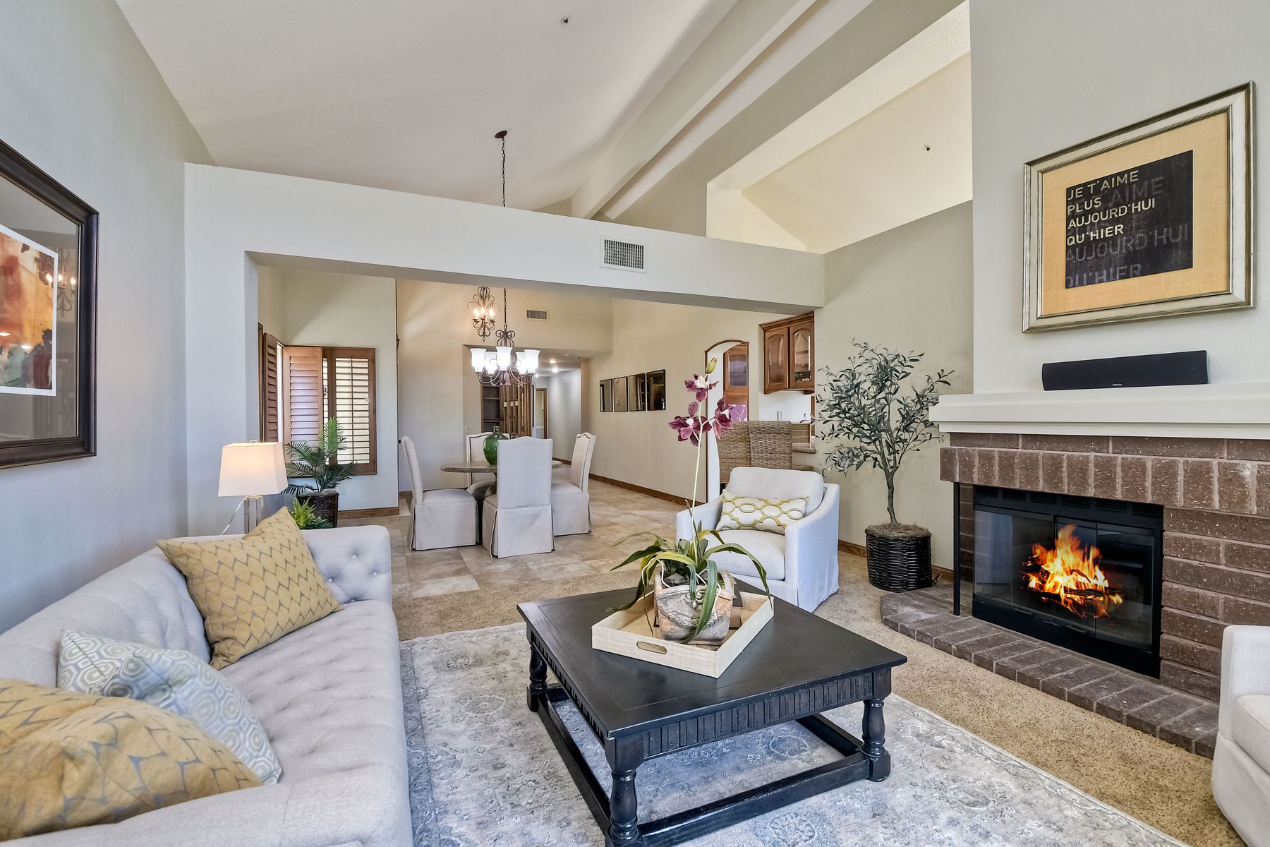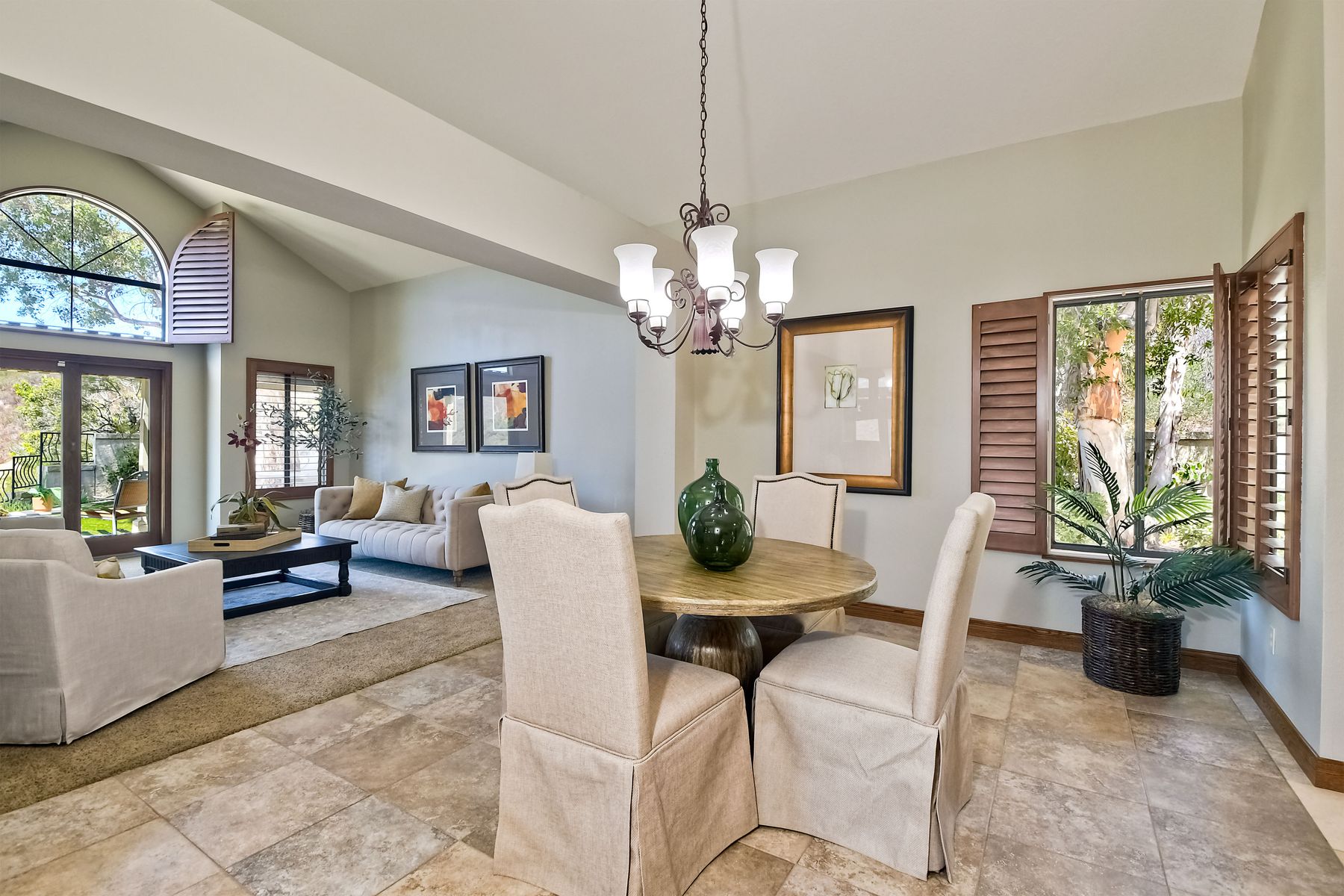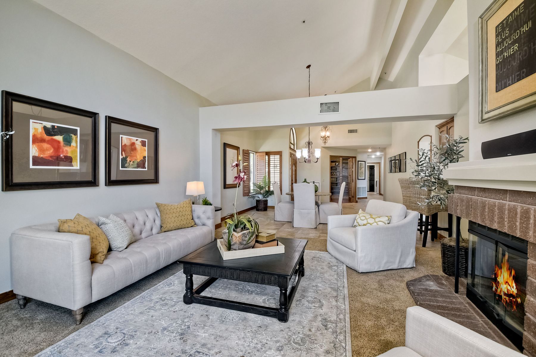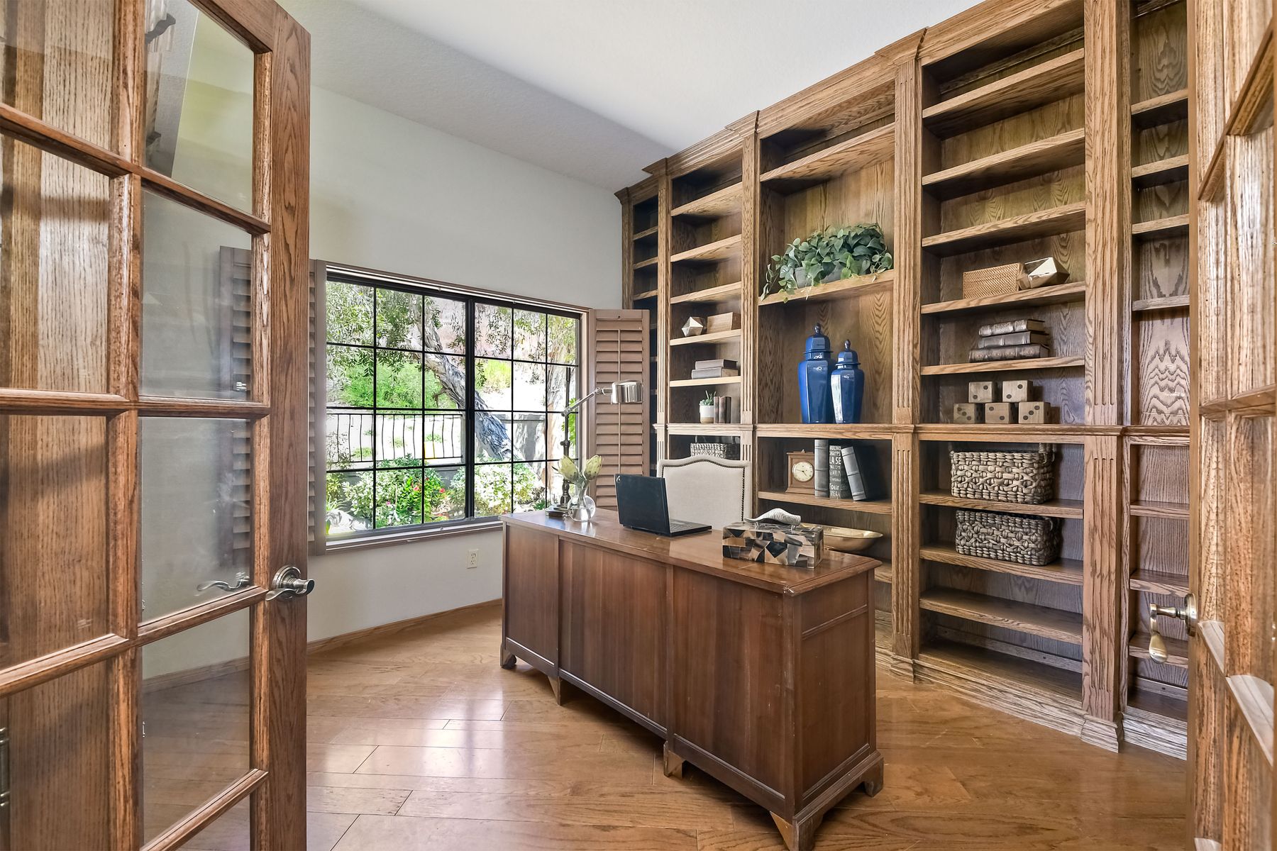Located in the coveted gated golf community of Vista Valley Country Club, this 1730sf, 2 Bedroom, 2 Bath + Office, 2-car + Golf Cart Garage, one-level home, is situated on a quiet, corner lot with inspiring golf course and mountain VIEWS overlooking the 3rd fairway in the Villas at Vista Valley. This well-cared for property needs a little TLC but has many great features including paid solar! Welcoming gated courtyard entrance. Vaulted ceilings with arched windows and open layout to Dining and Living Room with brick fireplace, sliding doors to back yard and wired for surround sound. Kitchen has granite counters, subway tile backsplash and stainless Kitchen Aid appliances with double oven, Bosch dishwasher. Master Suite has double French door entry, double sink vanity, large walk-in closet with built-ins, custom steam shower plus separate travertine shower. Large En-Suite Bedroom with private Bath. Separate Office with double French Door entry, floor-to-ceiling built-in shelves/cabinets and hardwood flooring. Plantation shutters throughout. Separate Laundry Room with cabinets. Garage has epoxy flooring, golf cart garage, built-in cabinets and overhead storage. Whole house water filtration system and central vacuum. Exterior features include custom in-ground spa, outdoor TV, built-in BBQ, new mini-fridge, custom awnings and pergola over back yard patio with VIEWS! Community pool just across the street! Vista Valley Country Club is a championship golf course with newly renovated club house offering several membership options to include amenities - gym, pickleball, exercise and steam room, spa, classes and community activities with varying golf privileges whether for the avid golfer or just enjoying social gatherings. Just a few minutes to the 15 freeway. This property is perfect for relaxed living or weekend get-away! Won’t last long!